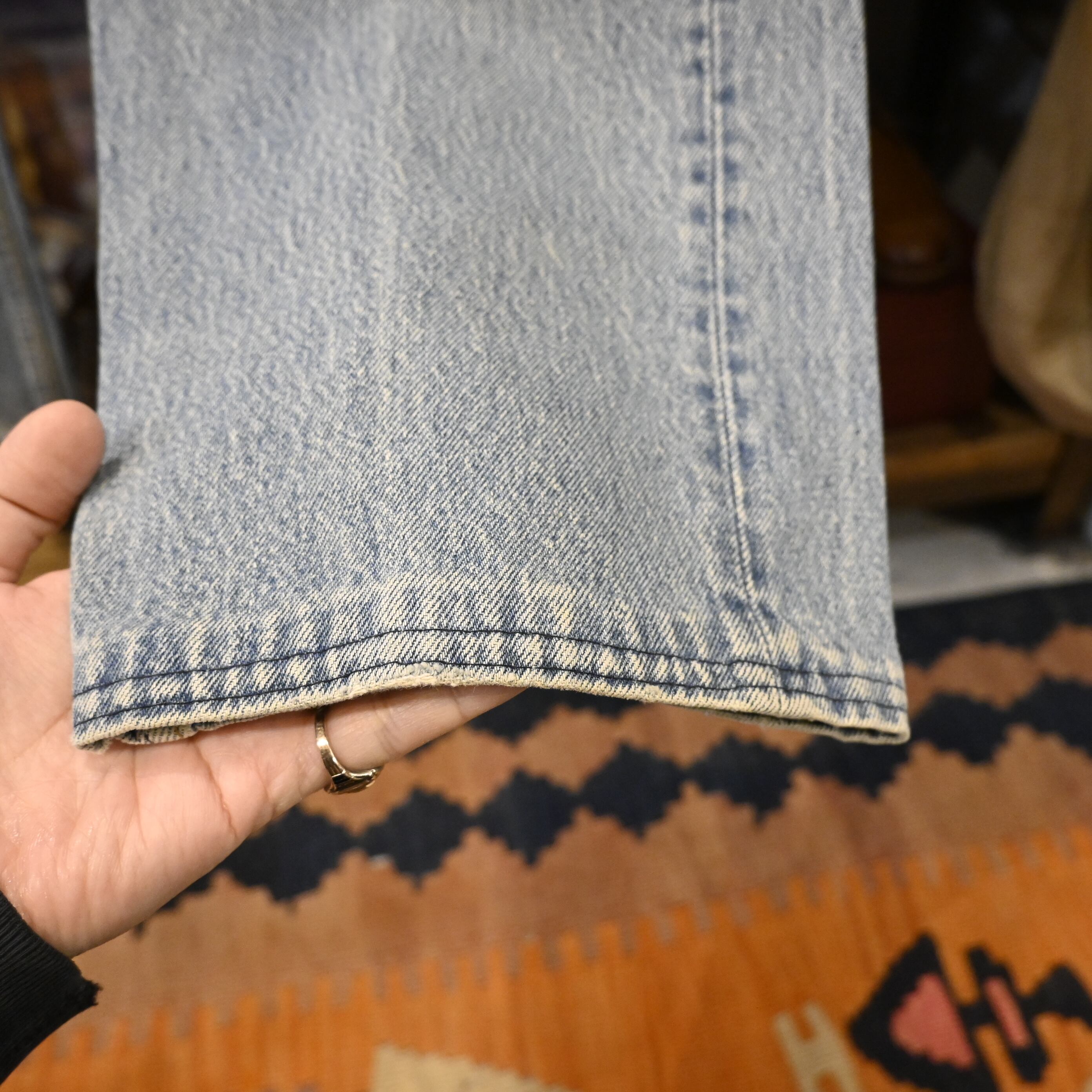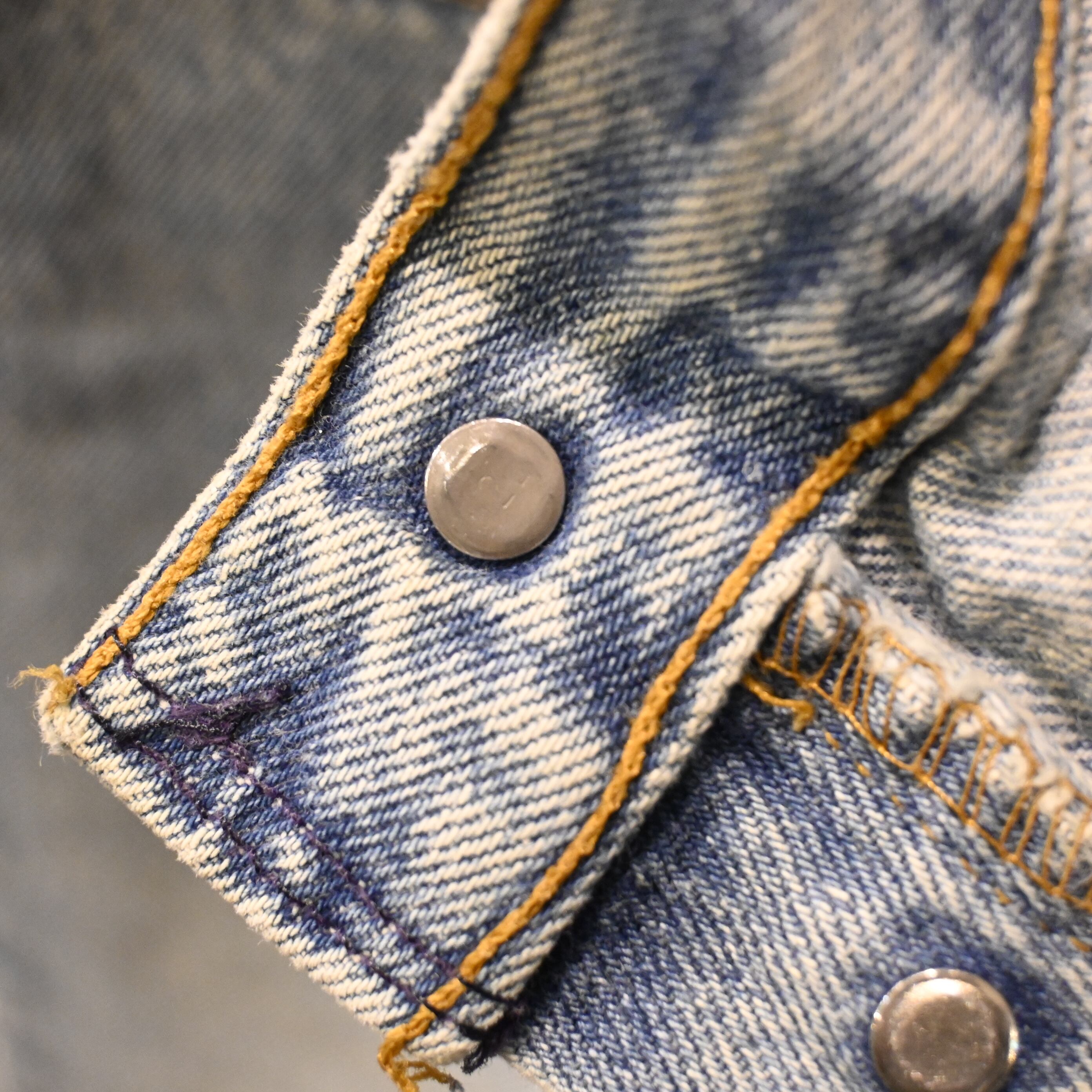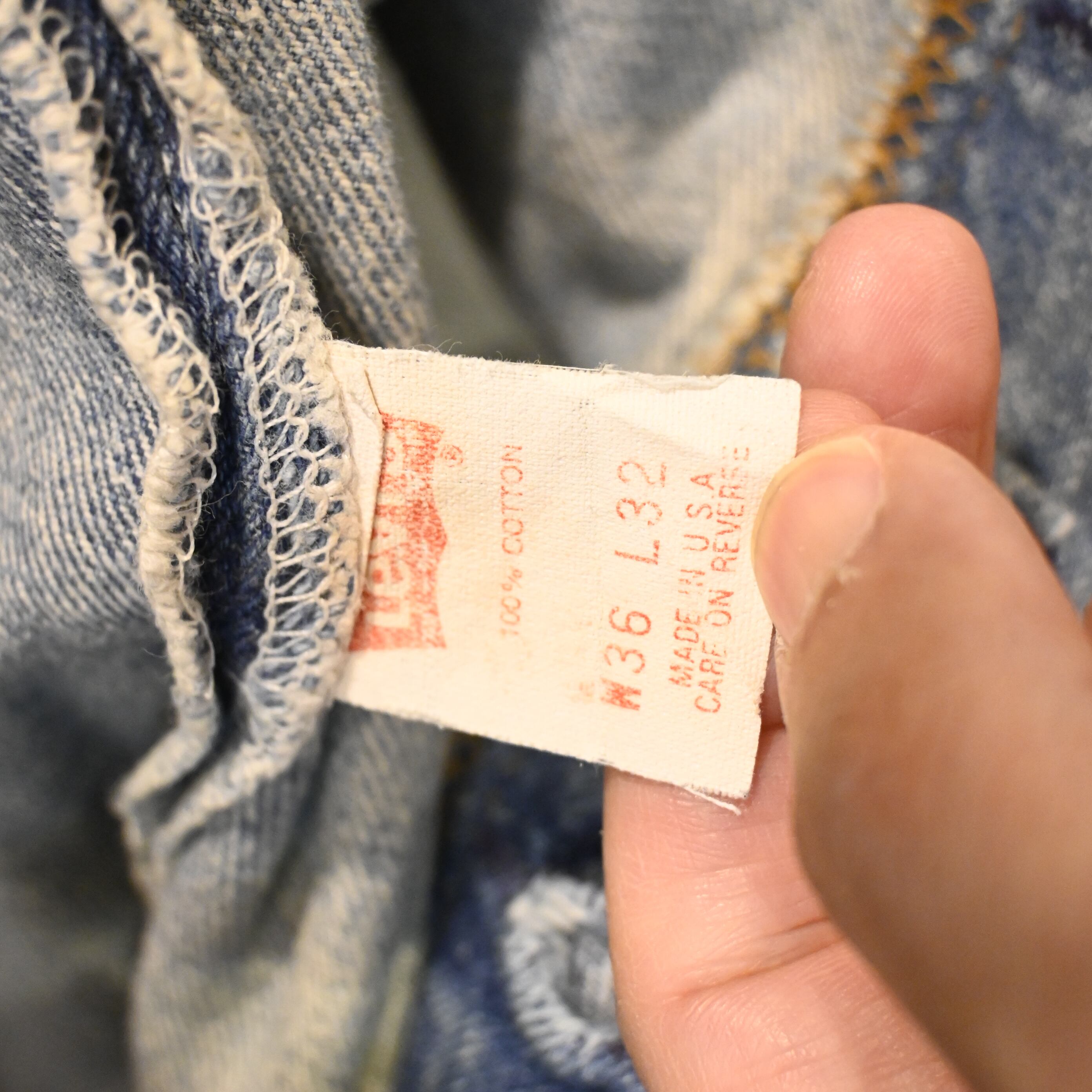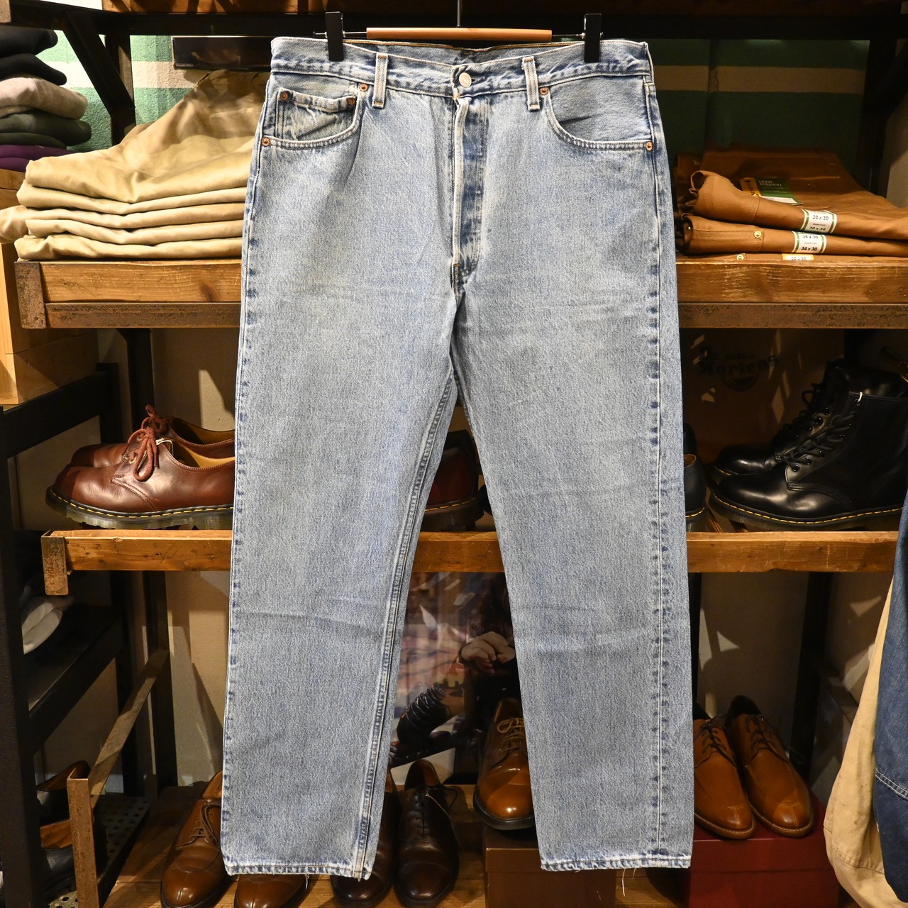 アメリカ製の501らしい無骨な表情と、全体に入った明るいライトブルーのフェードが魅力の一本です。