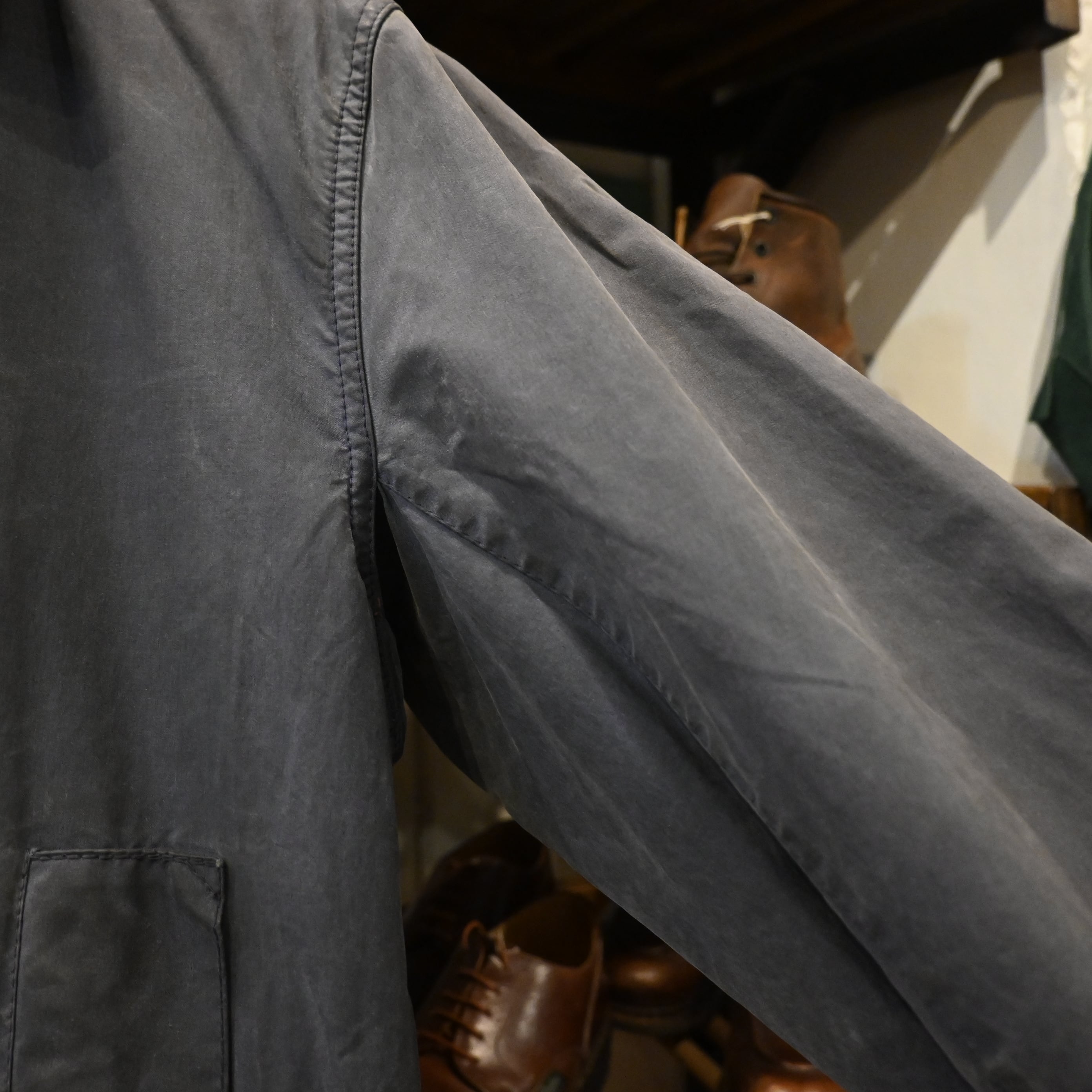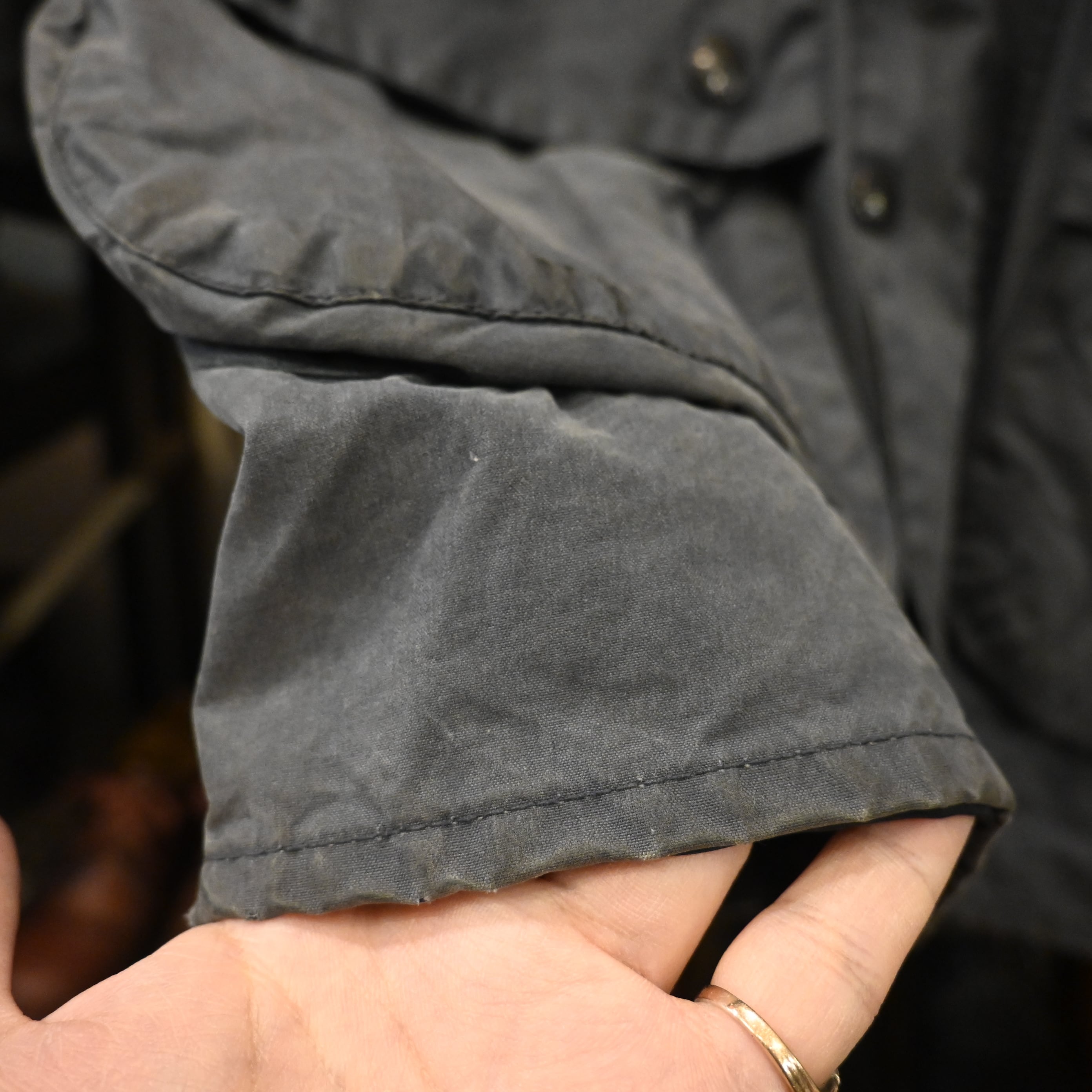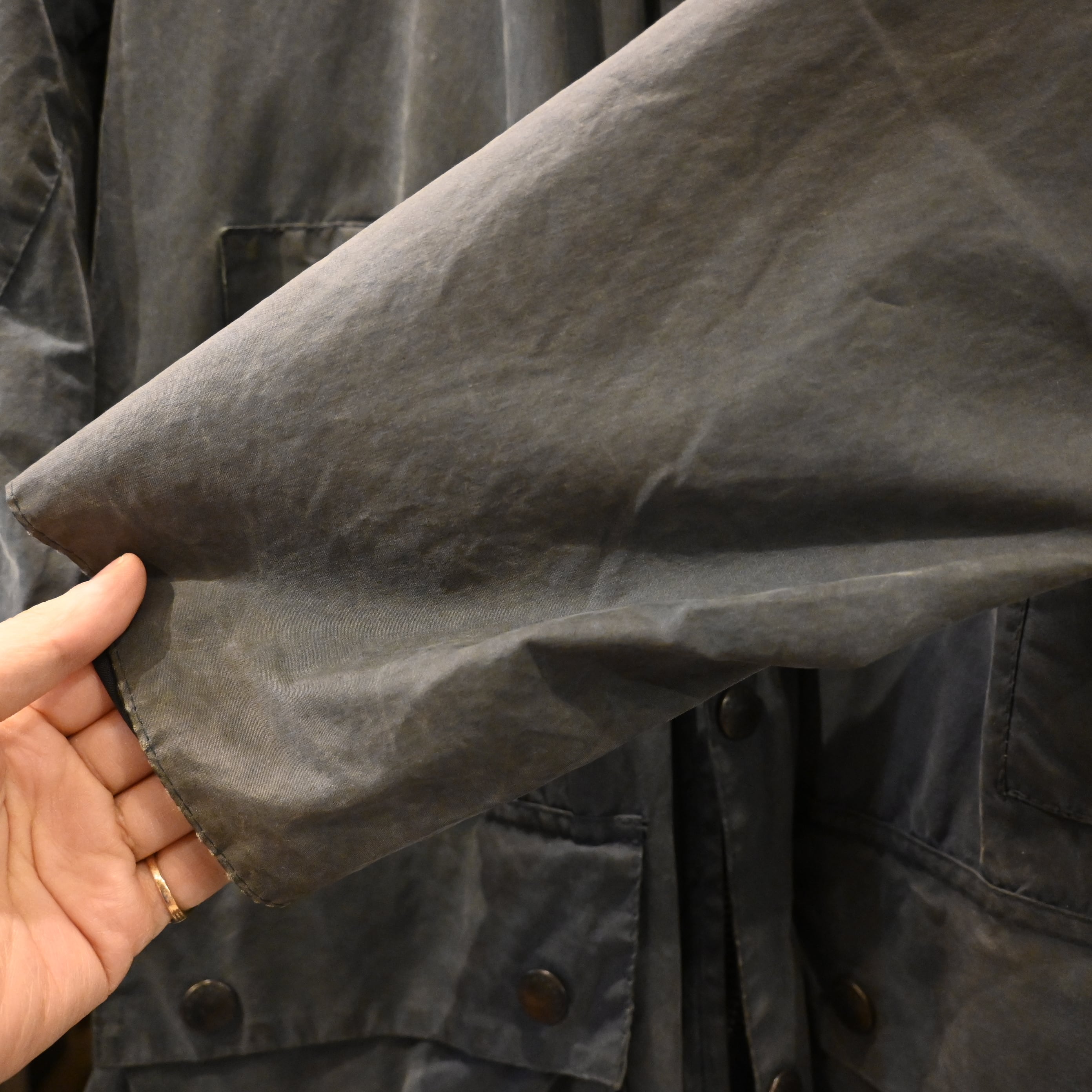 経年によるオイルの抜け感やフェードが見られ、マットで雰囲気のある表情に仕上がっており、ヴィンテージBarbourならではの風合いを楽しんでいただけます。