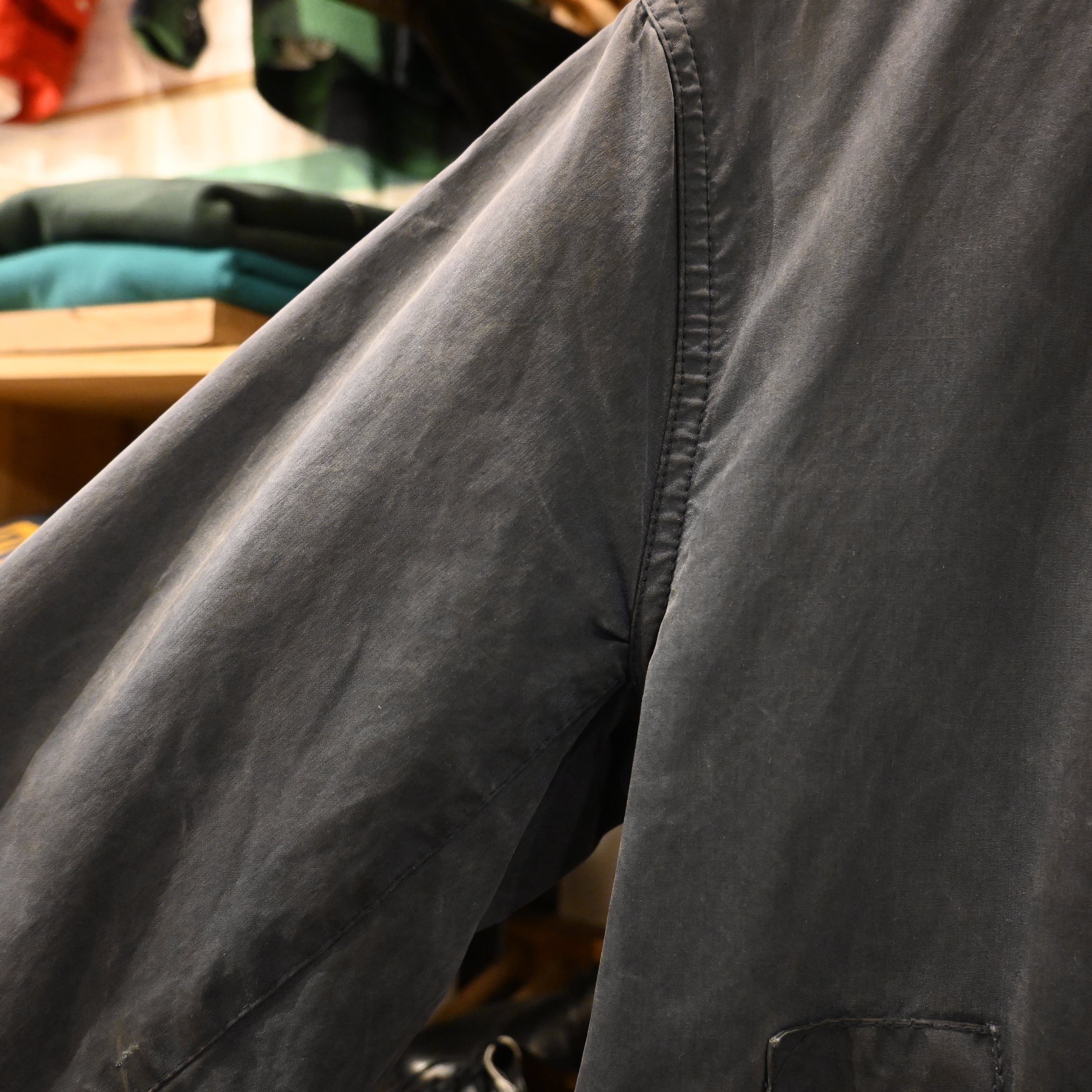 袖口や裾にスレ、小さなダメージ箇所あり。着用に支障のある致命的なダメージはなく、ヴィンテージらしい風合いとしてお楽しみいただけるコンディションです。