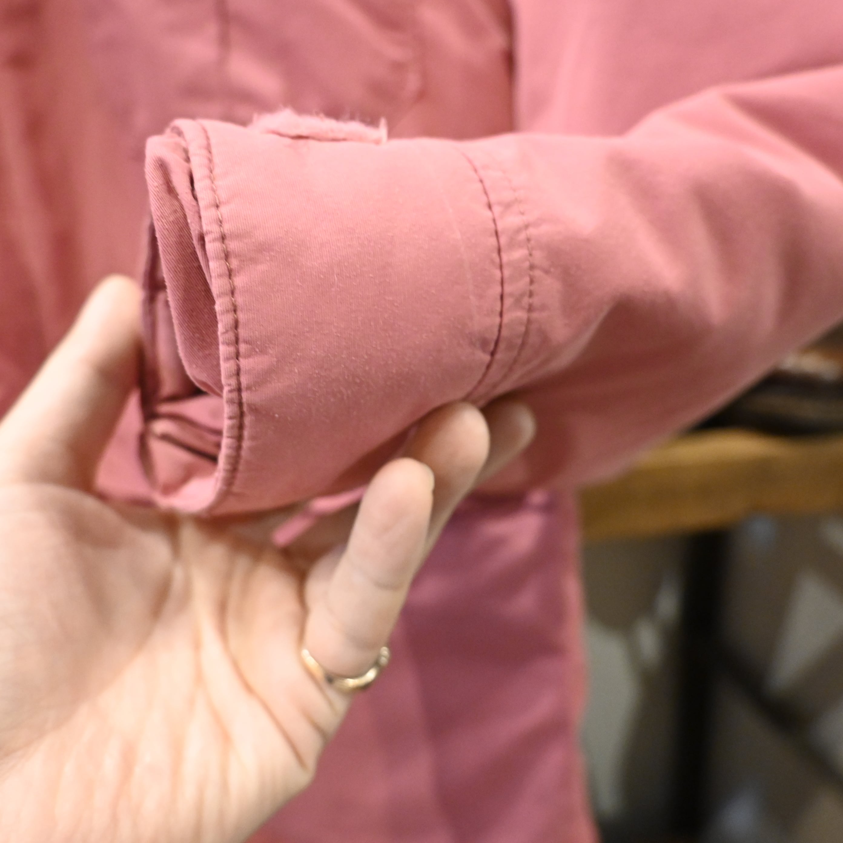 表地は発色の良いピンクナイロン、裏地はネイビーカラーのキルティングライナー仕様。
