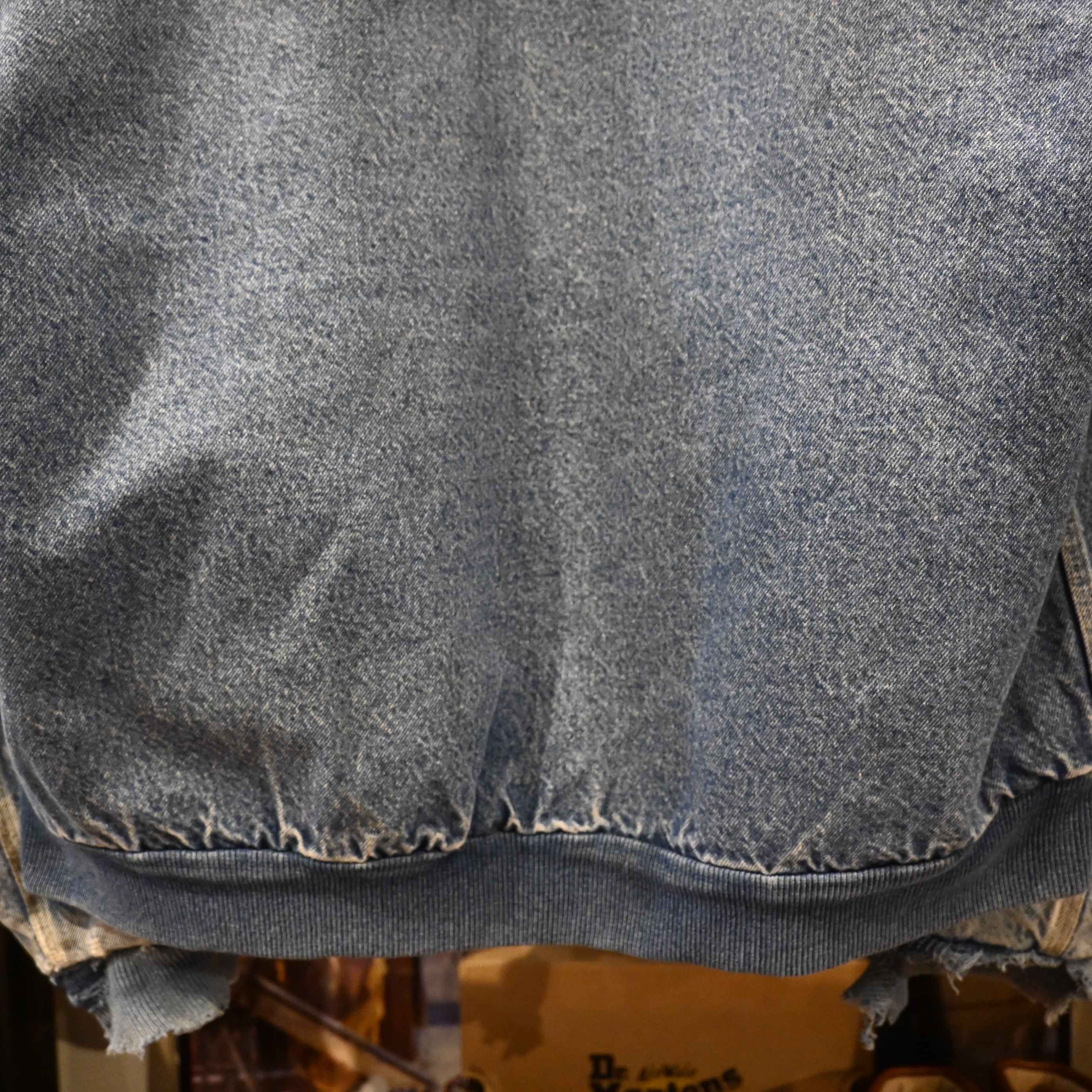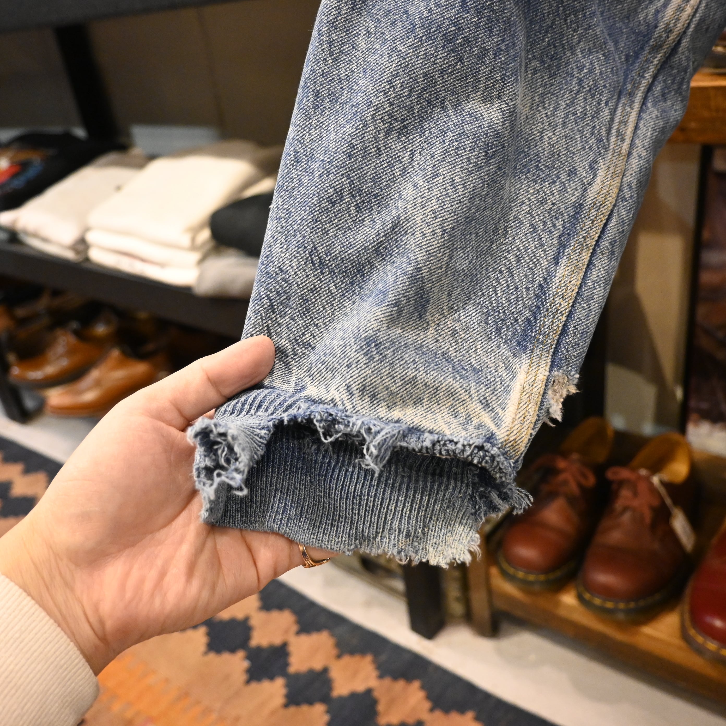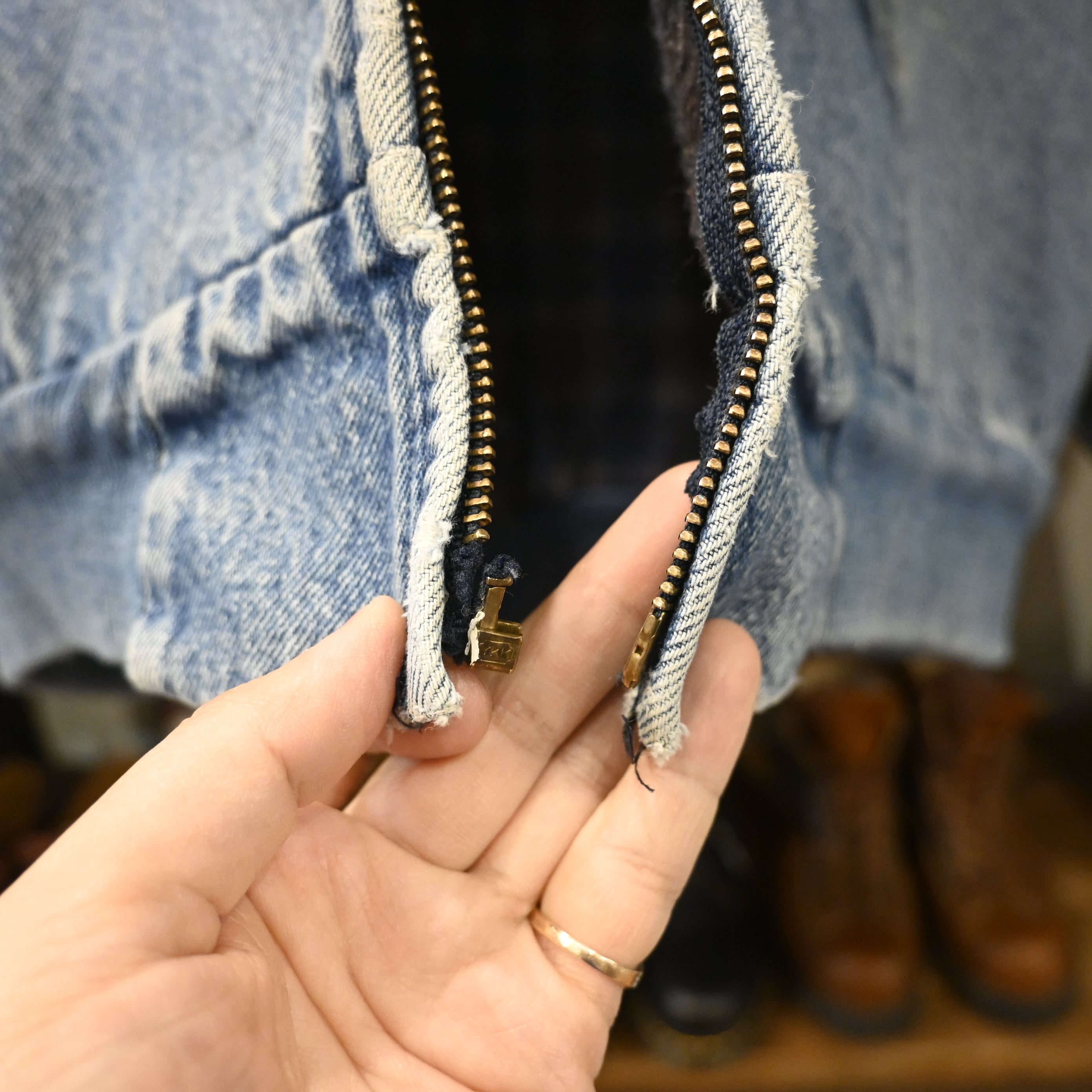 色落ちしたデニムの表情、リアルなダメージ、裏地のブランケット。