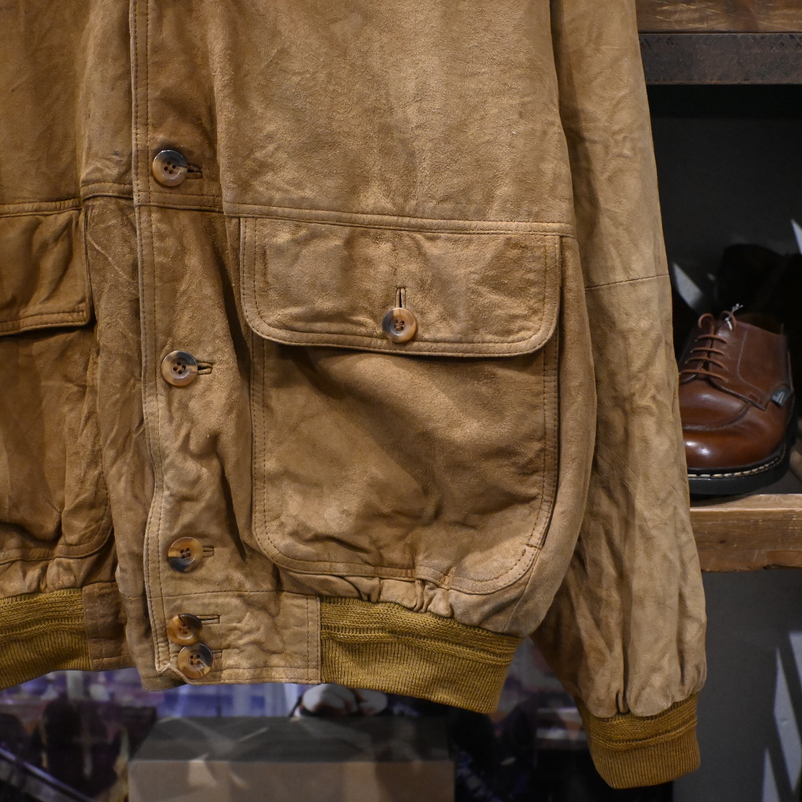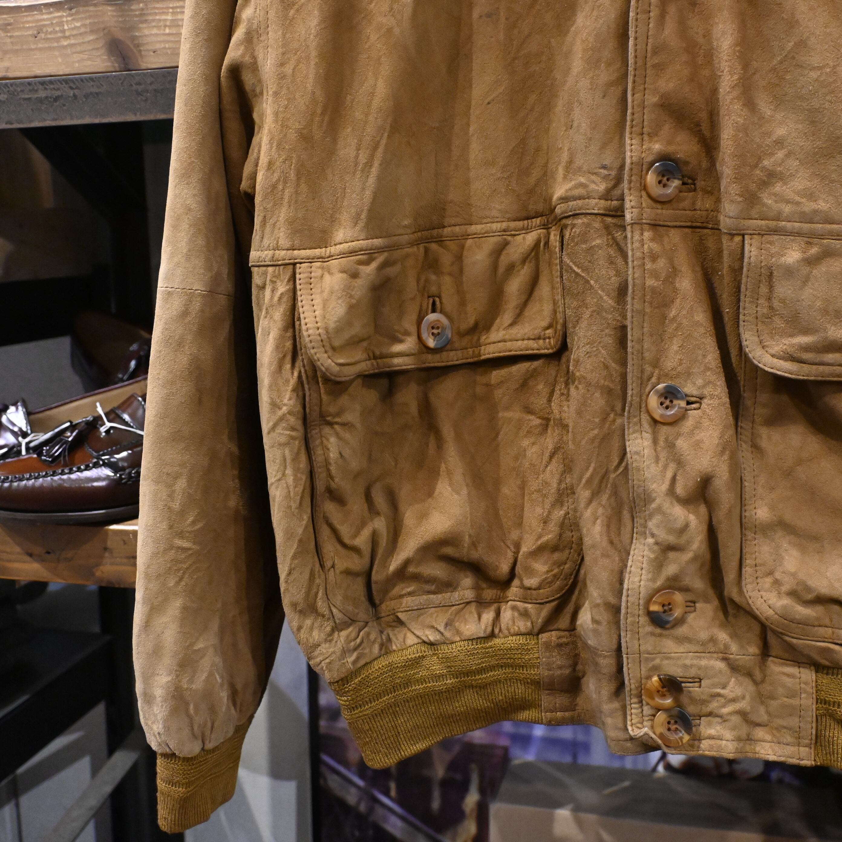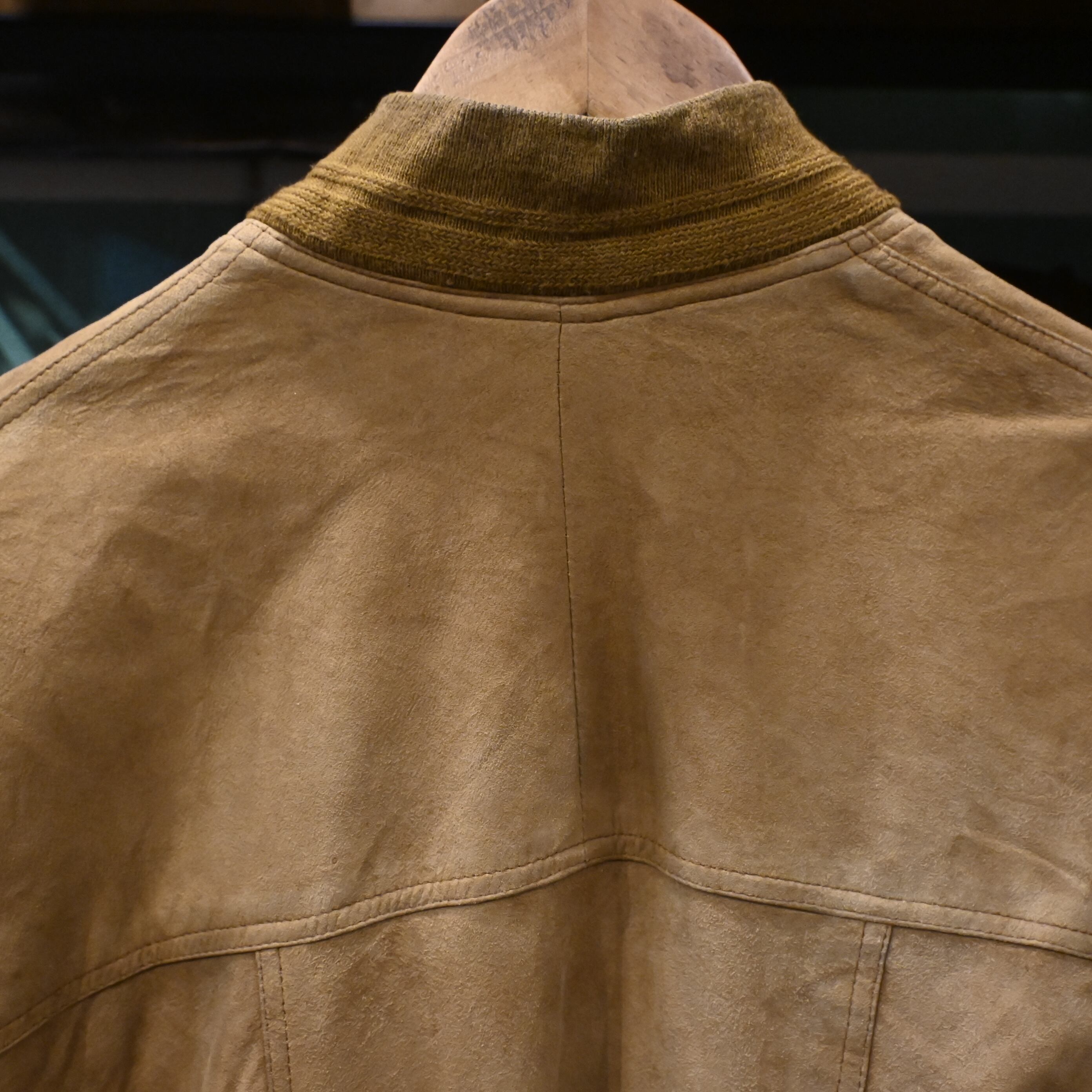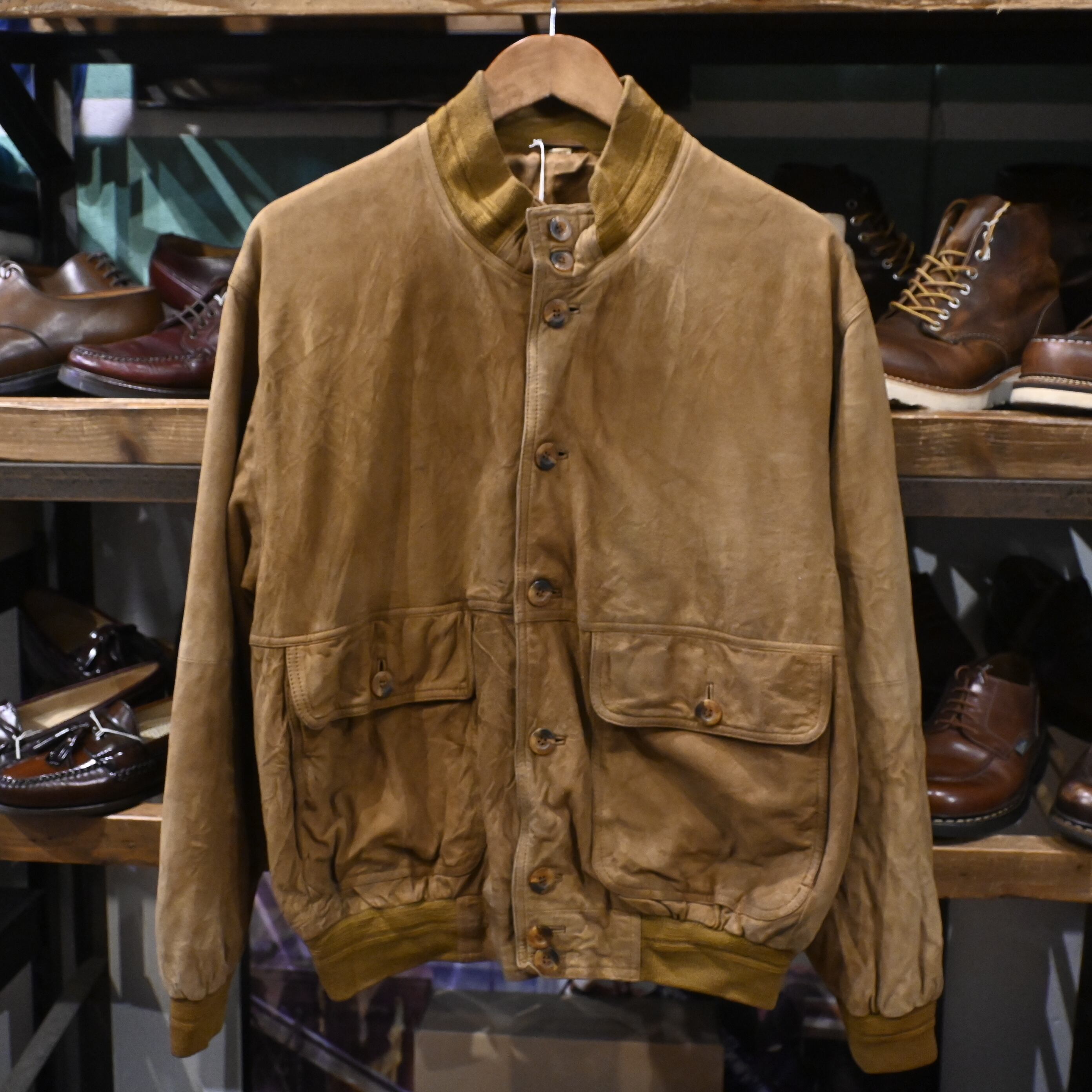 しっとりとした質感のスエードレザーを使用し、長年の着用によって生まれたムラ感・色の濃淡が非常に雰囲気のある一着です。