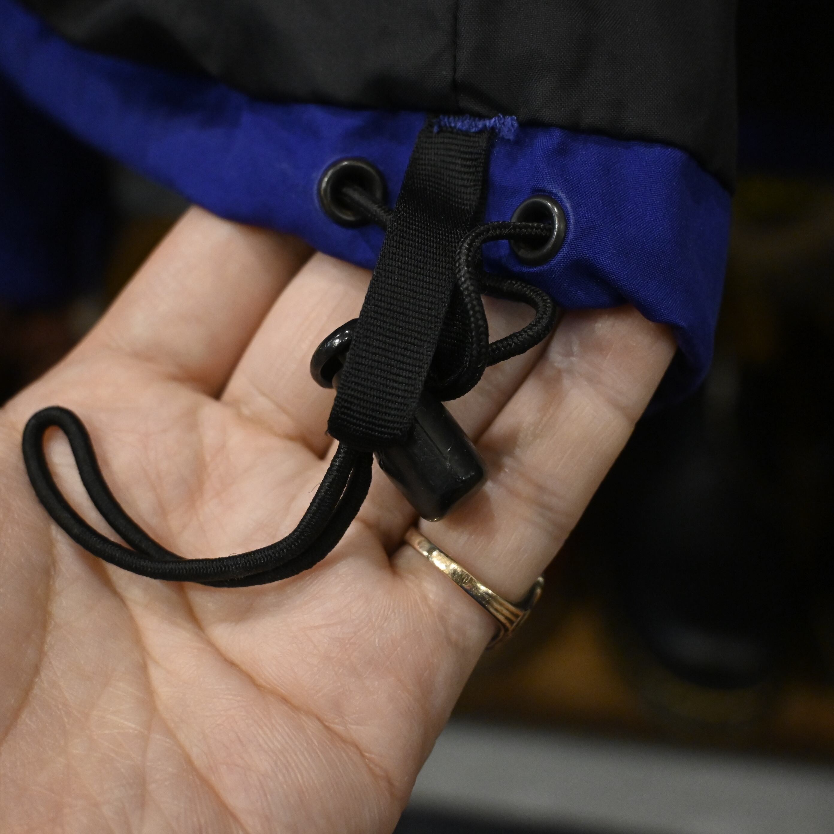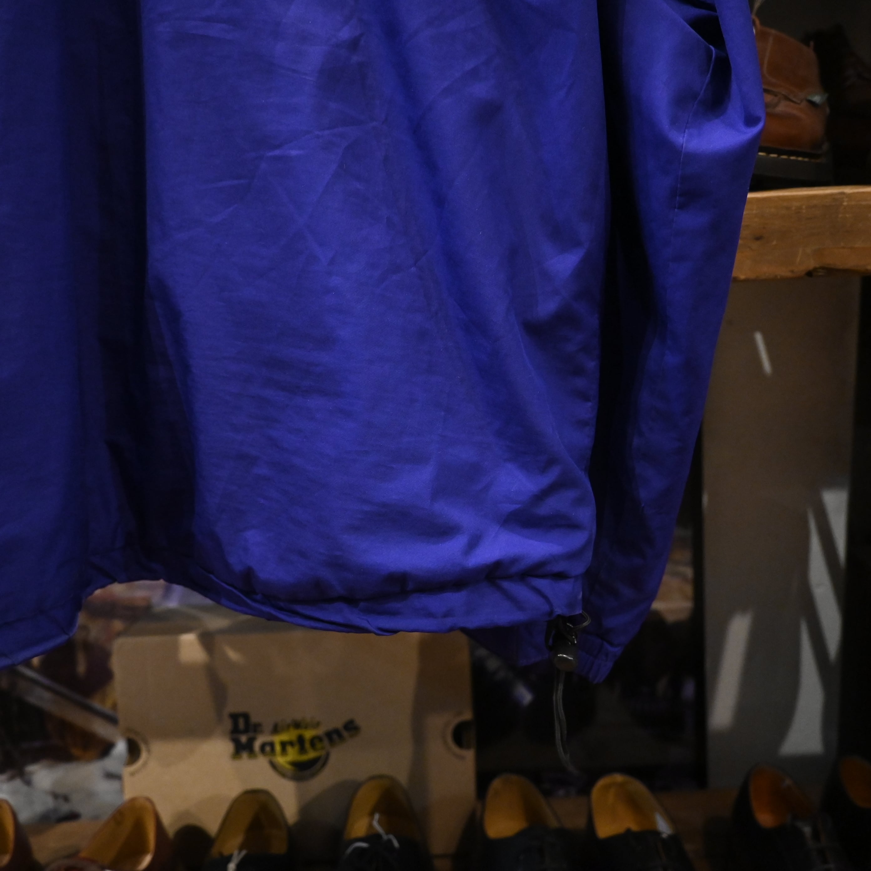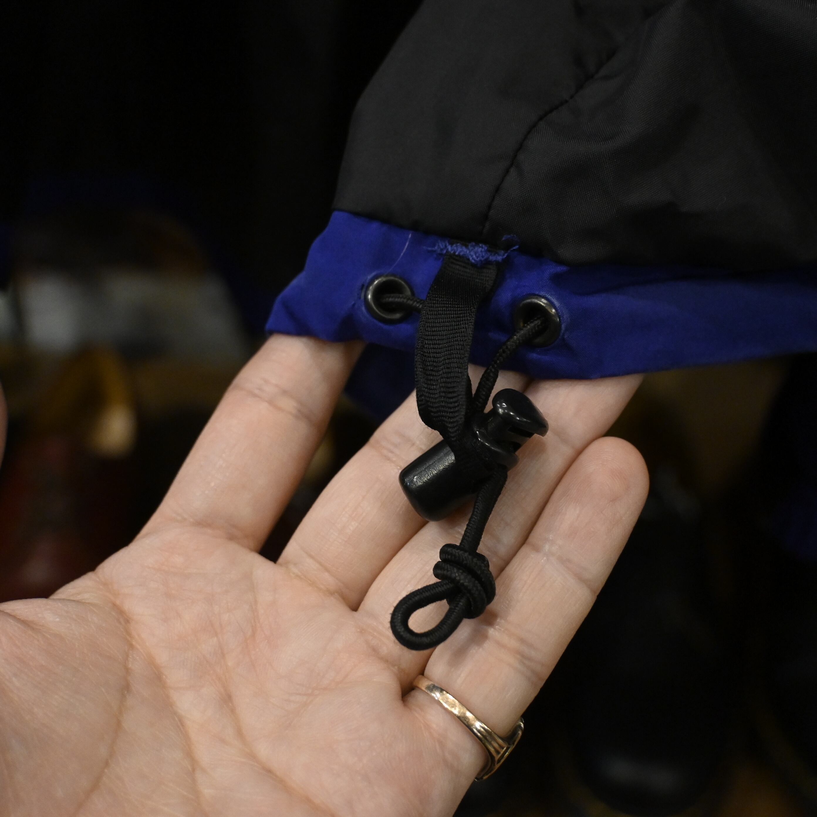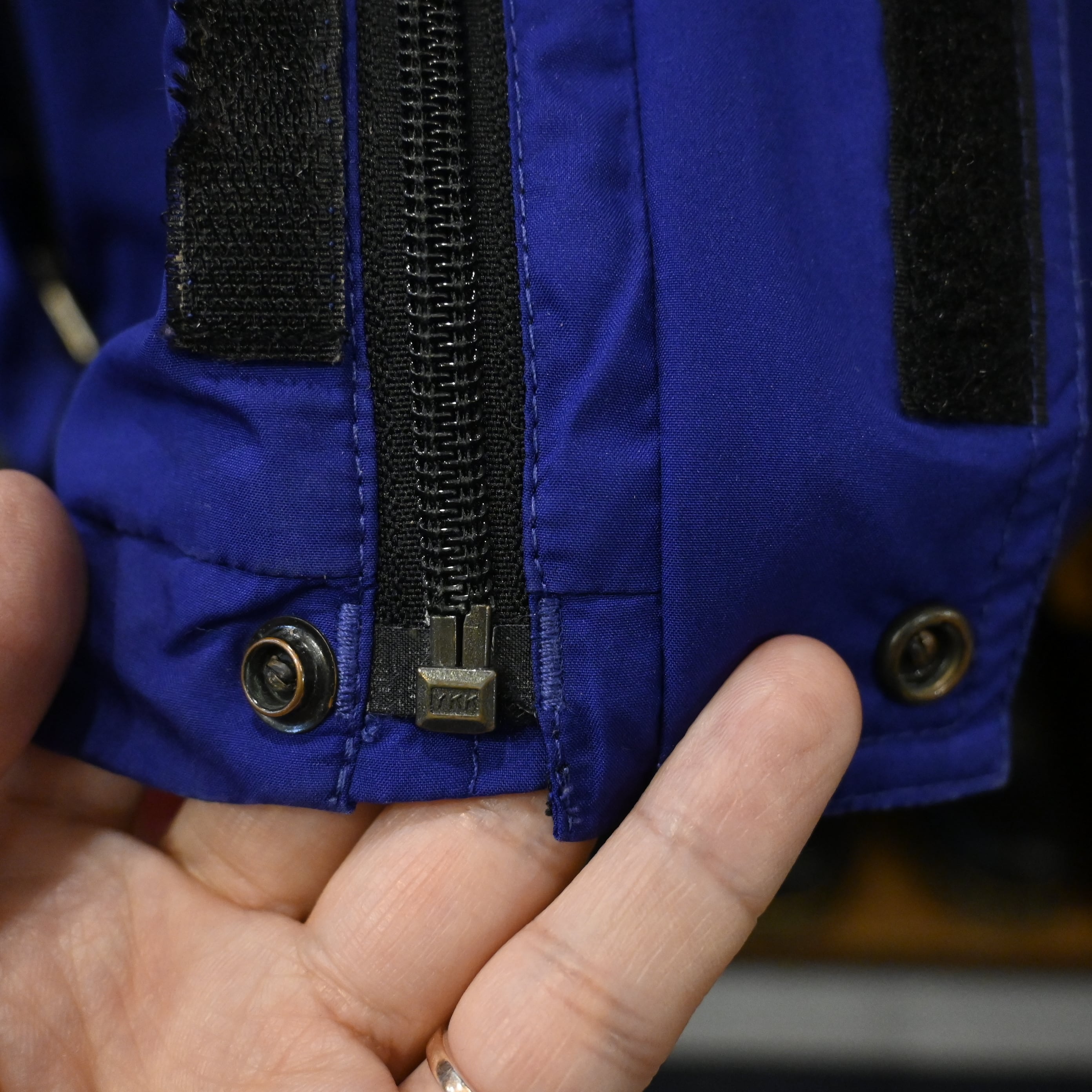 フロントはダブルジップ+スナップボタンの二重構造、裾にはドローコードを備え、シルエット調整も可能です。