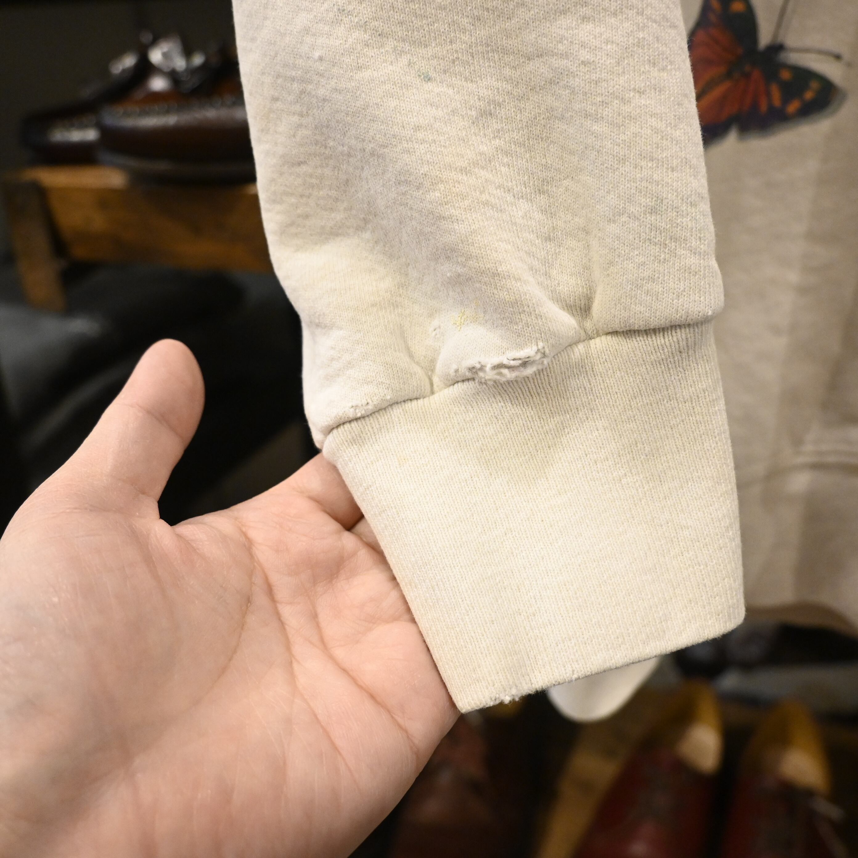 リアルな色彩表現と繊細なタッチで描かれた蝶は、単なるプリントスウェットとは一線を画すアート性の高さを感じさせます。
