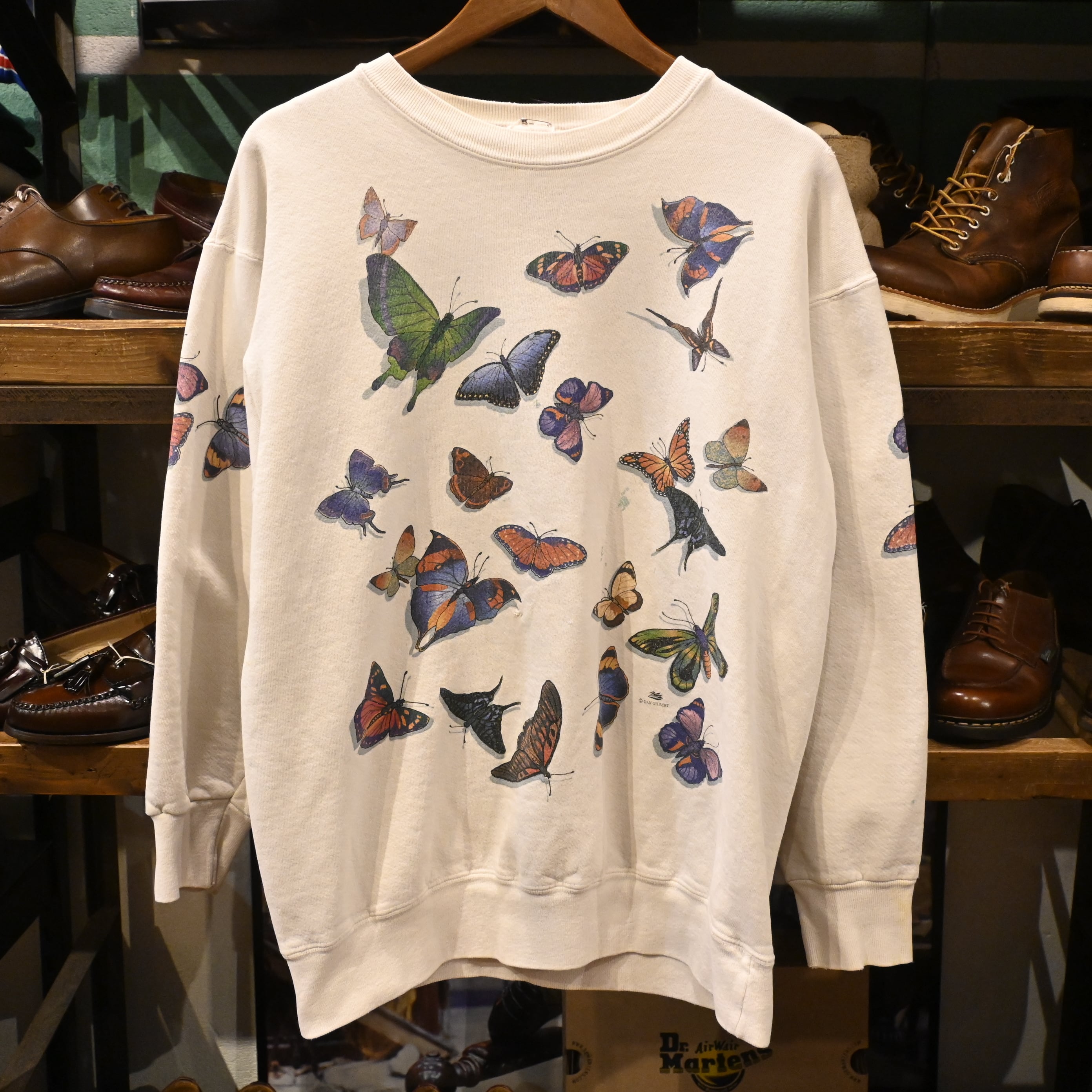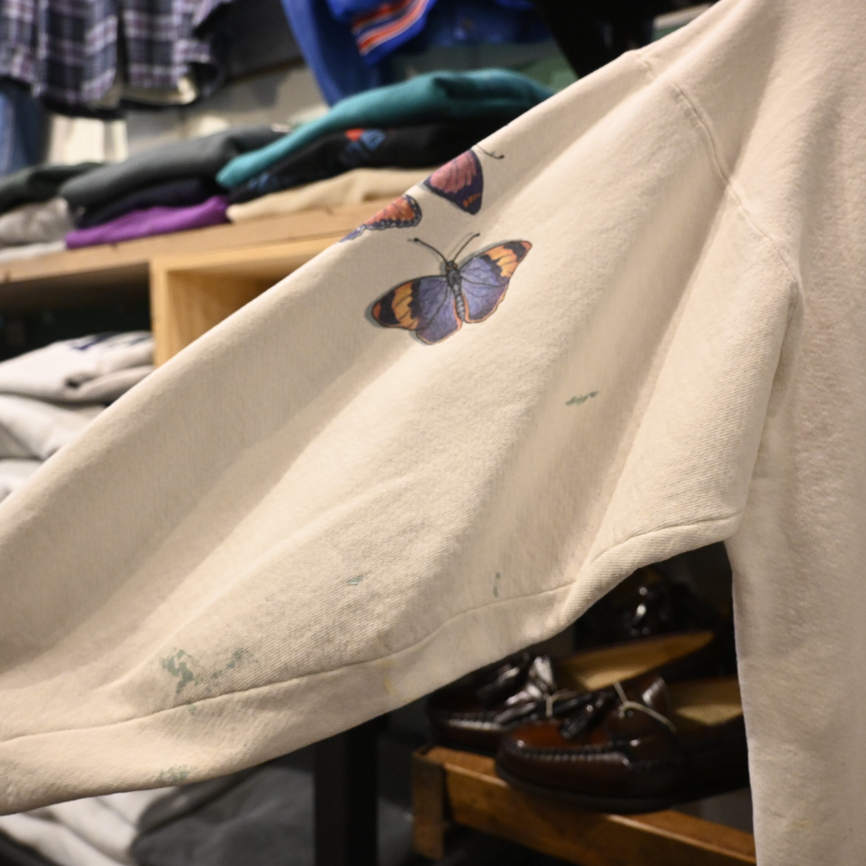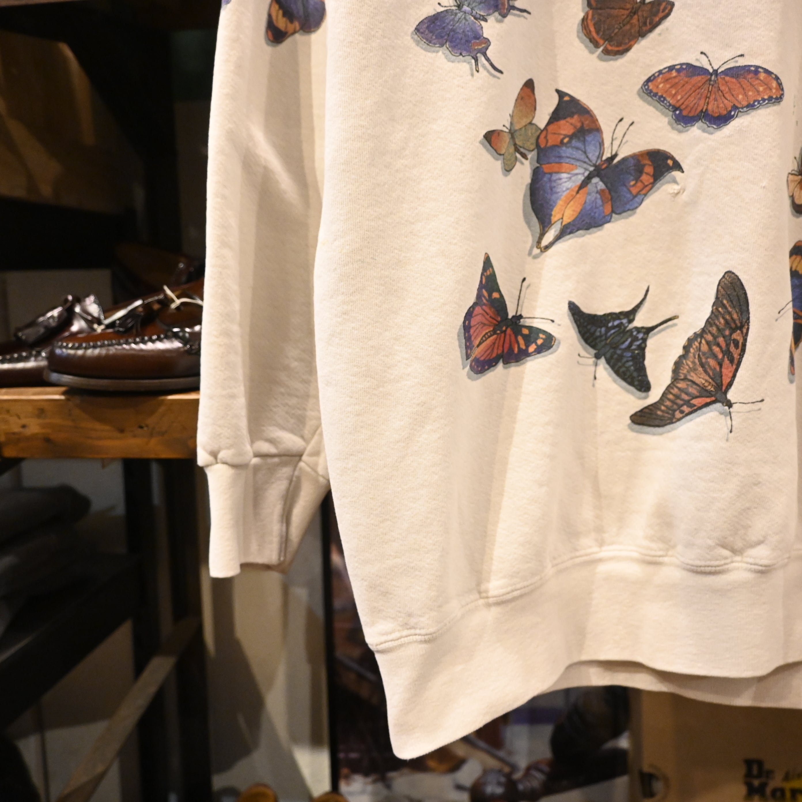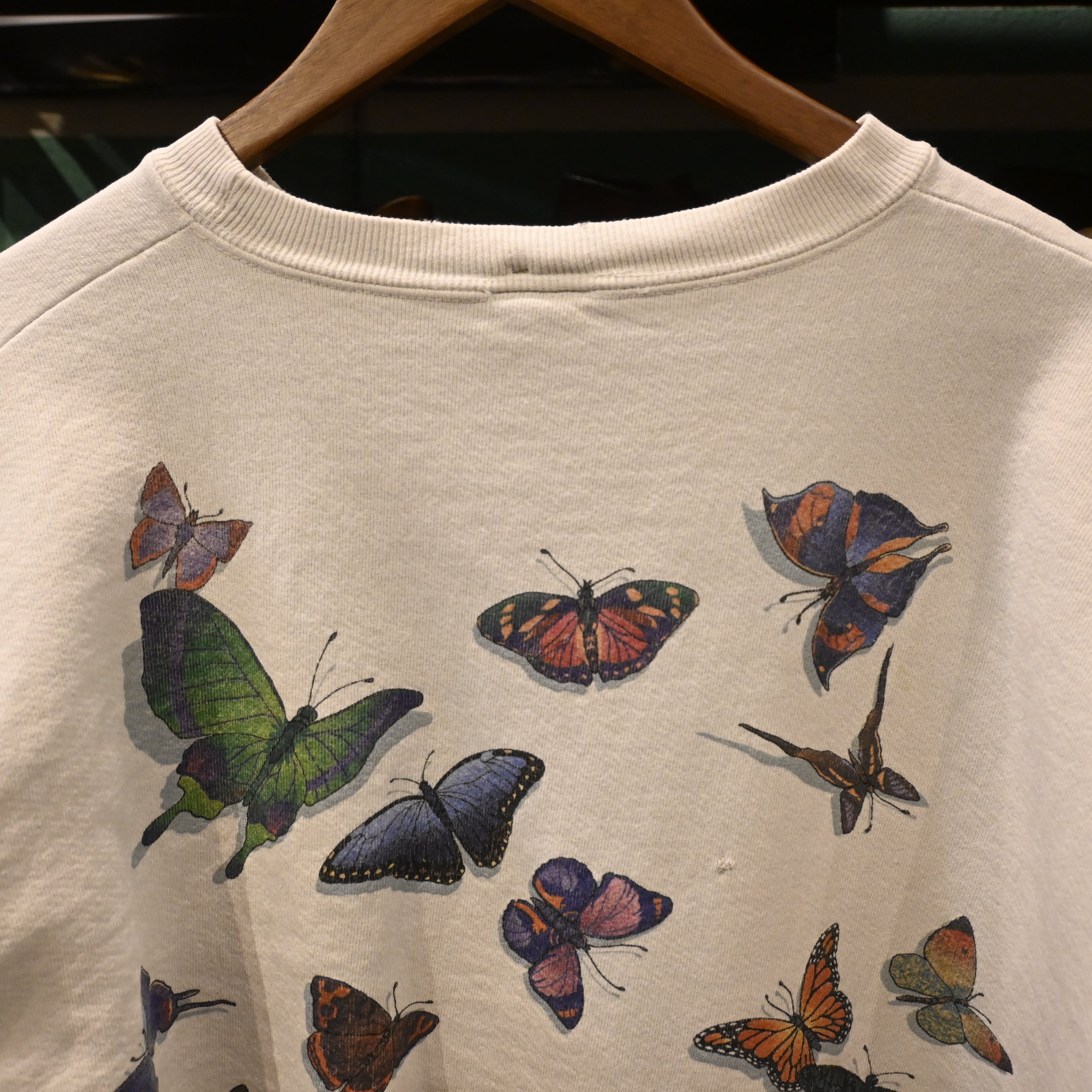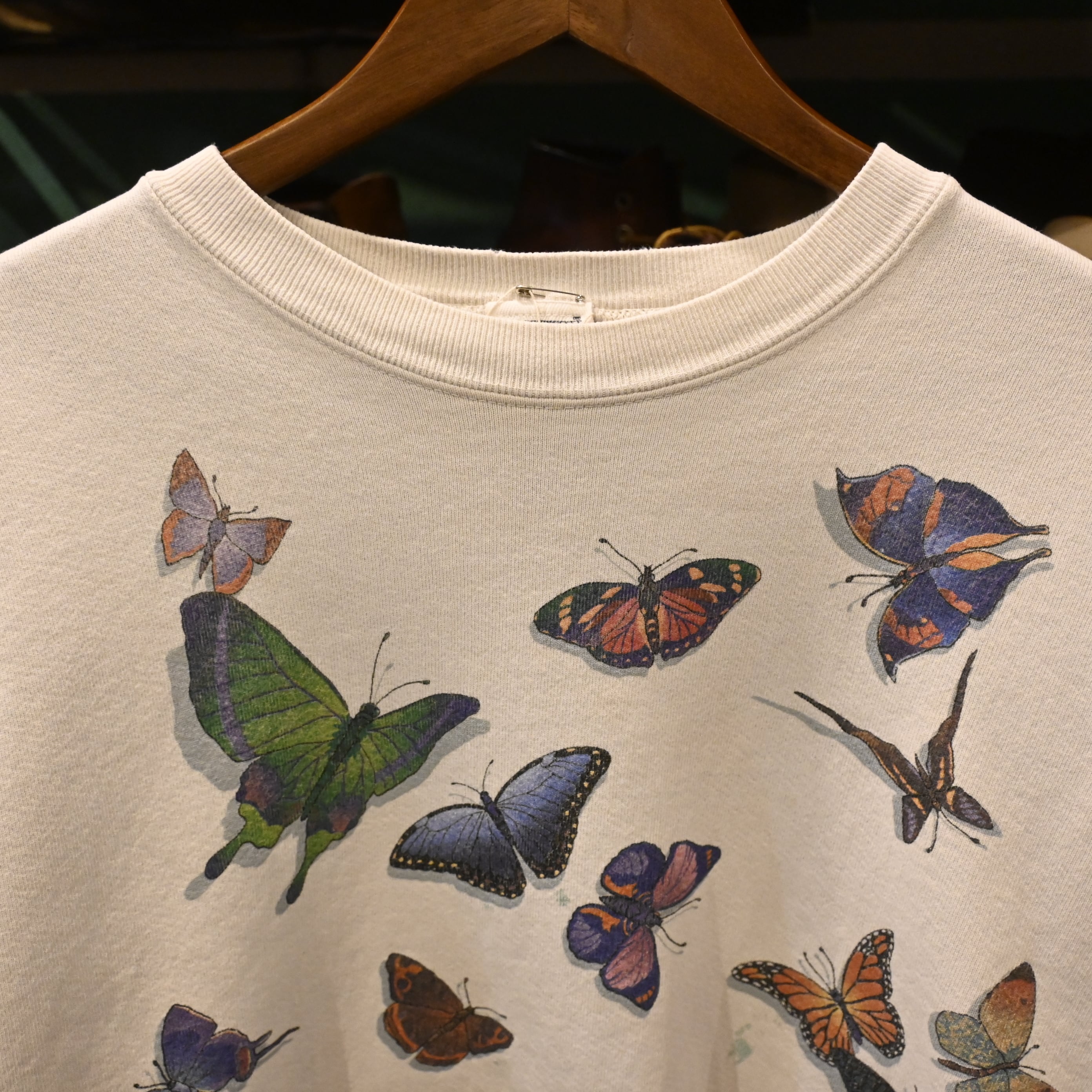 ヴィンテージ、USA製、アートプリント、蝶モチーフといった要素が揃った希少性のあるスウェットです。