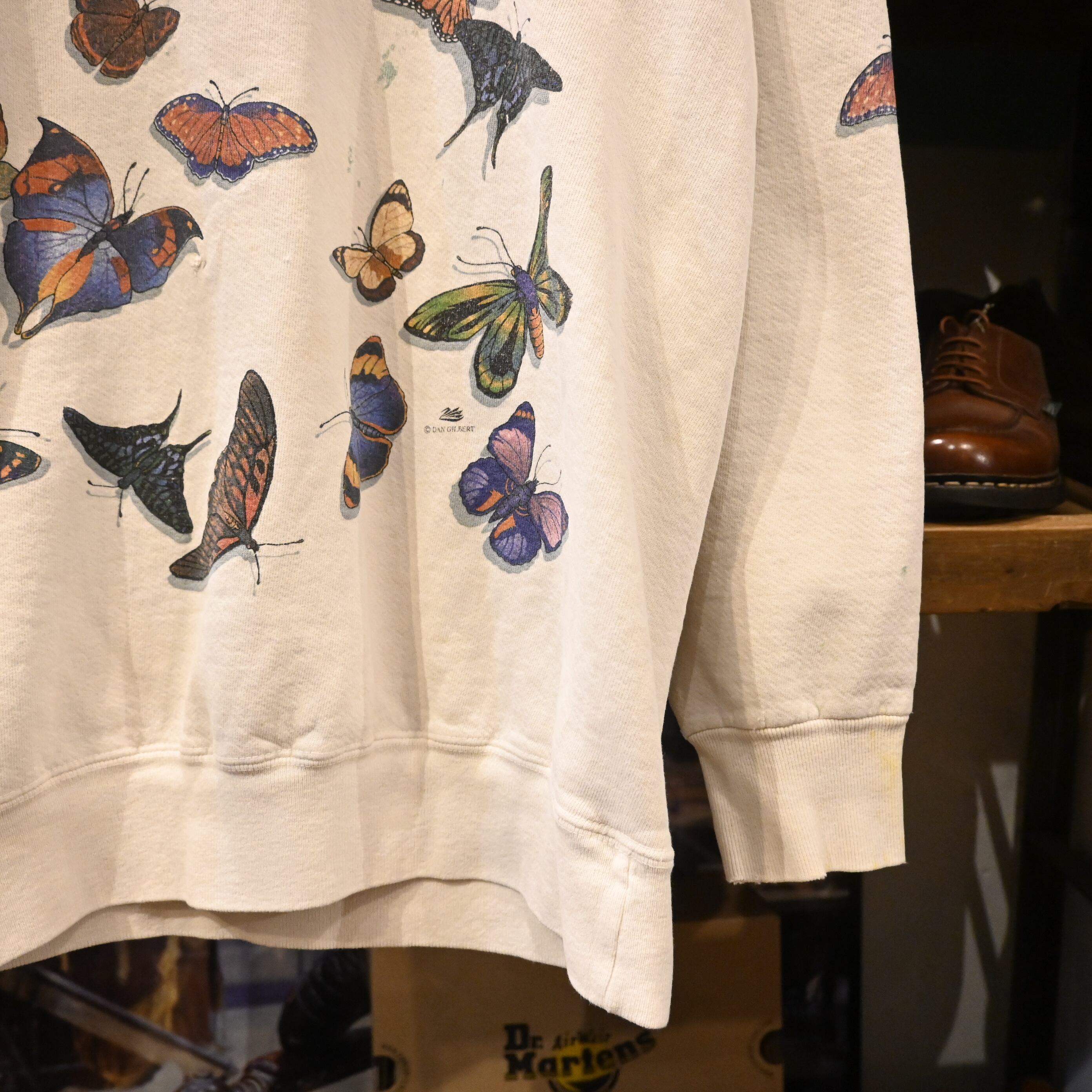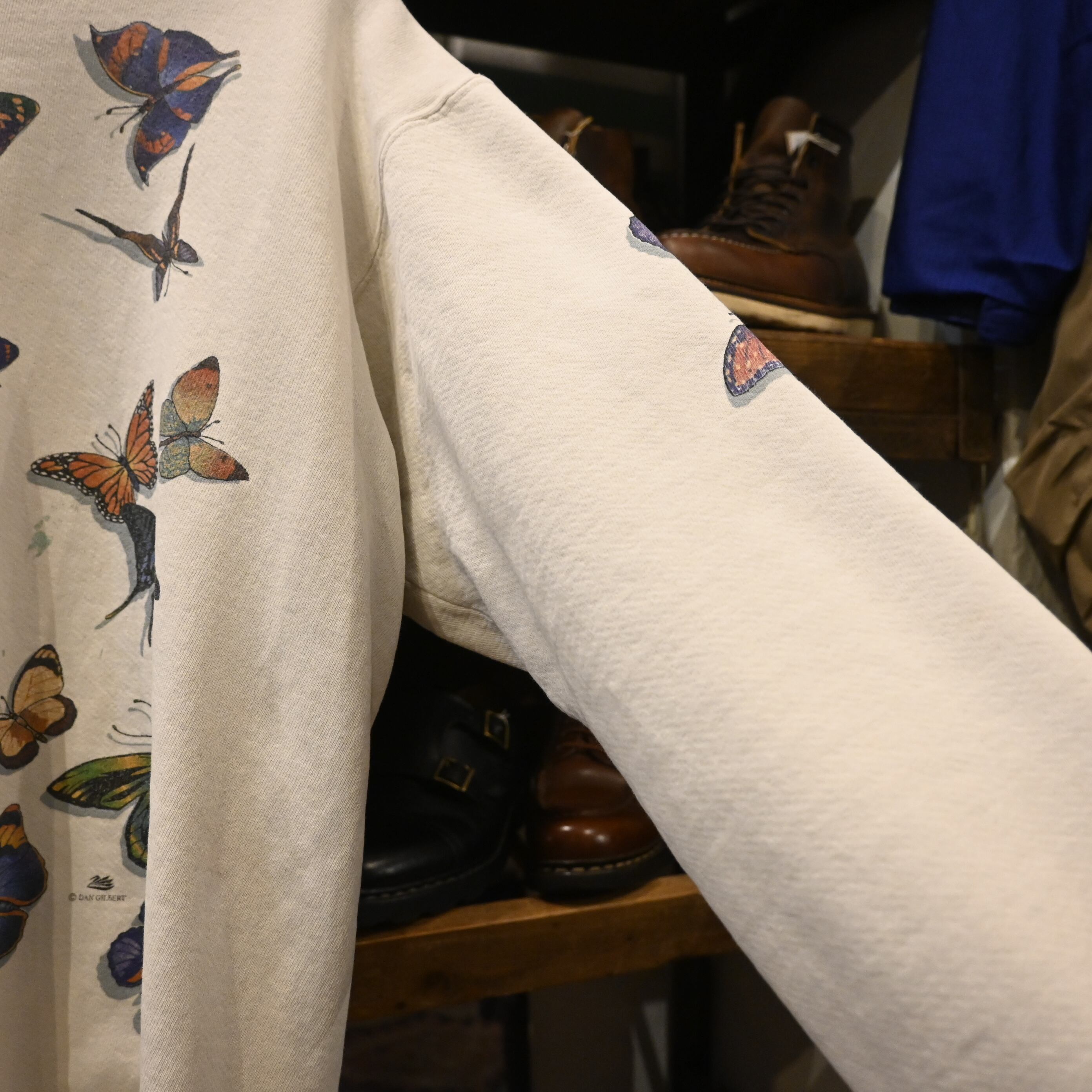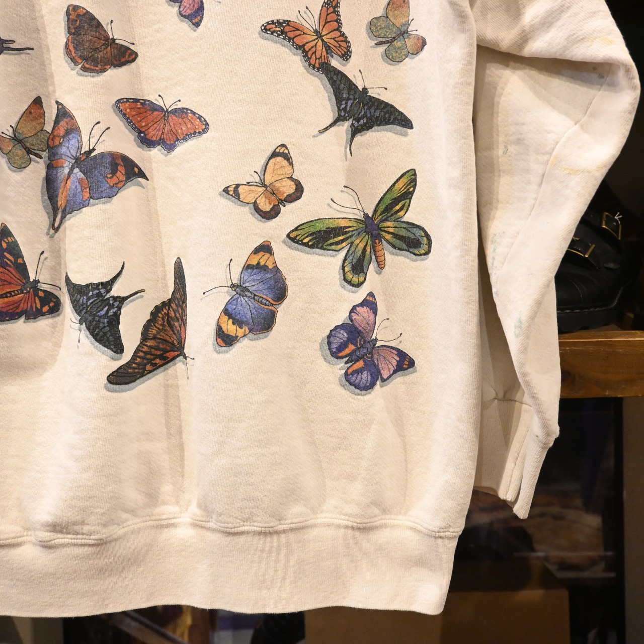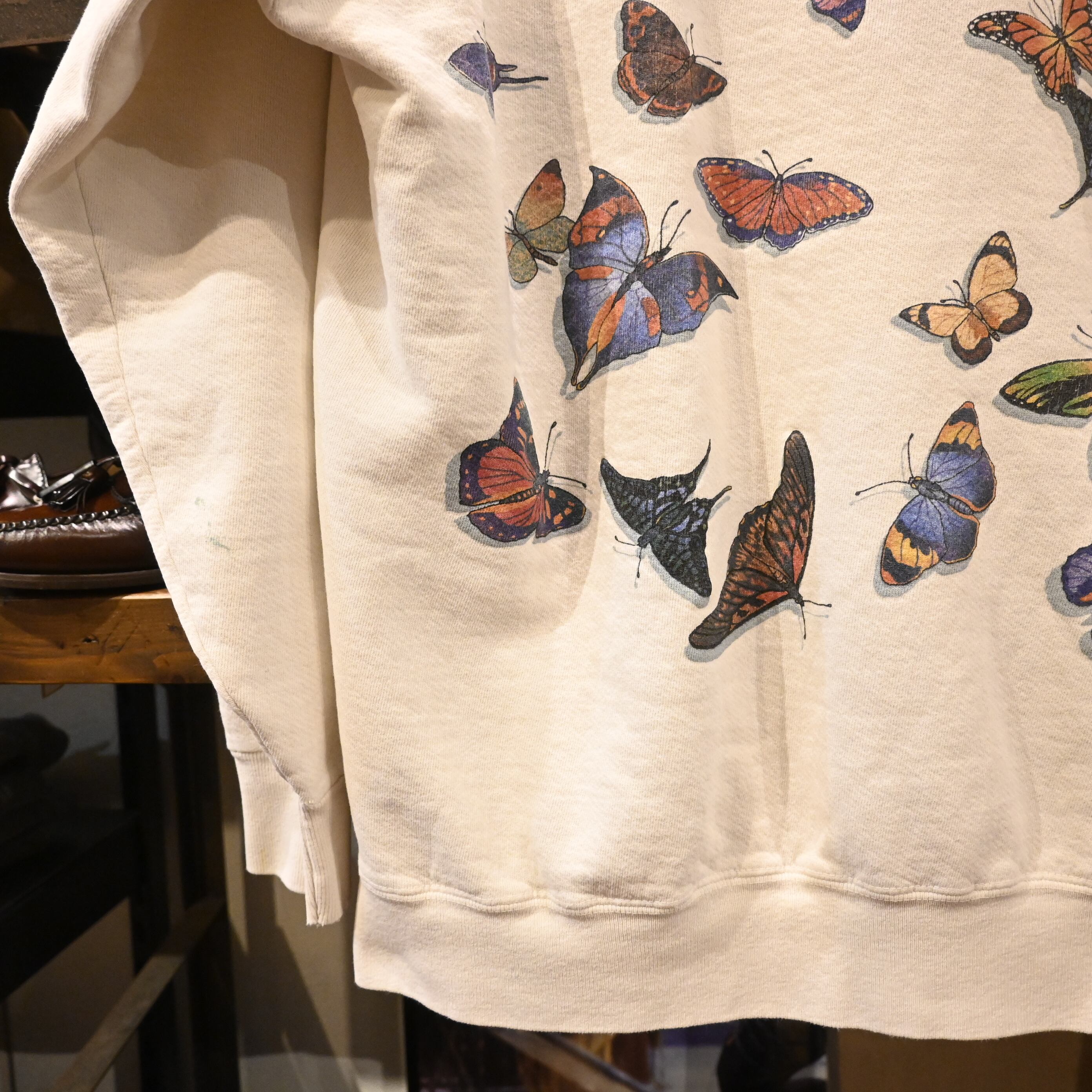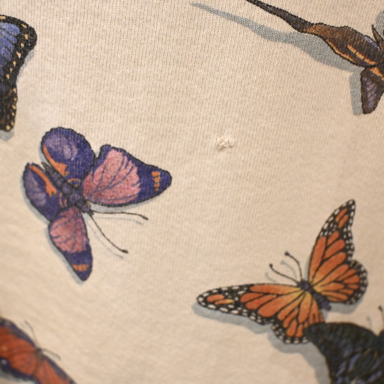 ヴィンテージ、USA製、アートプリント、蝶モチーフといった要素が揃った希少性のあるスウェットです。