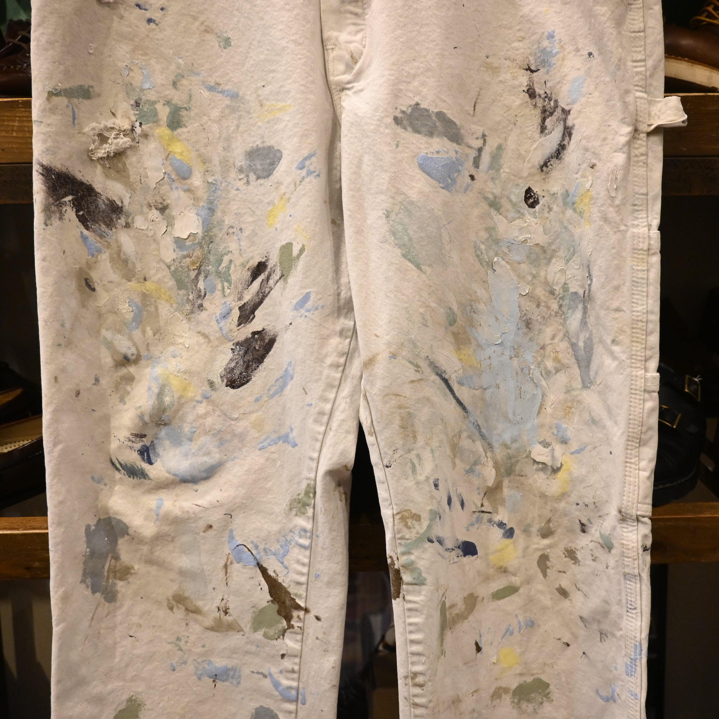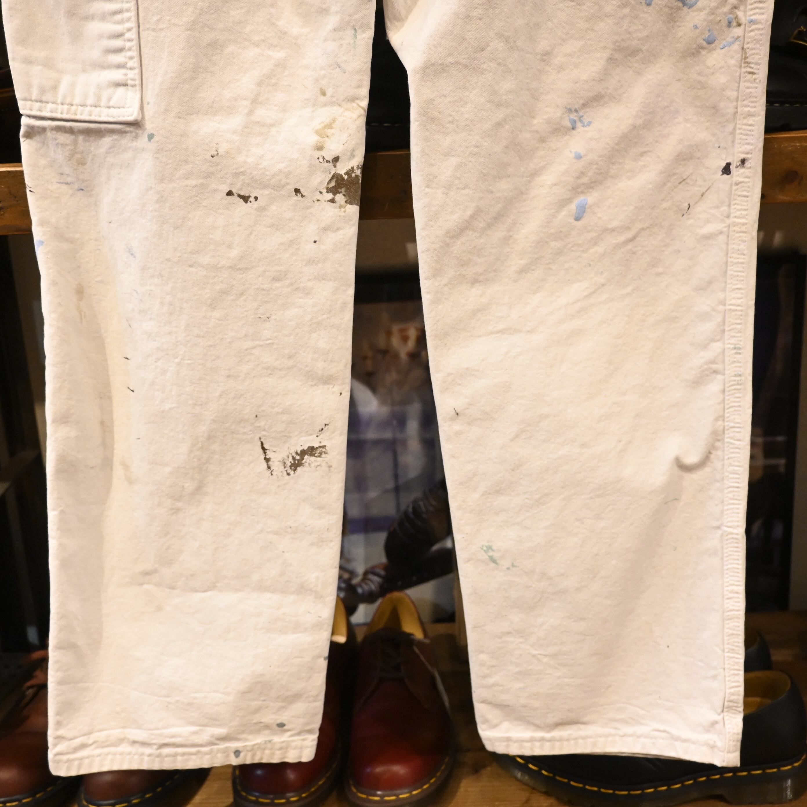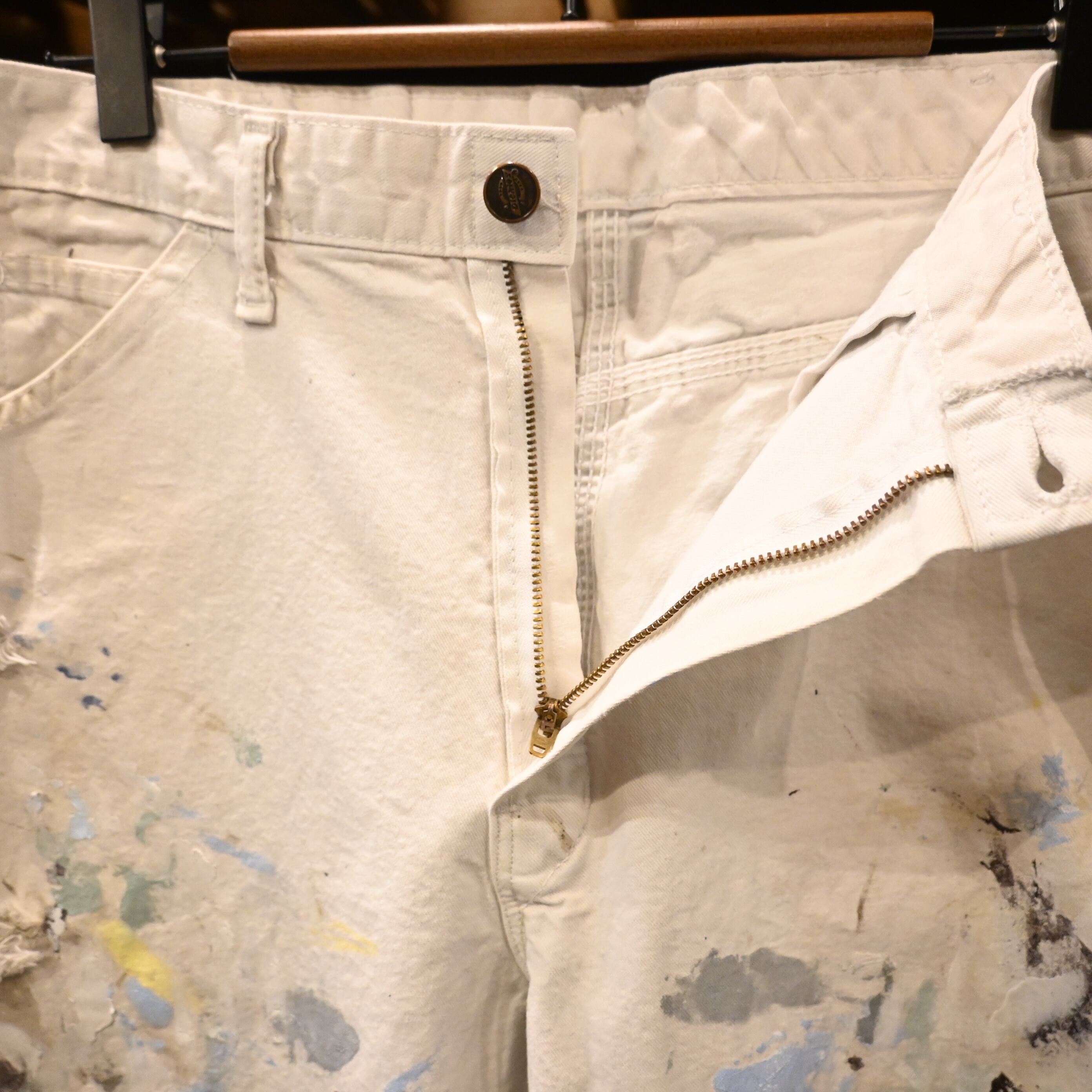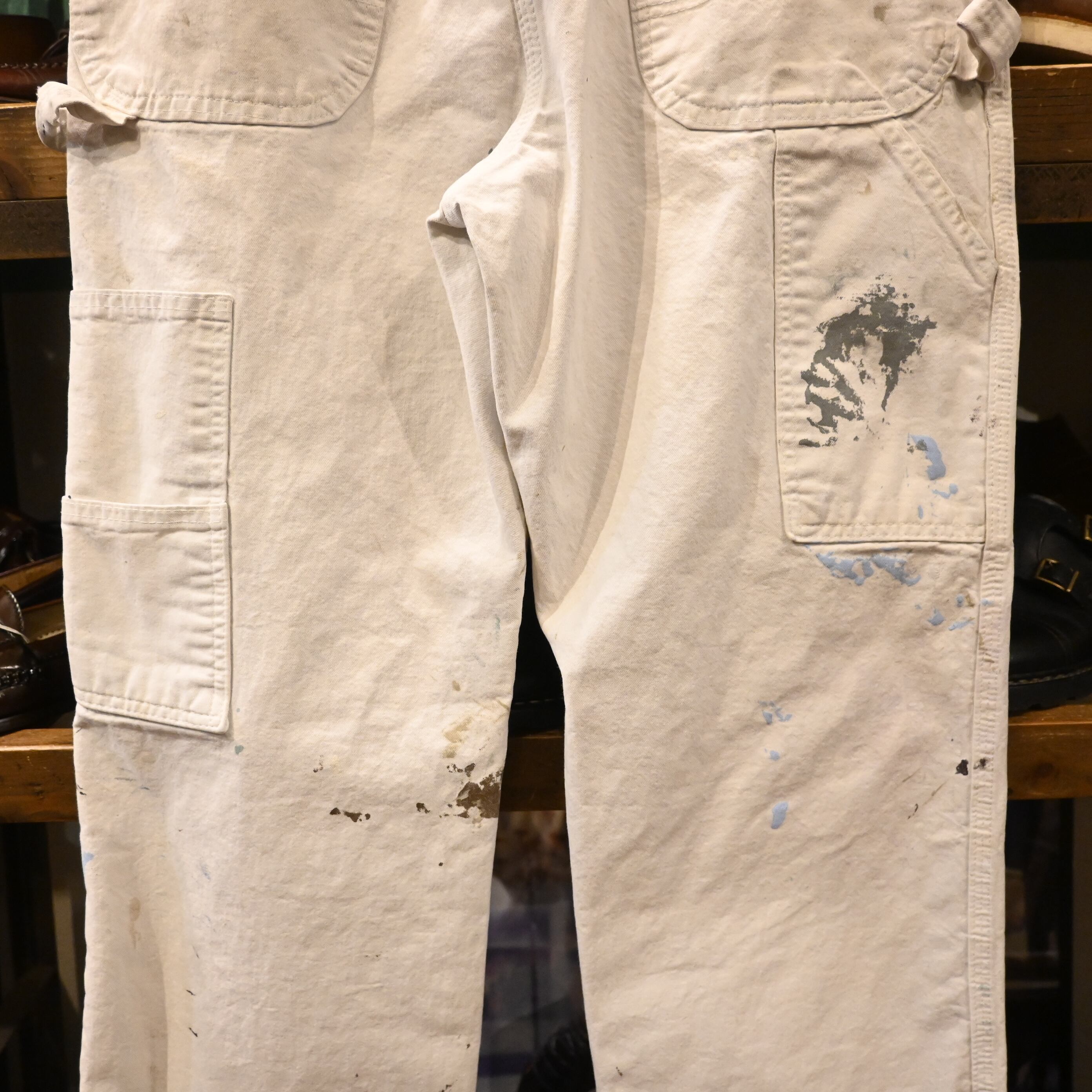 全体にペンキ汚れ、擦れ、破れが見られます。いずれも実際のワークによるエイジングで、雰囲気を損なうものではなく、ヴィンテージならではの味わいとしてお楽しみいただけるコンディションです。