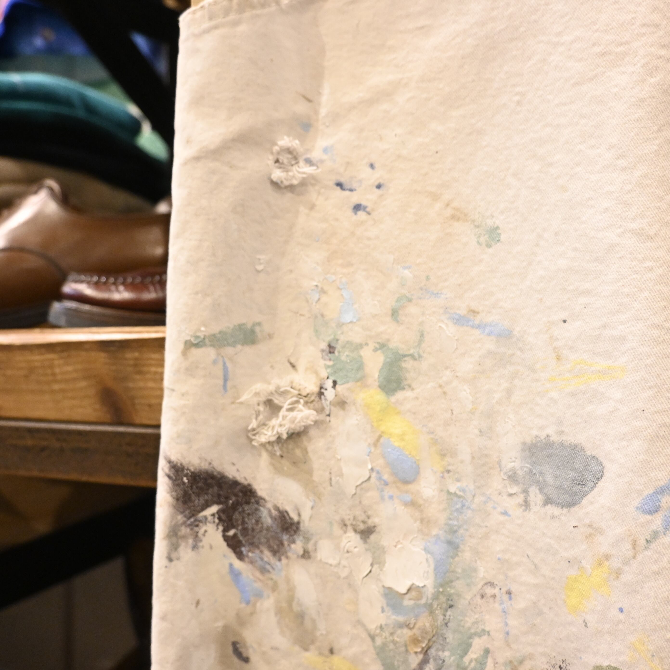 白キャンバス地に実際の作業で付着した多色のペンキ飛びや擦れ、リペア跡が重なり、リアルワークならではの迫力と一点物の雰囲気を存分に感じられる一本です。