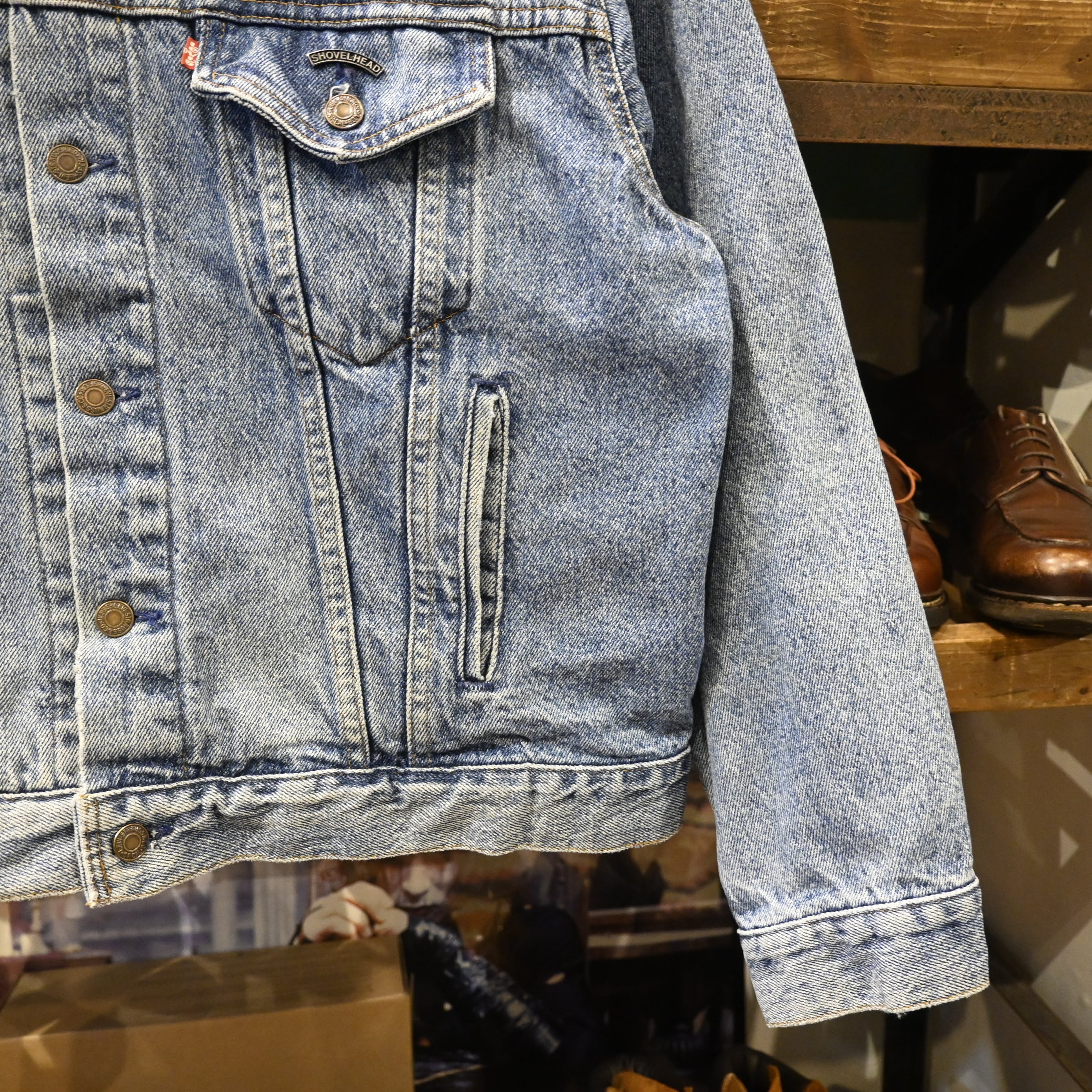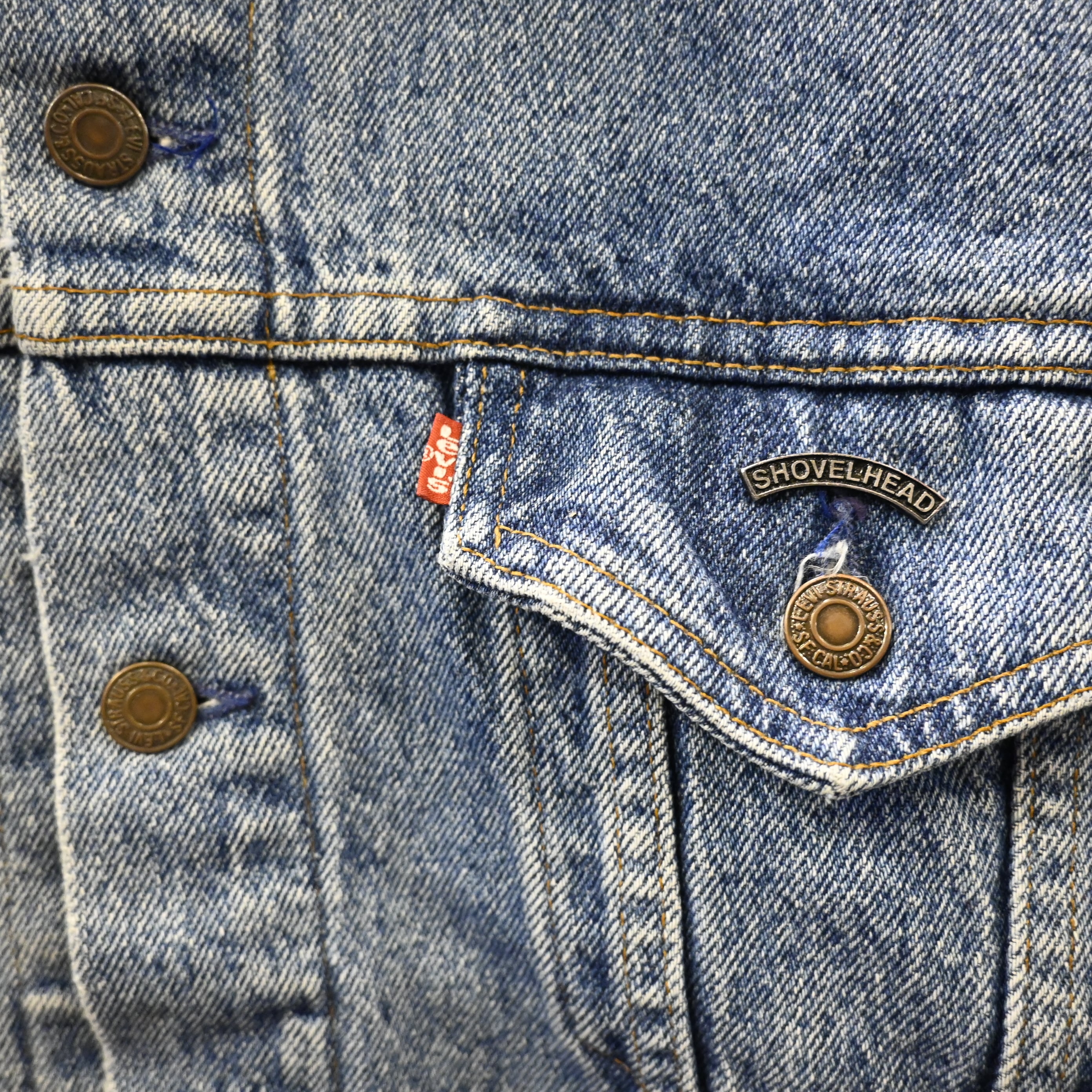 胸ポケット部分には“SHOVELHEAD”モチーフのピンズが取り付けられています。