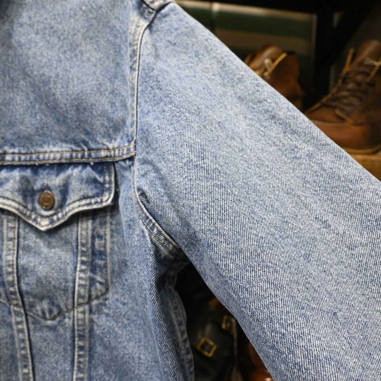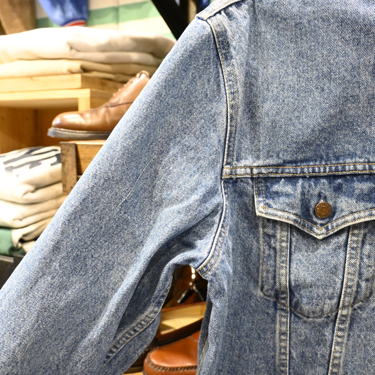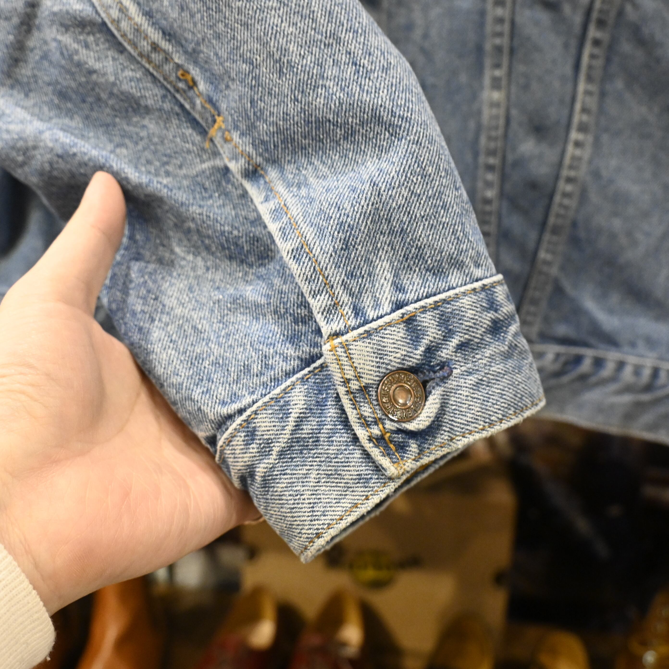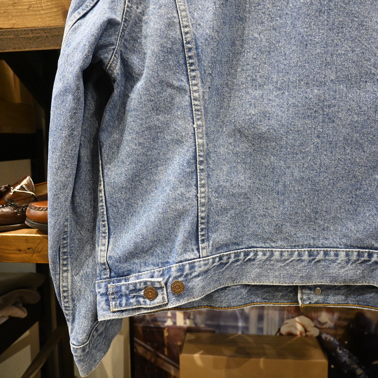 程よくフェードしたブルーデニムの色落ちが魅力で、ヴィンテージらしい表情を持ちながらも、日常使いしやすいコンディション。