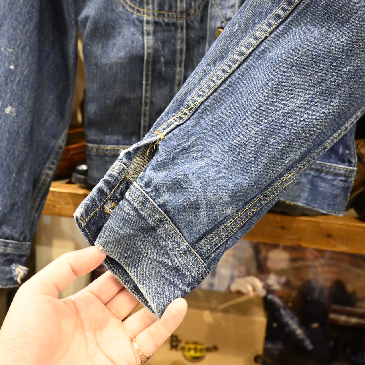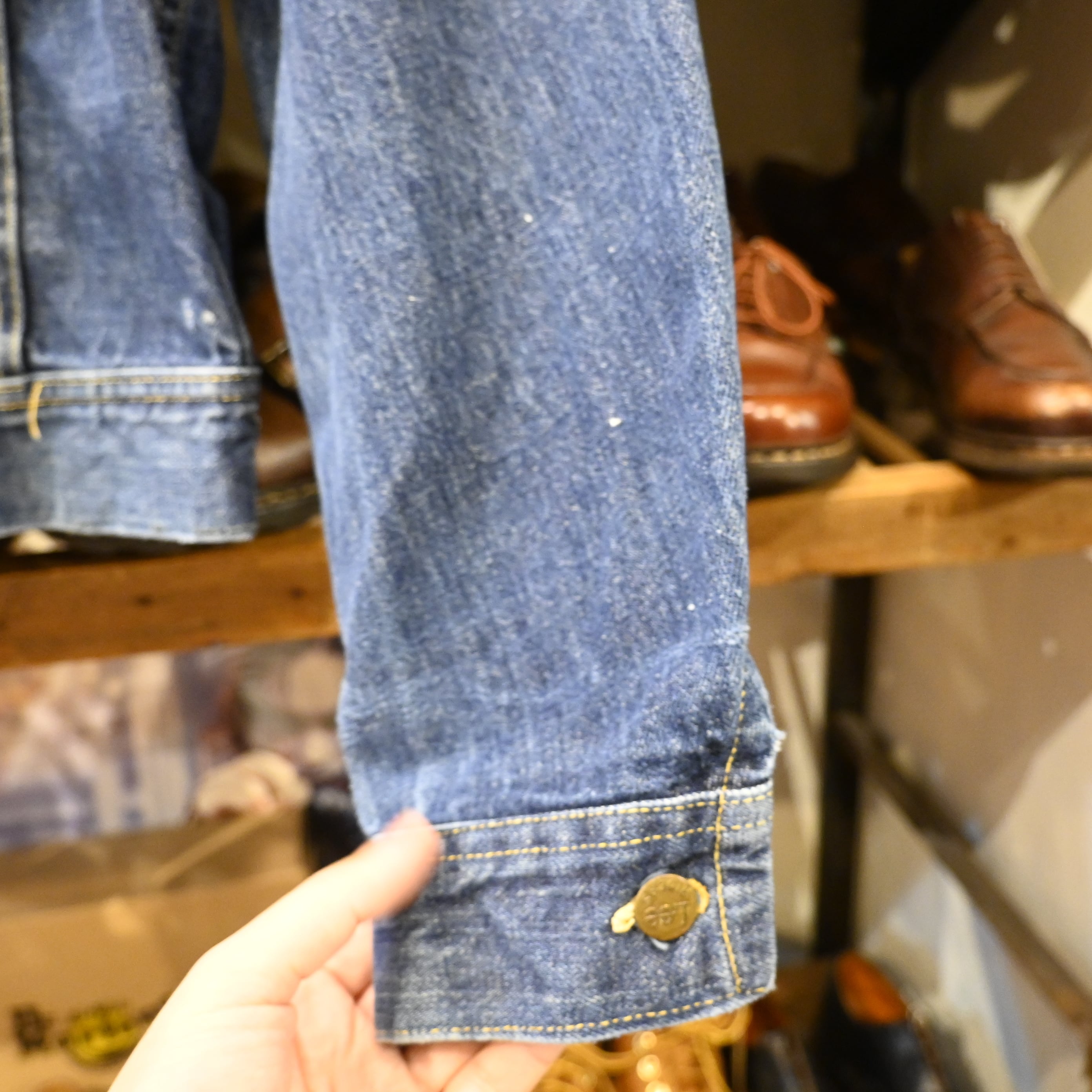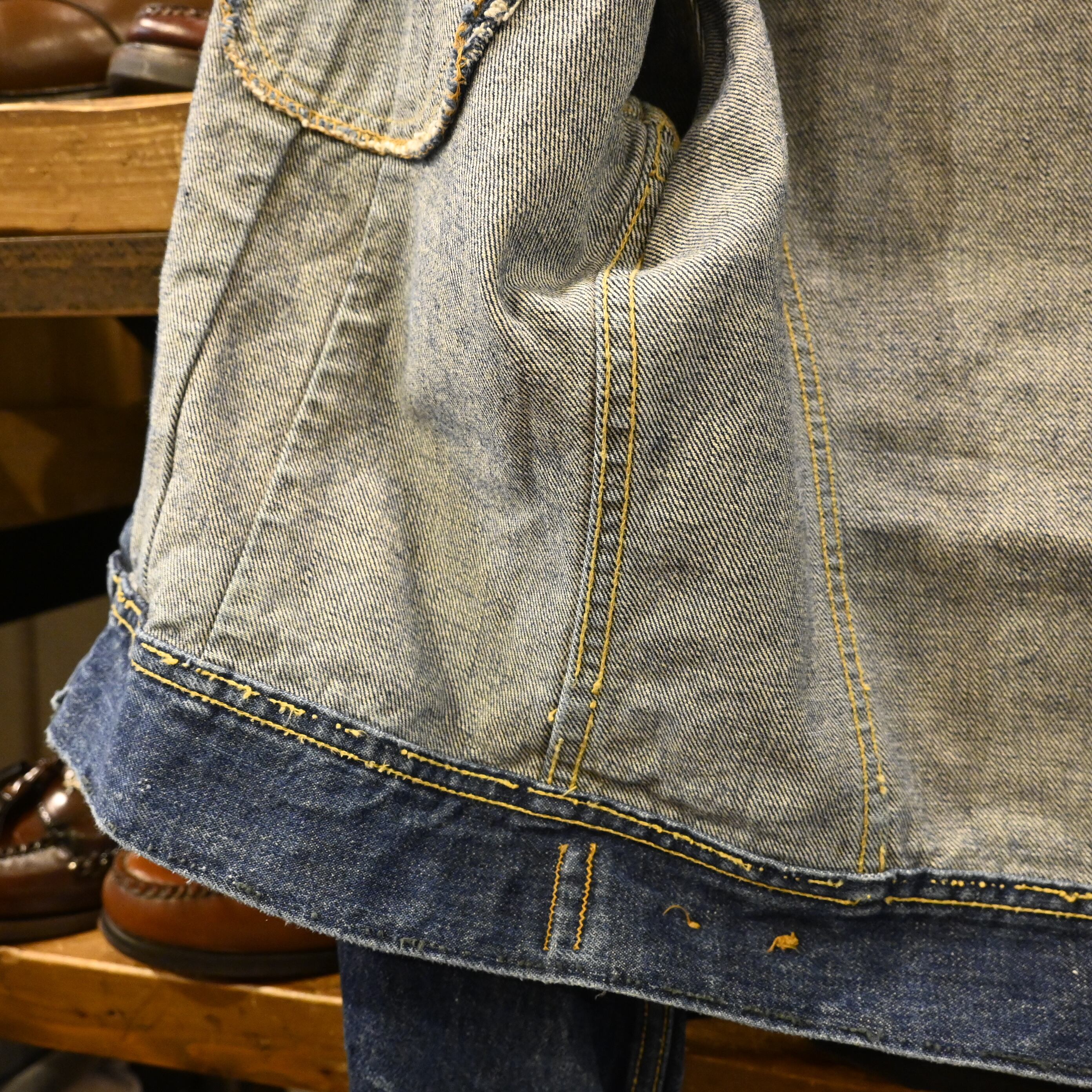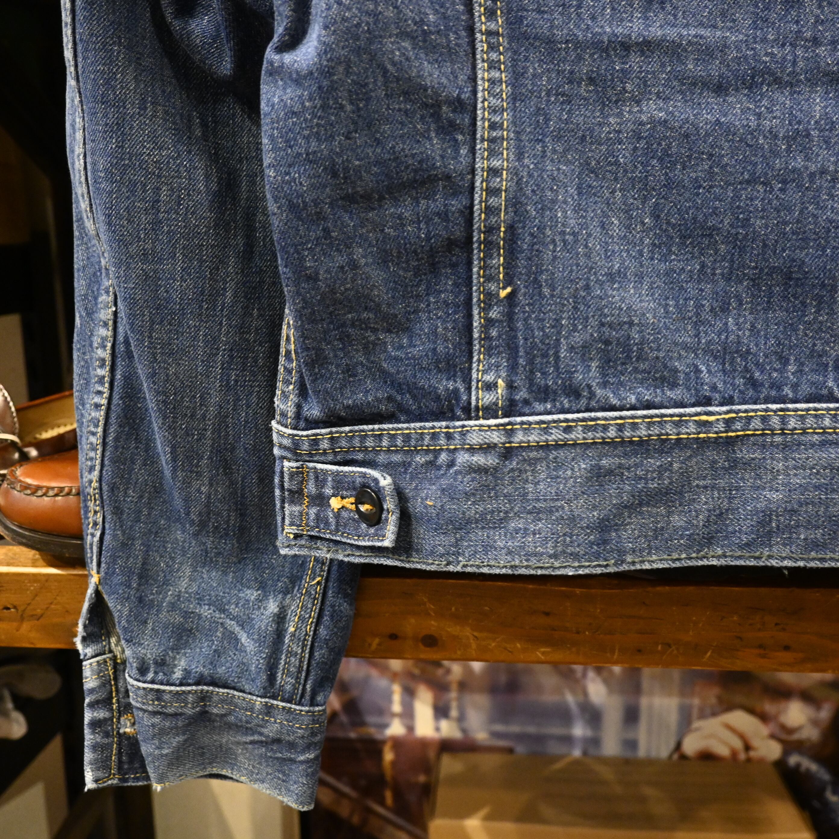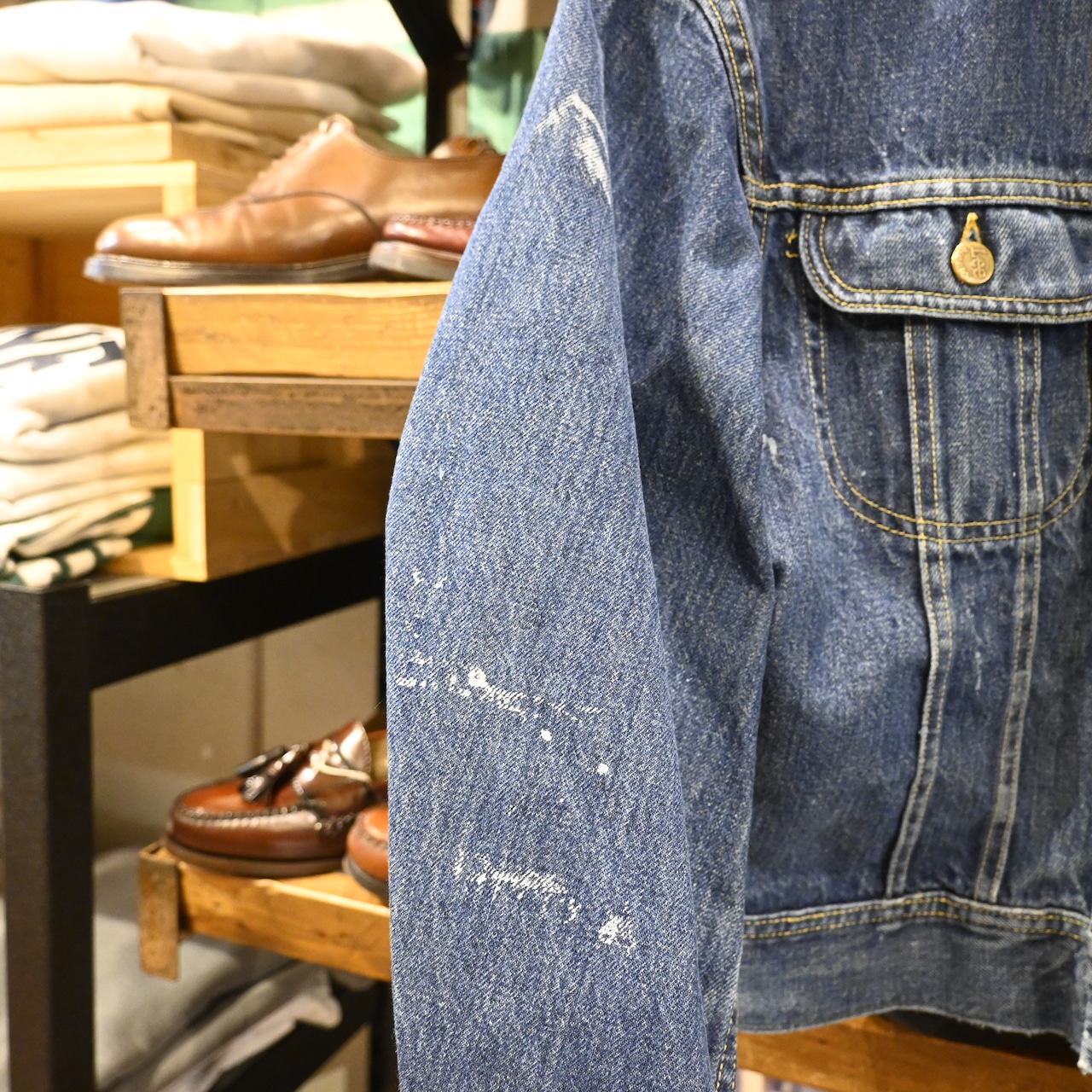 程よくフェードしたインディゴにペンキ跡が入り、リアルワークならではの表情がヴィンテージらしい雰囲気を高めています。