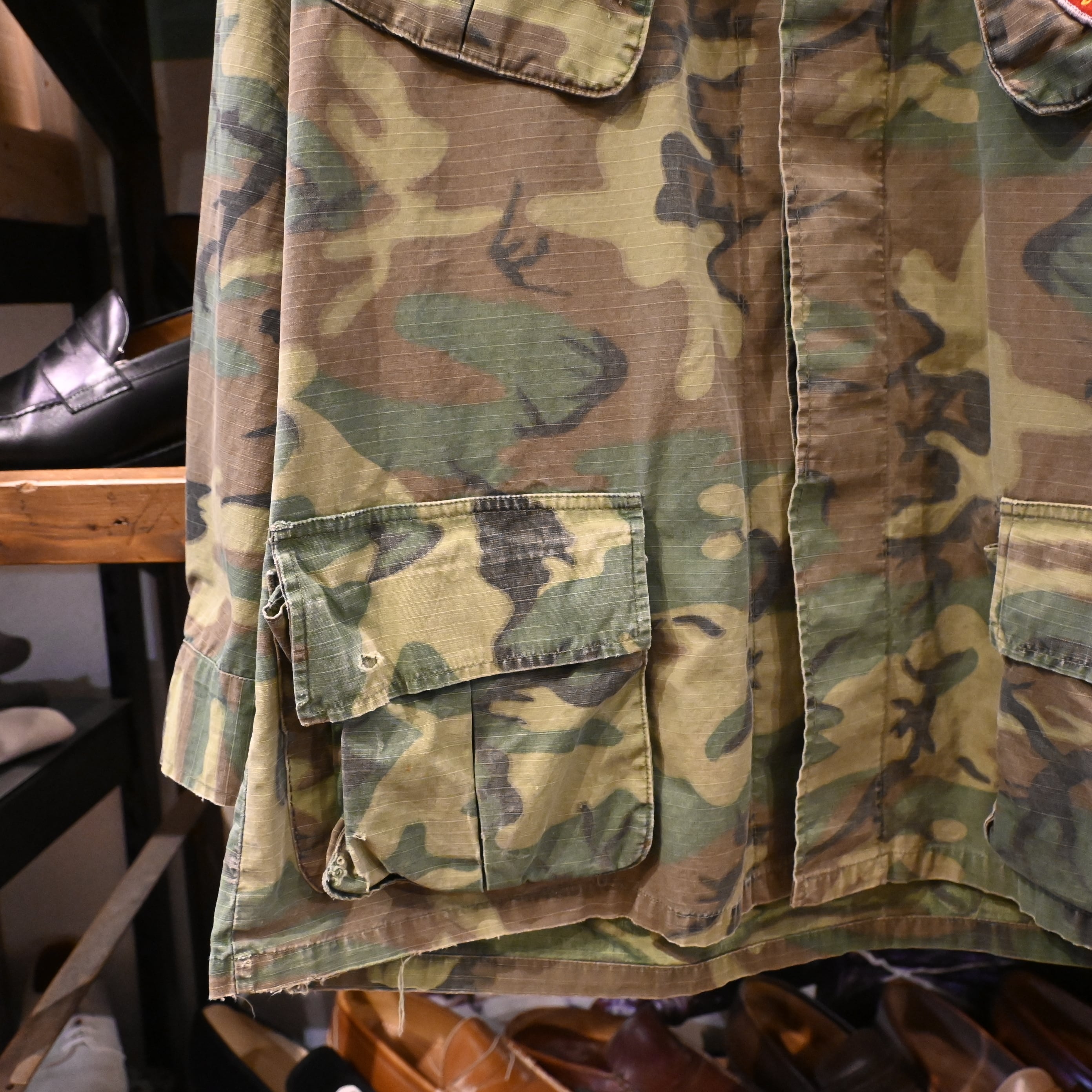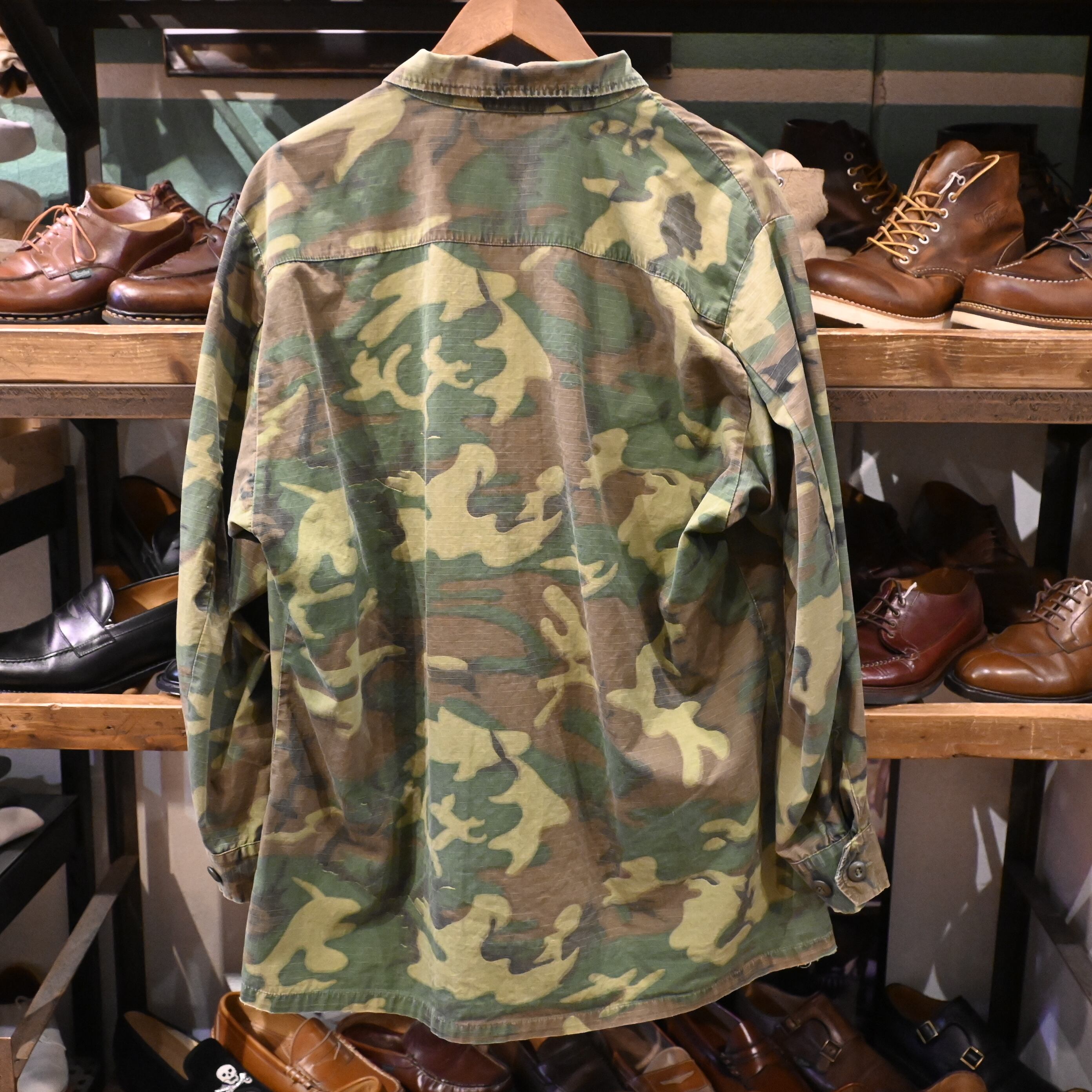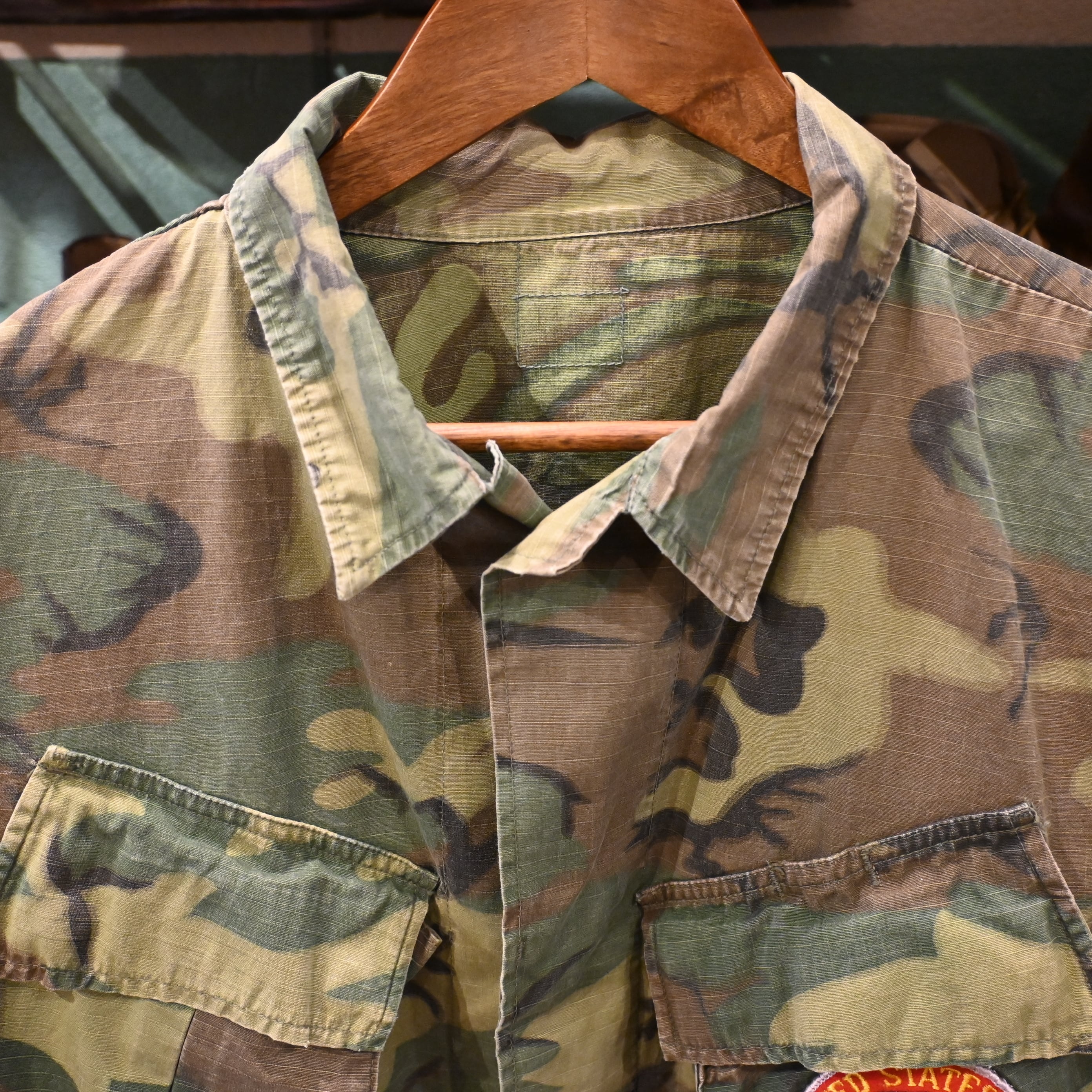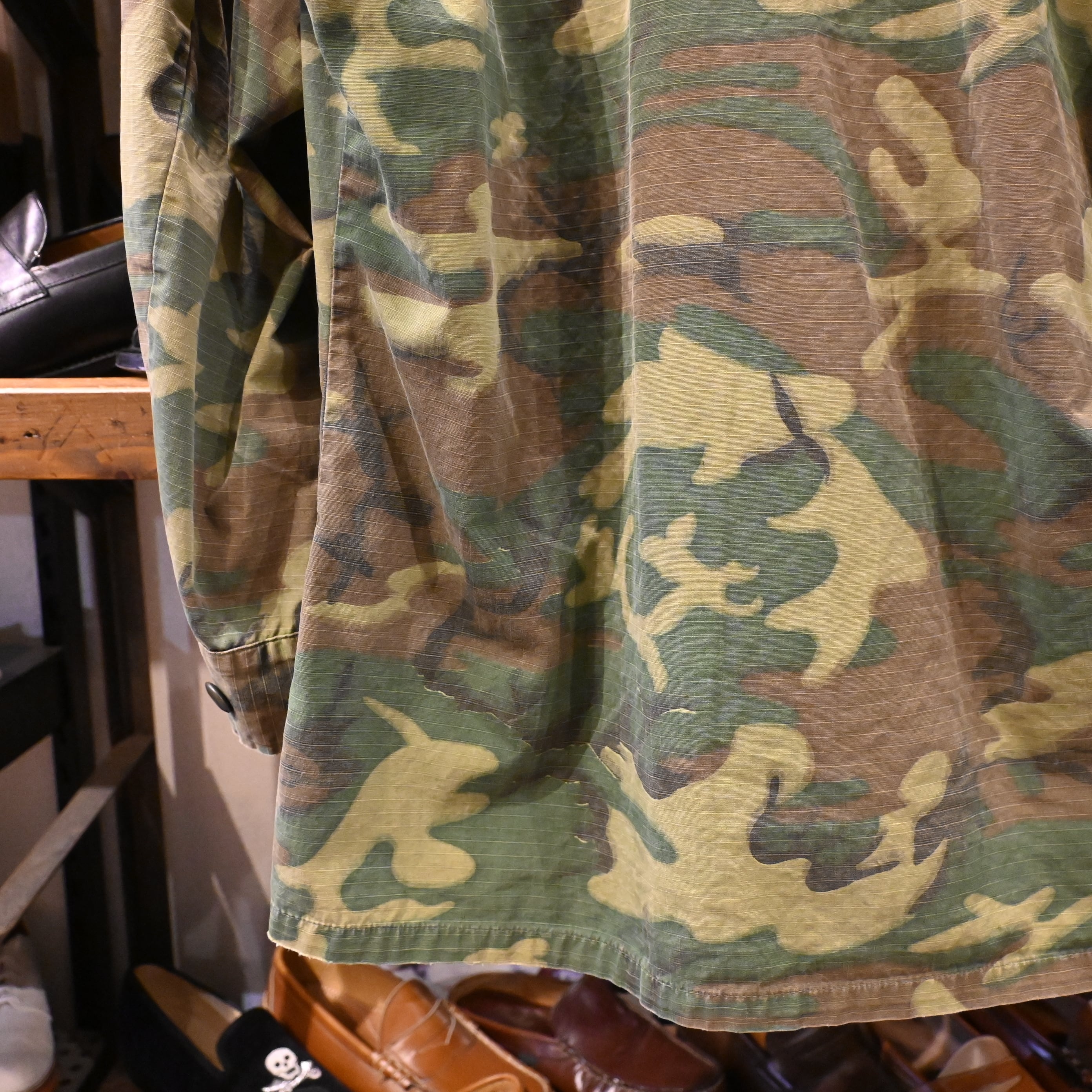こちらは60年代頃の個体で、薄手のコットンポプリン生地に、ERDLカモフラージュ(通称リーフパターン)が採用された一着です。