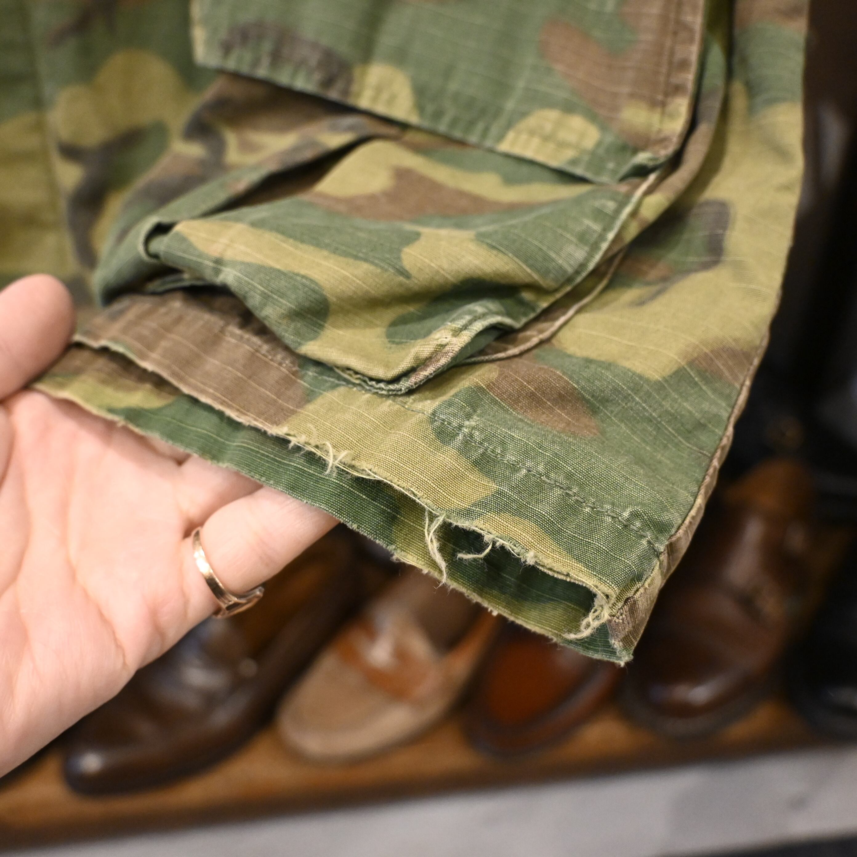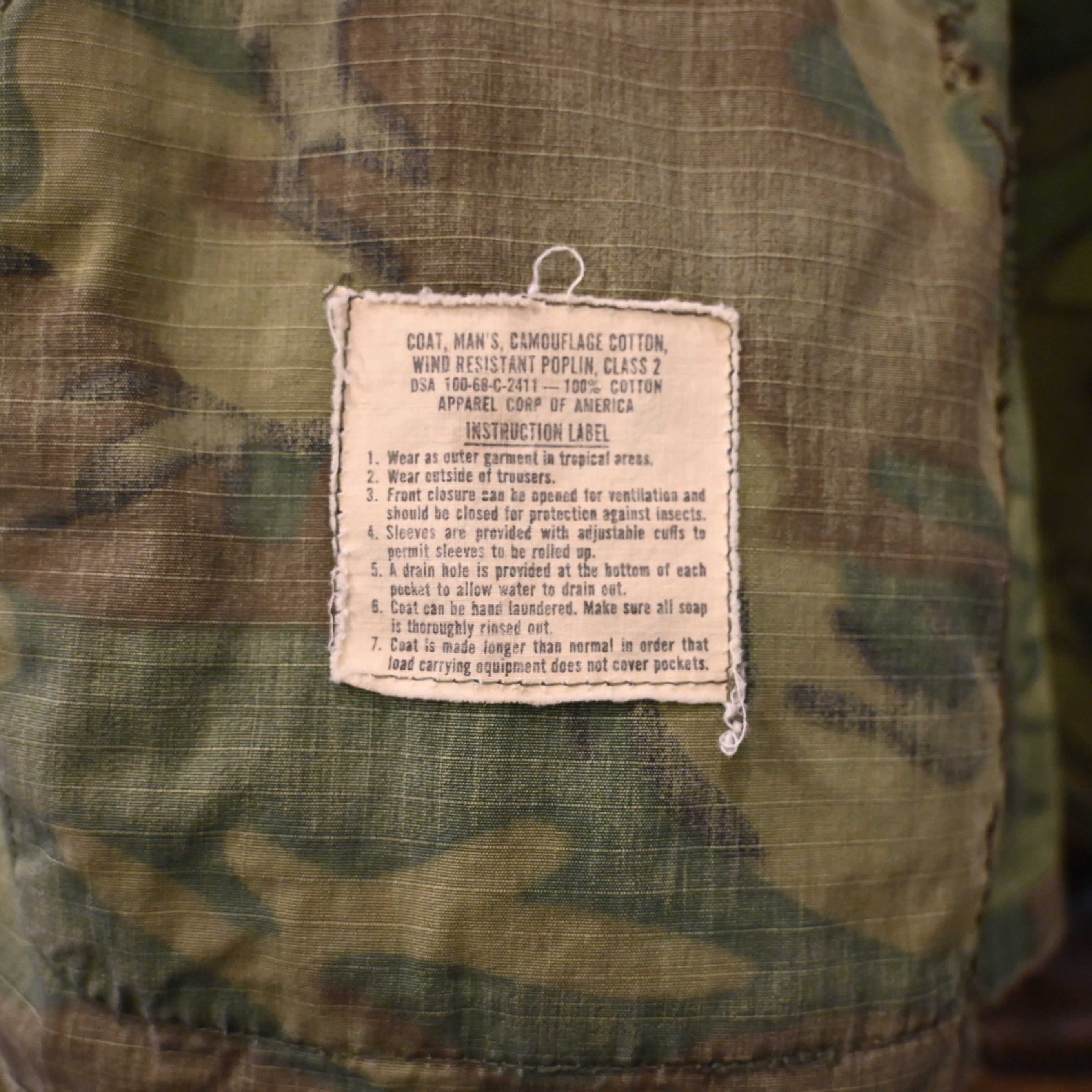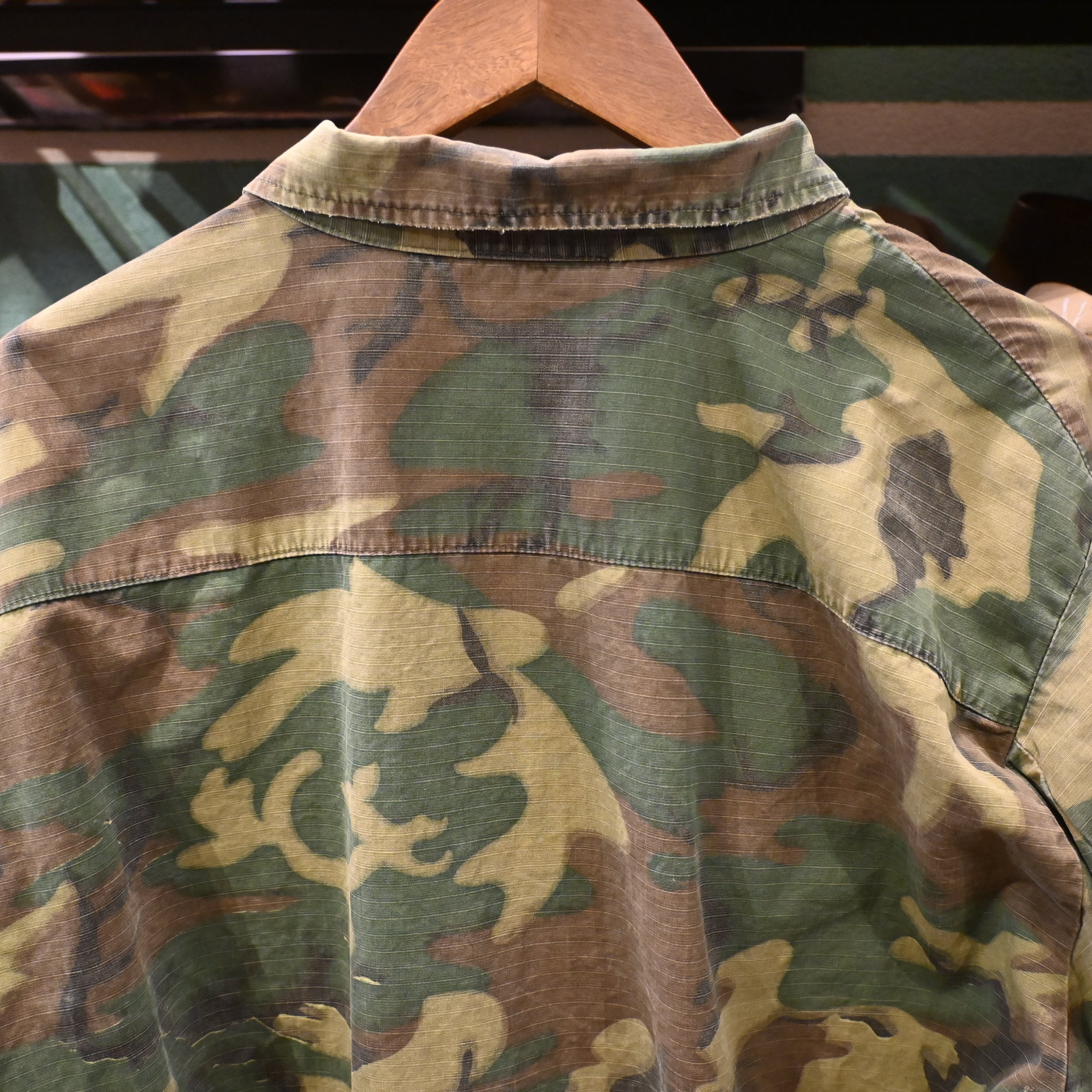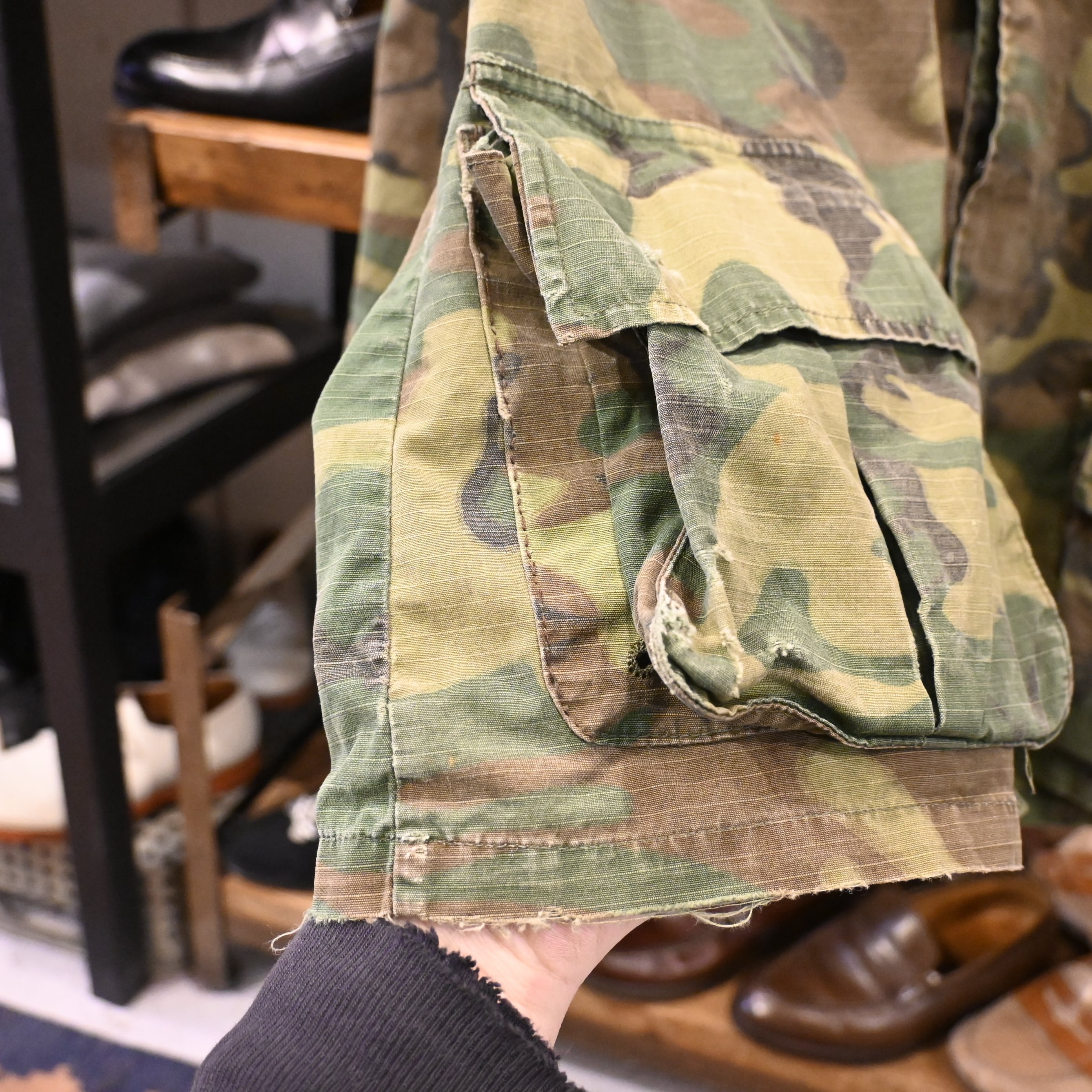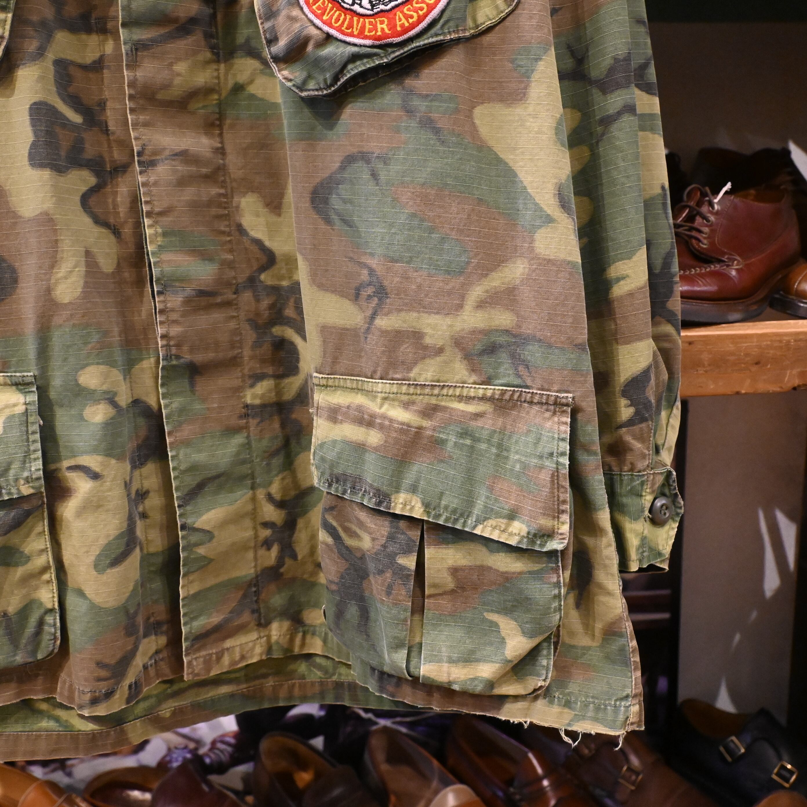 こちらは60年代頃の個体で、薄手のコットンポプリン生地に、ERDLカモフラージュ(通称リーフパターン)が採用された一着です。