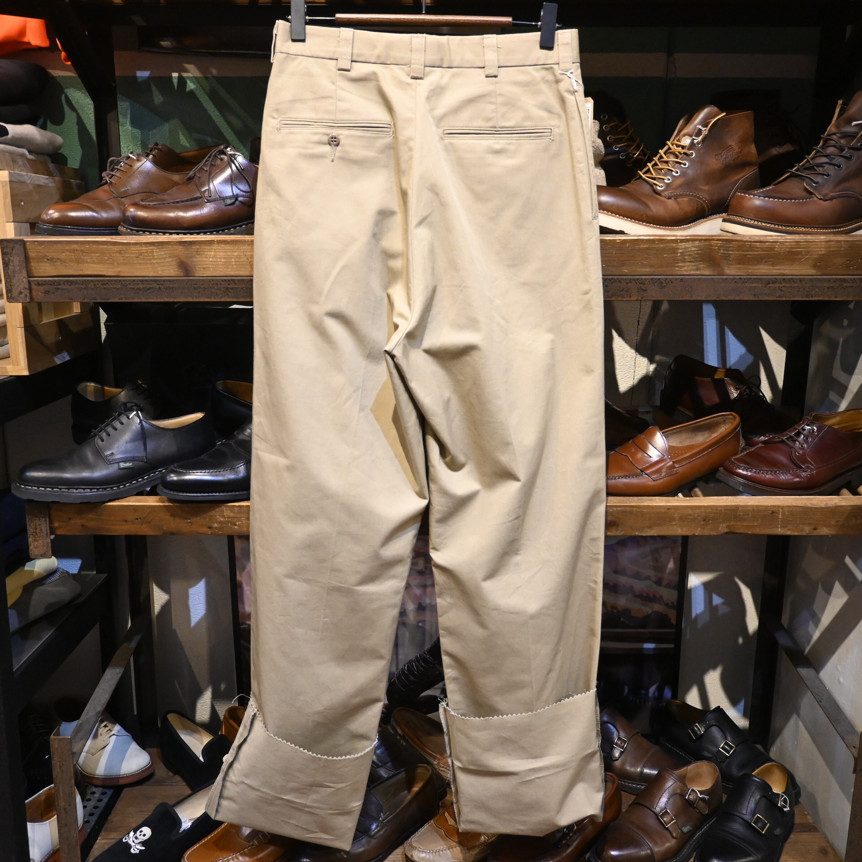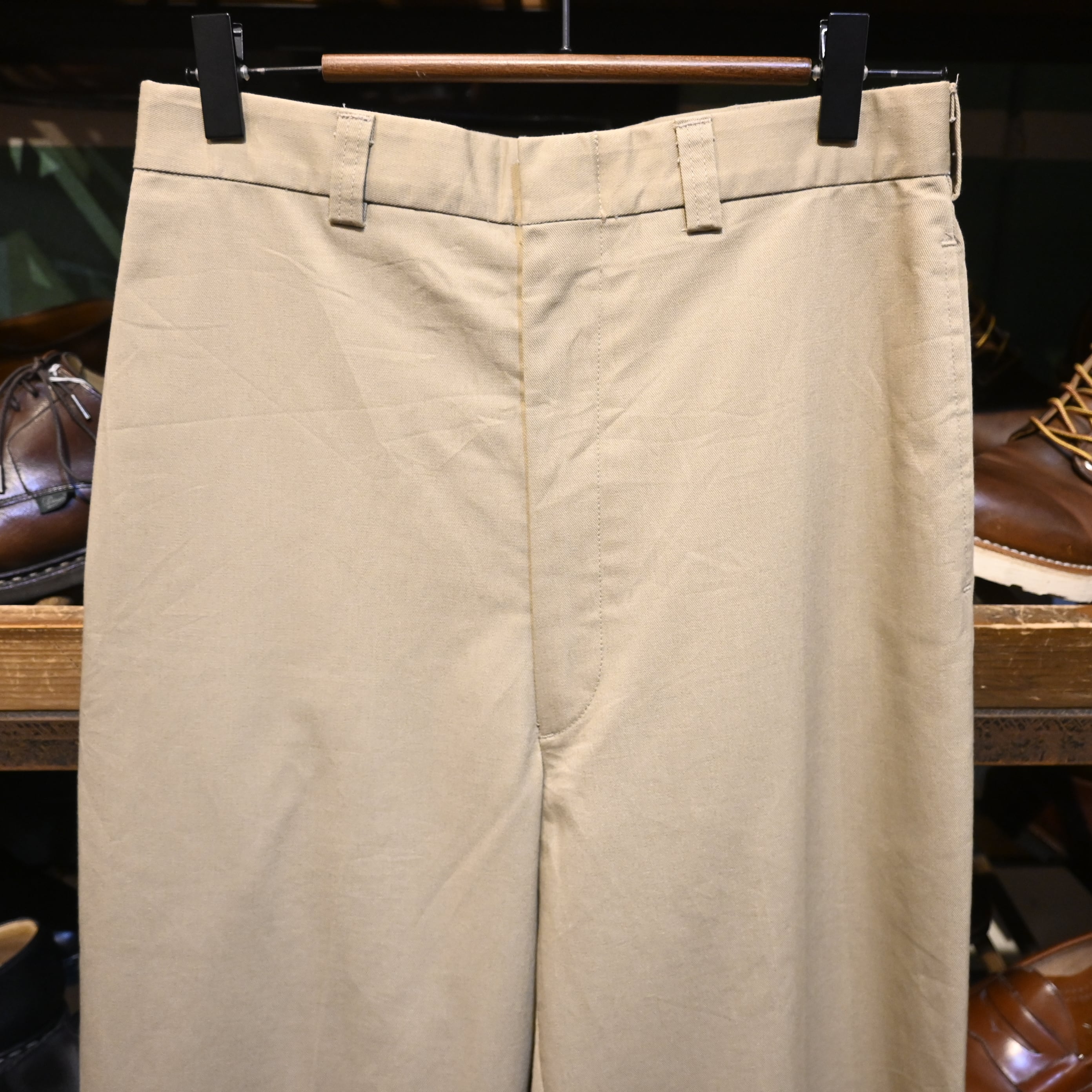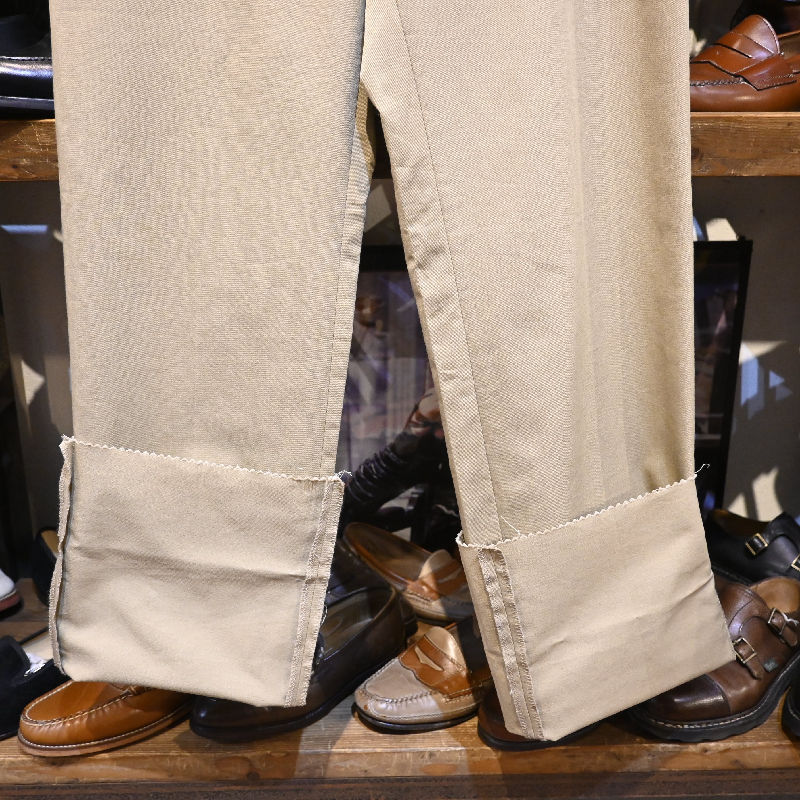 ミリタリーらしい無駄のないストレートシルエットに、ややワイドなバランス。裾は当時の仕様と思われる幅広の折り返し仕上げで、ラフさと存在感を兼ね備えたディテールが魅力です。