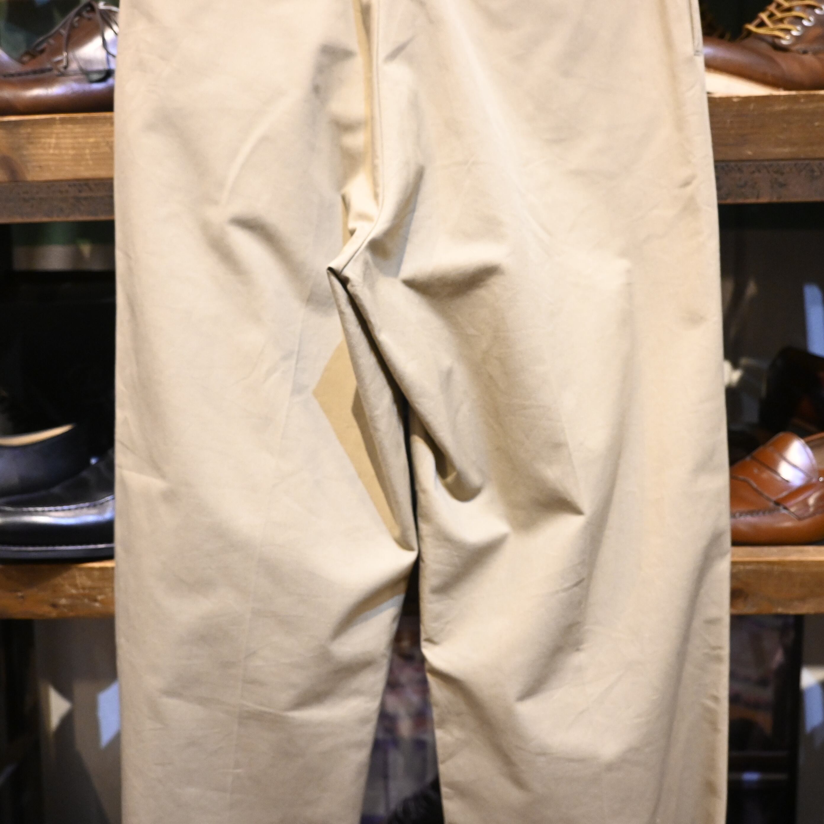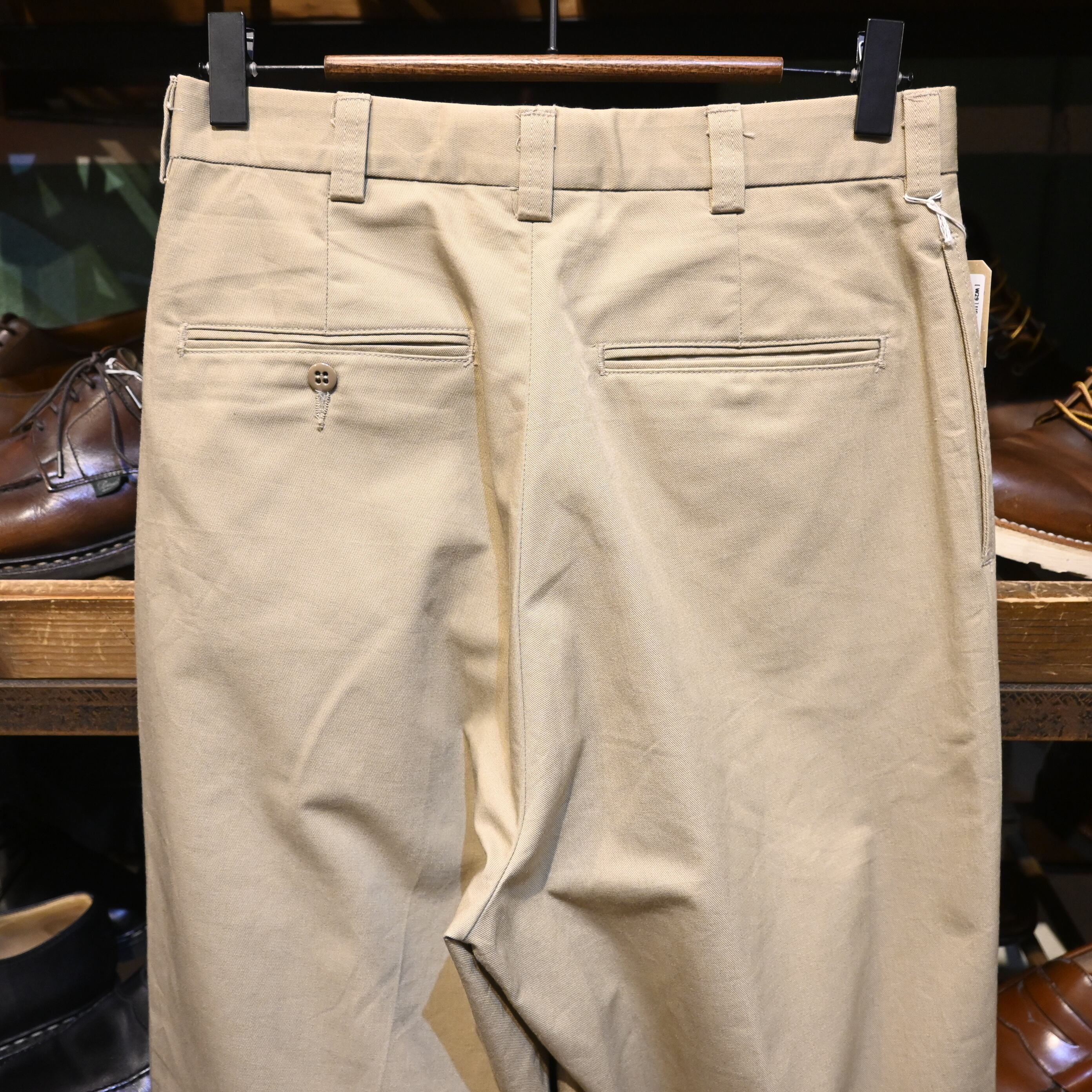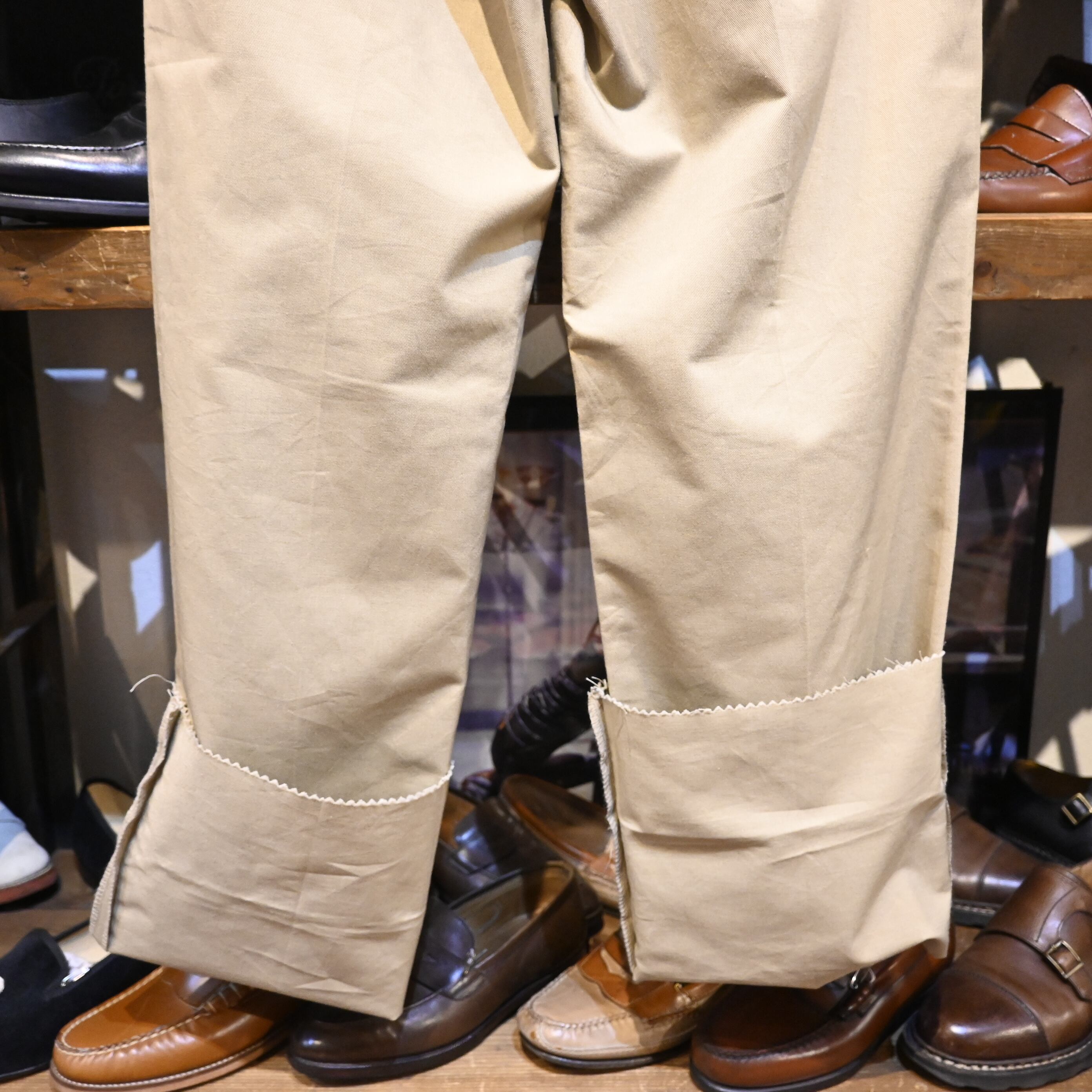 ミリタリーらしい無駄のないストレートシルエットに、ややワイドなバランス。裾は当時の仕様と思われる幅広の折り返し仕上げで、ラフさと存在感を兼ね備えたディテールが魅力です。
