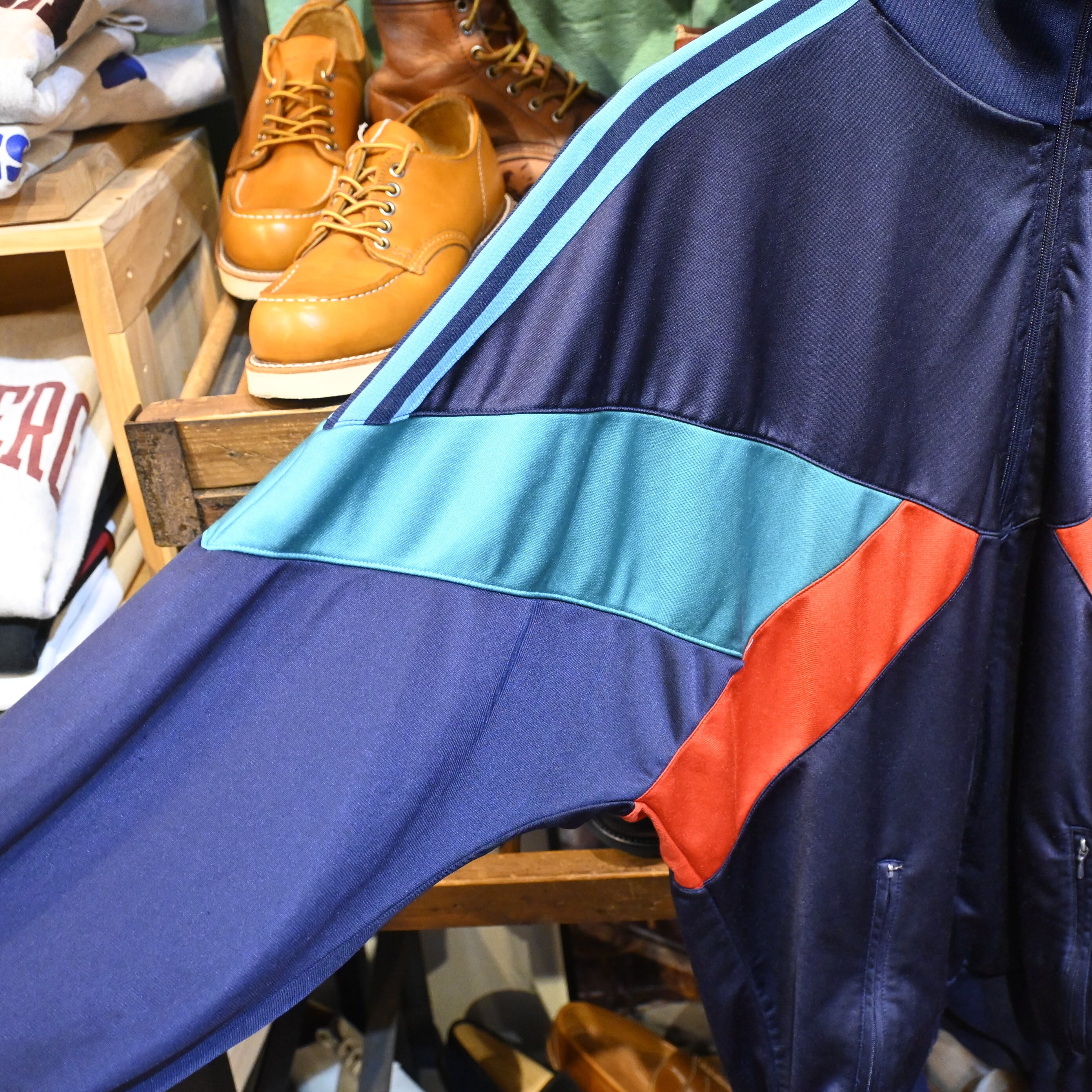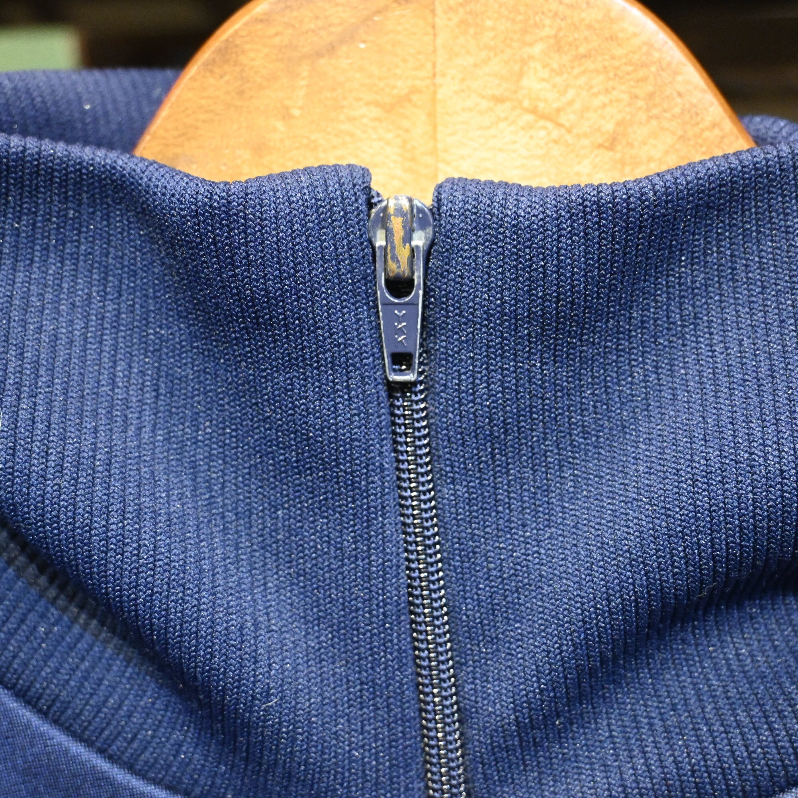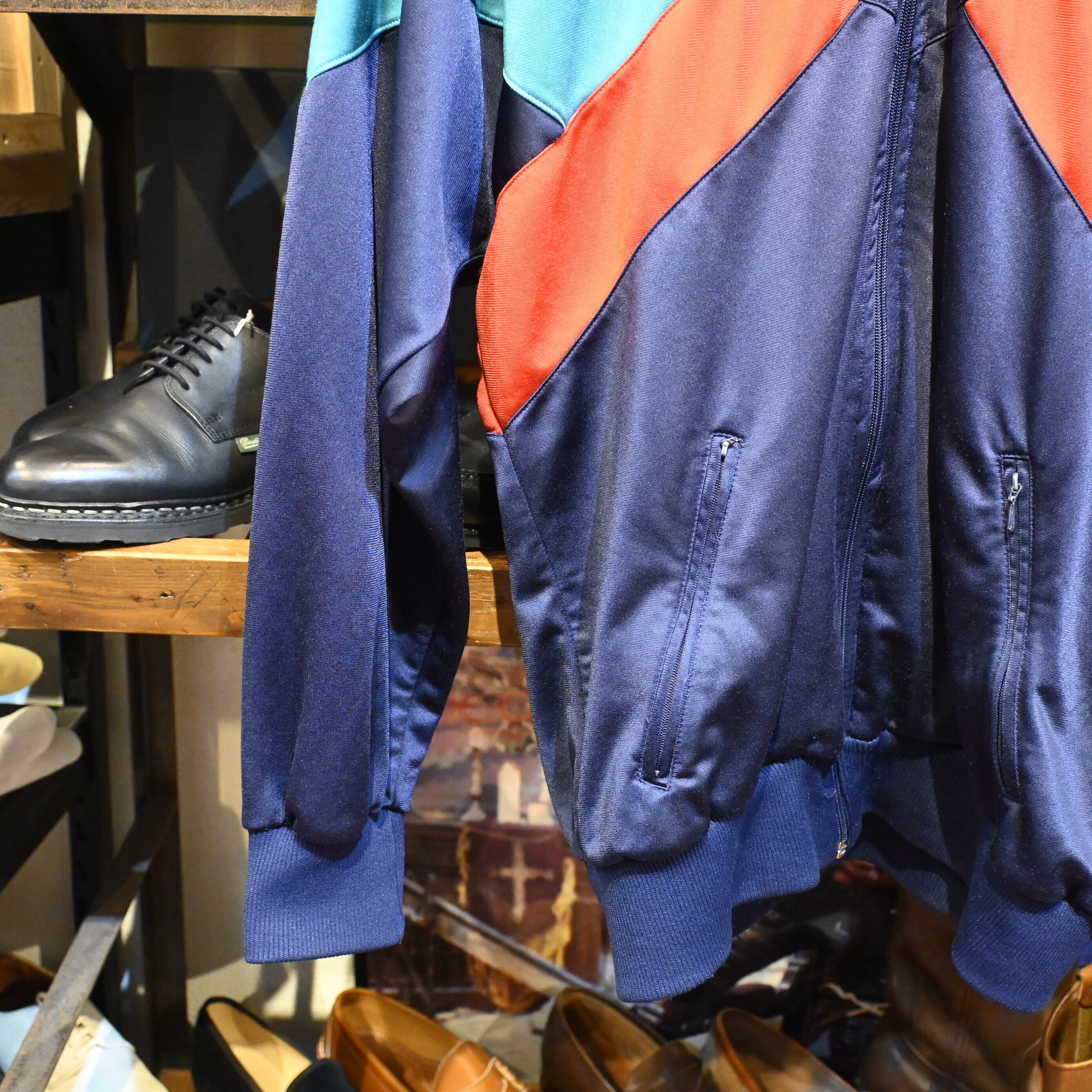 ネイビーベースにターコイズブルーとレッドを組み合わせた大胆な切替デザインが特徴的な一着。当時のトレーニングウェアらしいスポーティーな配色と立体的なパネル構造が、現行モデルにはないヴィンテージ特有の雰囲気を演出しています。