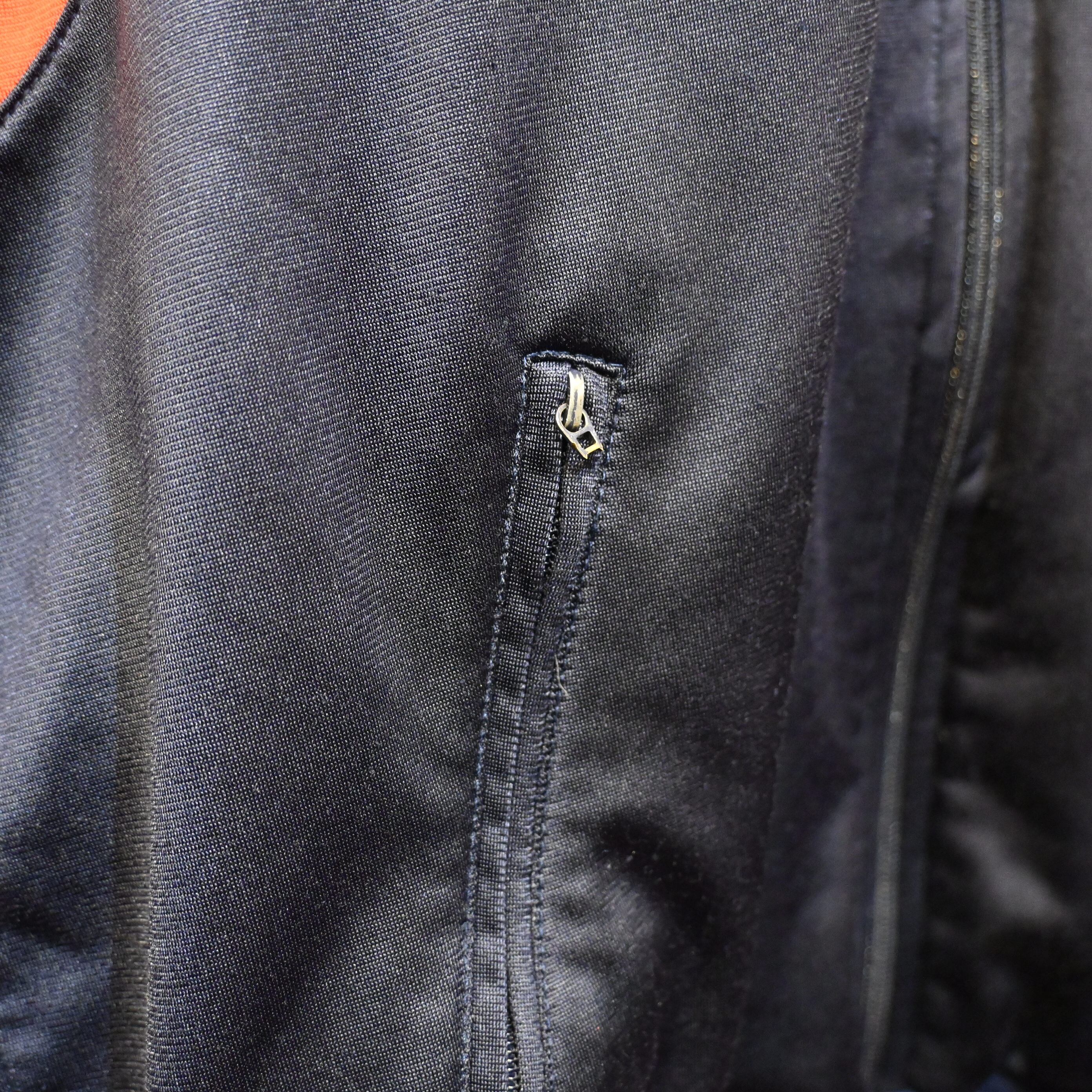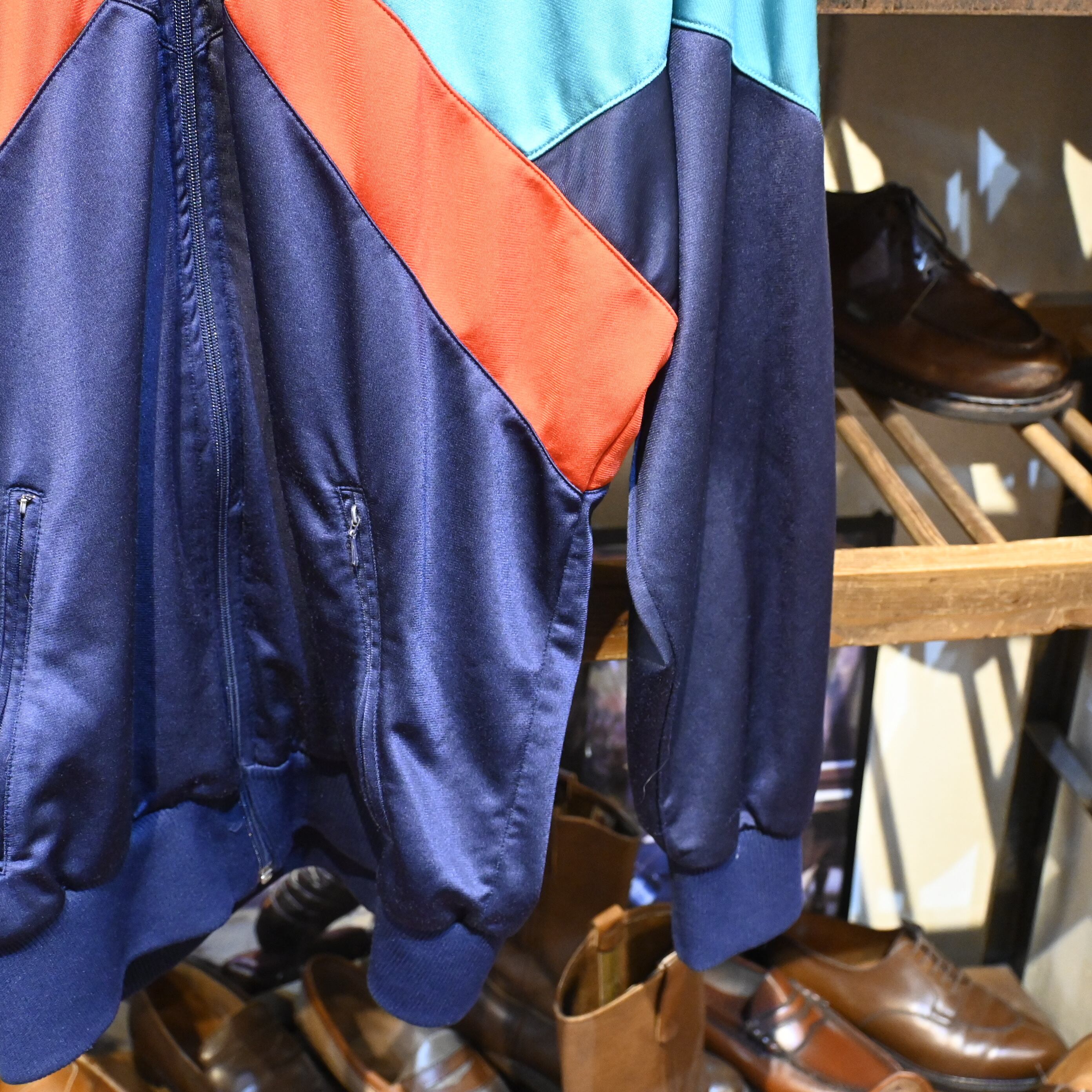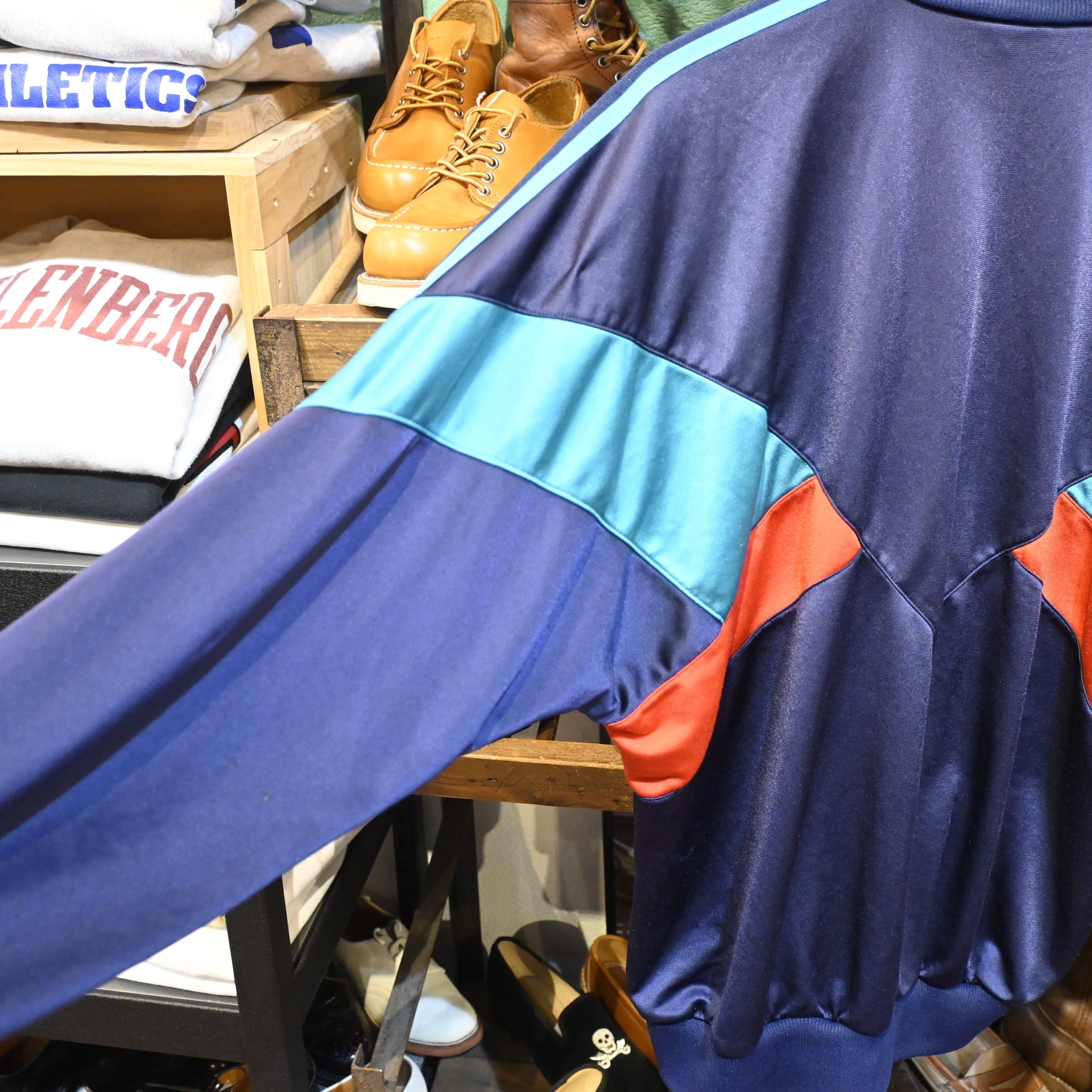 ネイビーベースにターコイズブルーとレッドを組み合わせた大胆な切替デザインが特徴的な一着。当時のトレーニングウェアらしいスポーティーな配色と立体的なパネル構造が、現行モデルにはないヴィンテージ特有の雰囲気を演出しています。