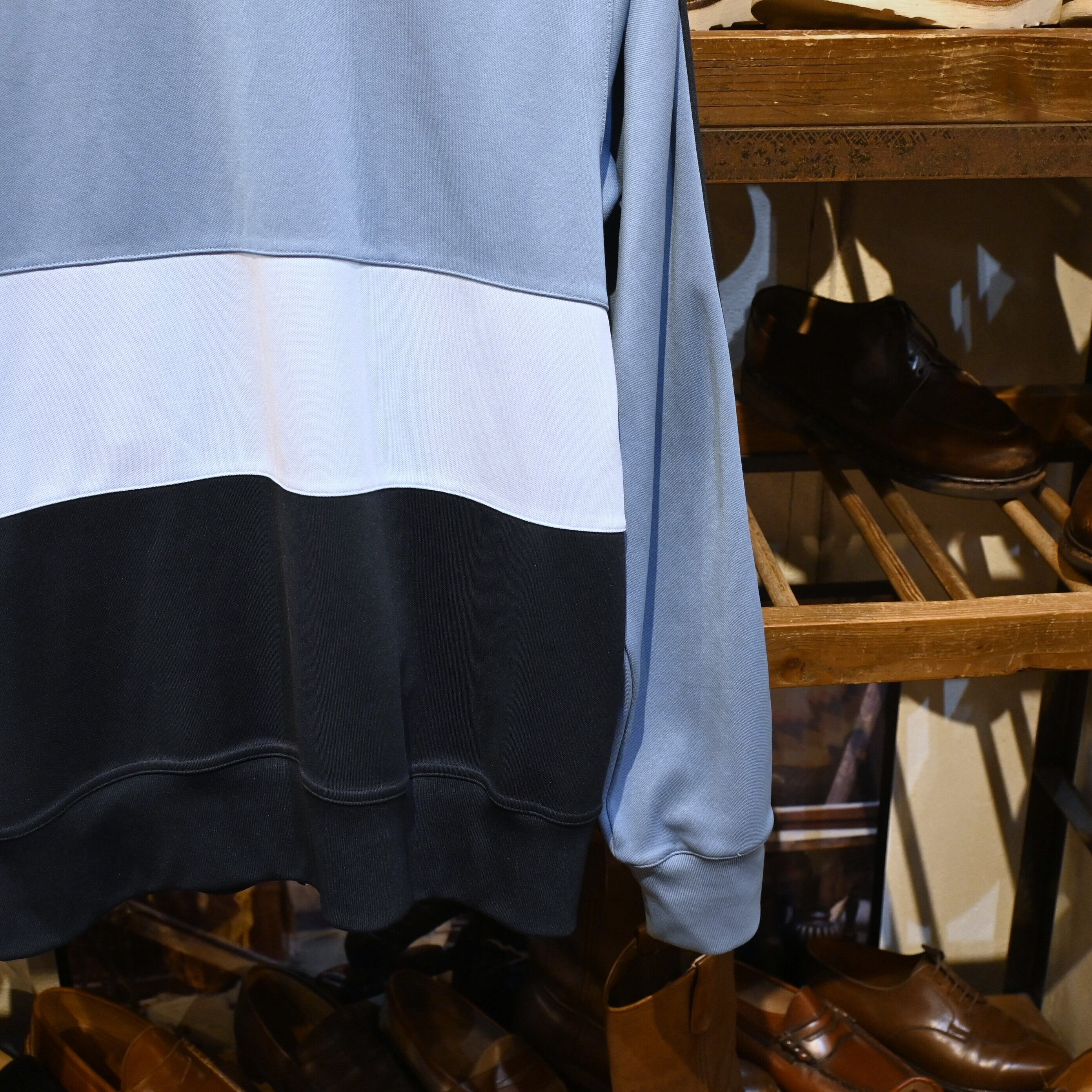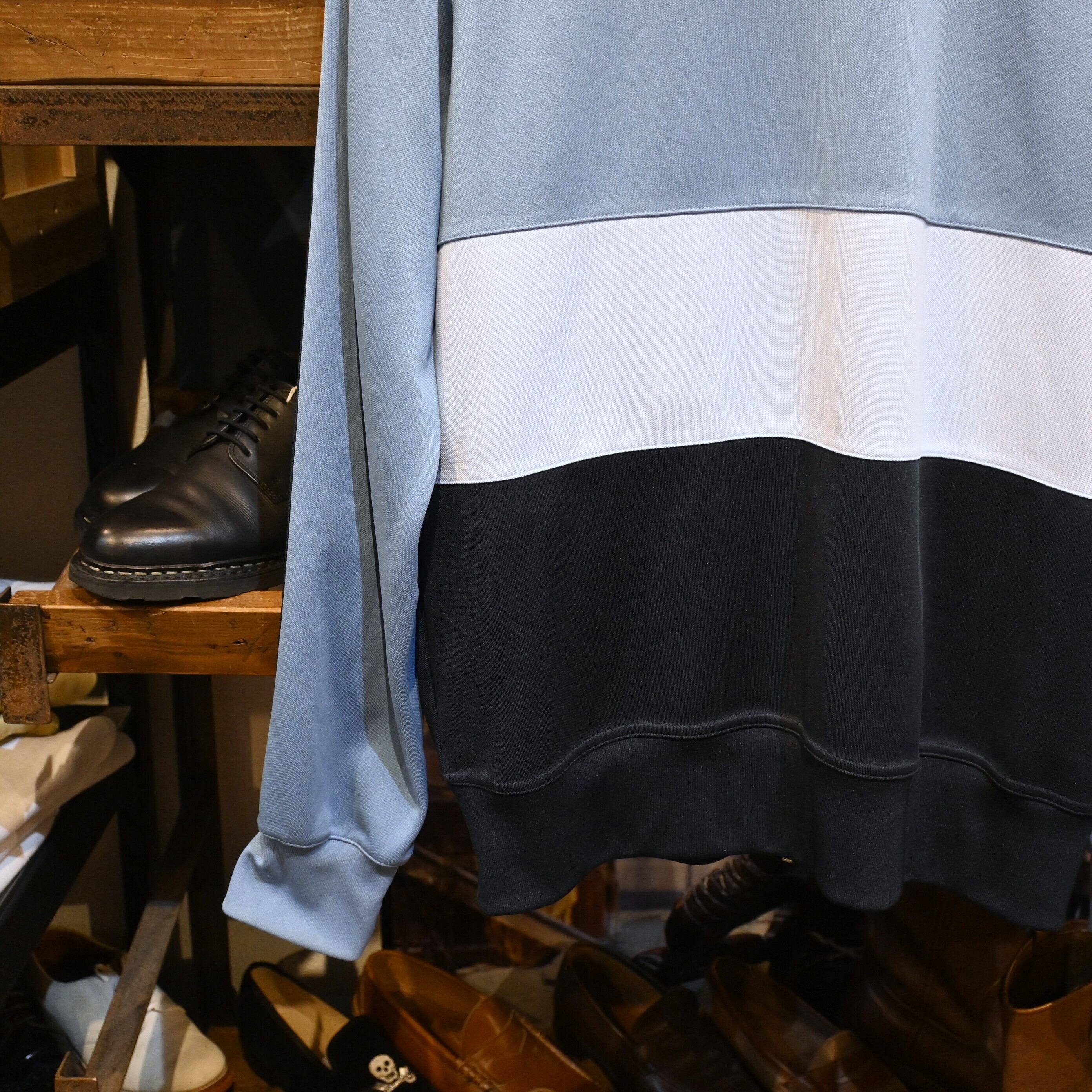 ブルーサックスを基調に、ネイビーのボトム配色を組み合わせた3トーンデザイン。