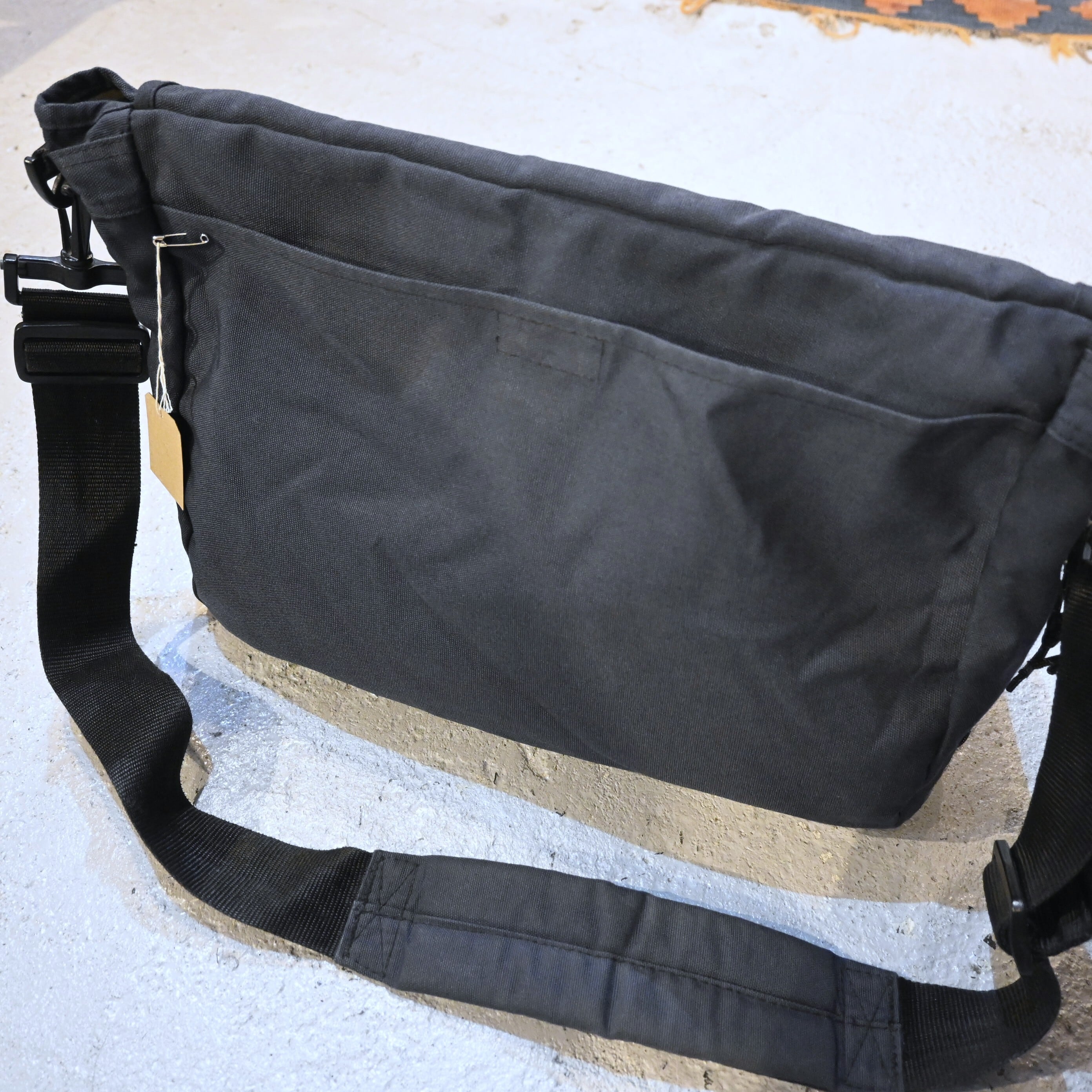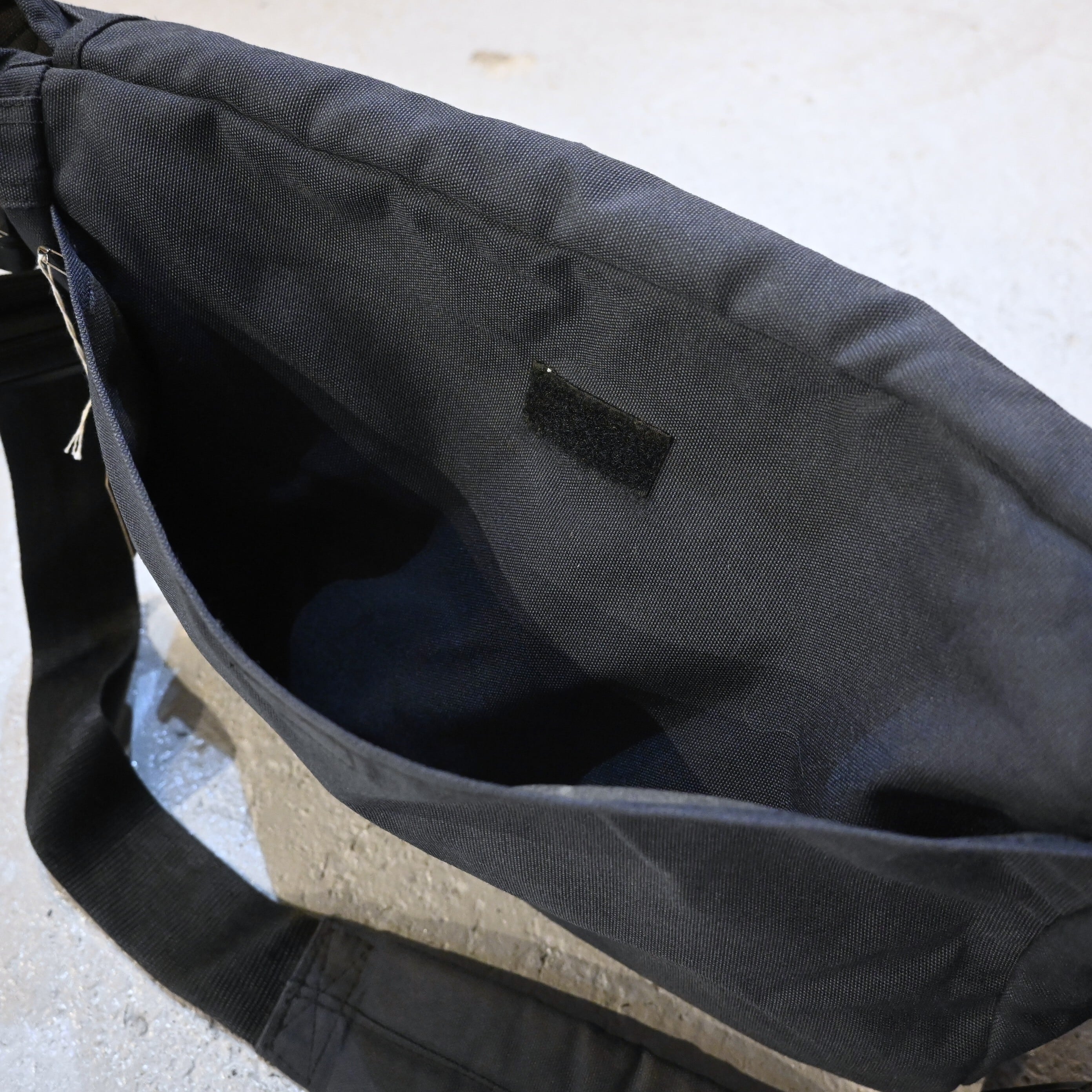 ブラックのナイロンボディにブランドロゴパッチが付いた、シンプルで使い勝手の良いメッセンジャータイプのショルダーバッグです。