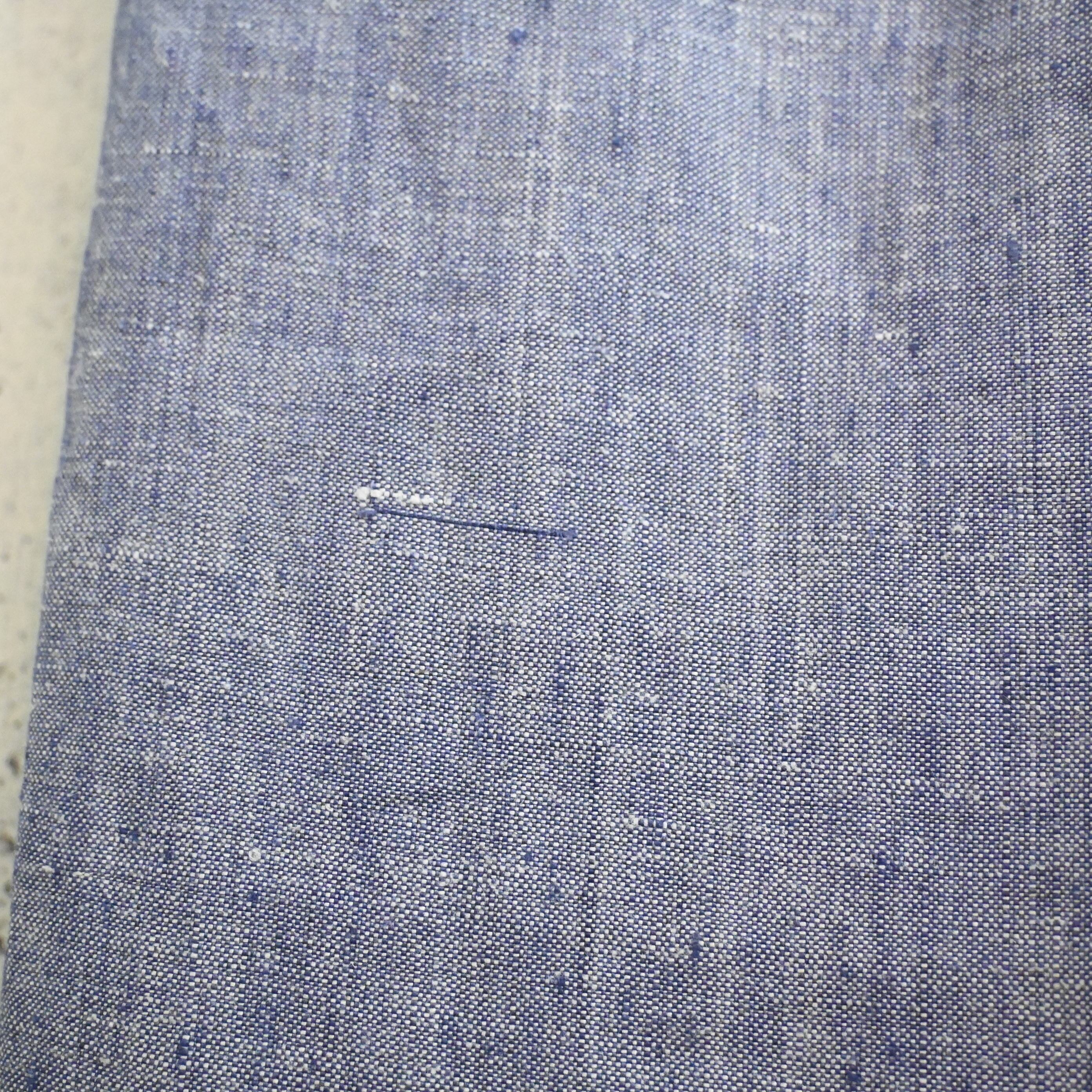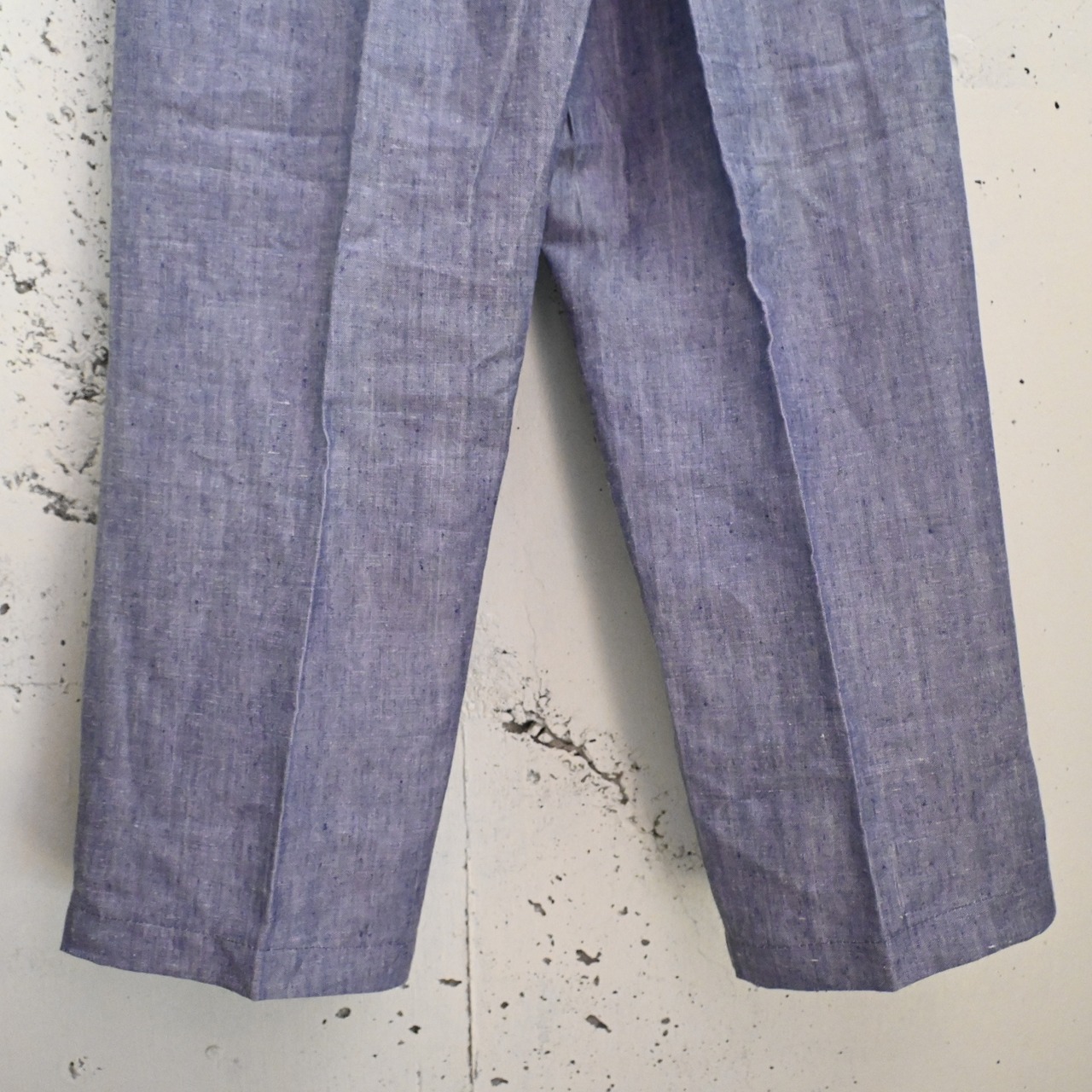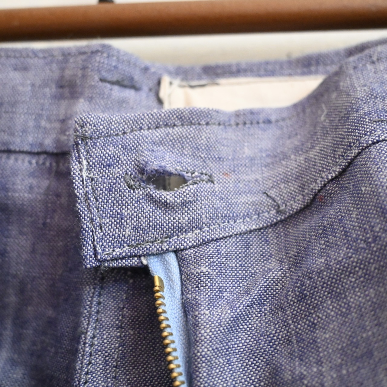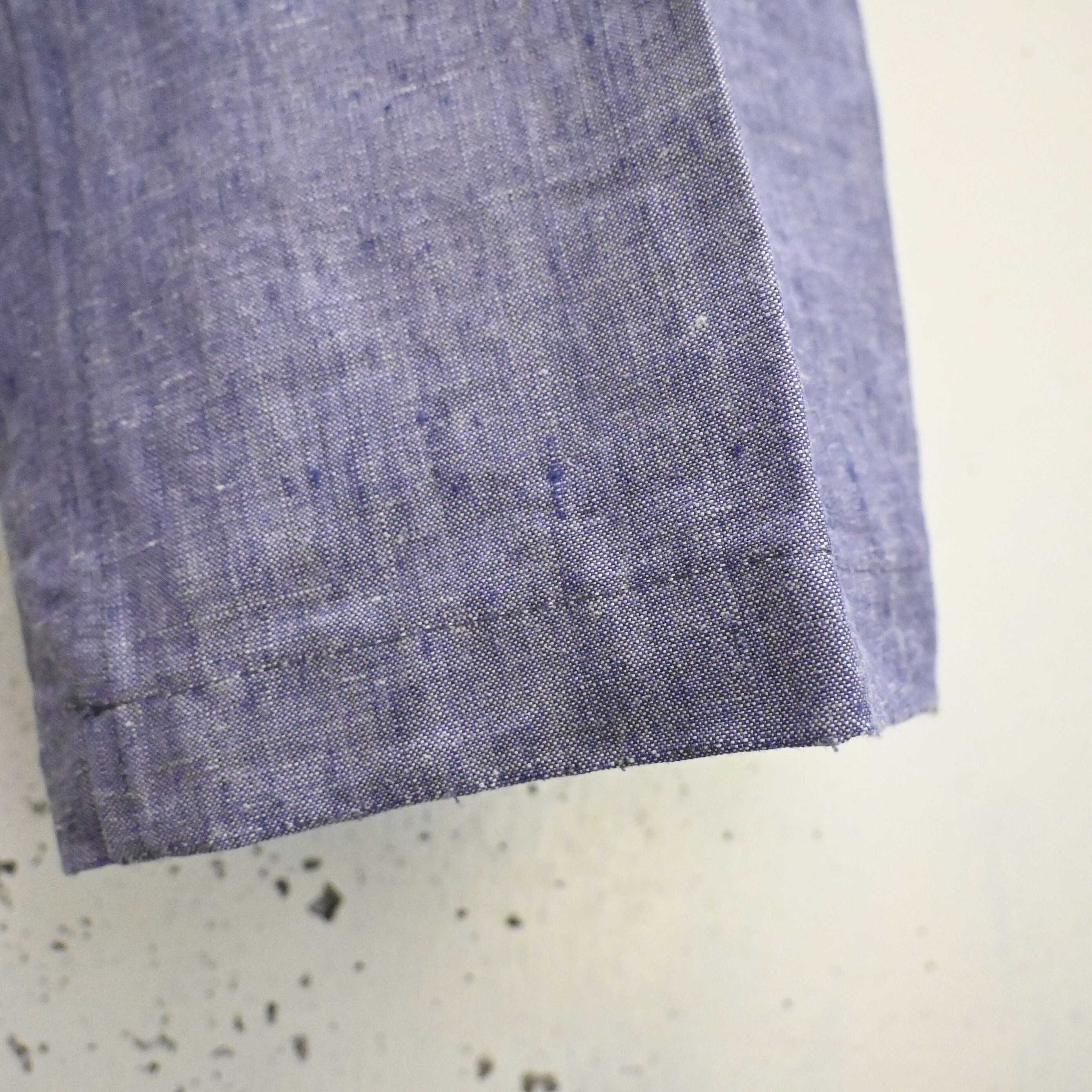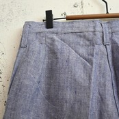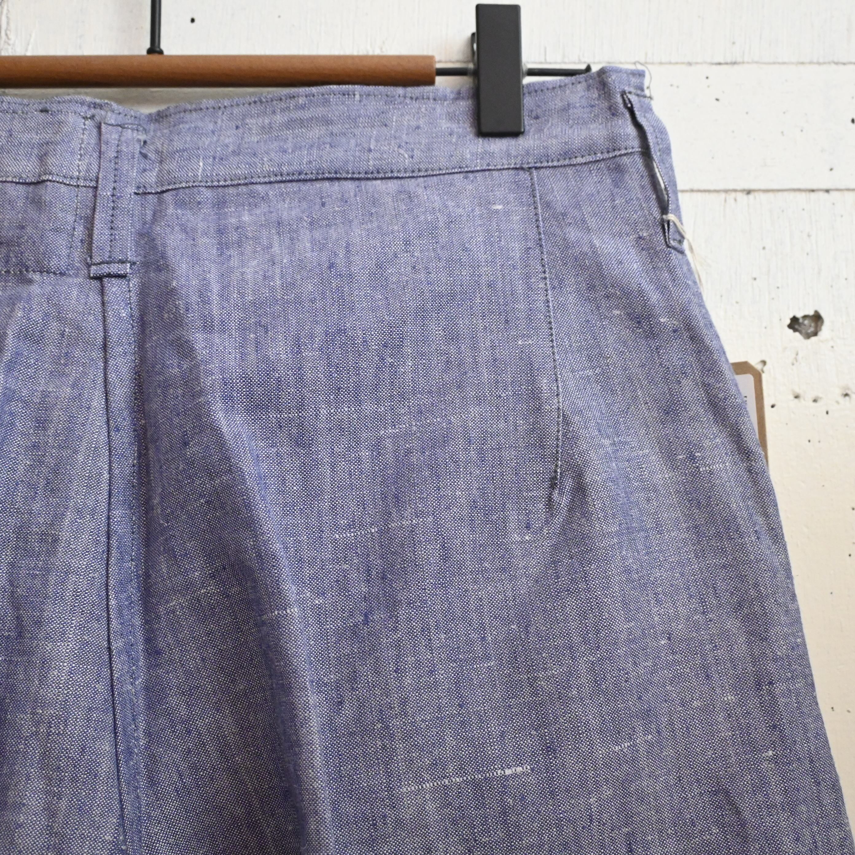 ヴィンテージらしいライトブルーのリネン生地は、ネップ感のある独特の表情があり、経年による風合いも魅力となっています。