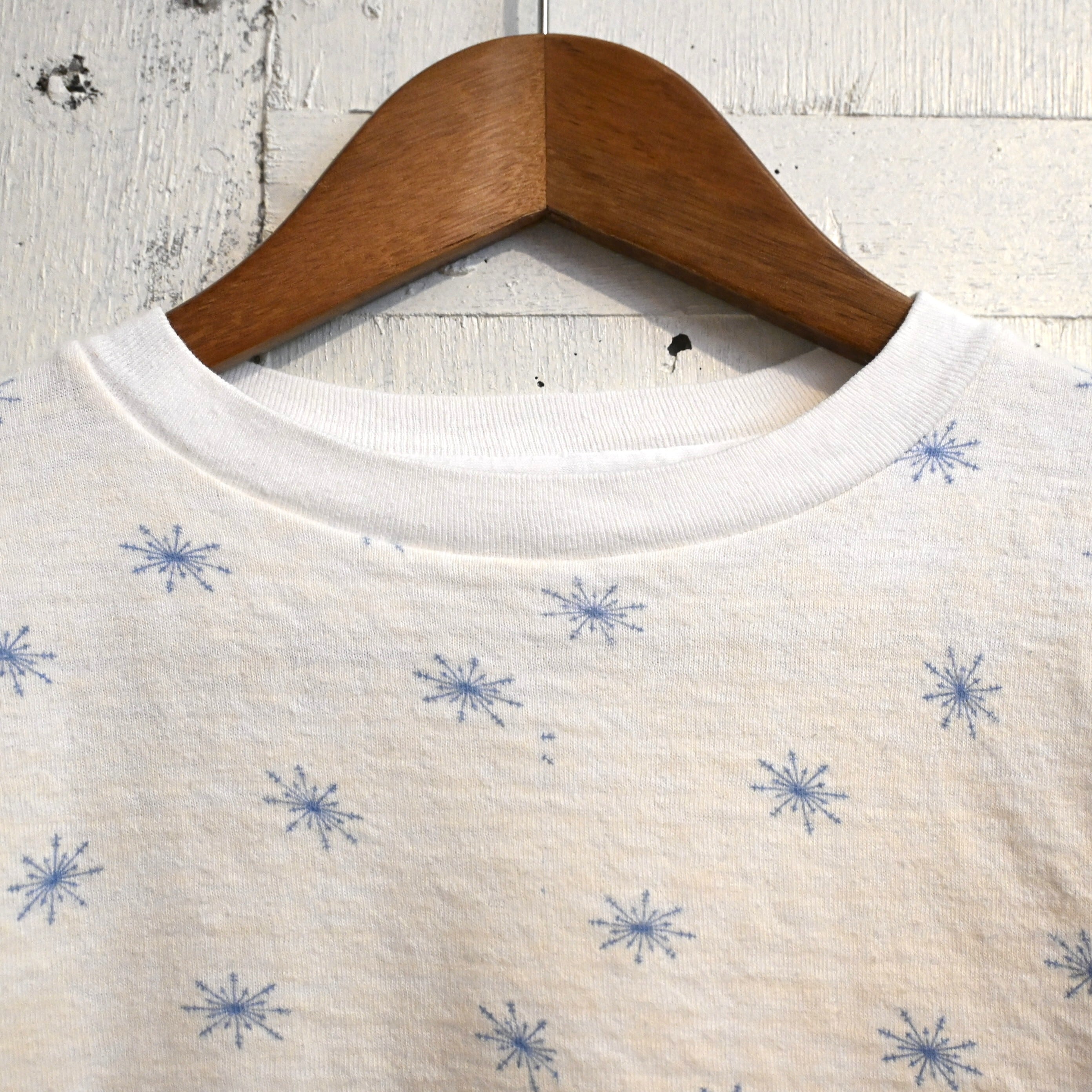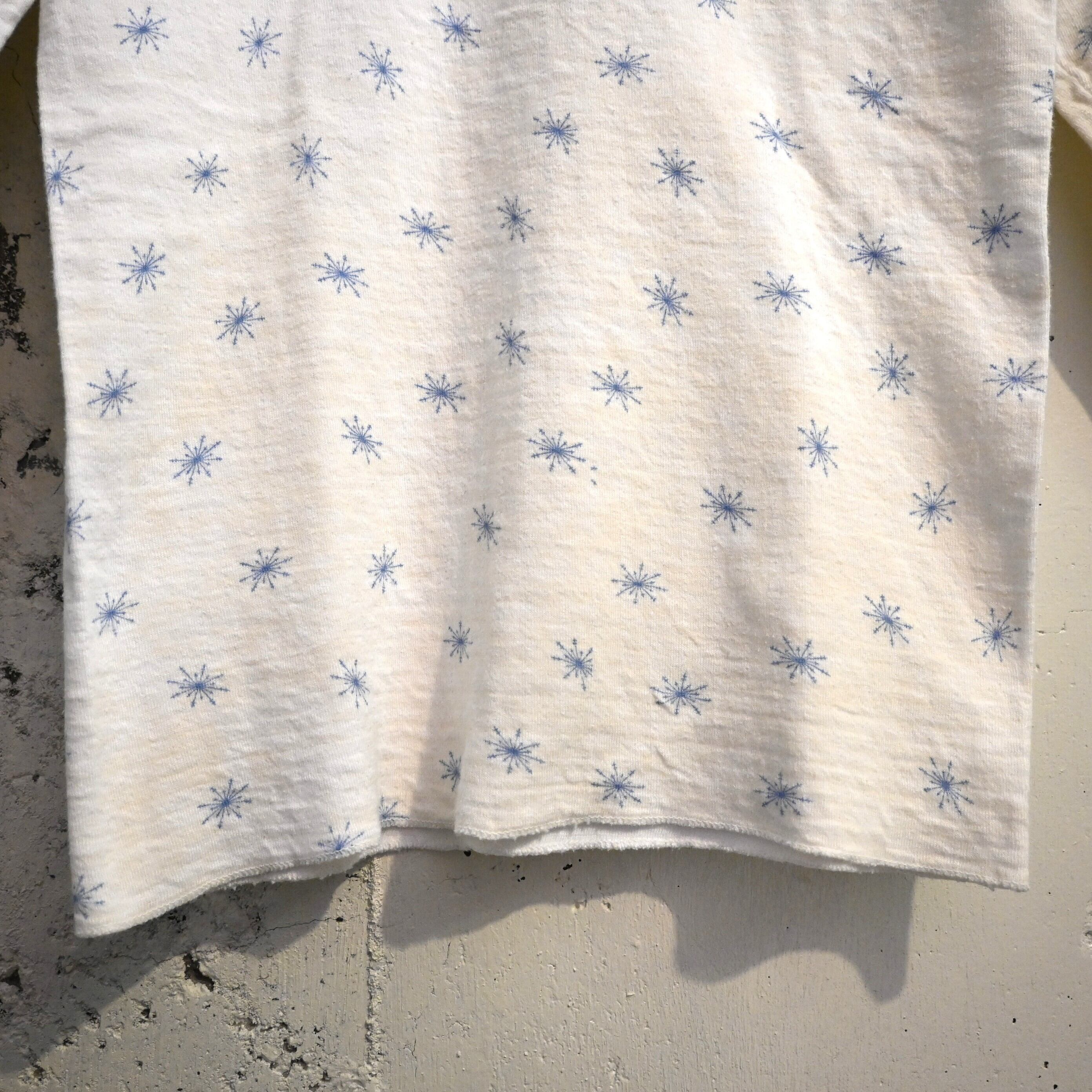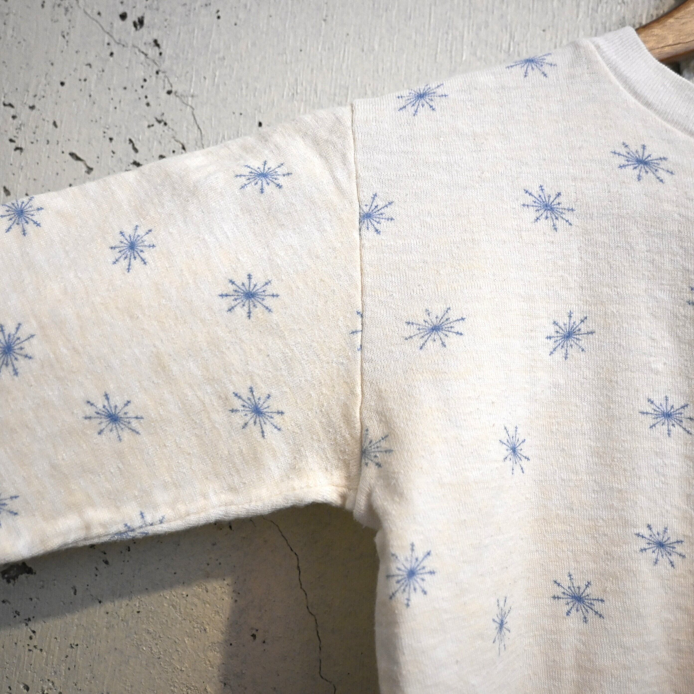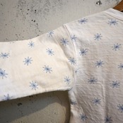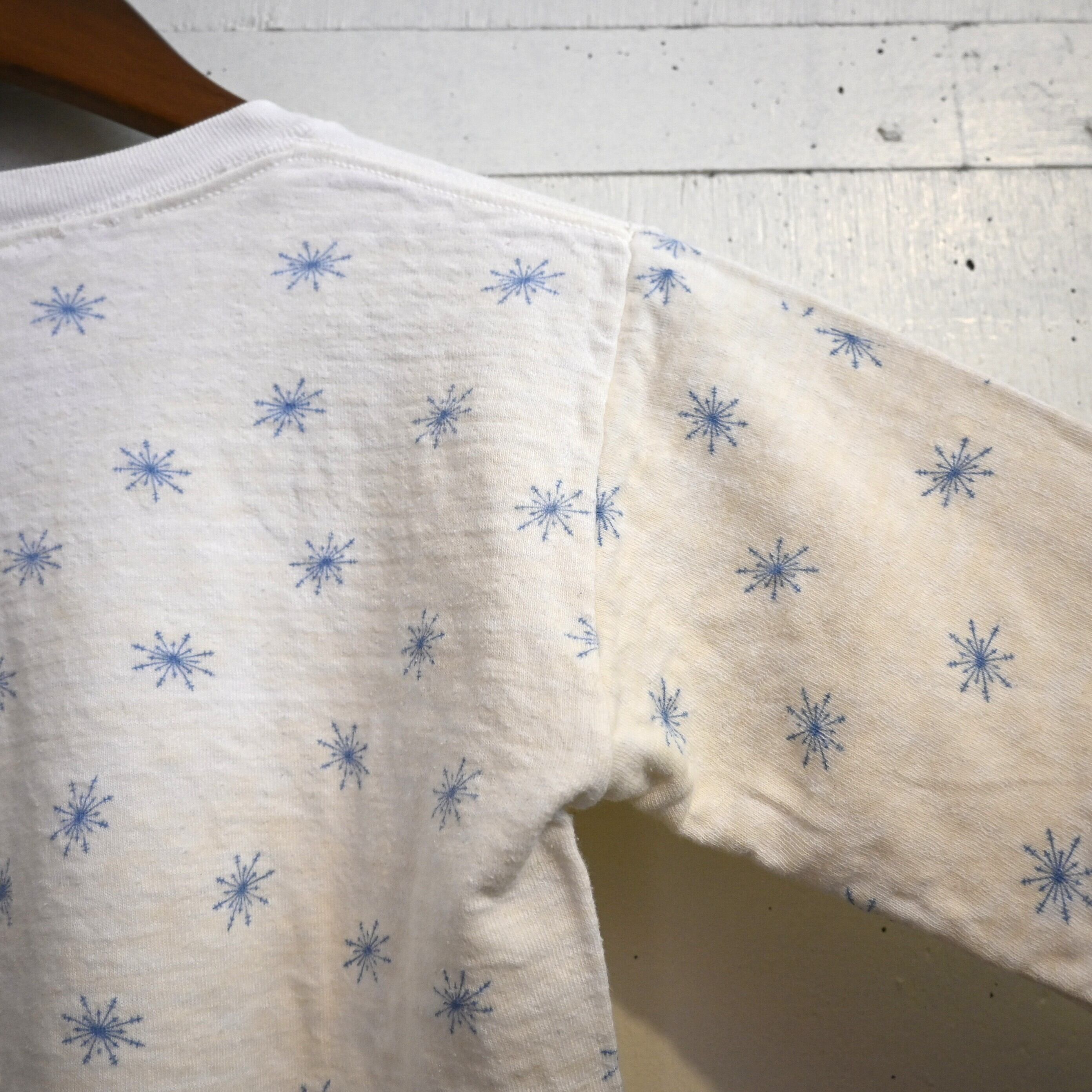 ホワイトボディにブルーの雪の結晶(スノーフレーク)柄が全体に散りばめられた雰囲気のあるデザイン。シンプルながらヴィンテージらしい総柄プリントが魅力の一着です。