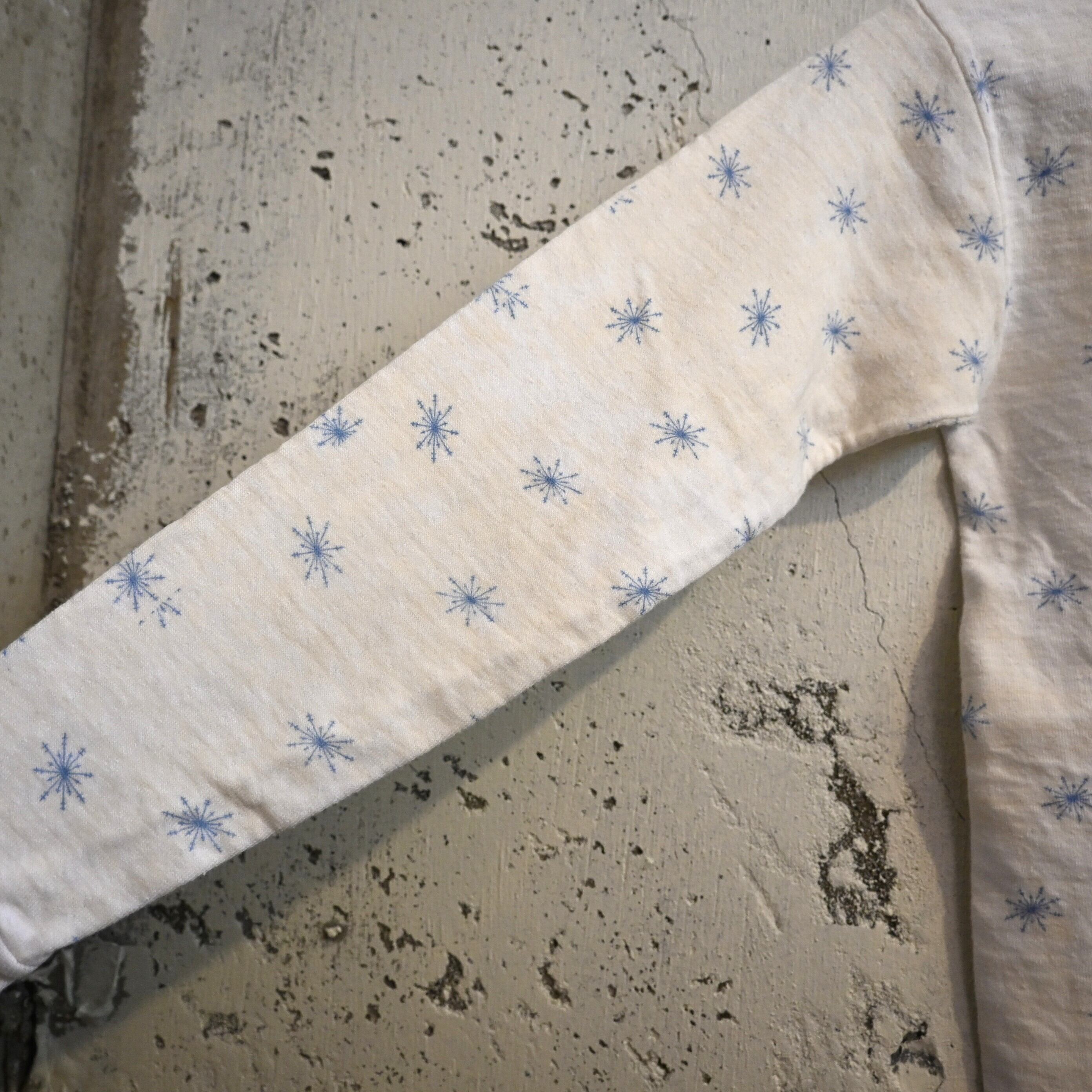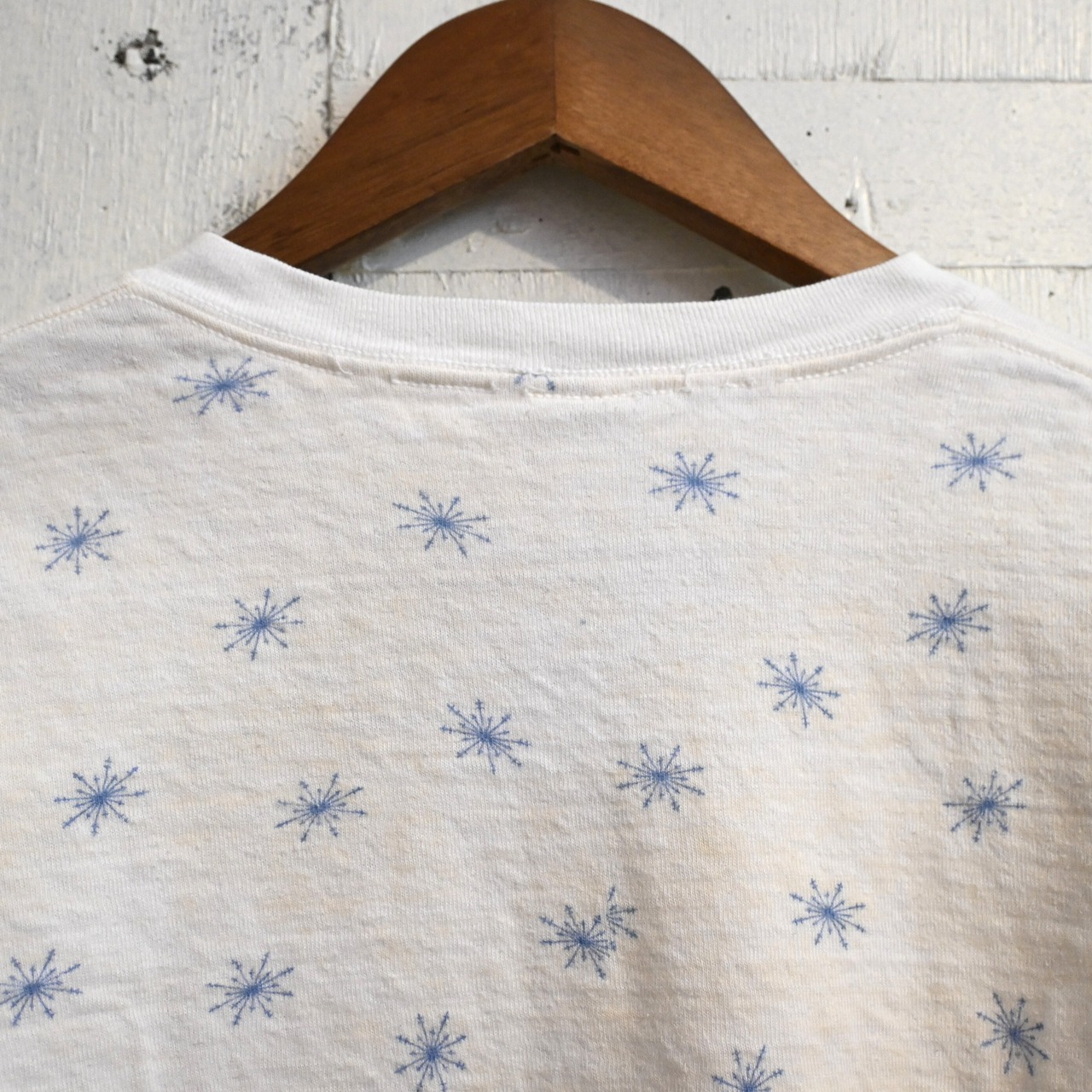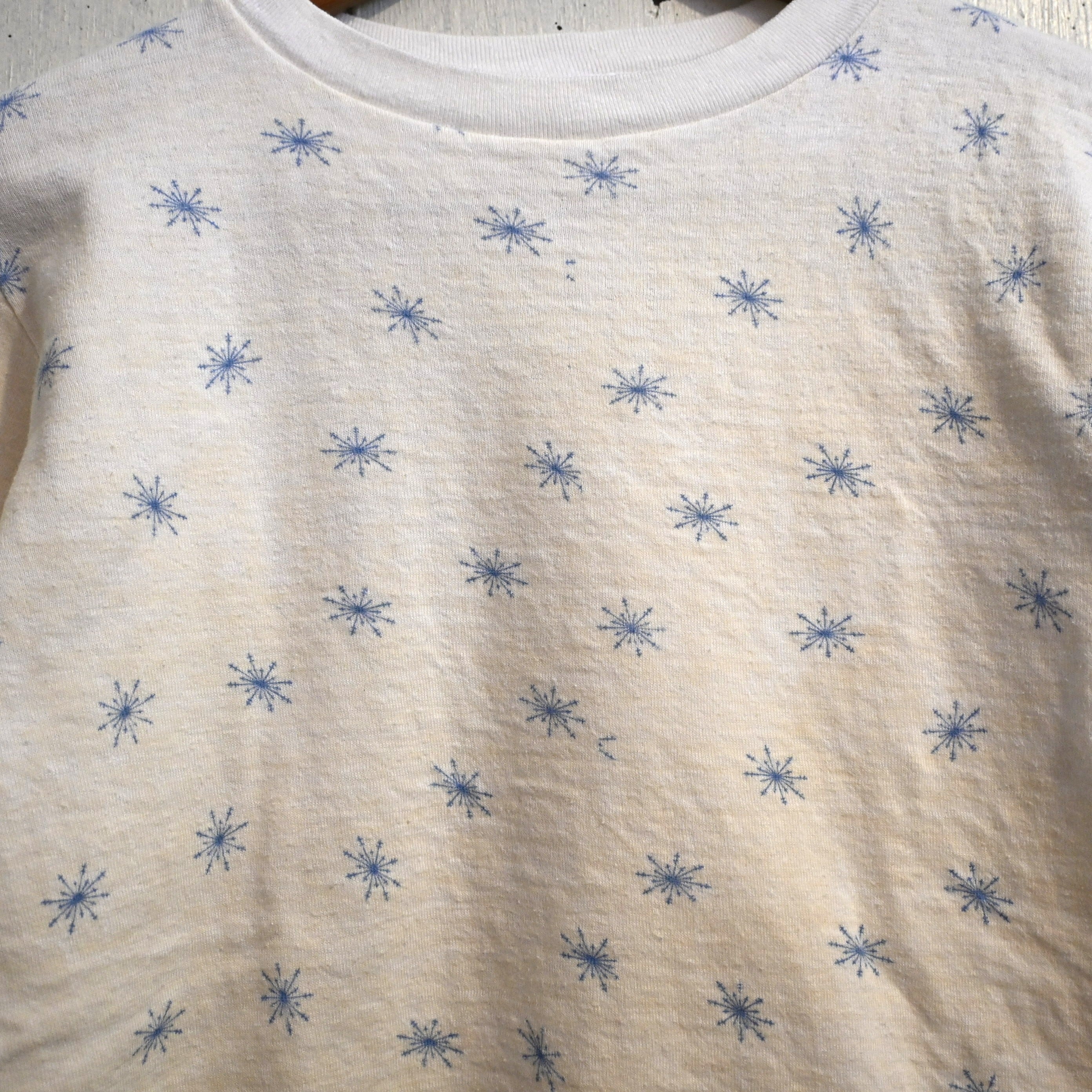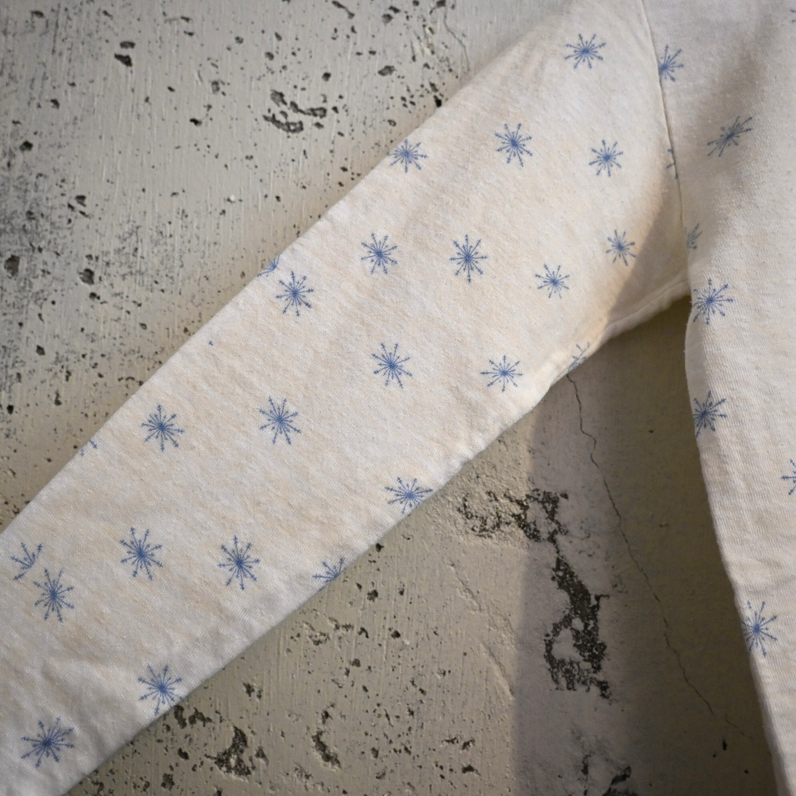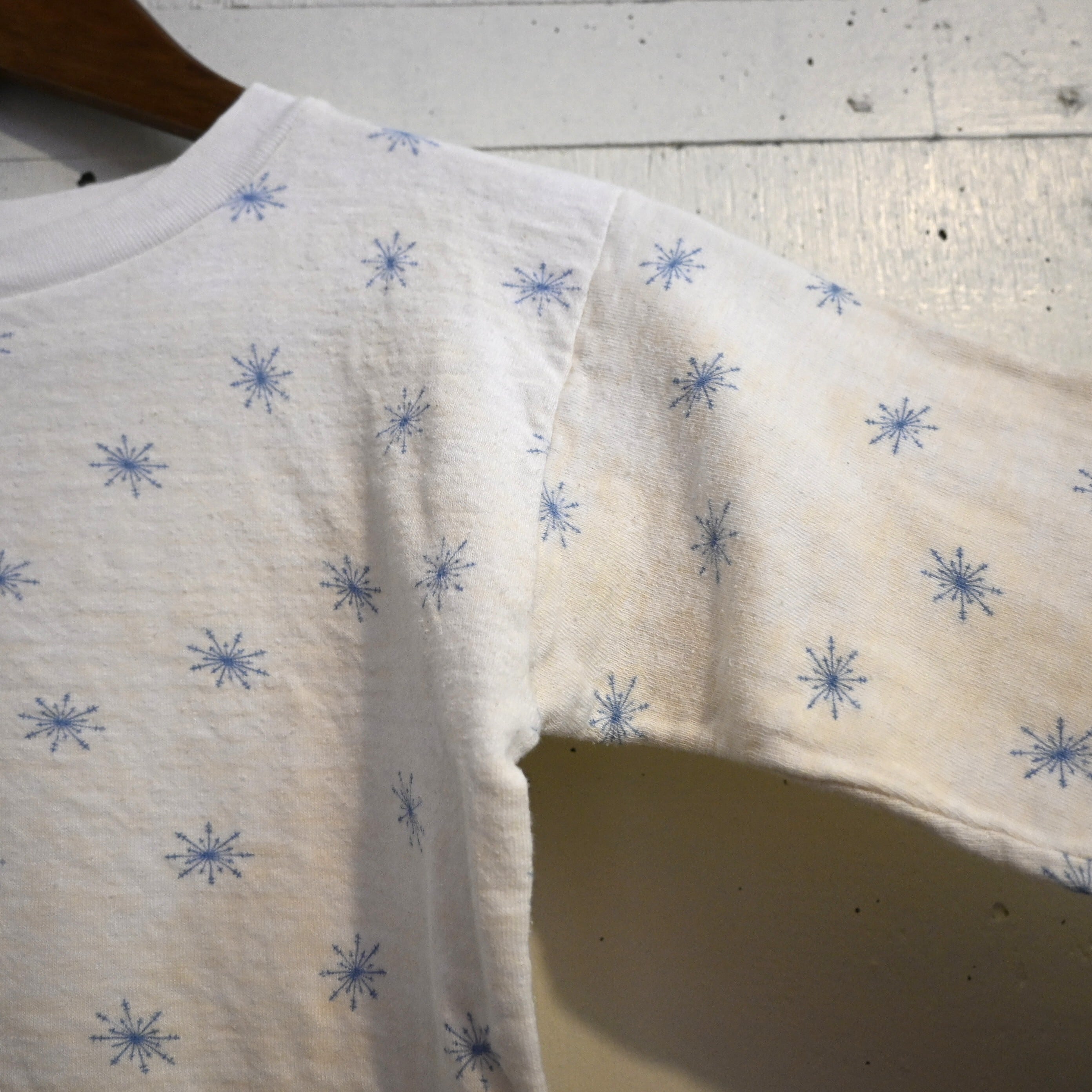 ホワイトボディにブルーの雪の結晶(スノーフレーク)柄が全体に散りばめられた雰囲気のあるデザイン。シンプルながらヴィンテージらしい総柄プリントが魅力の一着です。