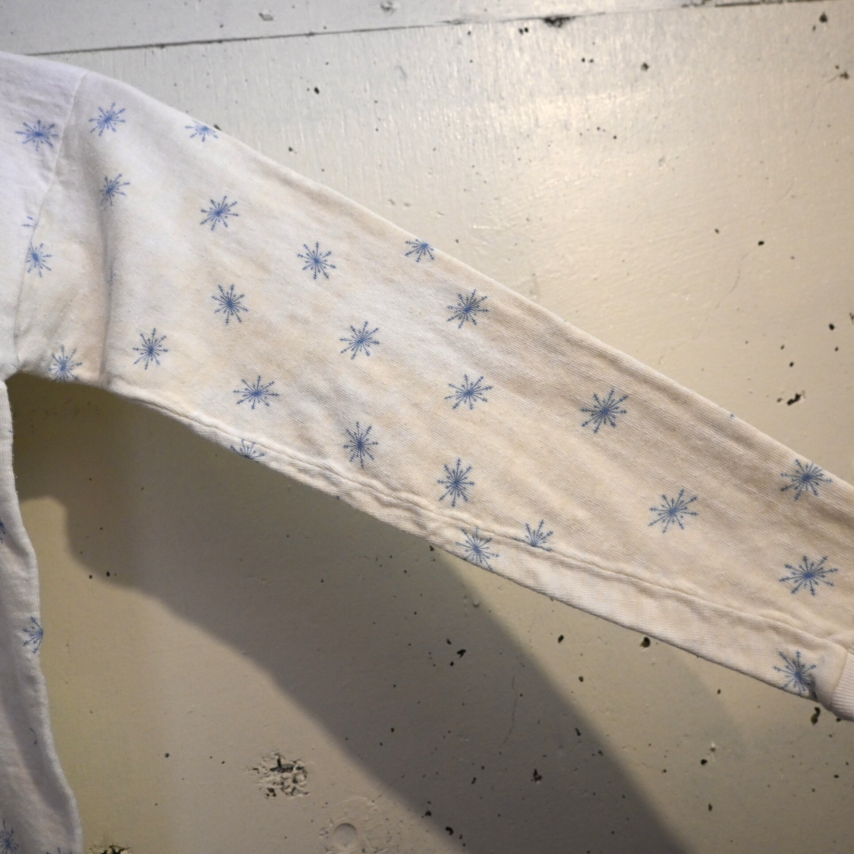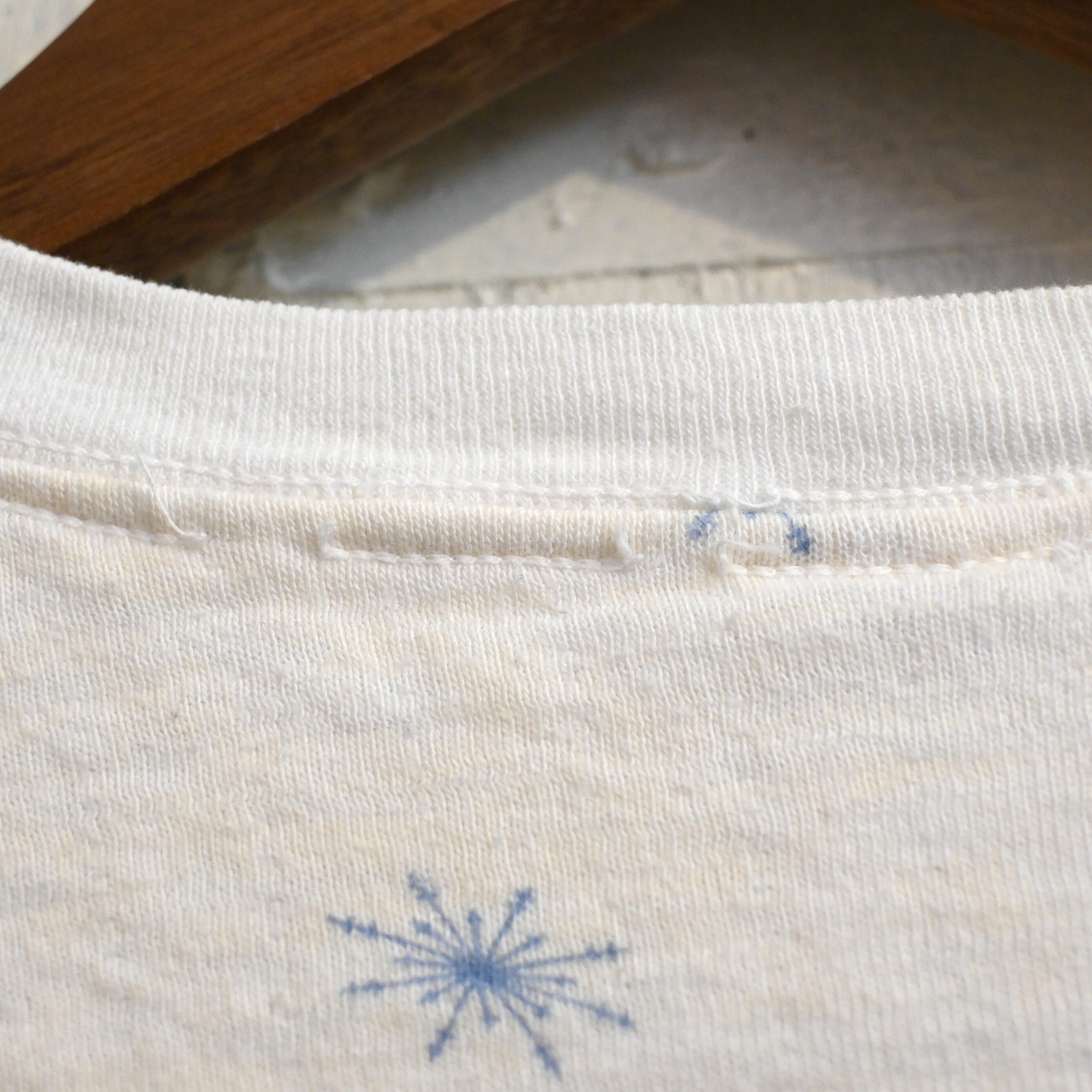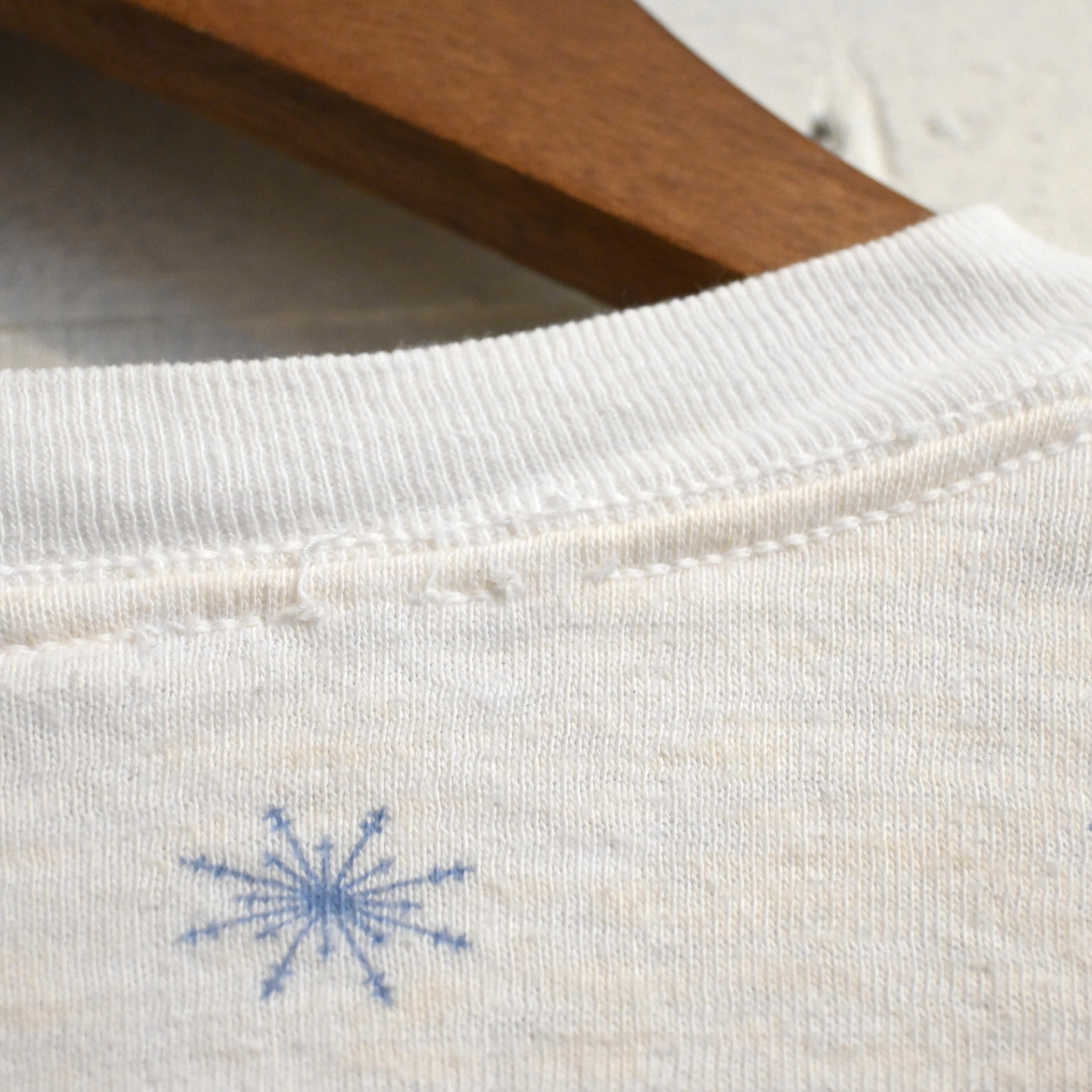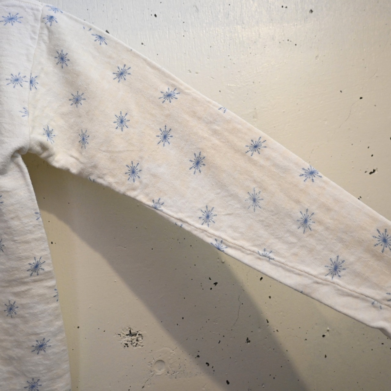 ホワイトボディにブルーの雪の結晶(スノーフレーク)柄が全体に散りばめられた雰囲気のあるデザイン。シンプルながらヴィンテージらしい総柄プリントが魅力の一着です。