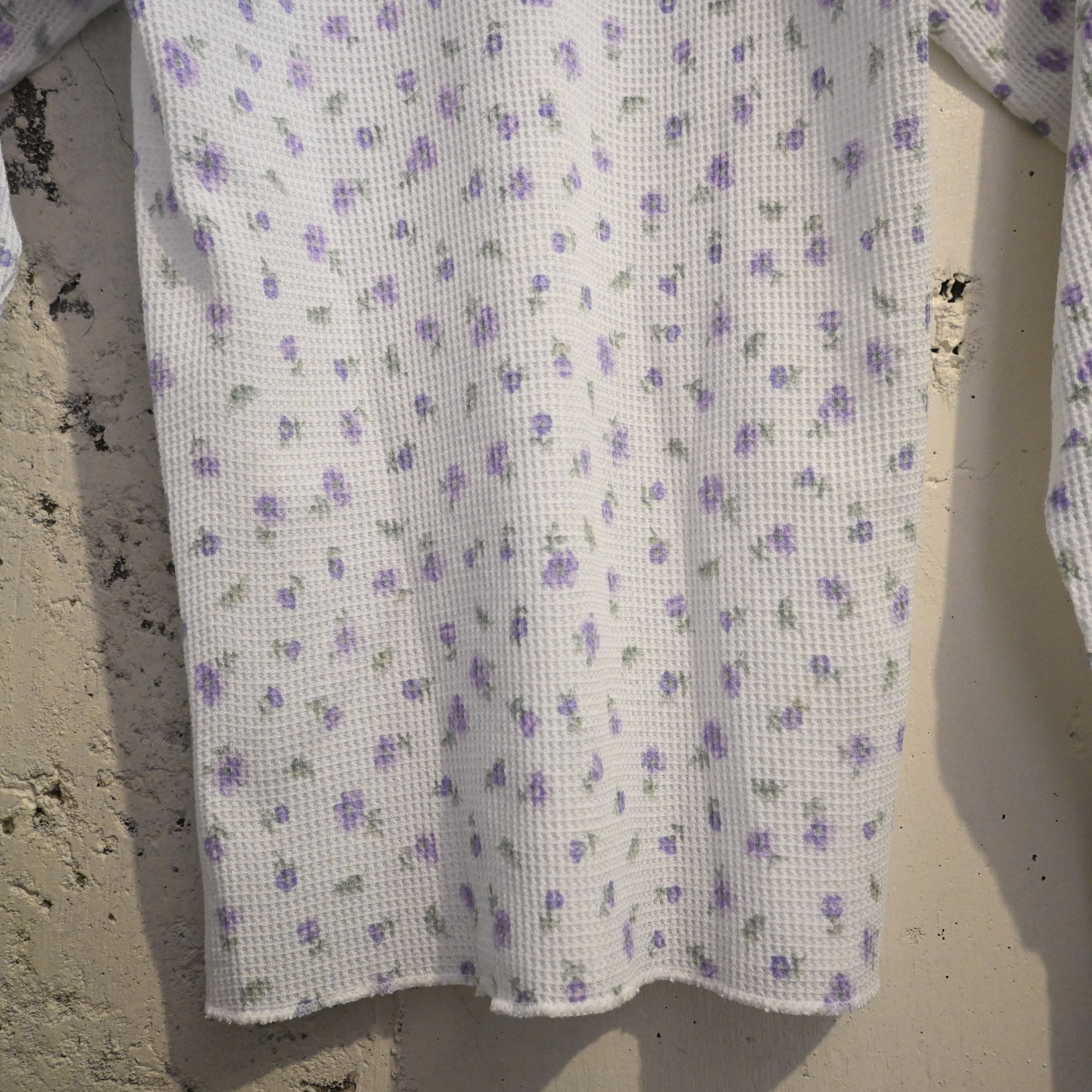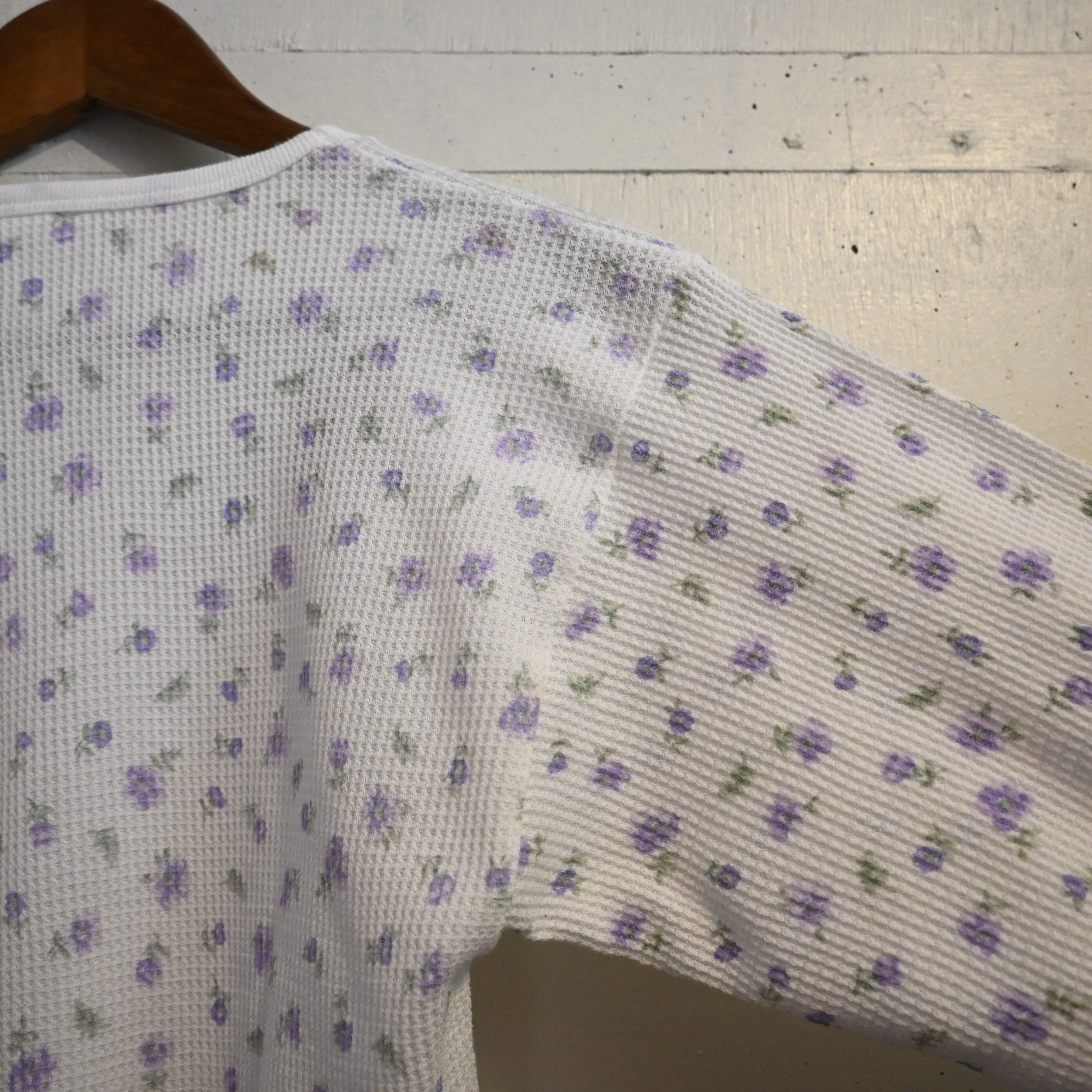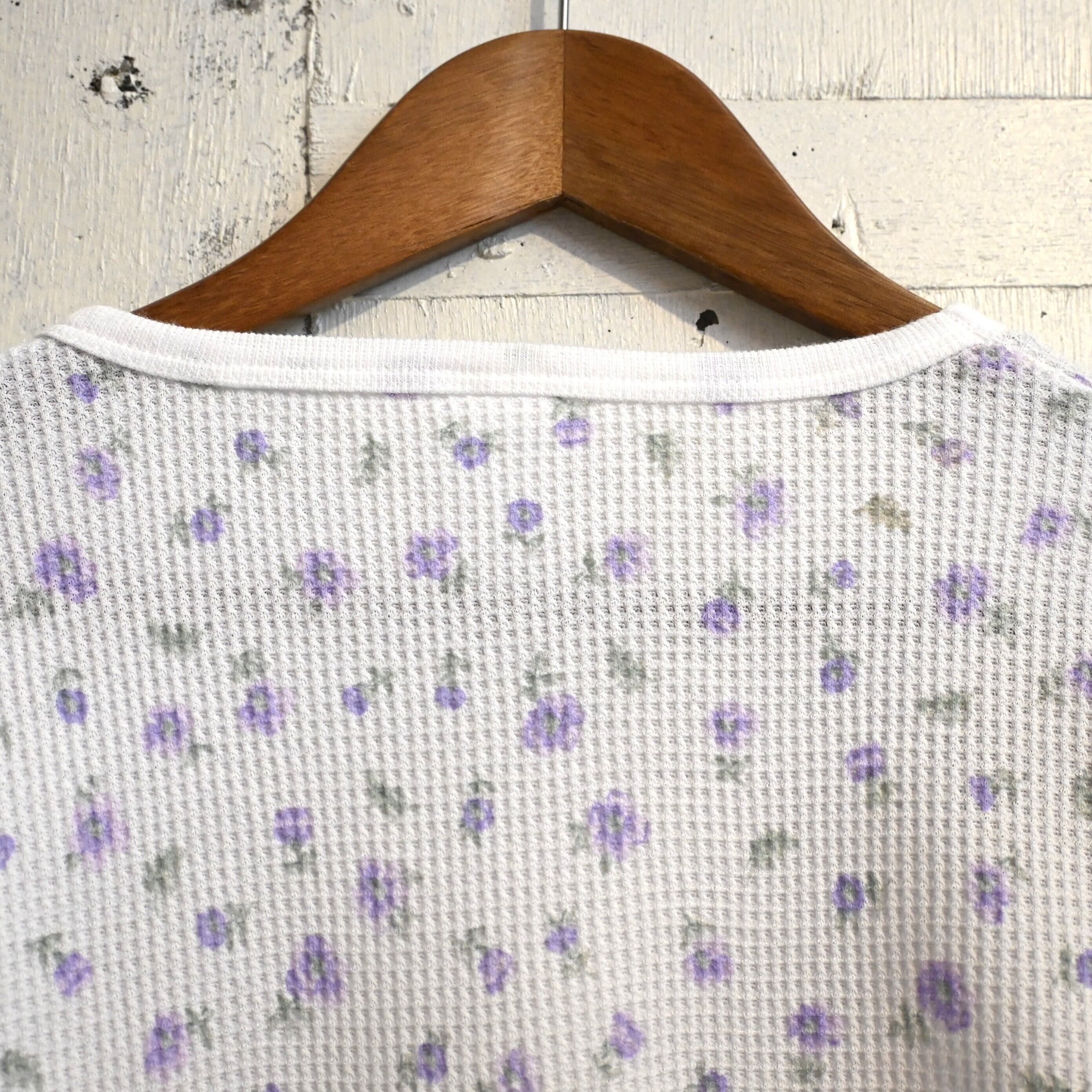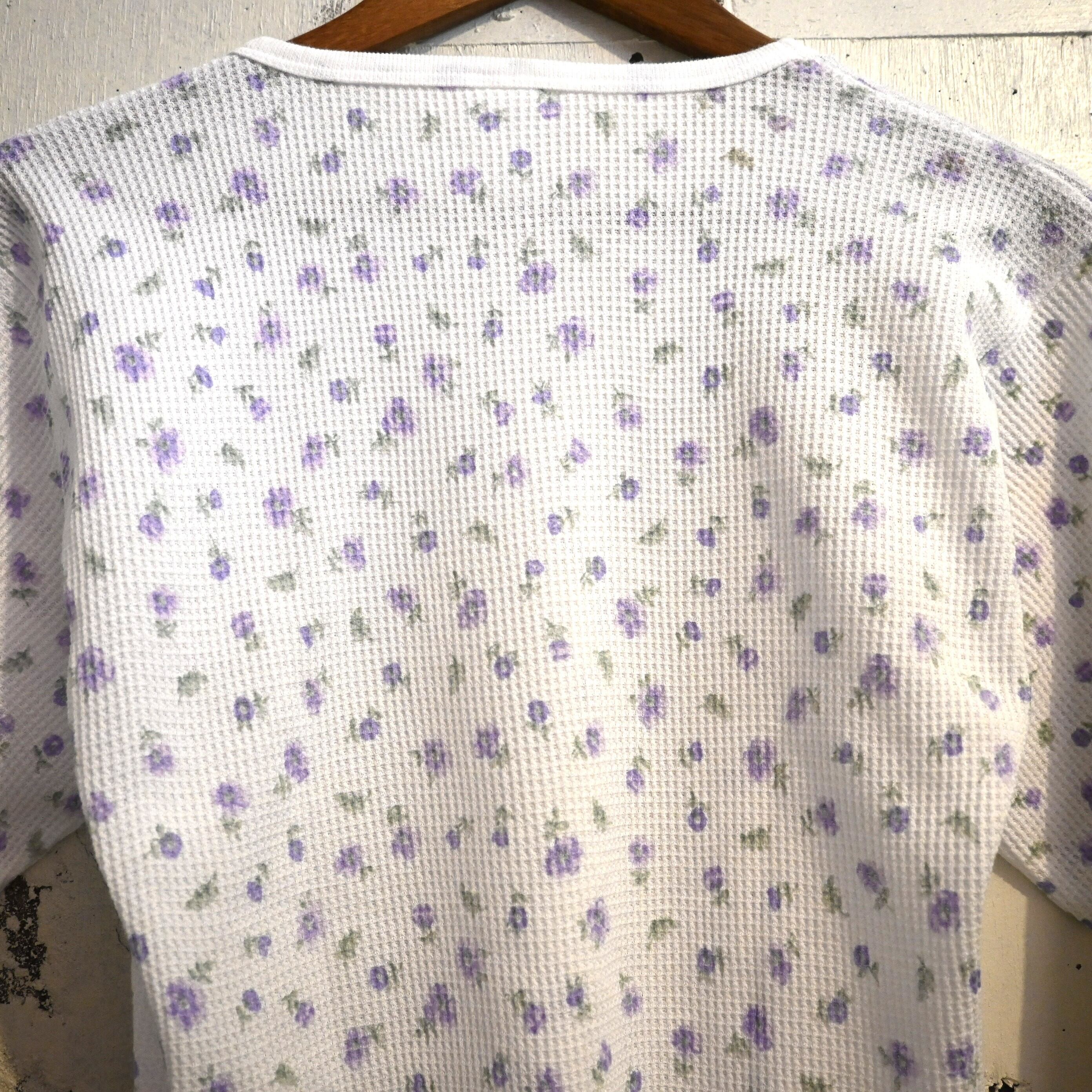 ワッフル編みのサーマル生地に、パープル系の小花柄が全体に散りばめられた雰囲気のある一着。ホワイトボディに淡いパープルとグリーンのフラワープリントが映える、ヴィンテージらしい柔らかい色合いが魅力です。