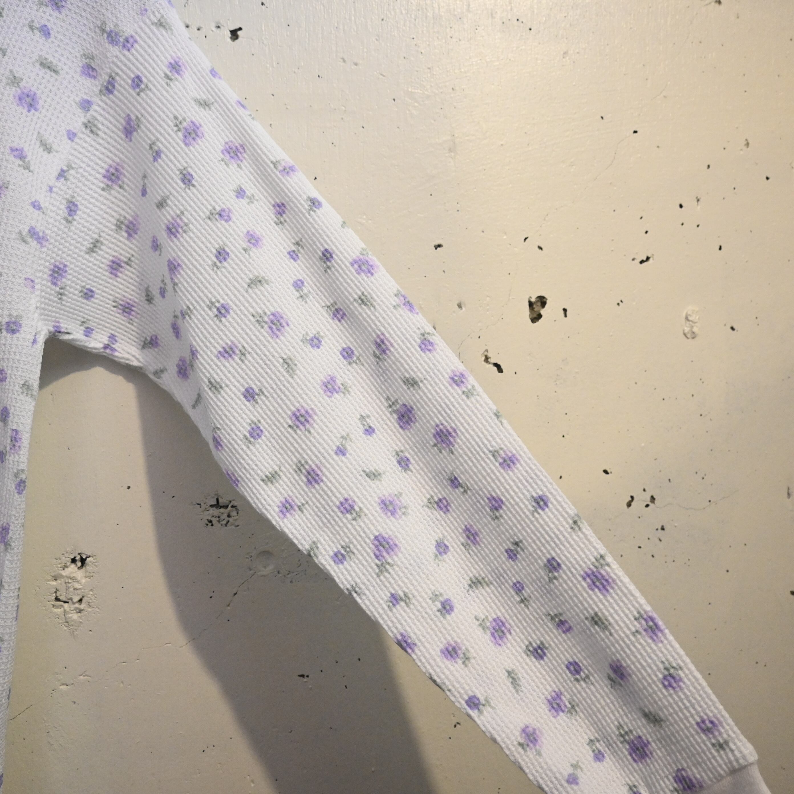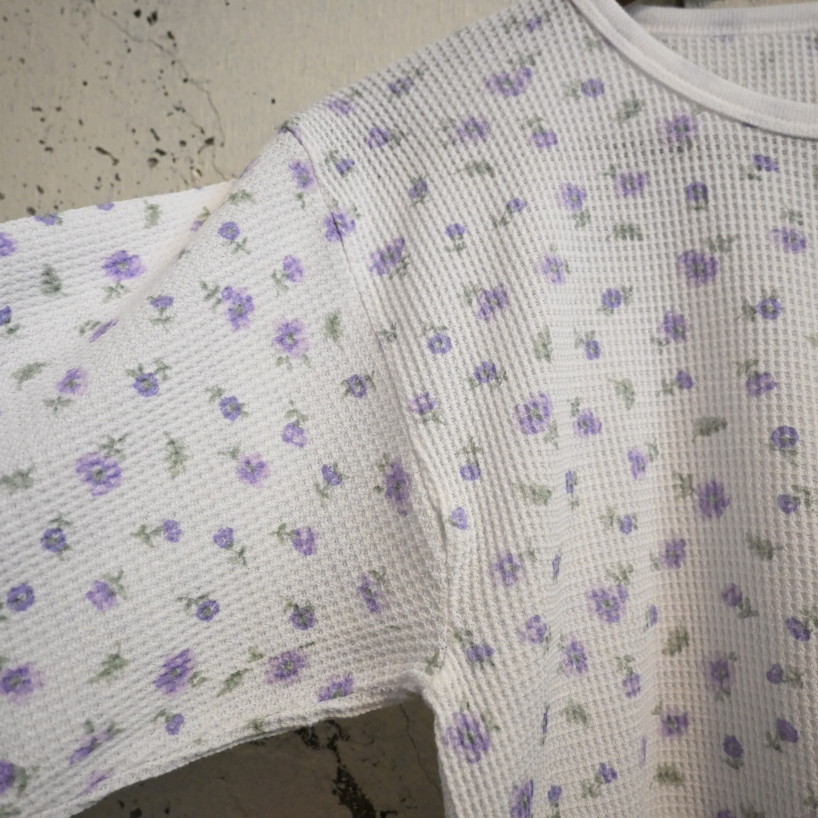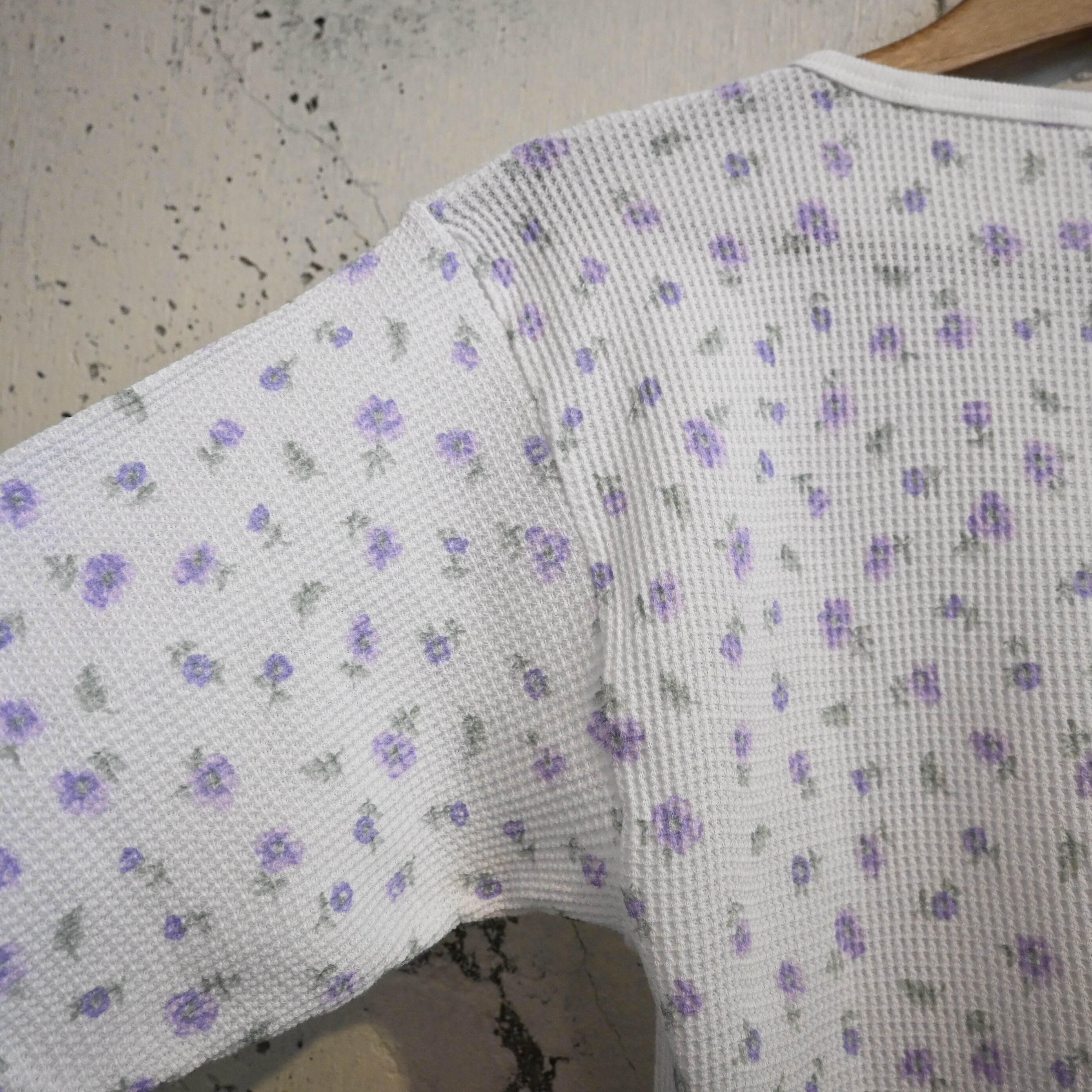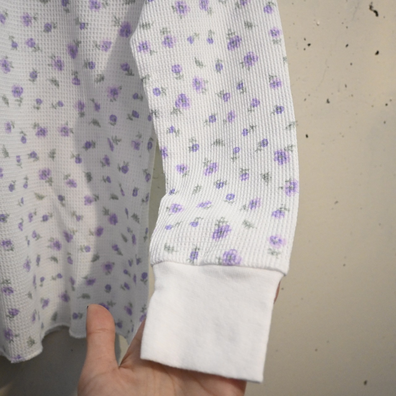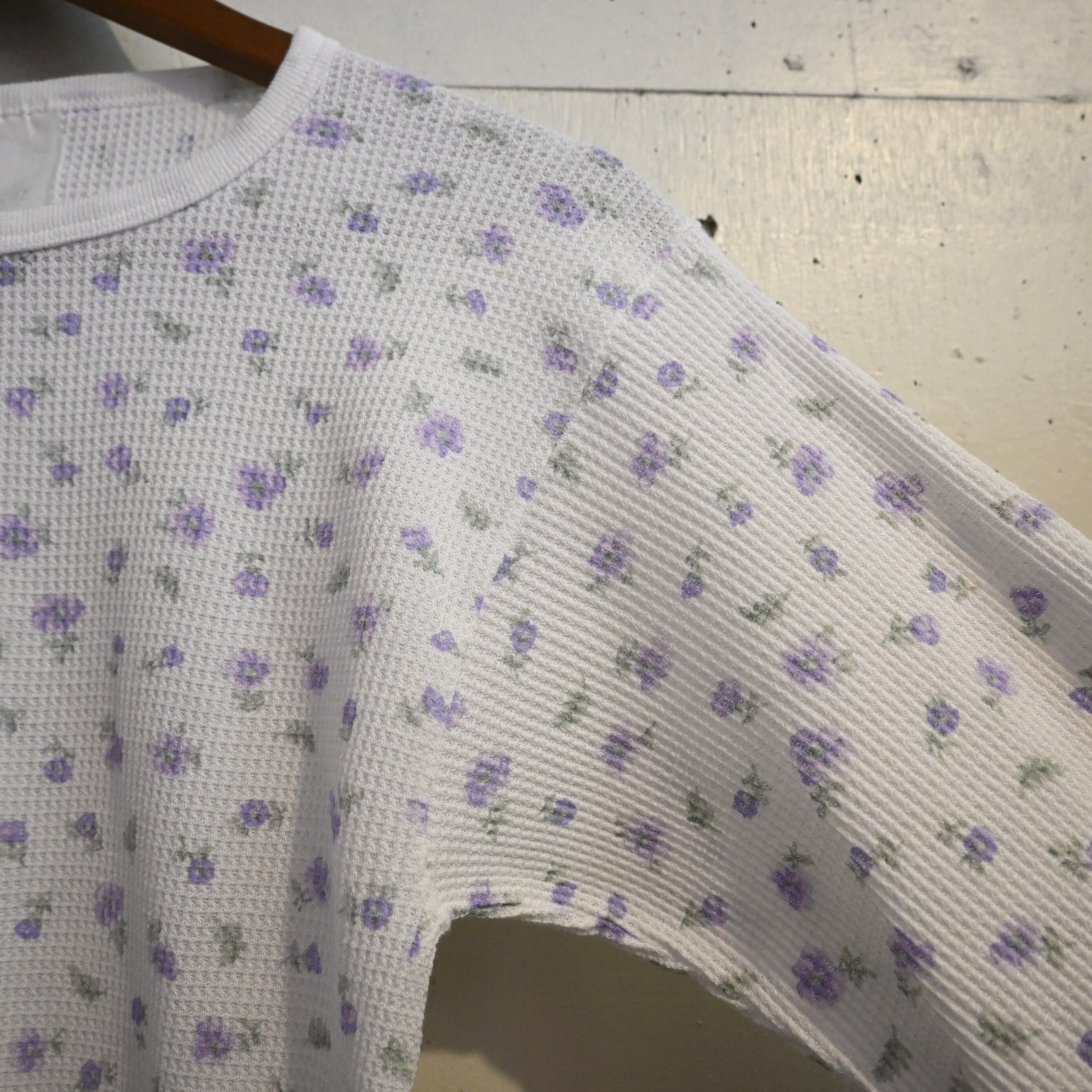 ワッフル編みのサーマル生地に、パープル系の小花柄が全体に散りばめられた雰囲気のある一着。ホワイトボディに淡いパープルとグリーンのフラワープリントが映える、ヴィンテージらしい柔らかい色合いが魅力です。