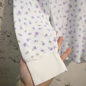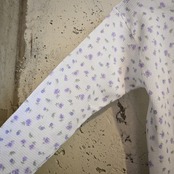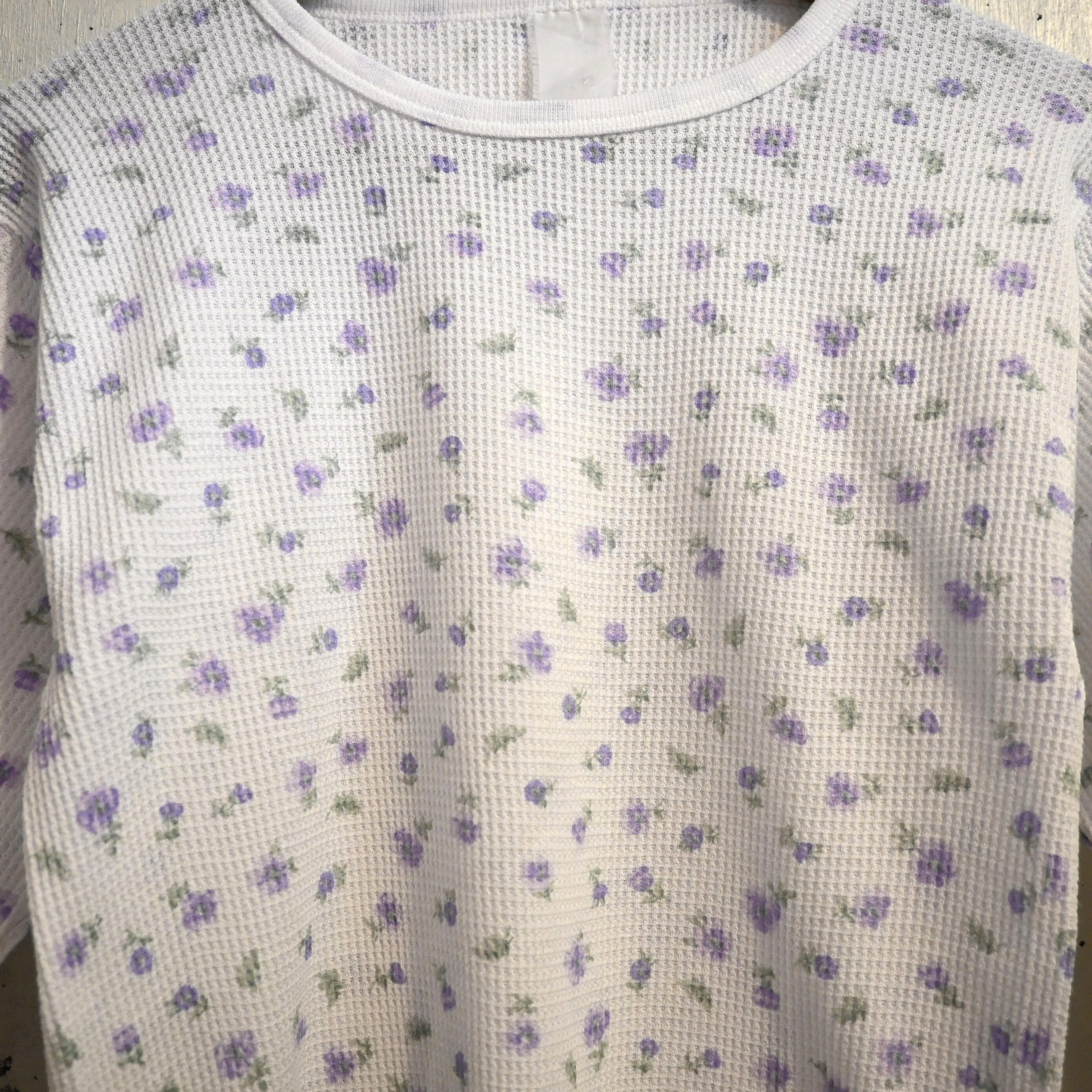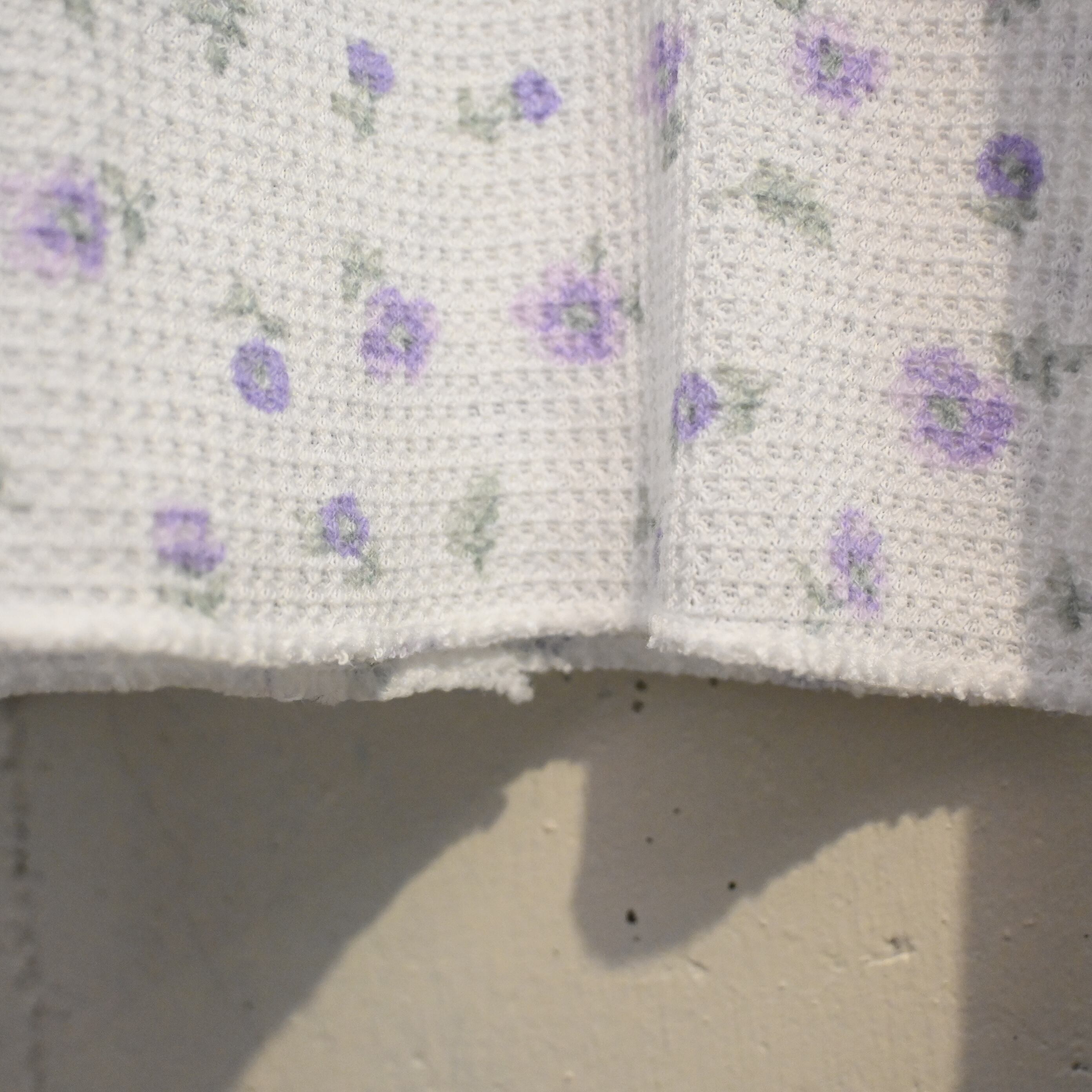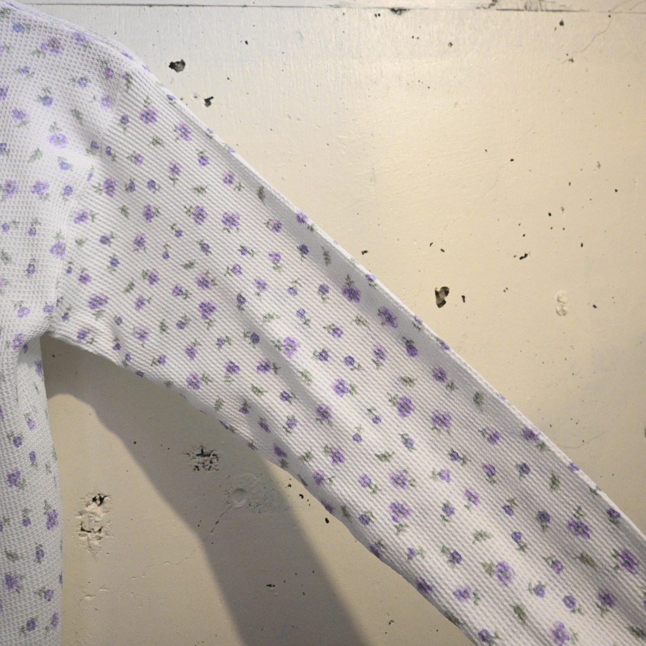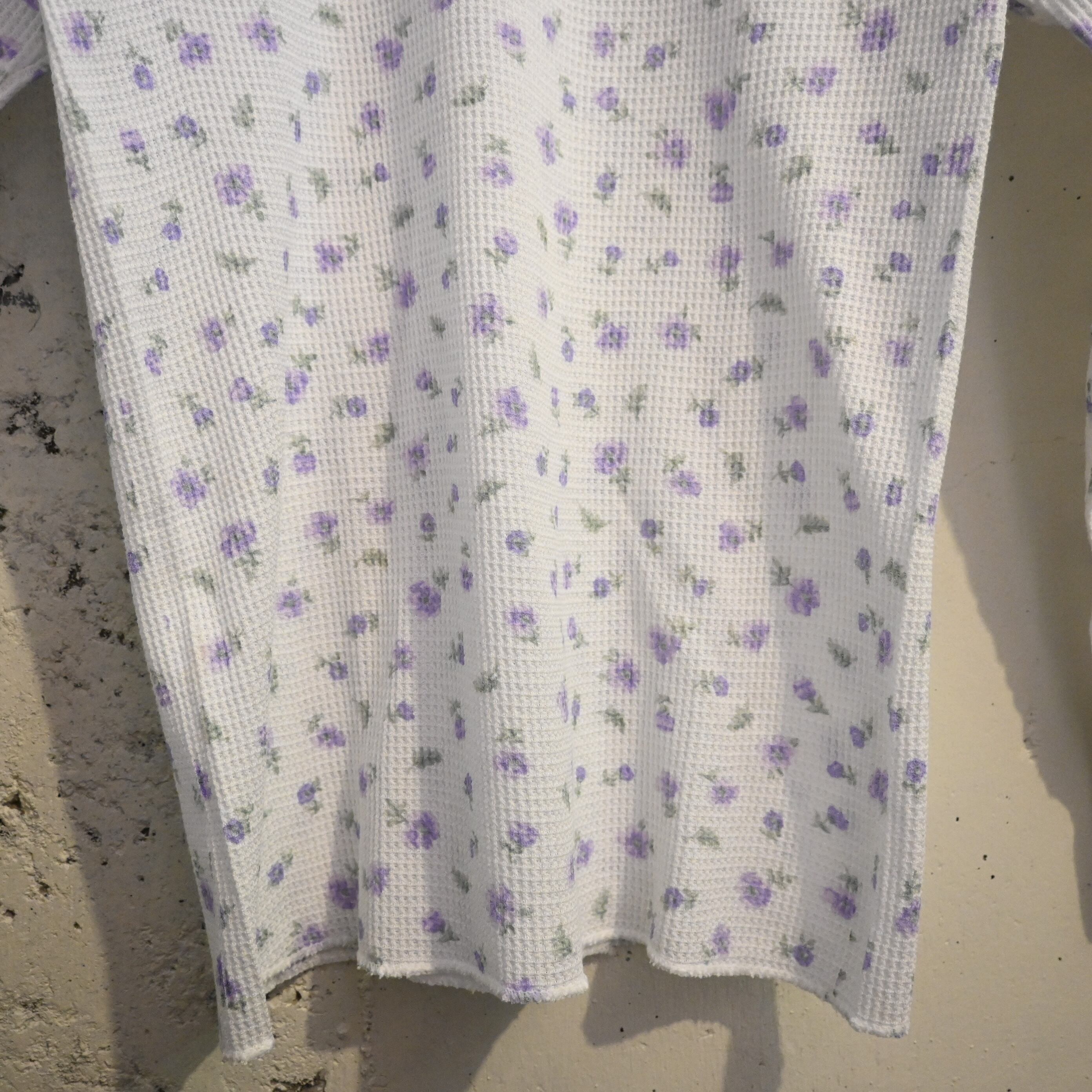 ワッフル編みのサーマル生地に、パープル系の小花柄が全体に散りばめられた雰囲気のある一着。ホワイトボディに淡いパープルとグリーンのフラワープリントが映える、ヴィンテージらしい柔らかい色合いが魅力です。