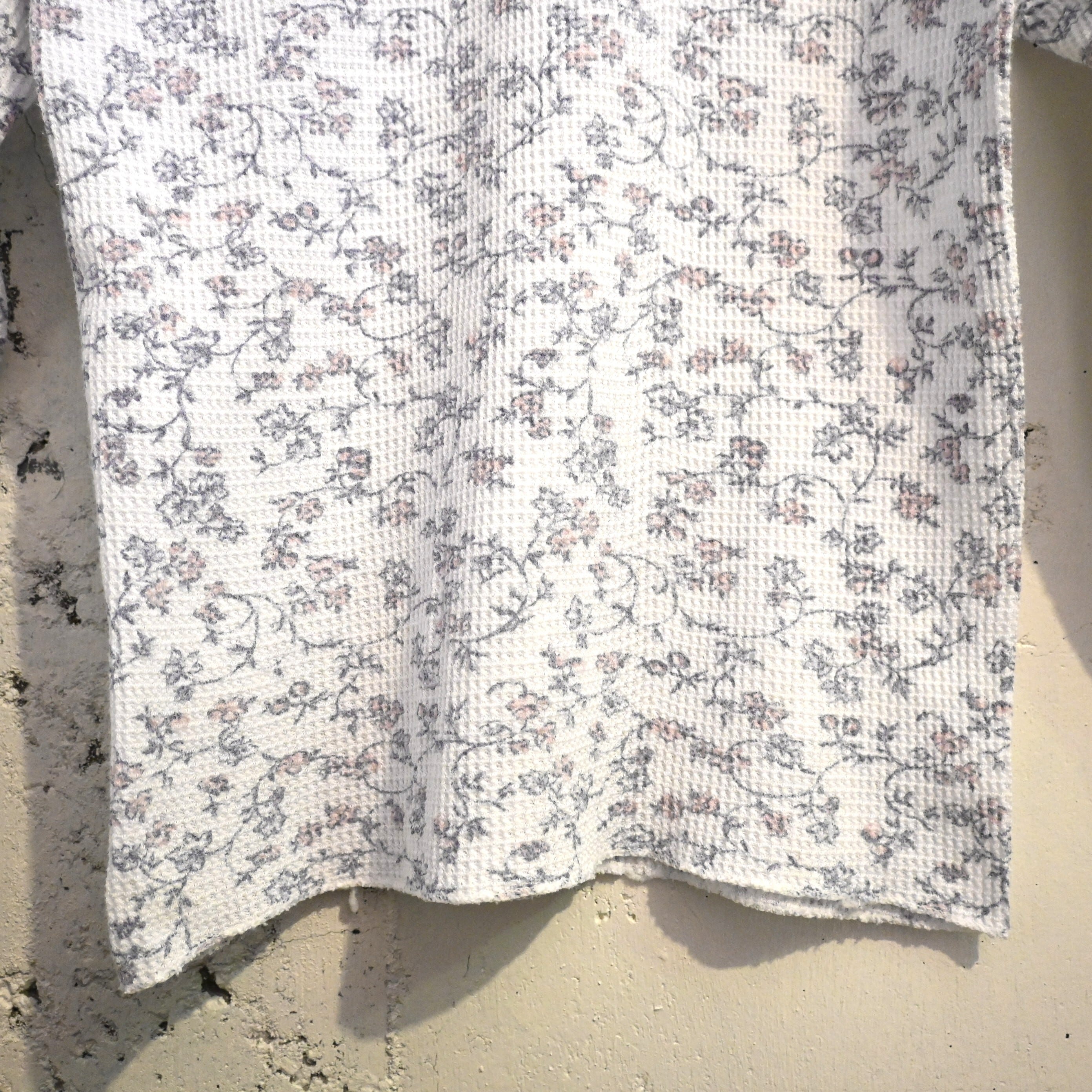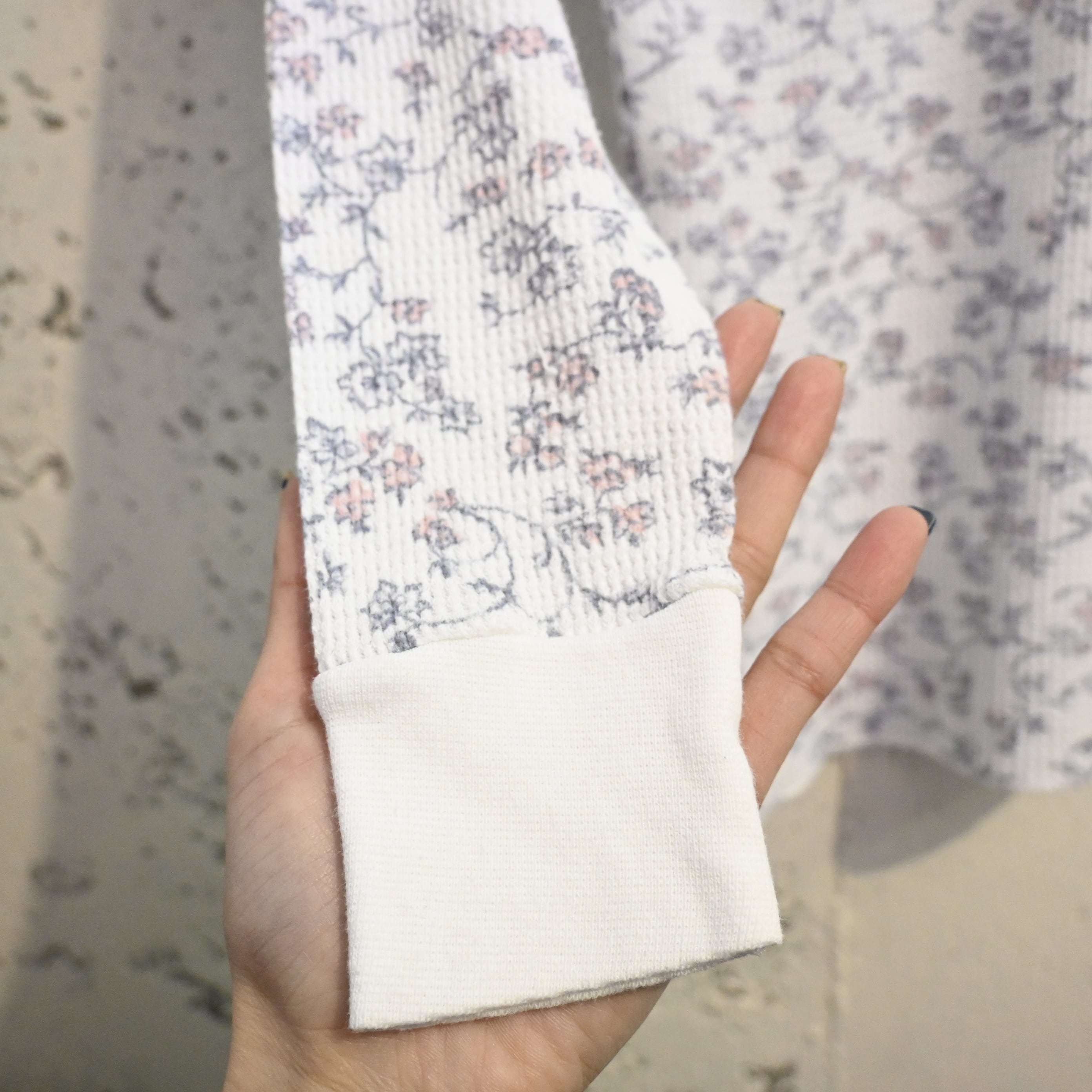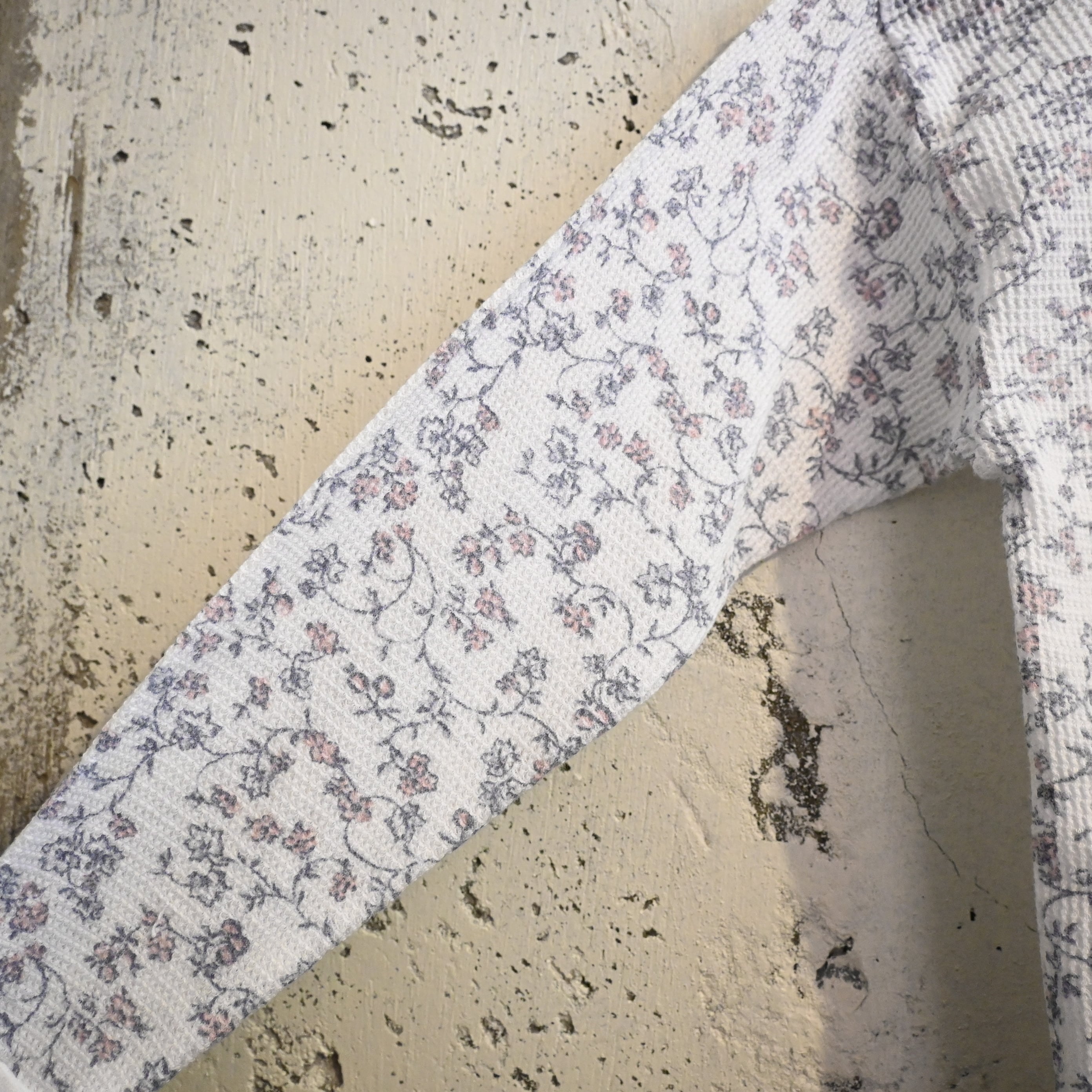 保温性の高いワッフル生地(サーマル生地)に、繊細な小花柄が全面プリントされた雰囲気の良い一着です。