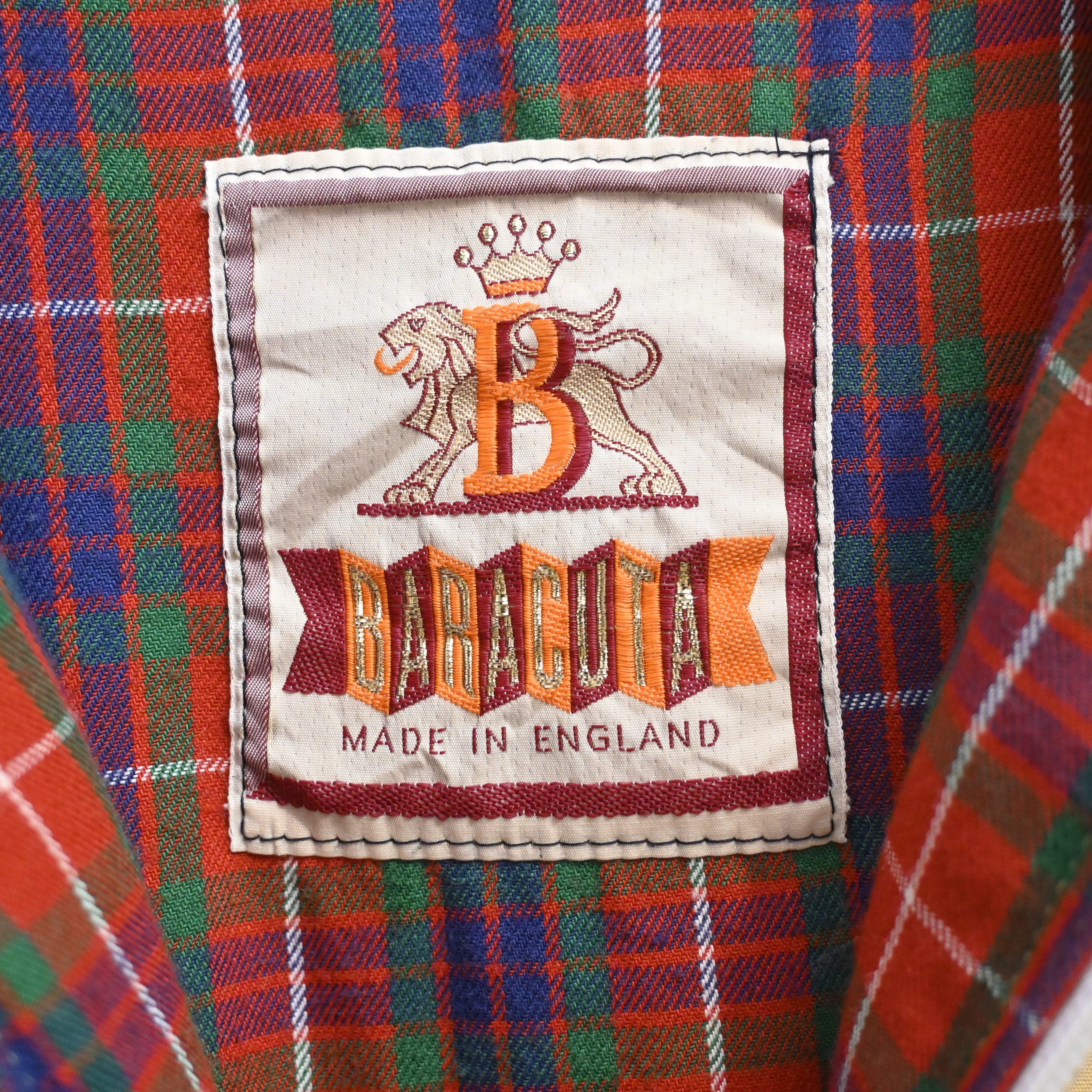 こちらは70〜80年代頃の Made in England 表記個体で、ブランドを象徴するアンブレラヨーク、ラグランスリーブ、スタンドカラー、裾と袖のリブ仕様などG9の基本ディテールがしっかり残った一着です。裏地にはBaracutaらしい鮮やかなフレイザータータンチェックが使われており、英国的な伝統を感じられる仕上がりになっています。