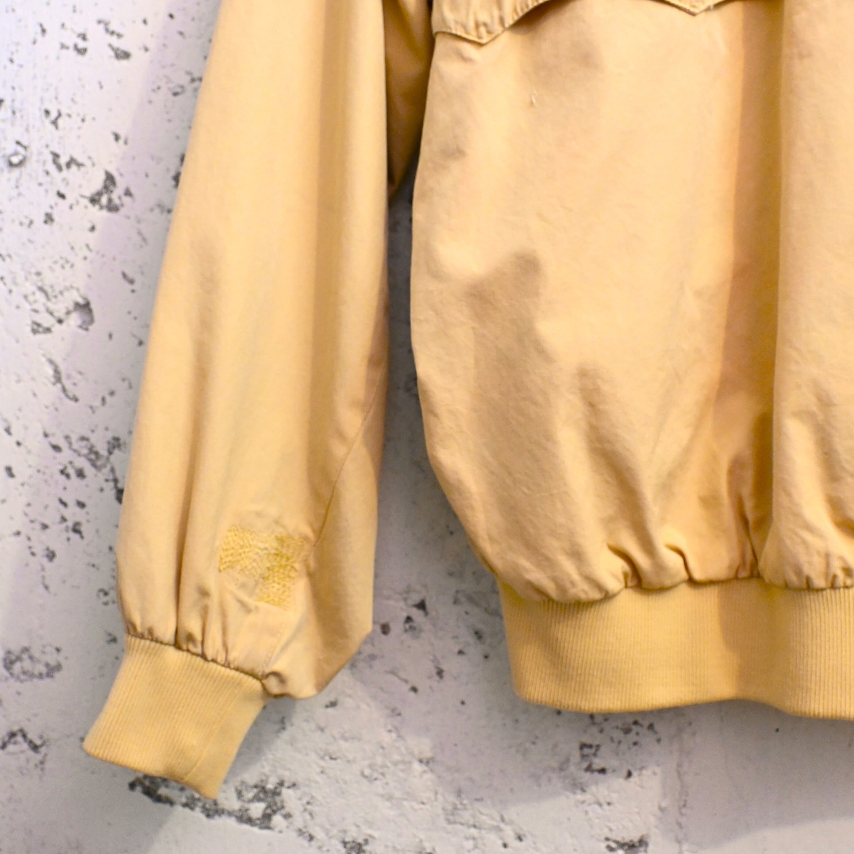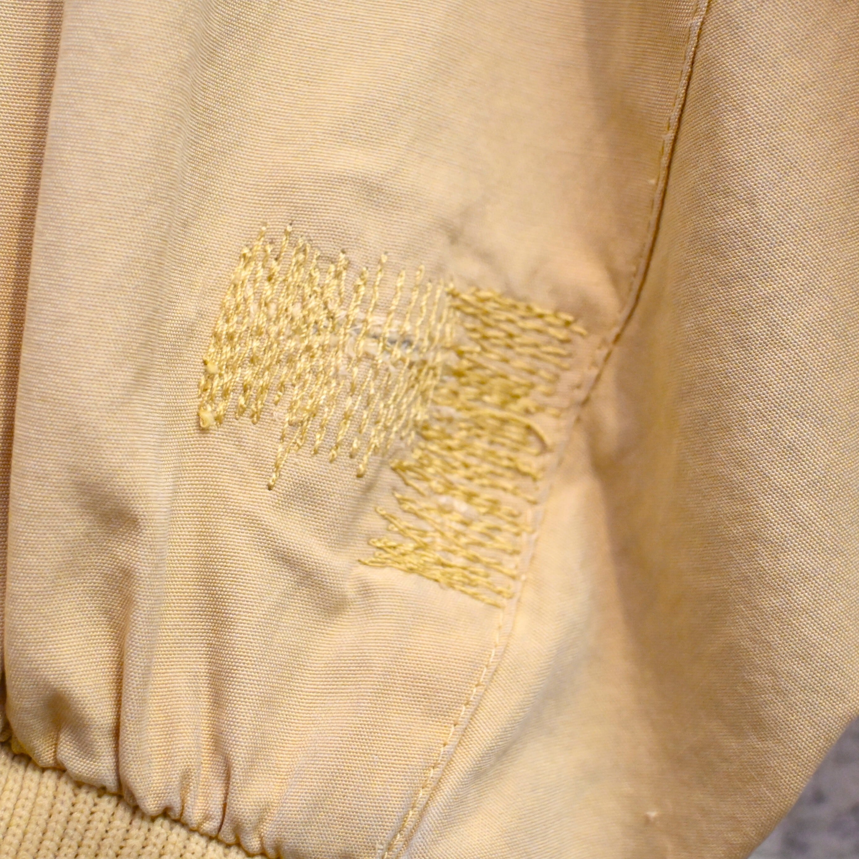 全体に使用感があり、袖・裾リブに薄汚れ、左袖付近に穴を補修した刺繡があります。フロントジップは交換済みでオリジナルではありませんが、開閉はスムーズで着用に支障はありません。ヴィンテージらしい雰囲気をしっかり楽しめるコンディションです。