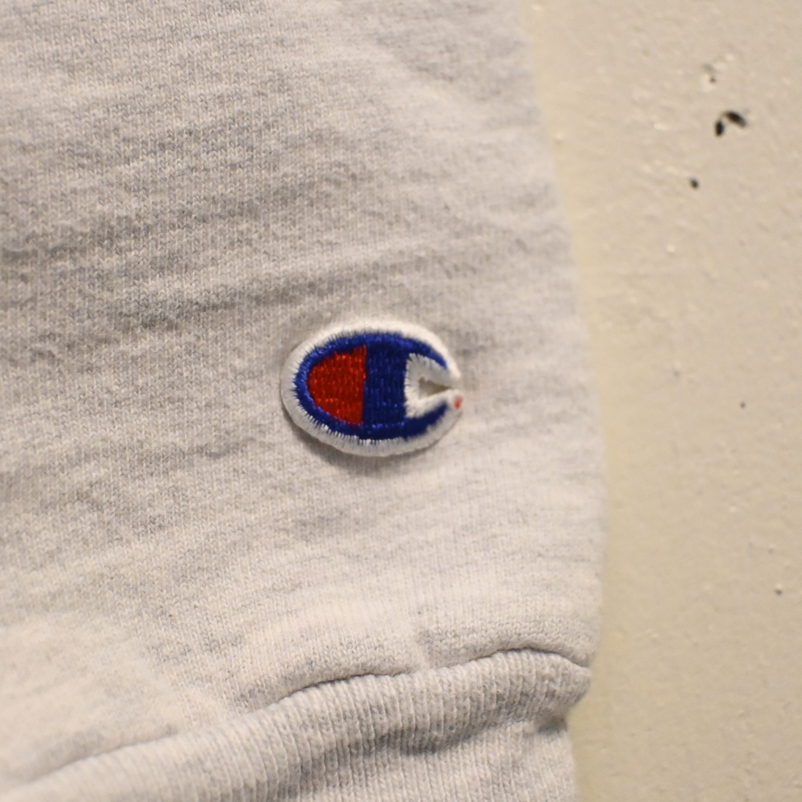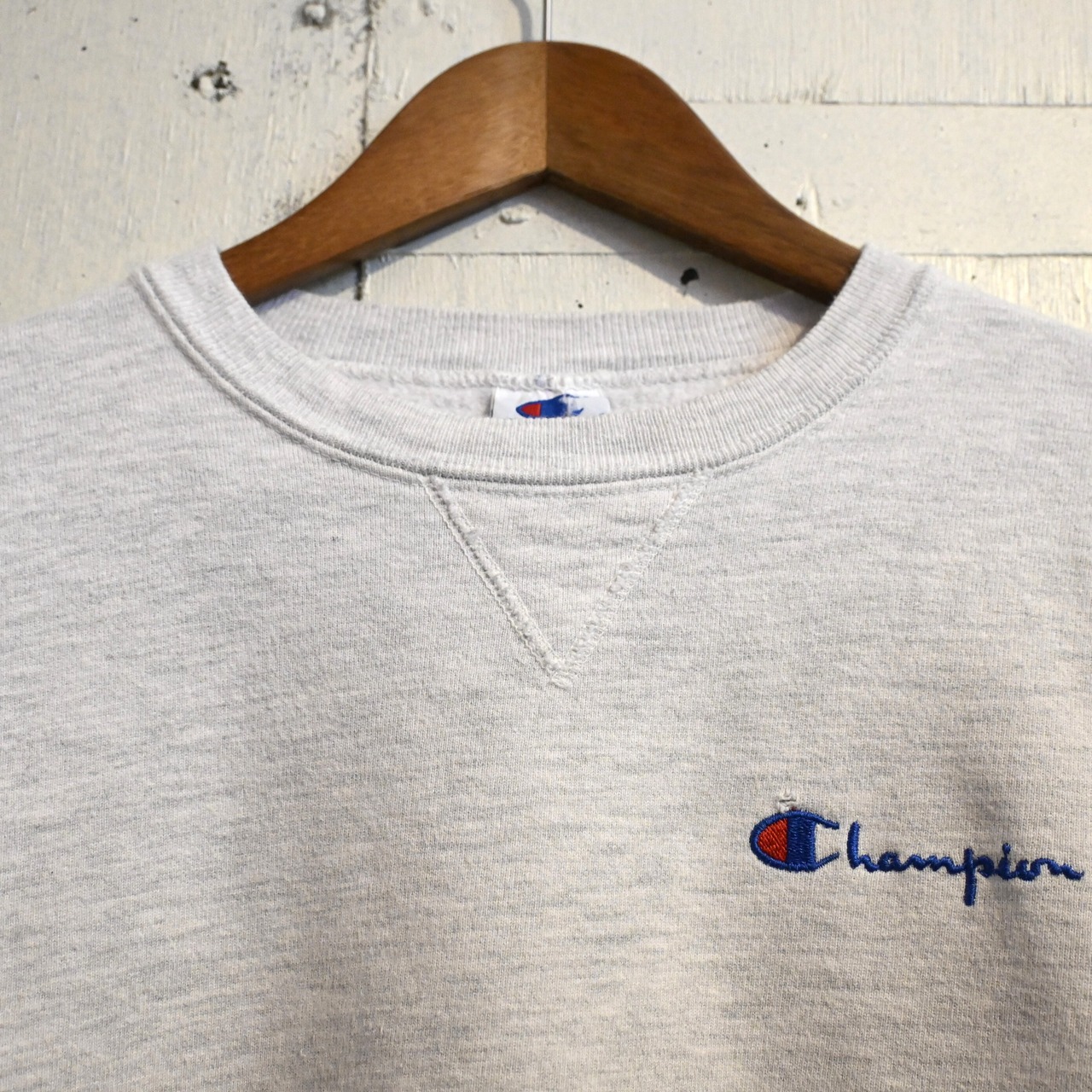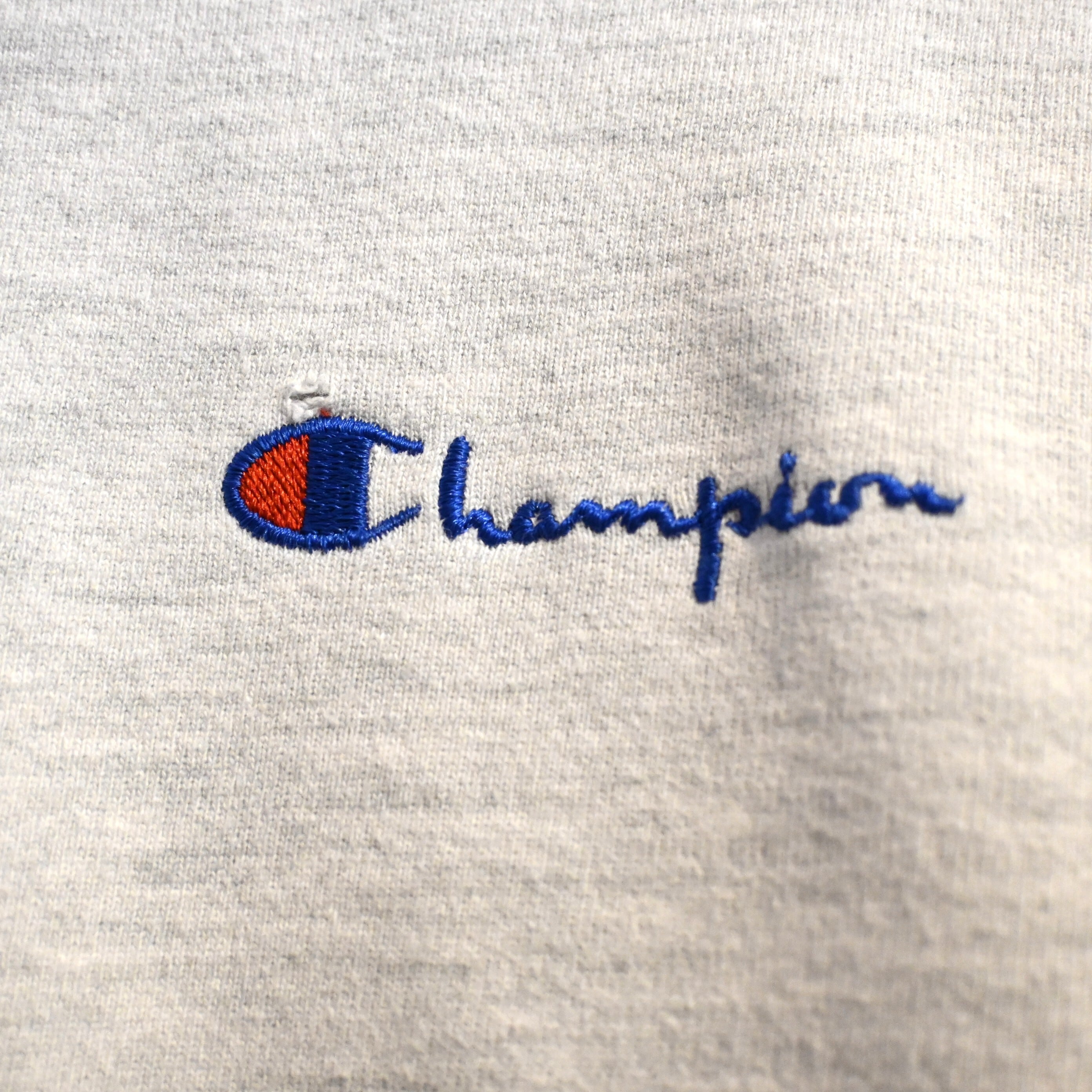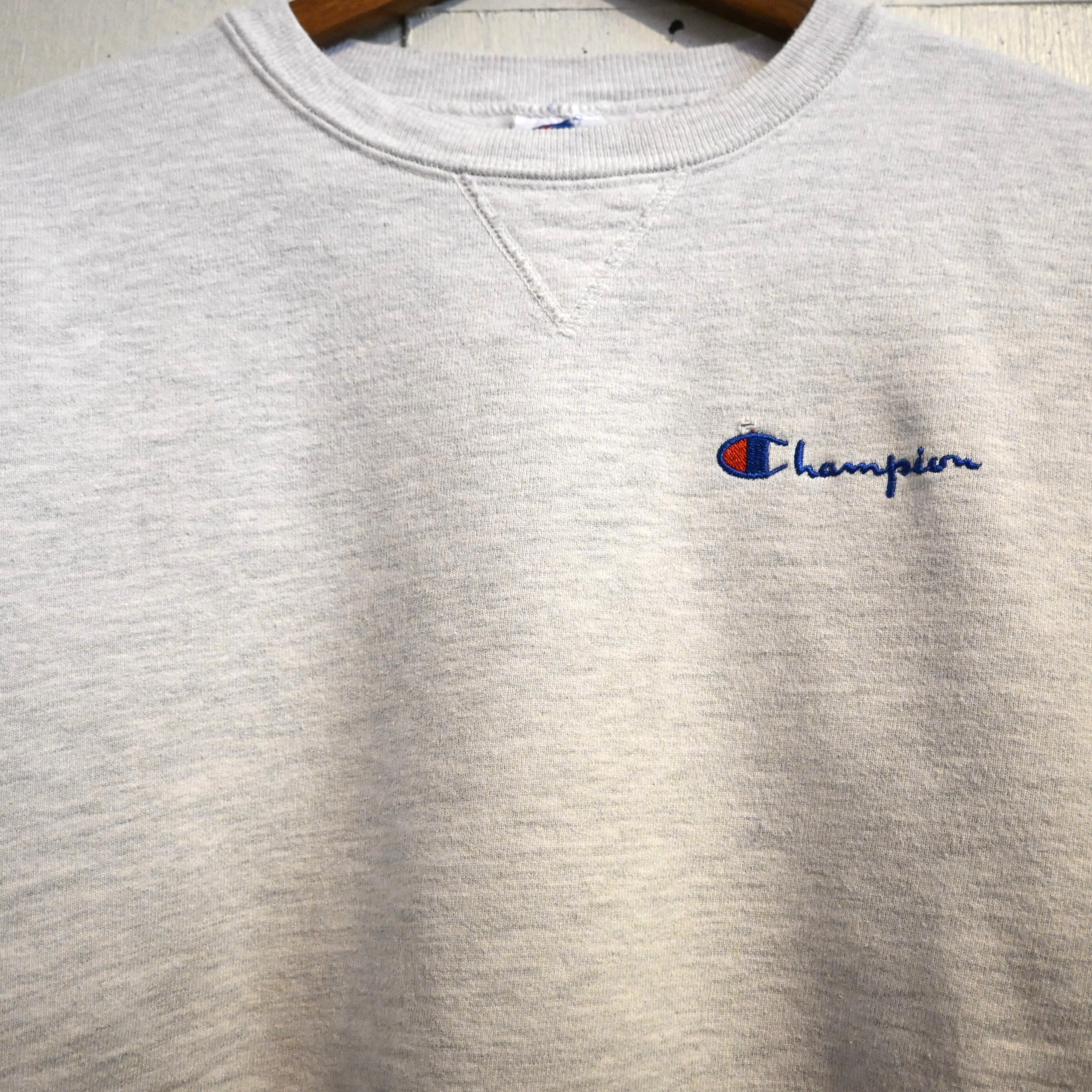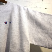 首元にはヴィンテージスウェットらしい Vガゼット(汗止め)ディティール が入り、胸元には Championロゴ刺繍 が入るシンプルなデザインです。