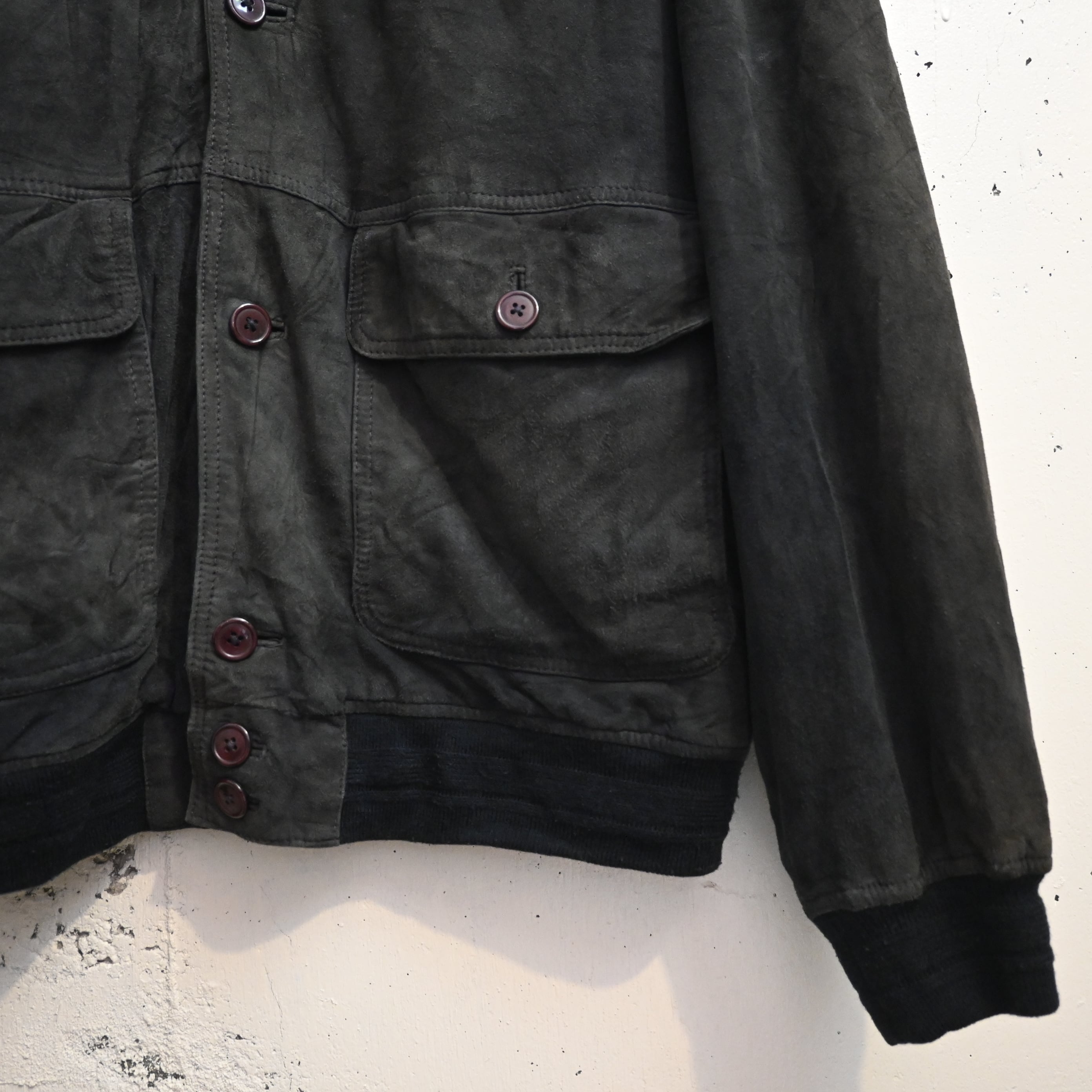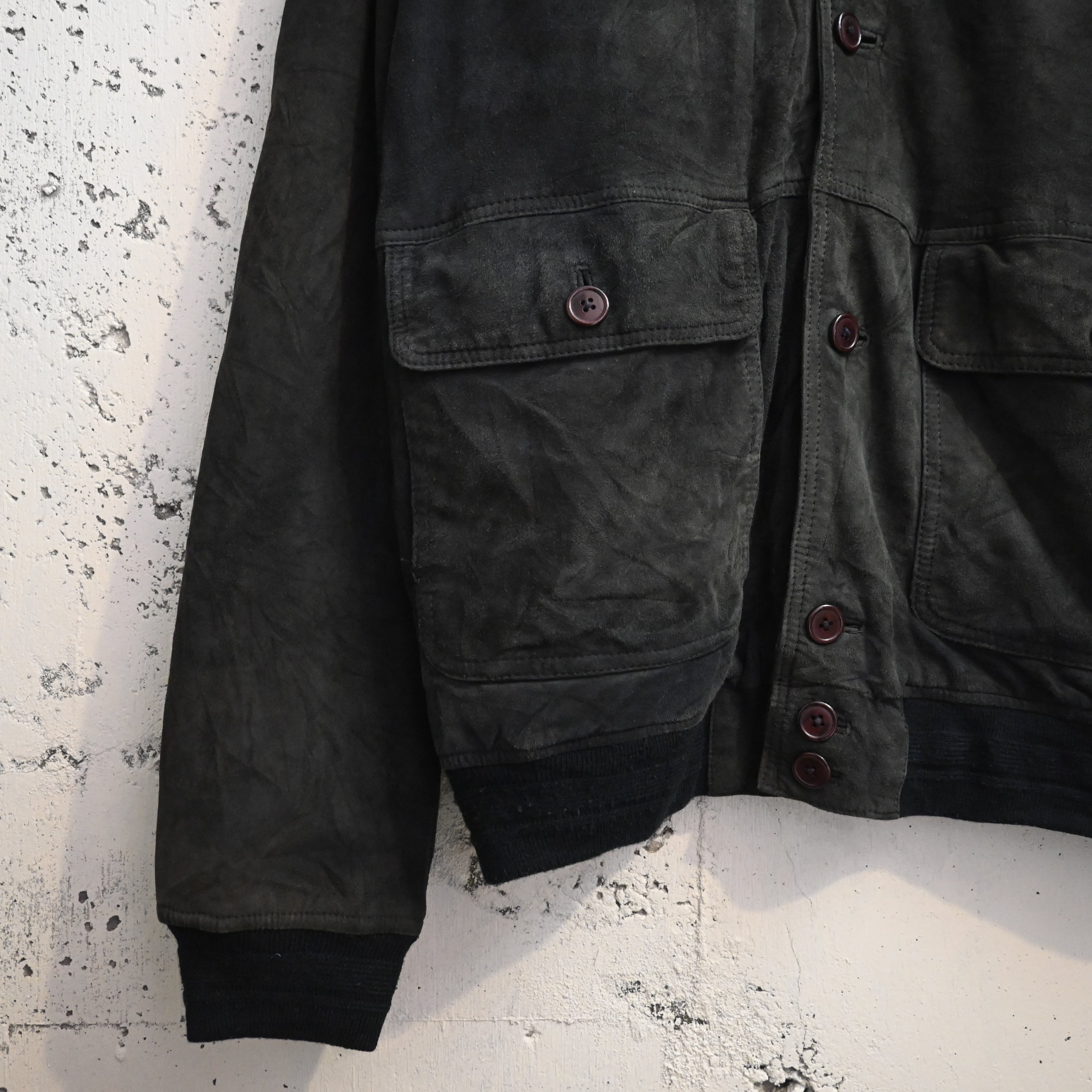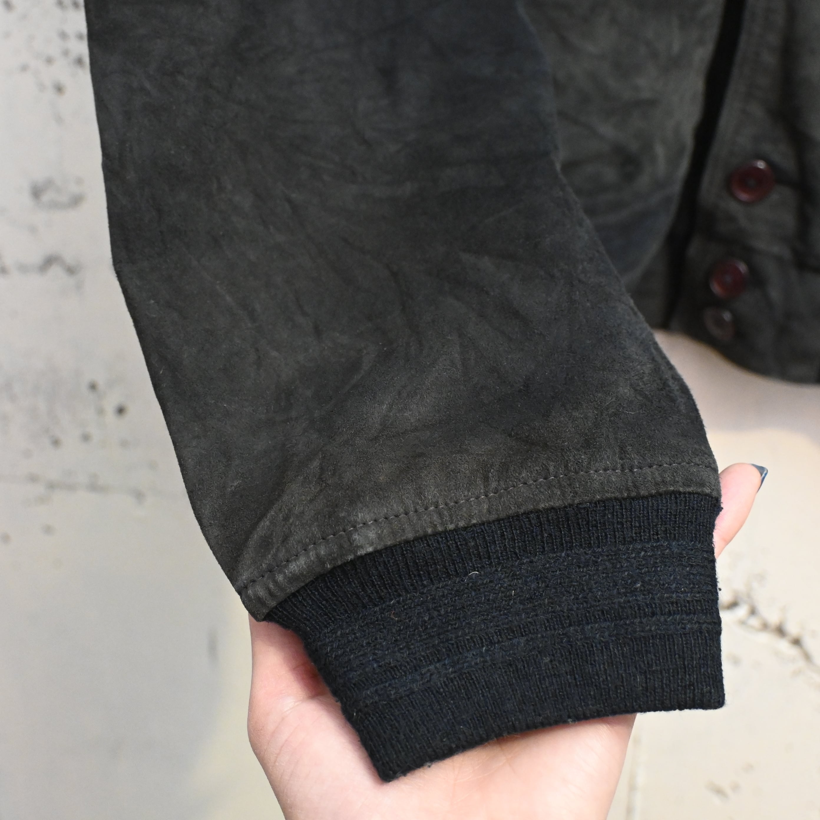 一部ボタンが緩んでいる所があります。スエード特有の擦れ、色ムラ、毛羽立ち、軽いあたりがありますが、全体として雰囲気良くまとまっています。大きなダメージはなく、古着らしい経年変化を楽しめるコンディションです。