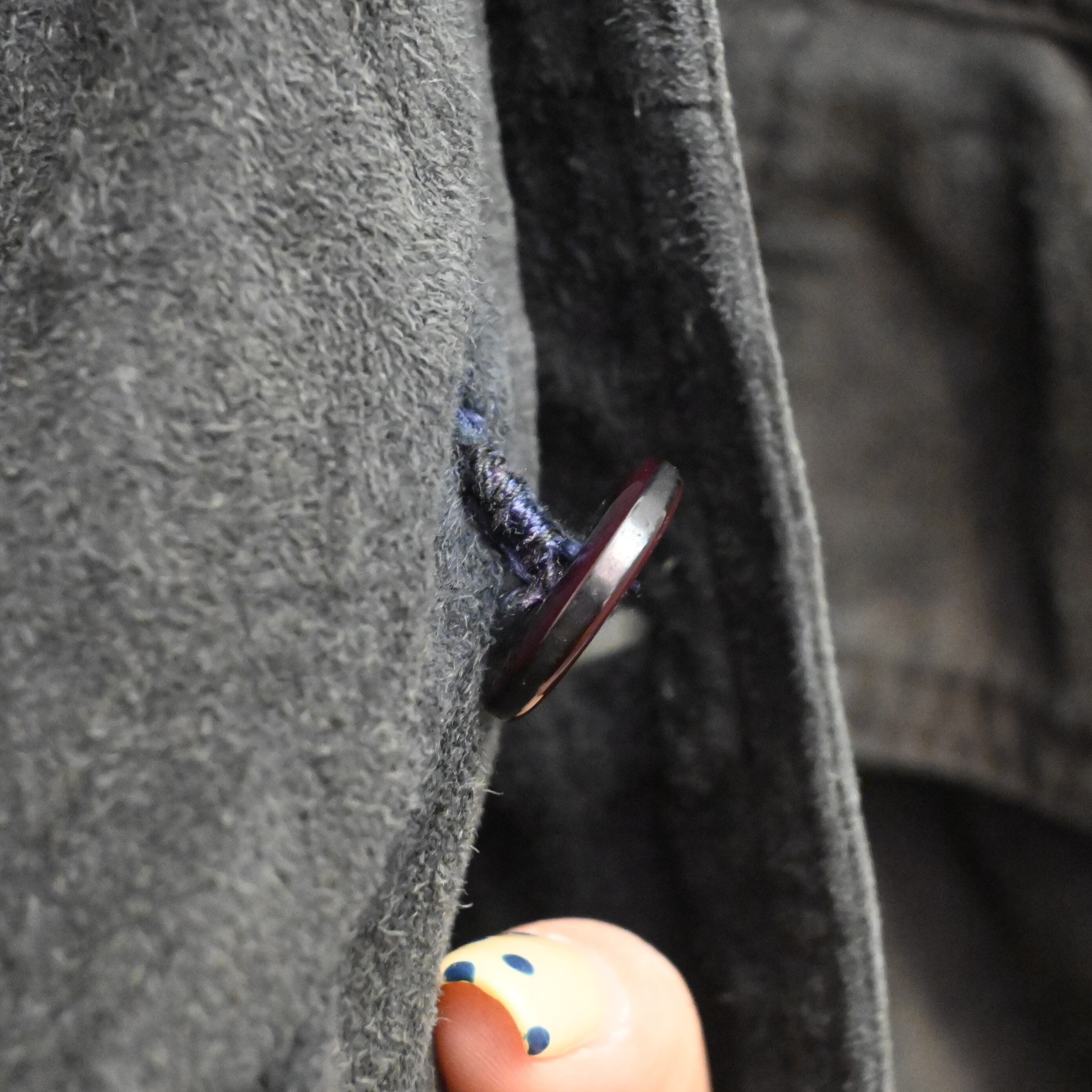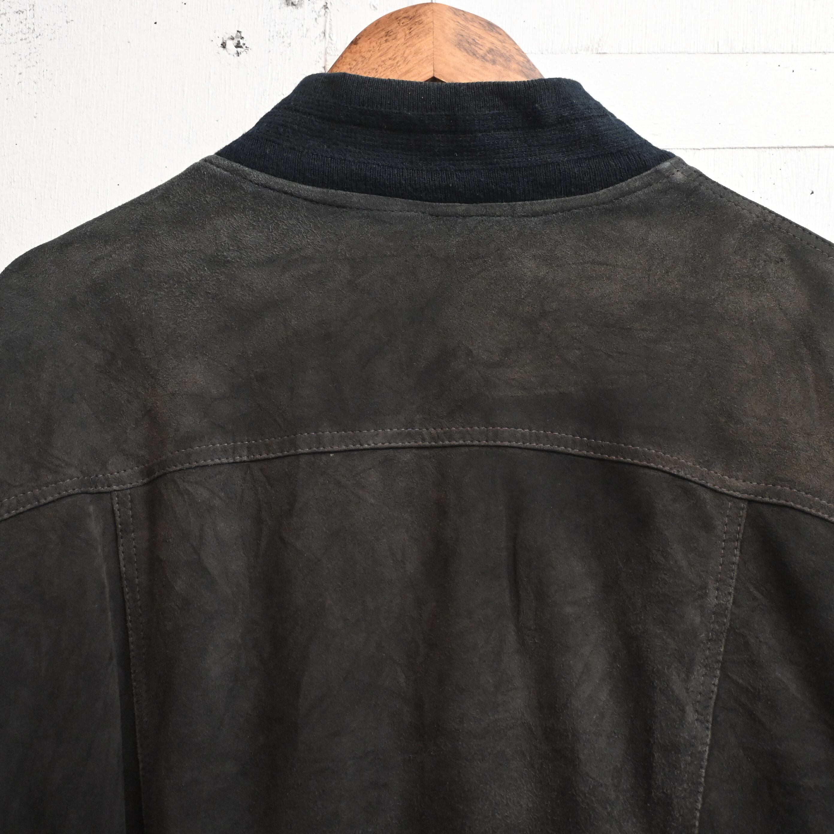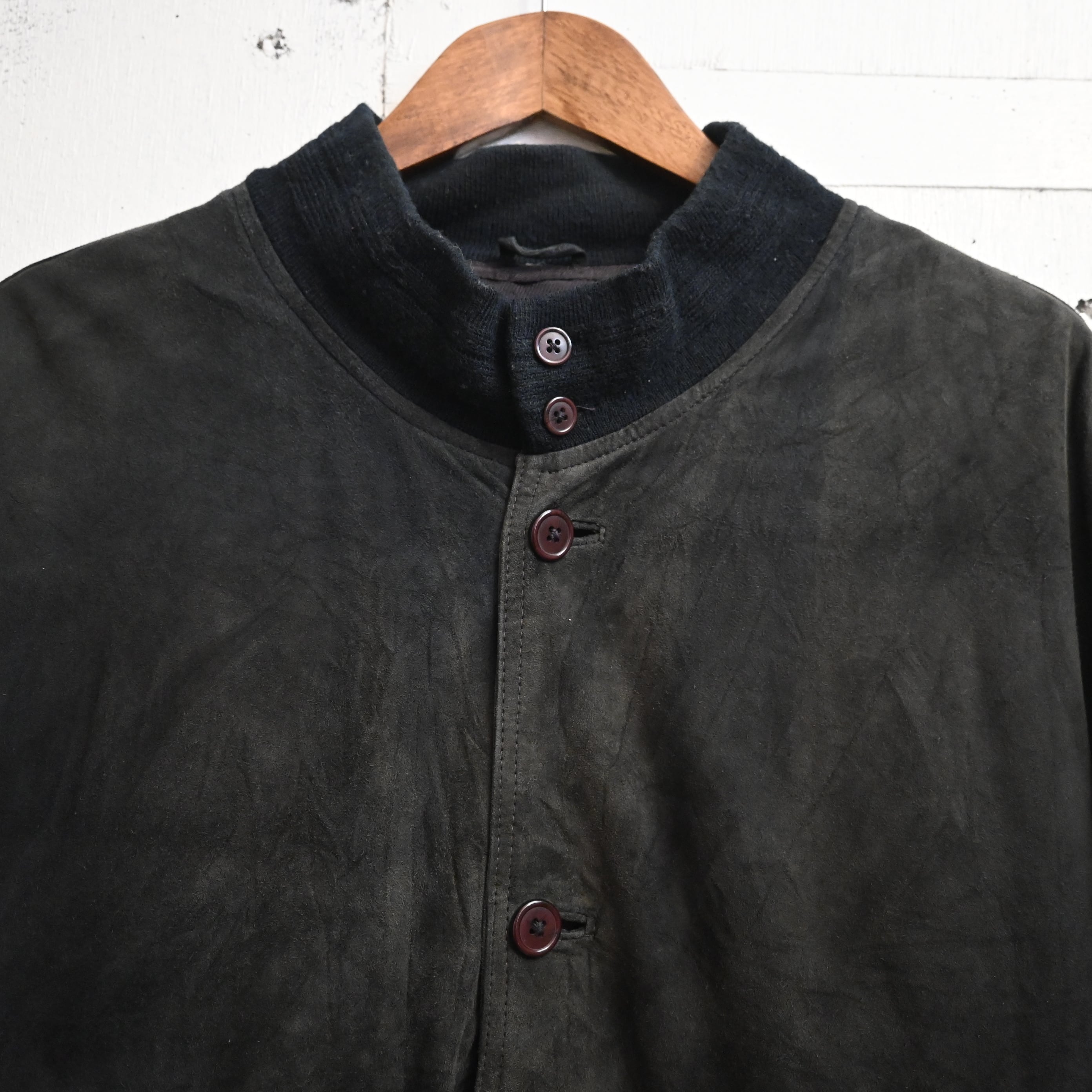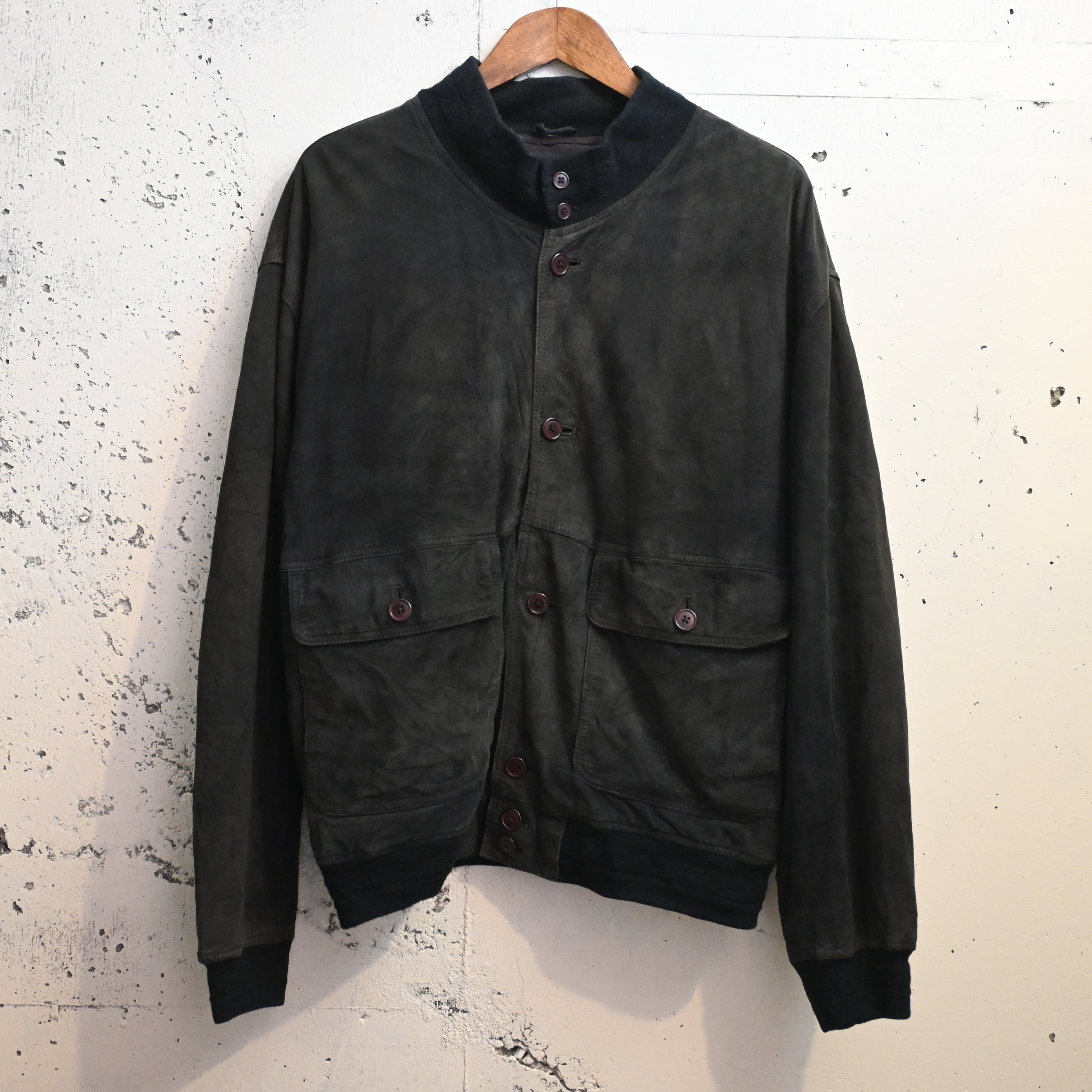 一部ボタンが緩んでいる所があります。スエード特有の擦れ、色ムラ、毛羽立ち、軽いあたりがありますが、全体として雰囲気良くまとまっています。大きなダメージはなく、古着らしい経年変化を楽しめるコンディションです。