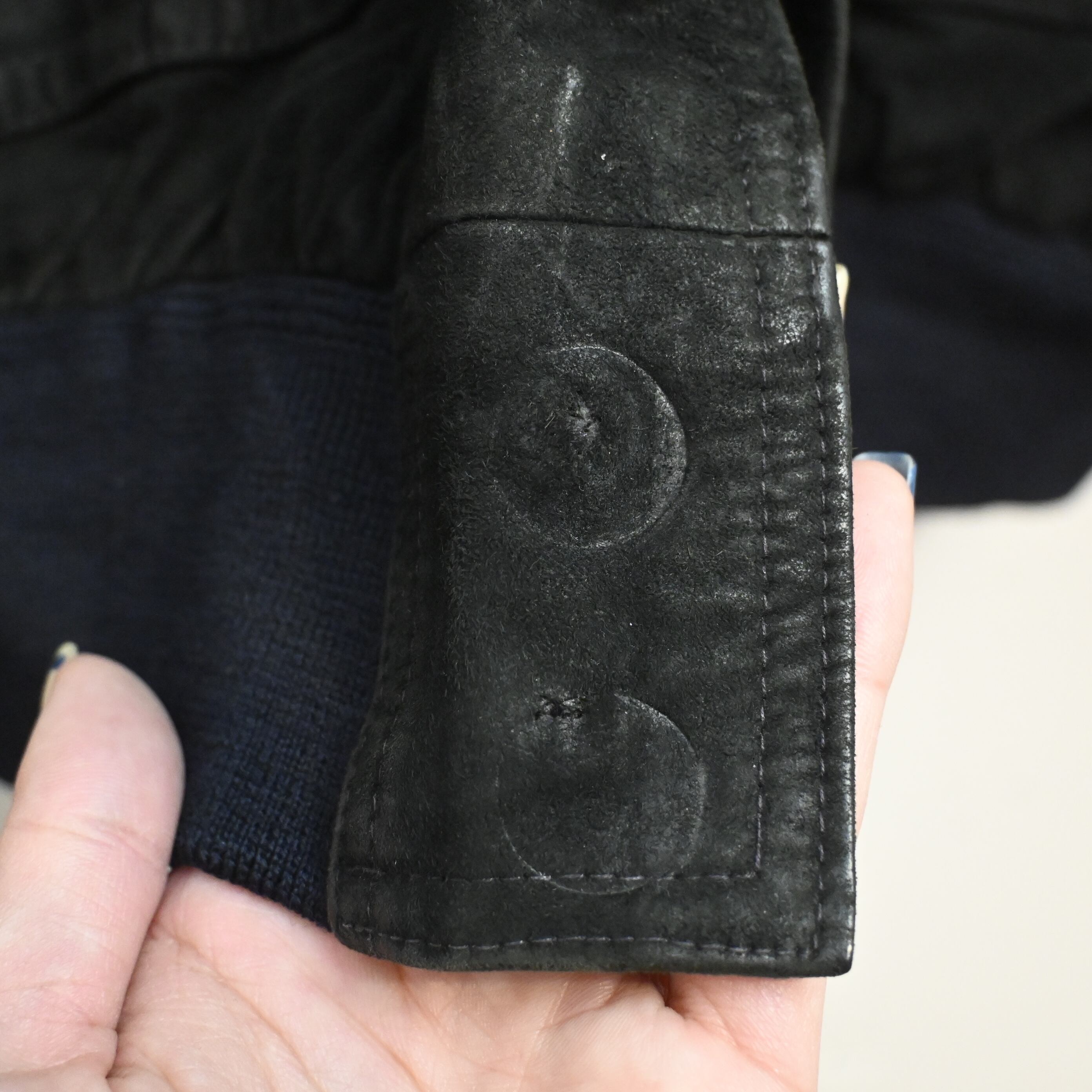 スエード特有の擦れ、色ムラ、毛羽立ち、軽いあたりがありますが、全体として良好な雰囲気を保っています。着用に支障のある大きなダメージはありません。