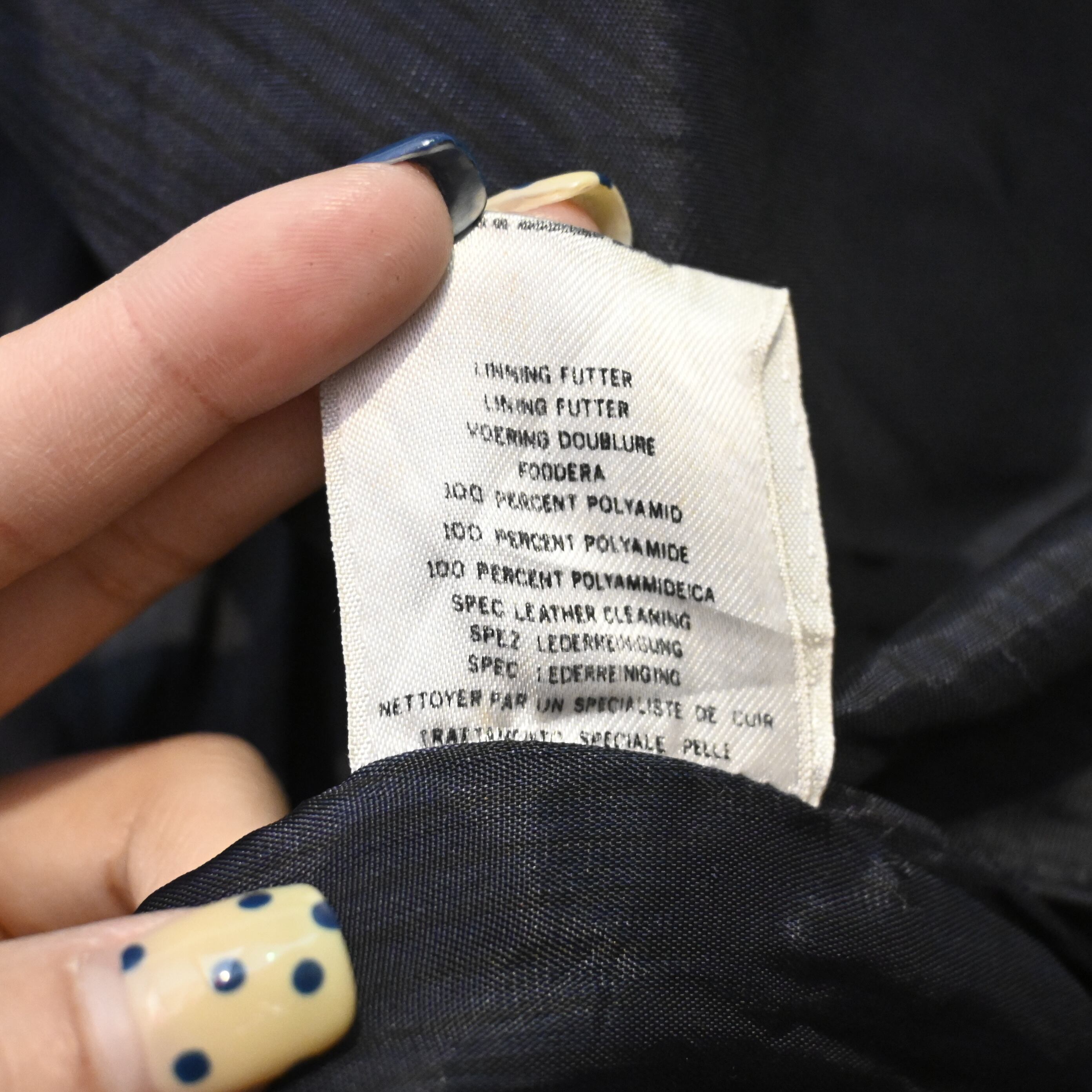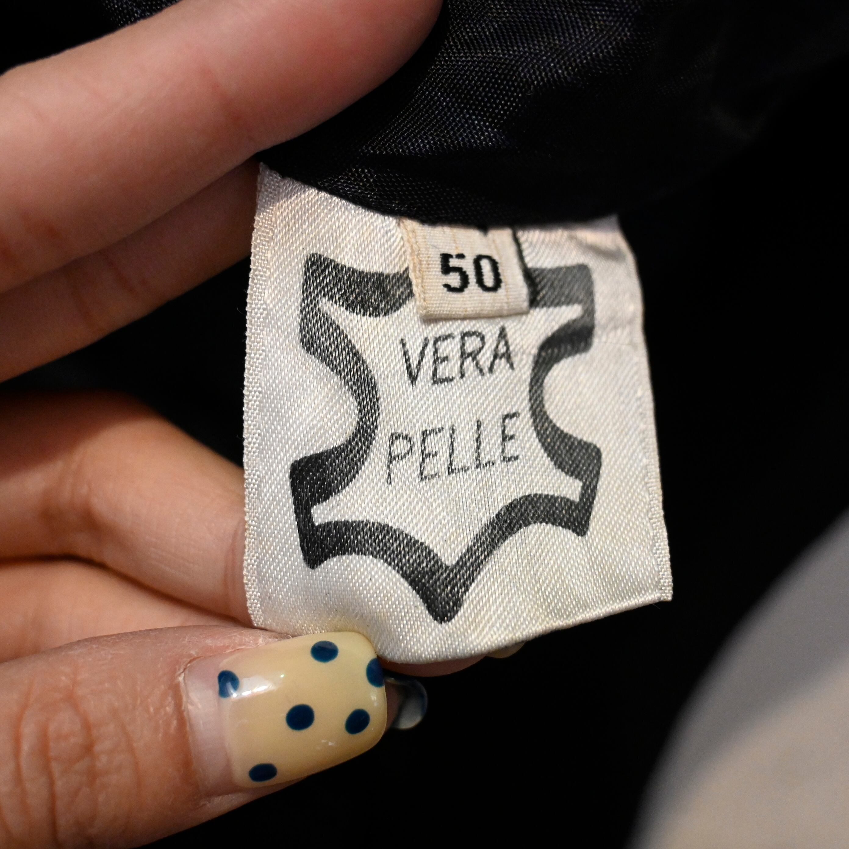 タグには「VERA PELLE」表記が入り、イタリア語で本革を意味する表記からヨーロッパ流通らしい背景も感じられます。裏地は滑りの良いナイロン系ライニングで、袖通しもスムーズです。