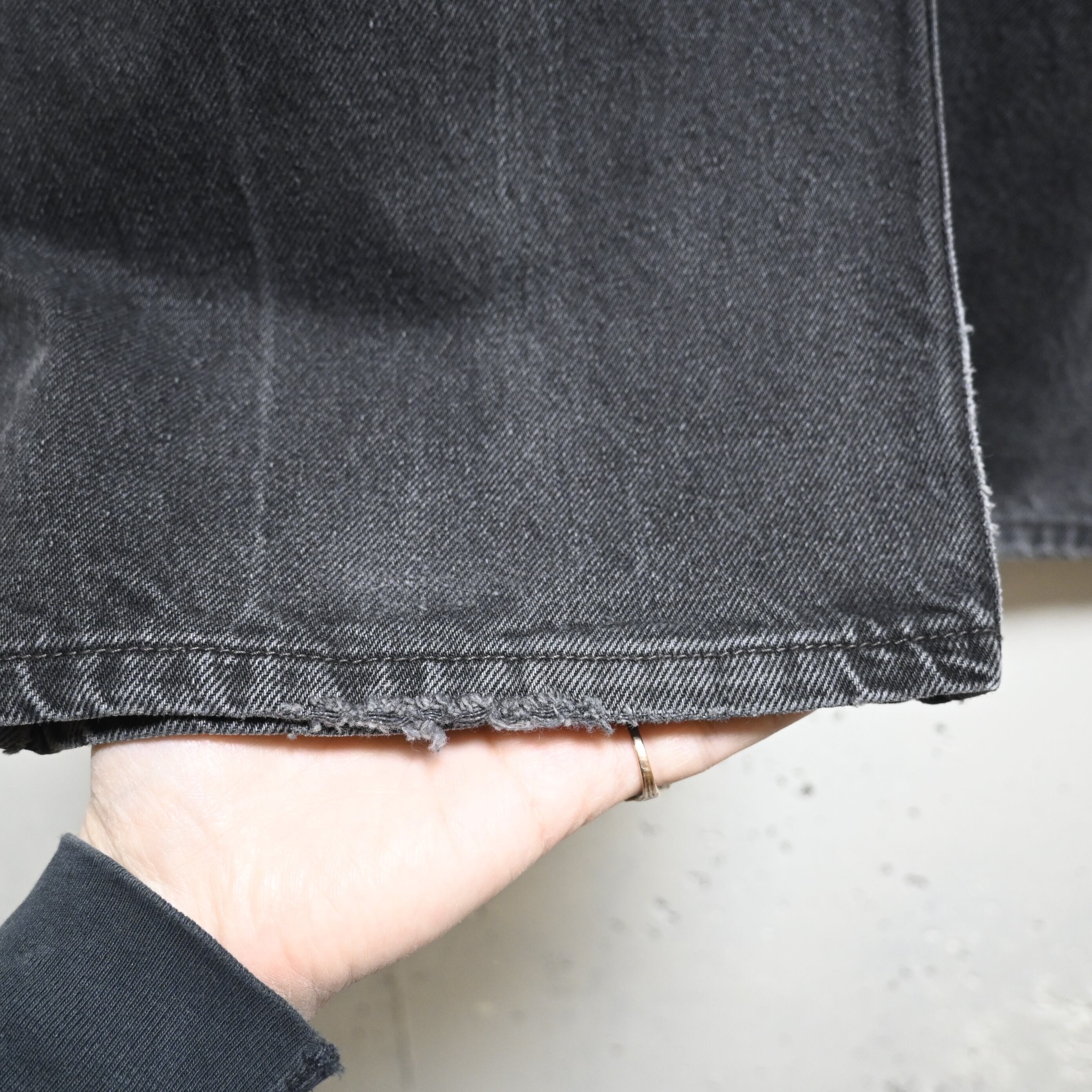ブラックデニムが程よくフェードした雰囲気の良い一本で、ヴィンテージらしいアタリや色落ちが魅力です。