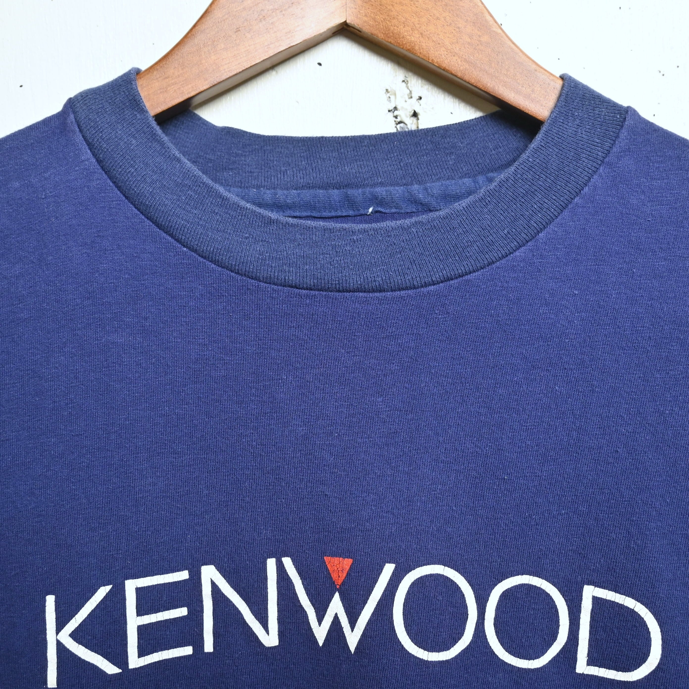 こちらは90年代頃の雰囲気を感じる一枚で、深みのあるネイビーボディにホワイトのKENWOODロゴ、中央の赤いワンポイントがシンプルながら印象的なデザインです。無駄のない企業ロゴものらしいミニマルさがあり、ジャケットやシャツのインナーにも使いやすい一枚です。