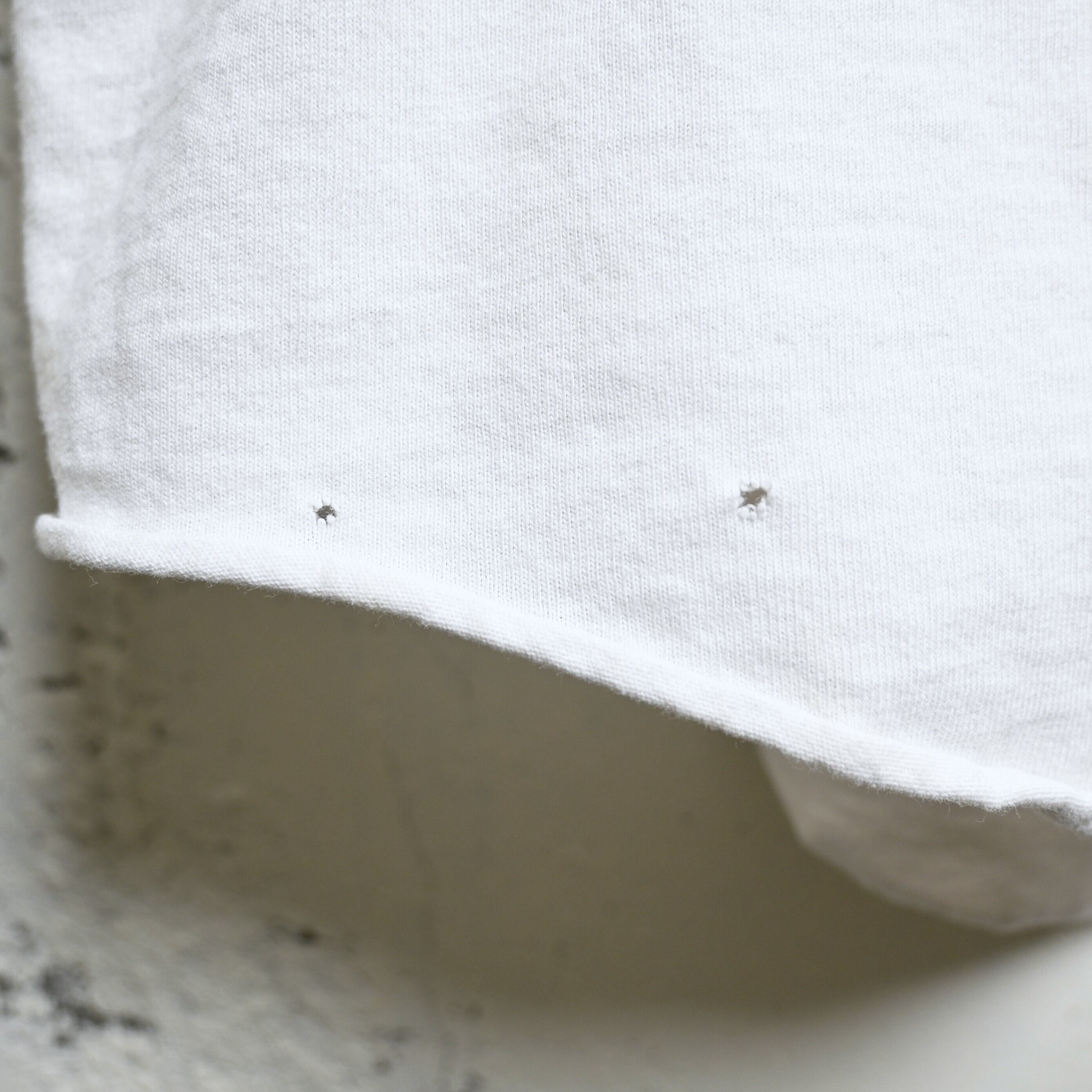 全体に着用感があります。フロンㇳのロゴの下、左の袖に数か所穴が開いています。着用に支障のあるダメージはなく、年代相応の雰囲気として楽しめるコンディションです。
