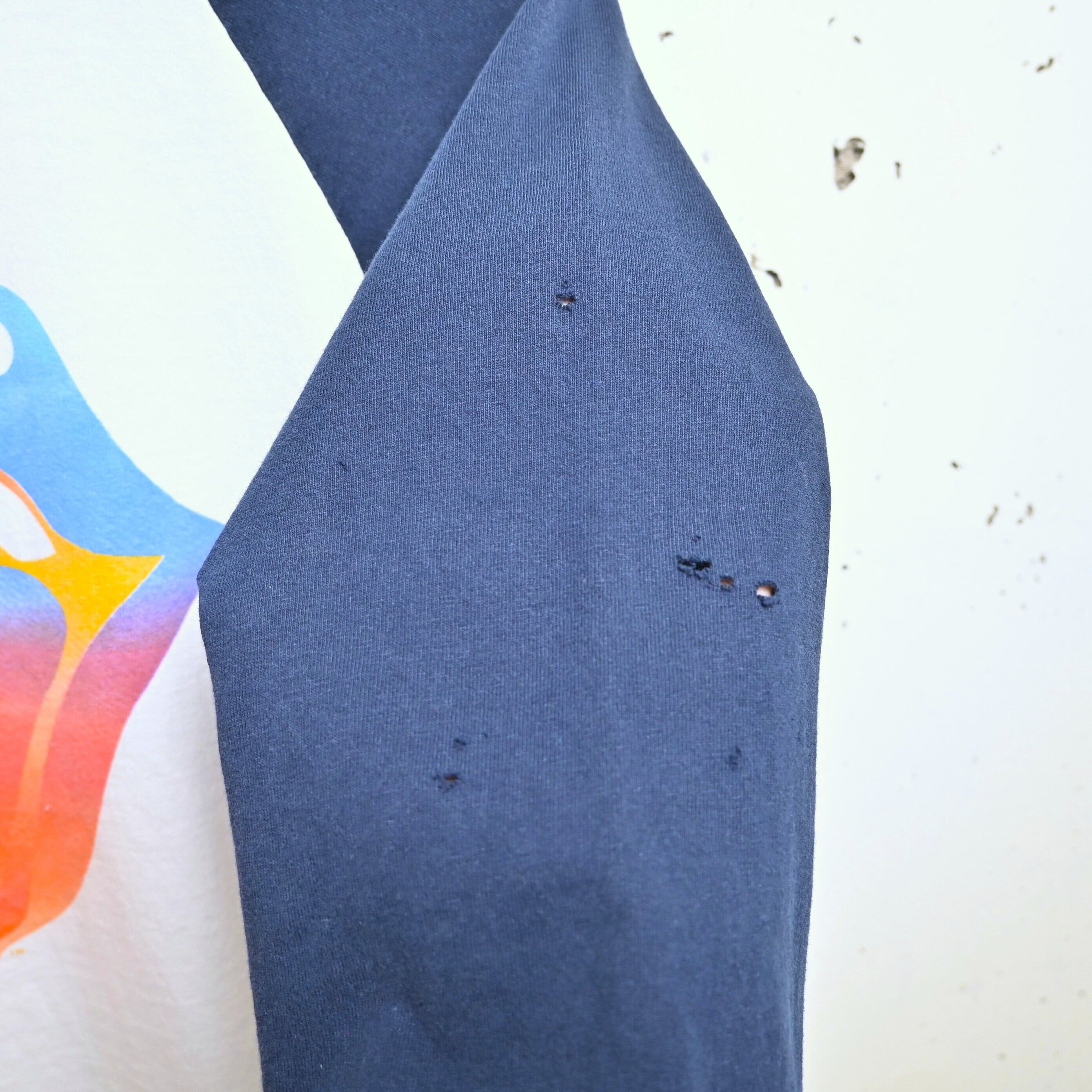 フロントにはブランドを象徴するリップ&タンロゴをブルー〜オレンジのグラデーションで大きく配置。背面には “ROLLING STONES FORTY LICKS” の文字が入り、シンプルながら2000年代初頭らしい配色でまとめられています。定番の赤単色ロゴとは異なるカラー仕様のため、Rolling Stones物の中でも少し違った印象で楽しめるデザインです。