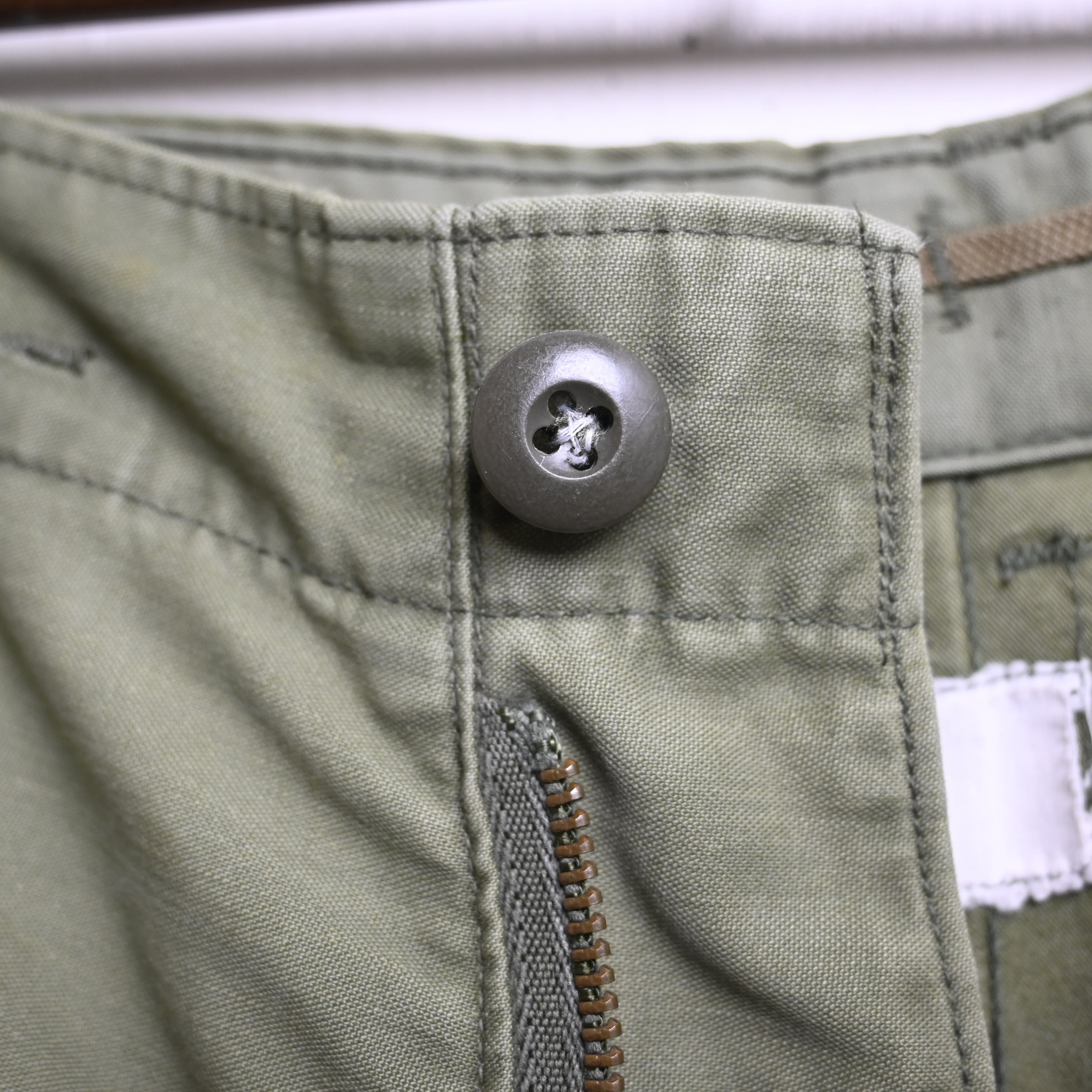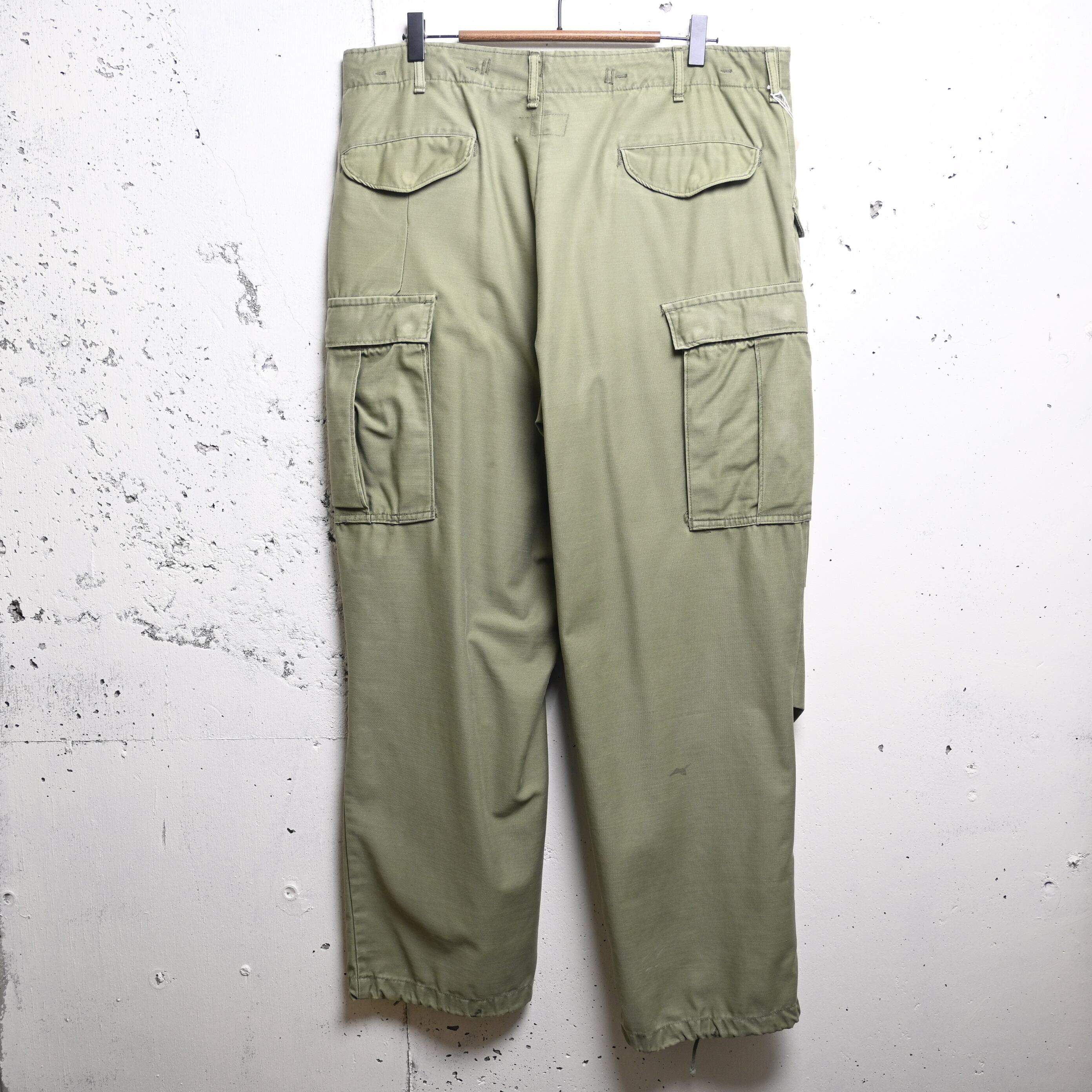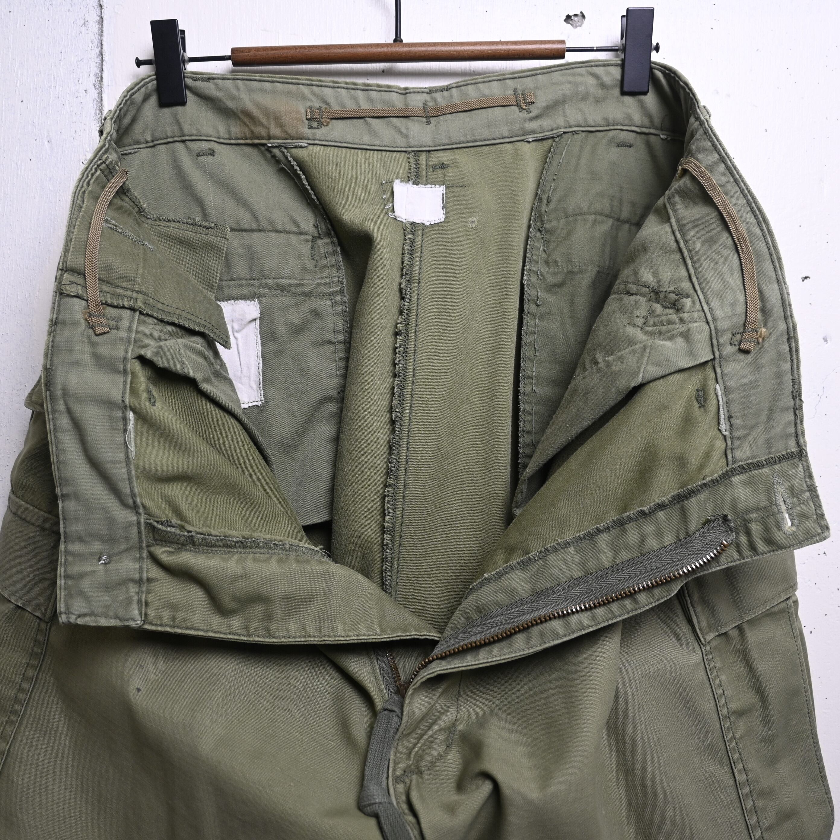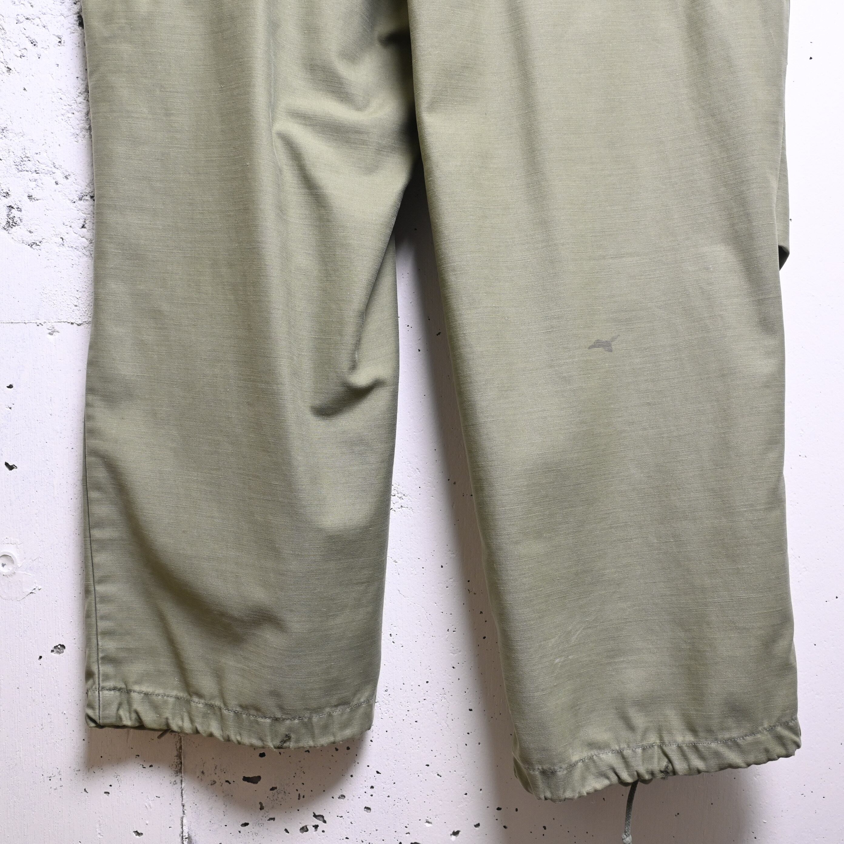 全体に年代相応の着用感があります。内側タグ薄くなり認識不可能、右脚背面に小さな薄汚れ、補修跡あり。その他大きなダメージはなく、ヴィンテージミリタリーとして良好な状態です。