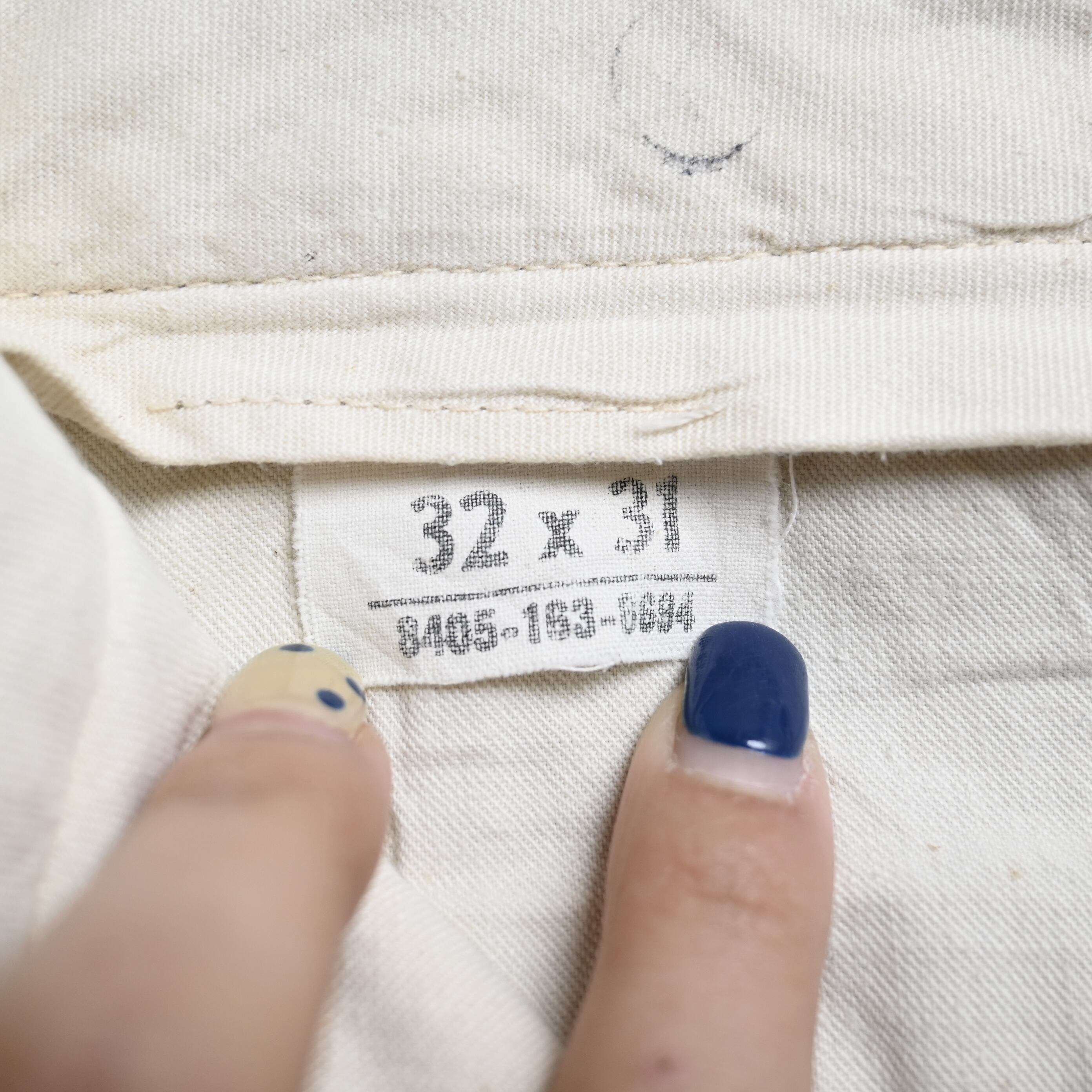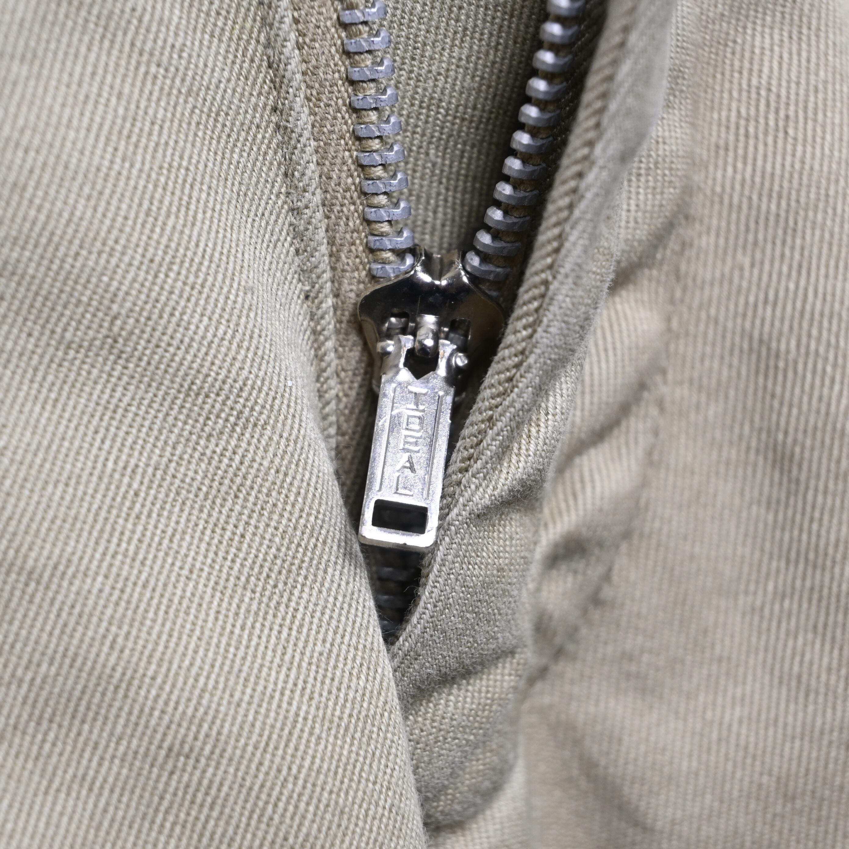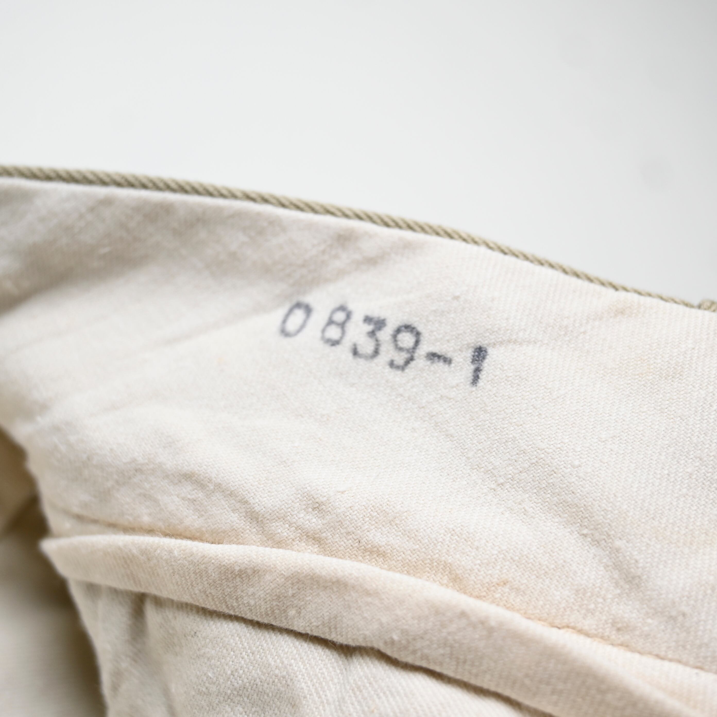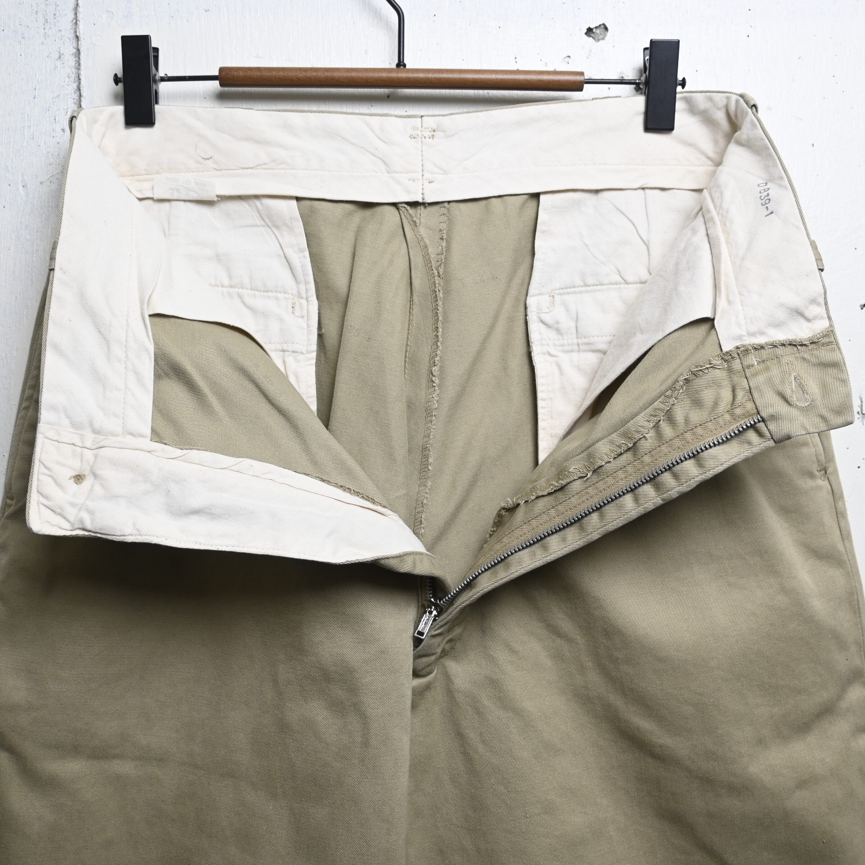 米軍で長く採用されたコットンチノは、ミリタリーパンツの中でも最も日常使いしやすい定番の一本として知られています。こちらは「TROUSERS, MAN'S, COTTON, CLASS 1」表記の個体で、1950年代までのボタンフライ仕様から移行した、ジッパーフロント仕様の年代らしいディテールが特徴です。