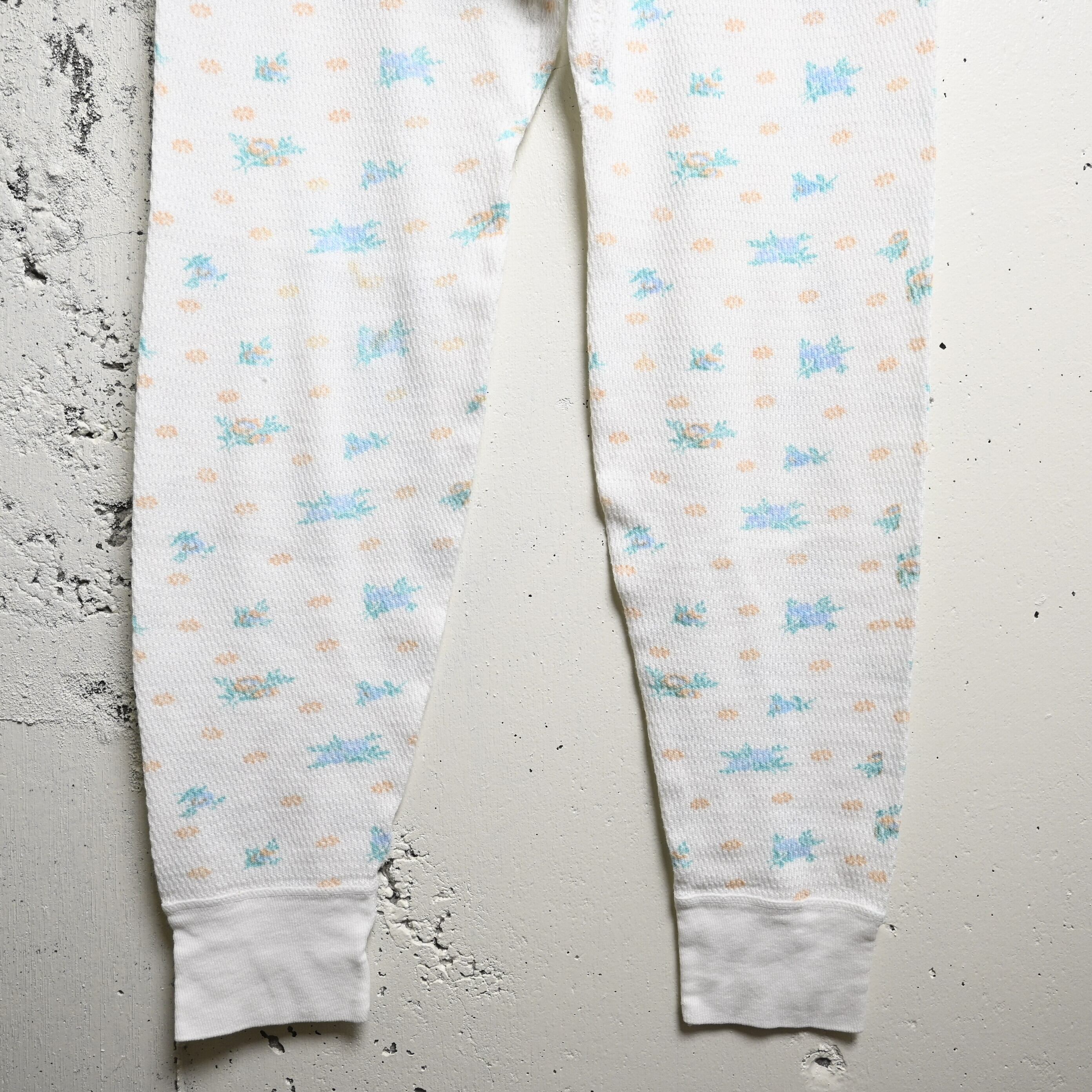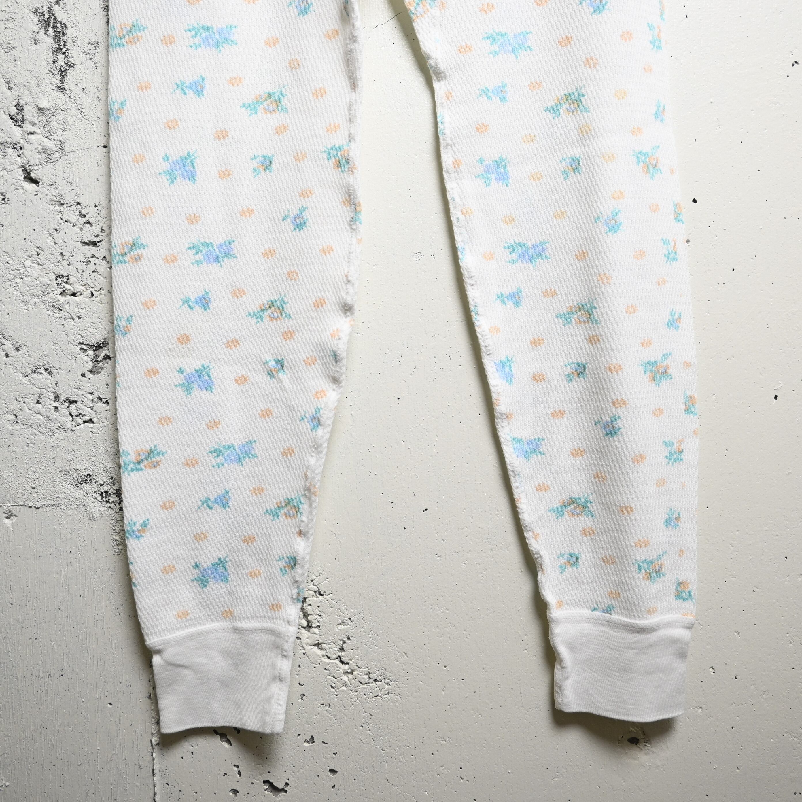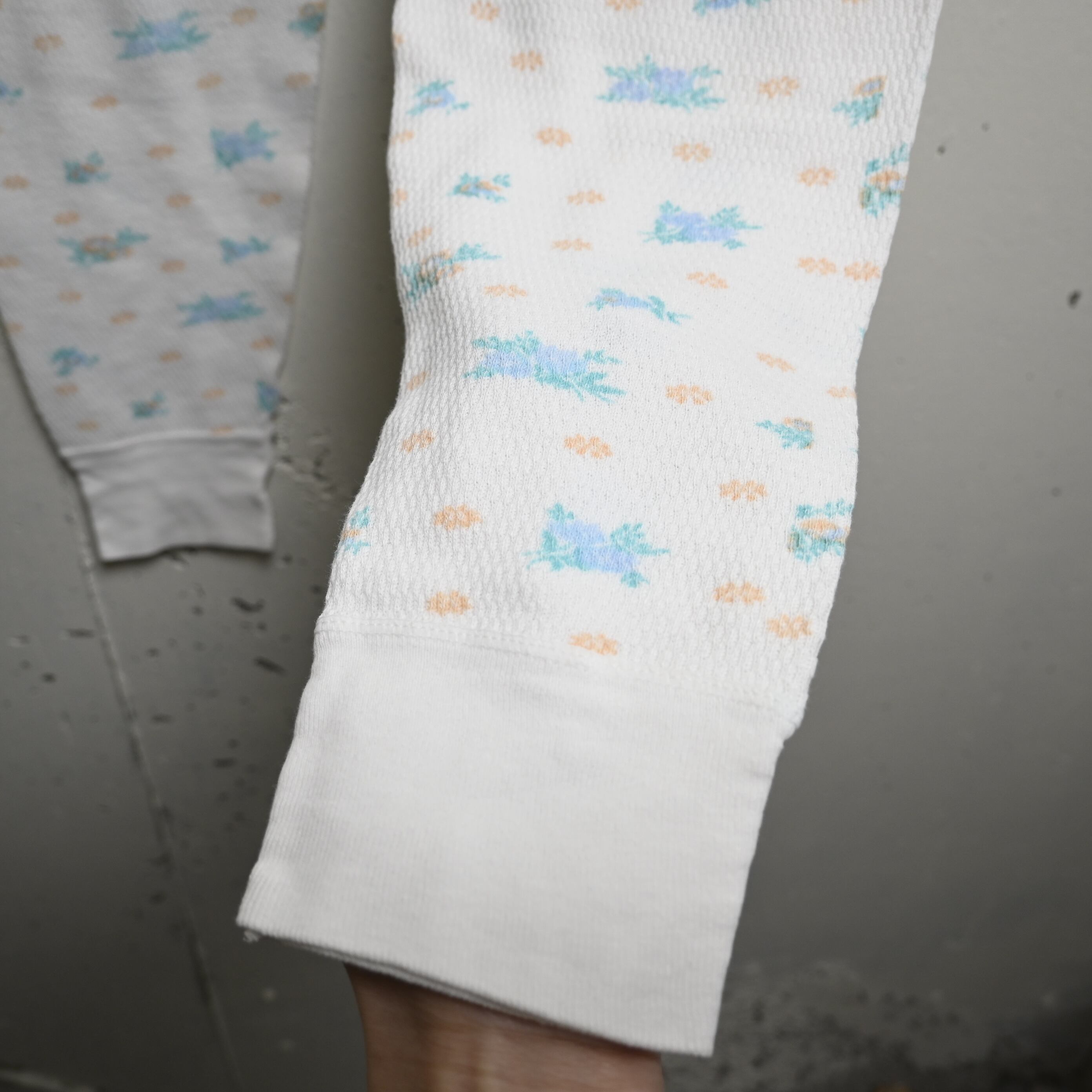 ホワイトベースのワッフル生地に、淡いブルー・ミント・ペールオレンジで構成された小花柄が全体にプリントされた、古着らしいやわらかな雰囲気を持つ一本です。無地のサーマルとは違い、90年代らしい家庭的で優しい空気感があり、インナー用途だけでなく見せるスタイリングにも映えるデザインです。