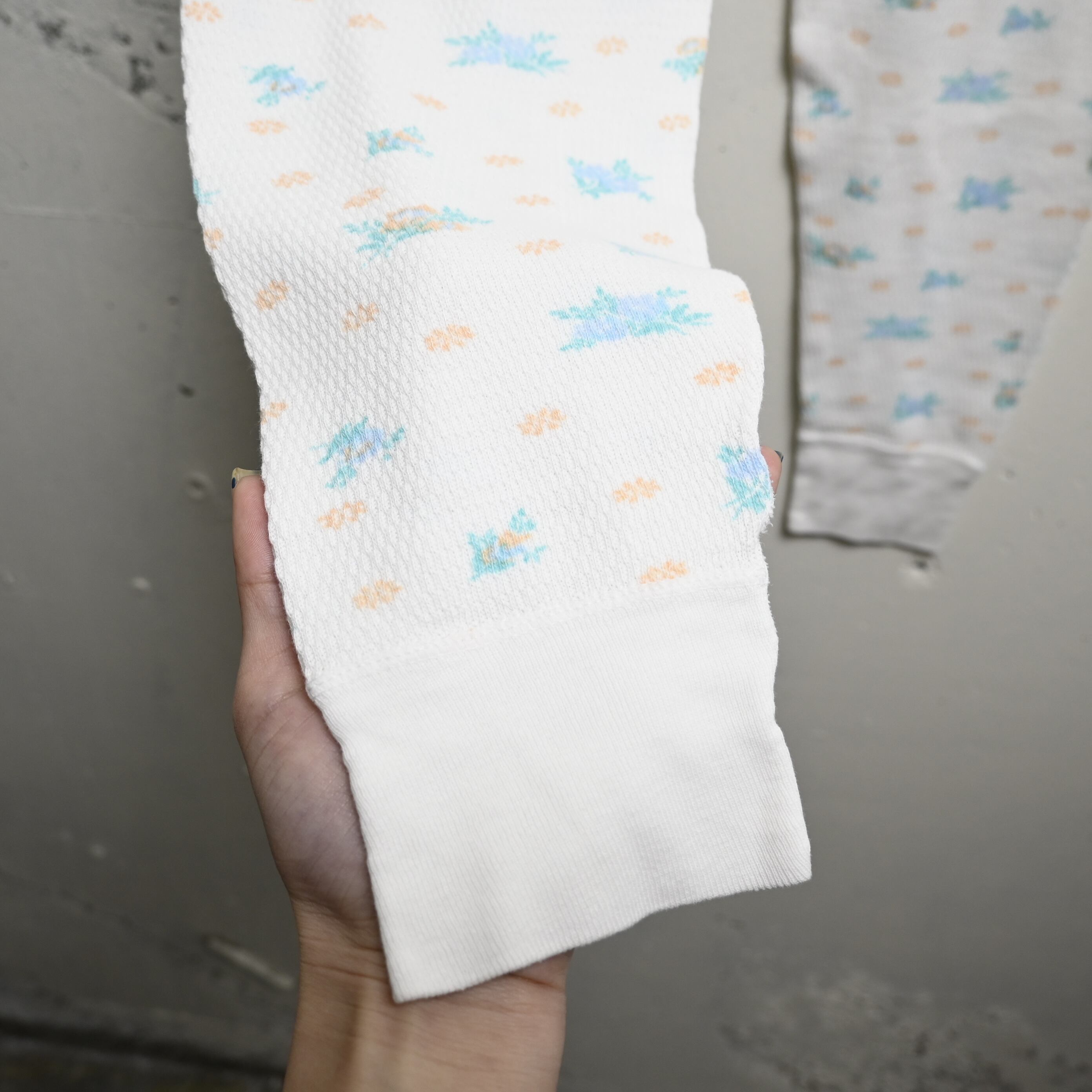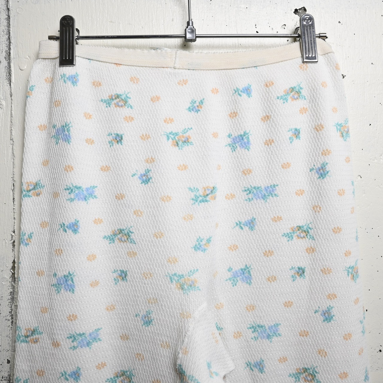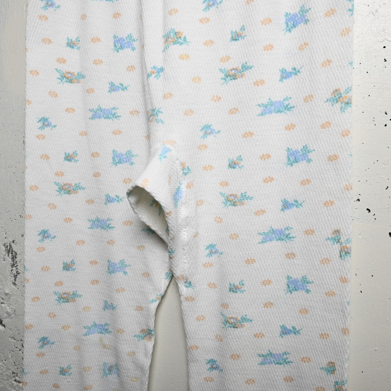 ホワイトベースのワッフル生地に、淡いブルー・ミント・ペールオレンジで構成された小花柄が全体にプリントされた、古着らしいやわらかな雰囲気を持つ一本です。無地のサーマルとは違い、90年代らしい家庭的で優しい空気感があり、インナー用途だけでなく見せるスタイリングにも映えるデザインです。