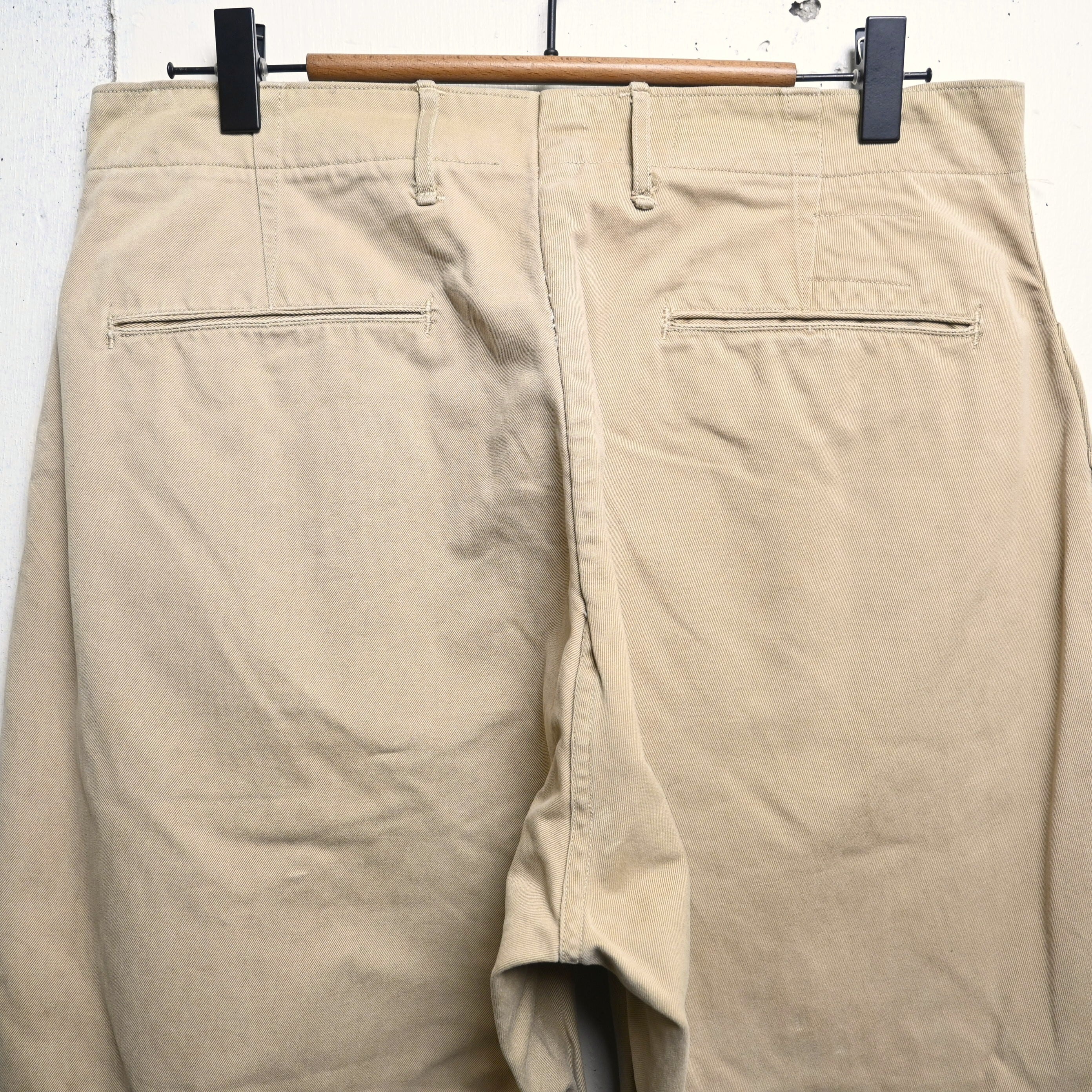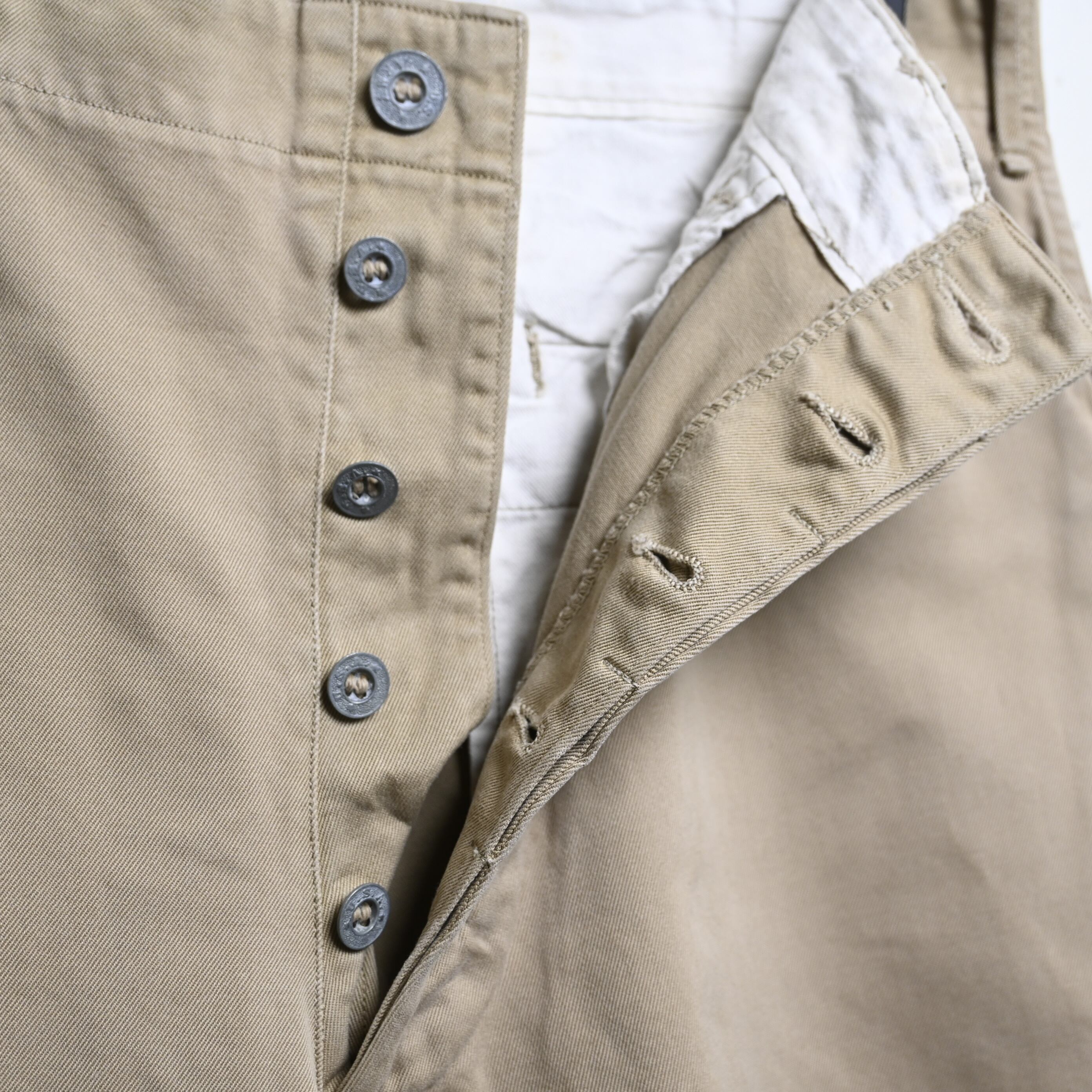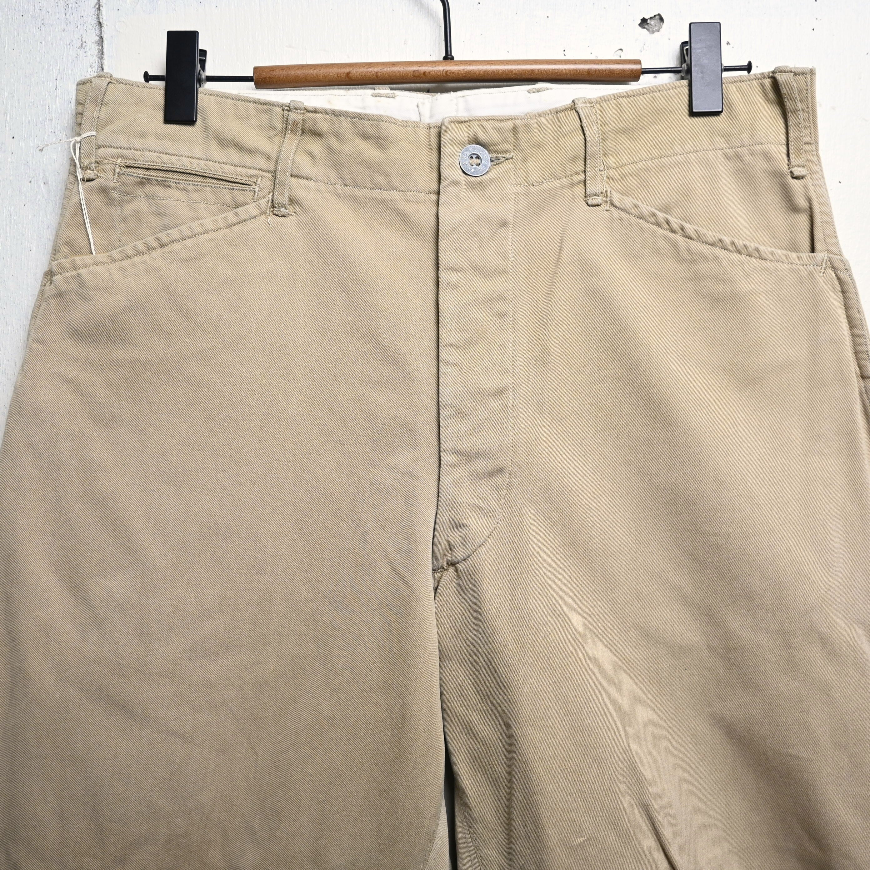 生地はしっかりとしたコットンツイル。30〜40年代らしい密度のある古い生地感で、長年の経年変化によって柔らかさも加わっています。色味はやや淡いベージュで、ミリタリーらしさがありながらも土臭くなりすぎず、シャツやジャケットと合わせたクラシックなスタイルにも自然に馴染みます。