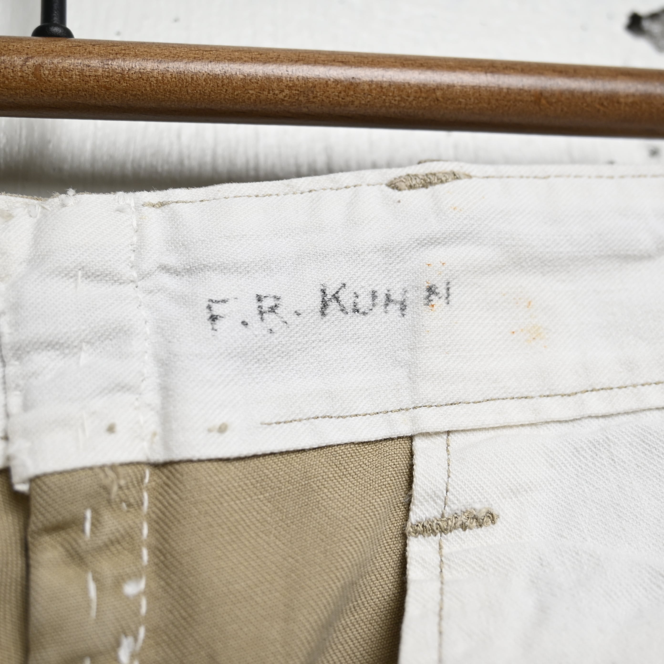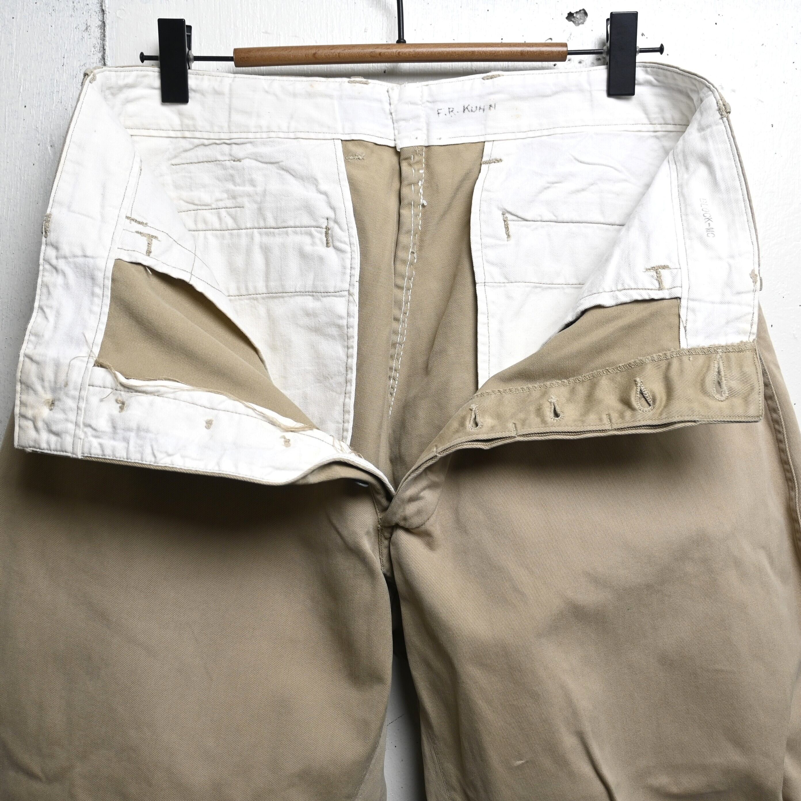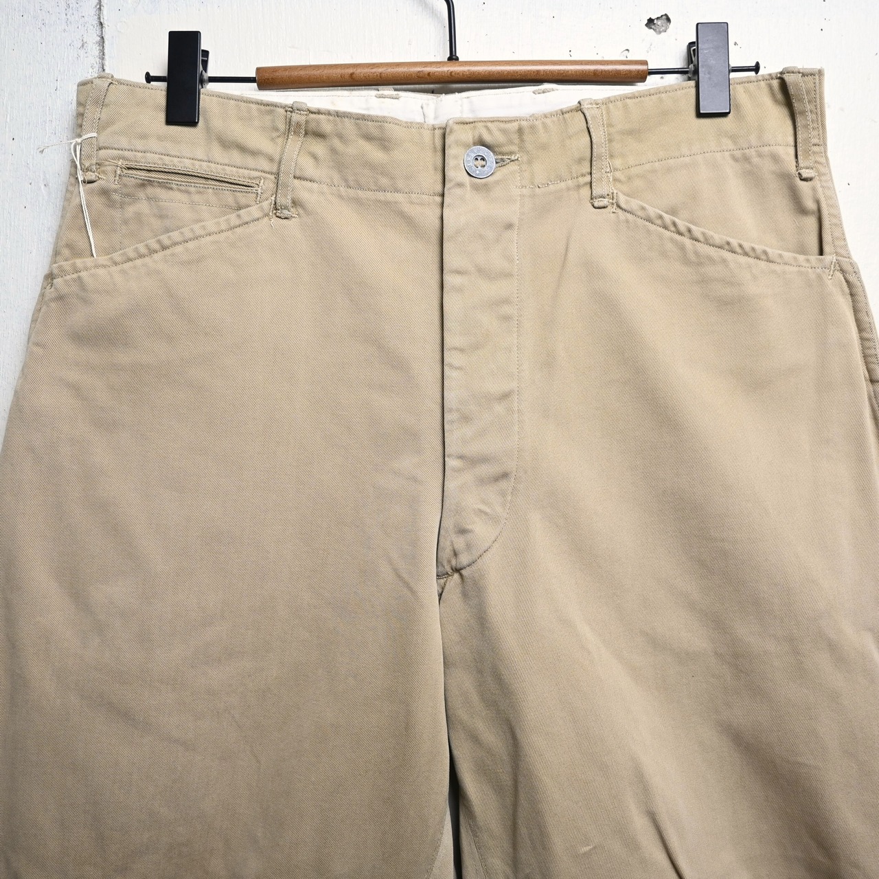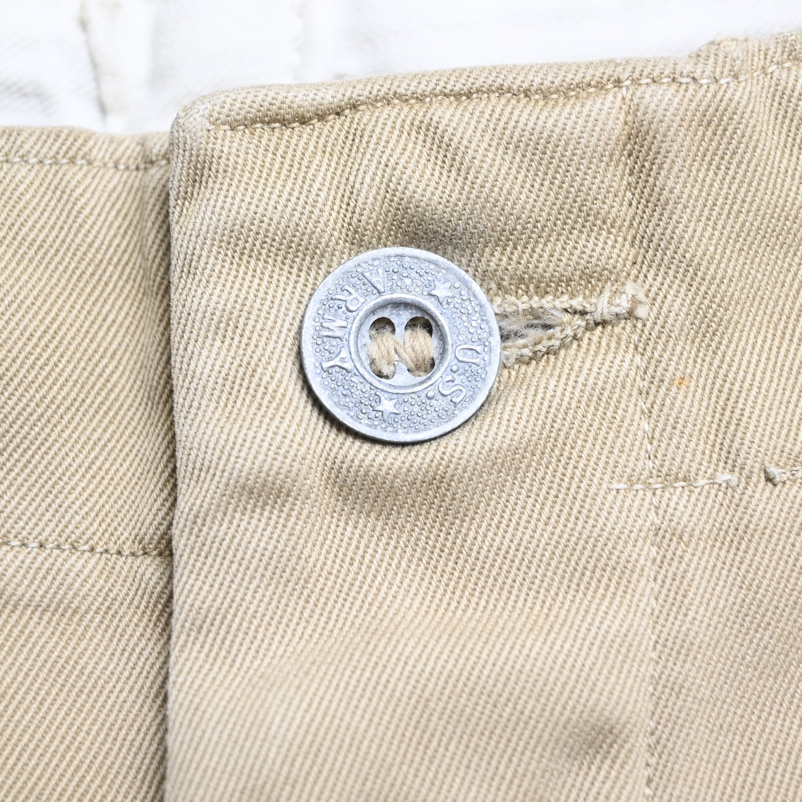 生地はしっかりとしたコットンツイル。30〜40年代らしい密度のある古い生地感で、長年の経年変化によって柔らかさも加わっています。色味はやや淡いベージュで、ミリタリーらしさがありながらも土臭くなりすぎず、シャツやジャケットと合わせたクラシックなスタイルにも自然に馴染みます。