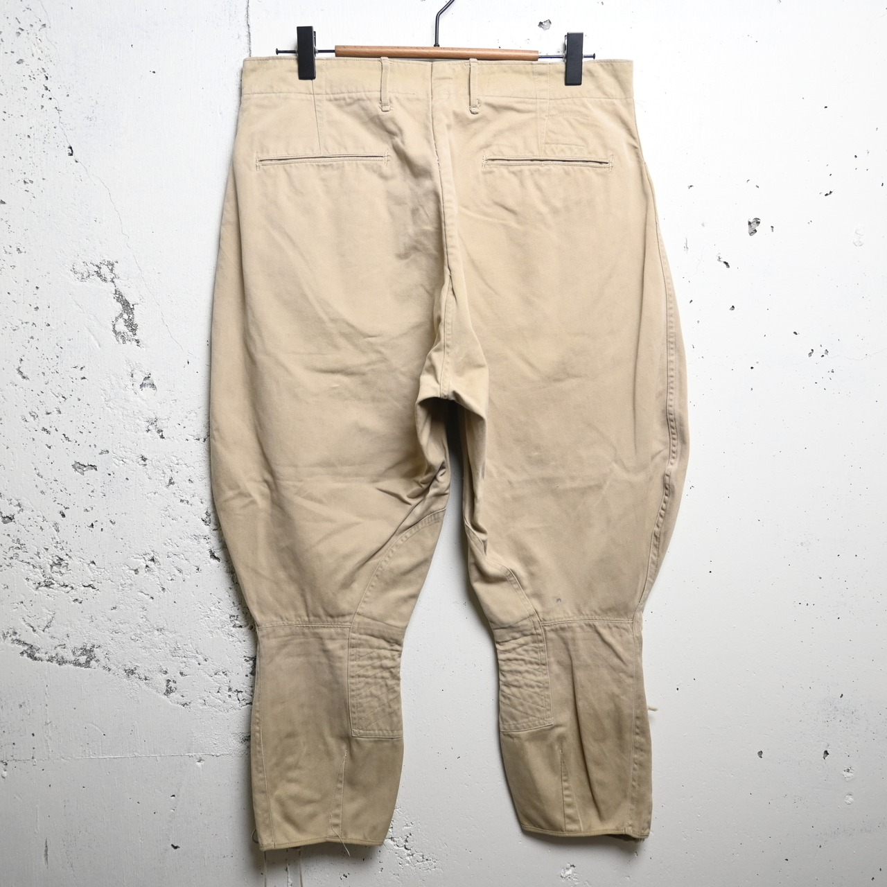 乗馬用パンツとして軍で採用されていたジョッパーズは、膝上に大きくゆとりを持たせ、膝下から裾にかけて細く絞られる独特なシルエットが最大の特徴です。こちらも当時らしい立体的なパターンがしっかり残っており、現代のパンツにはない造形美を感じられる一本です。