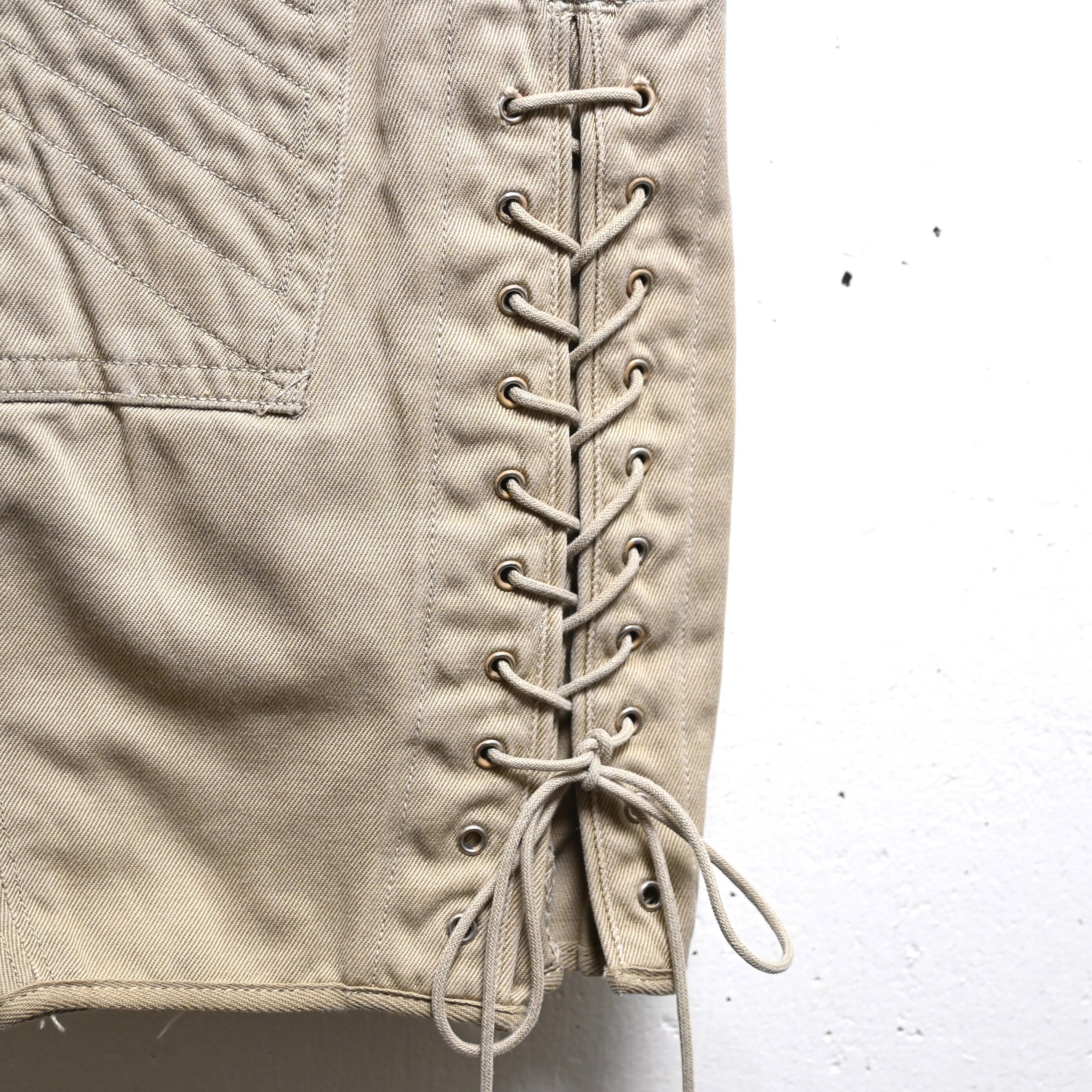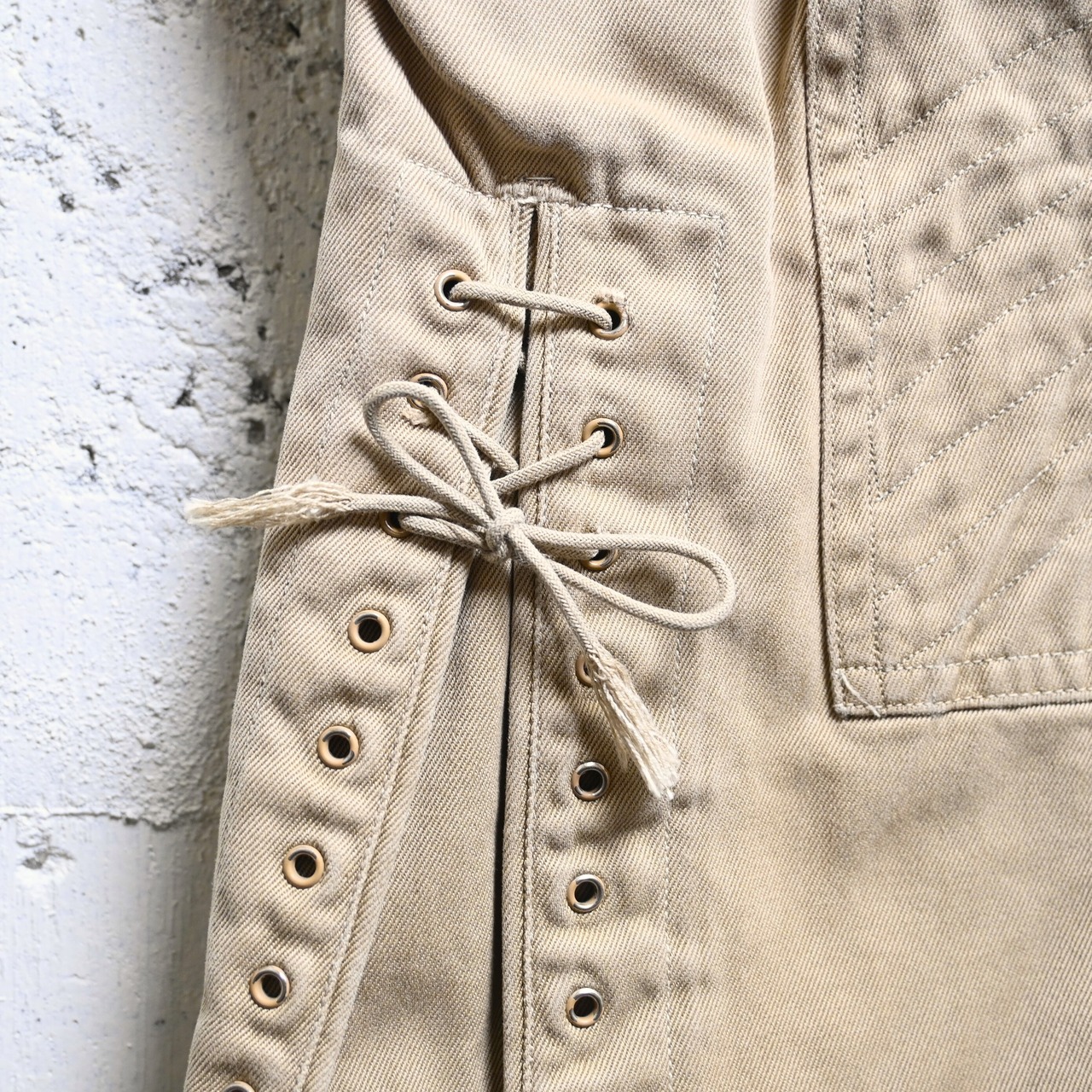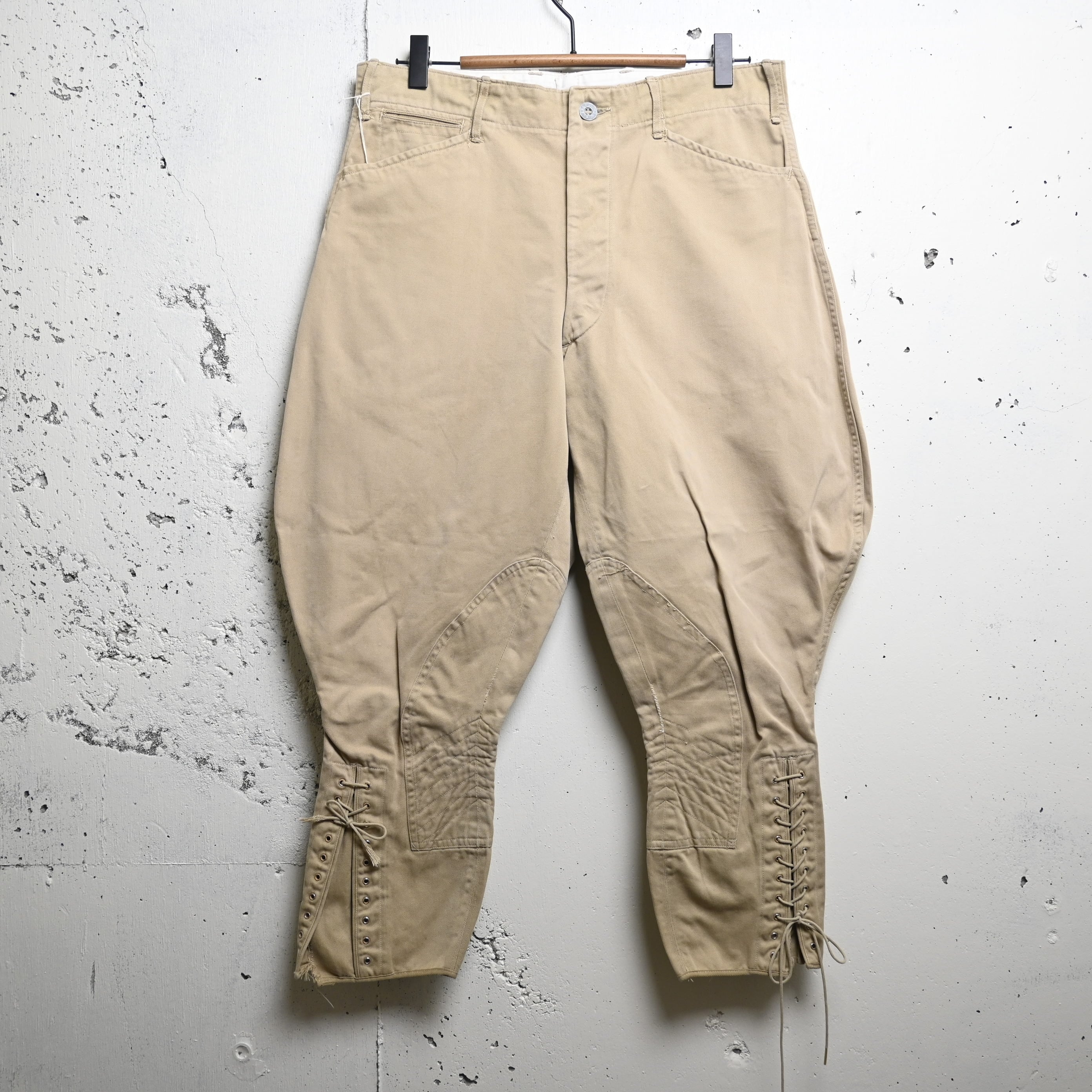 フロントはボタンフライ仕様、腰まわりは深い股上でしっかりとホールドされ、膝下には補強を兼ねた切り替えとステッチワークが入ります。裾にはアイレット付きのレースアップ仕様が採用されており、ブーツに合わせて絞って着用する本来の用途がそのまま残された非常に雰囲気のあるディテールです。